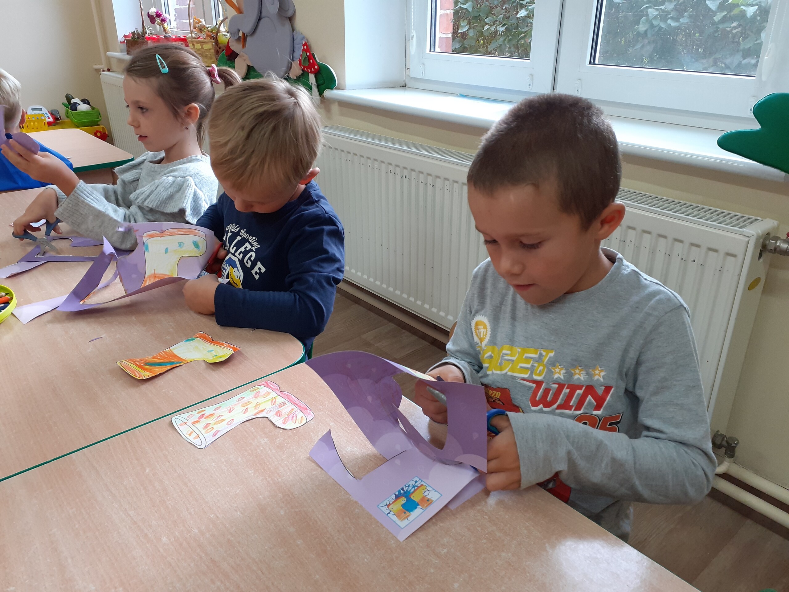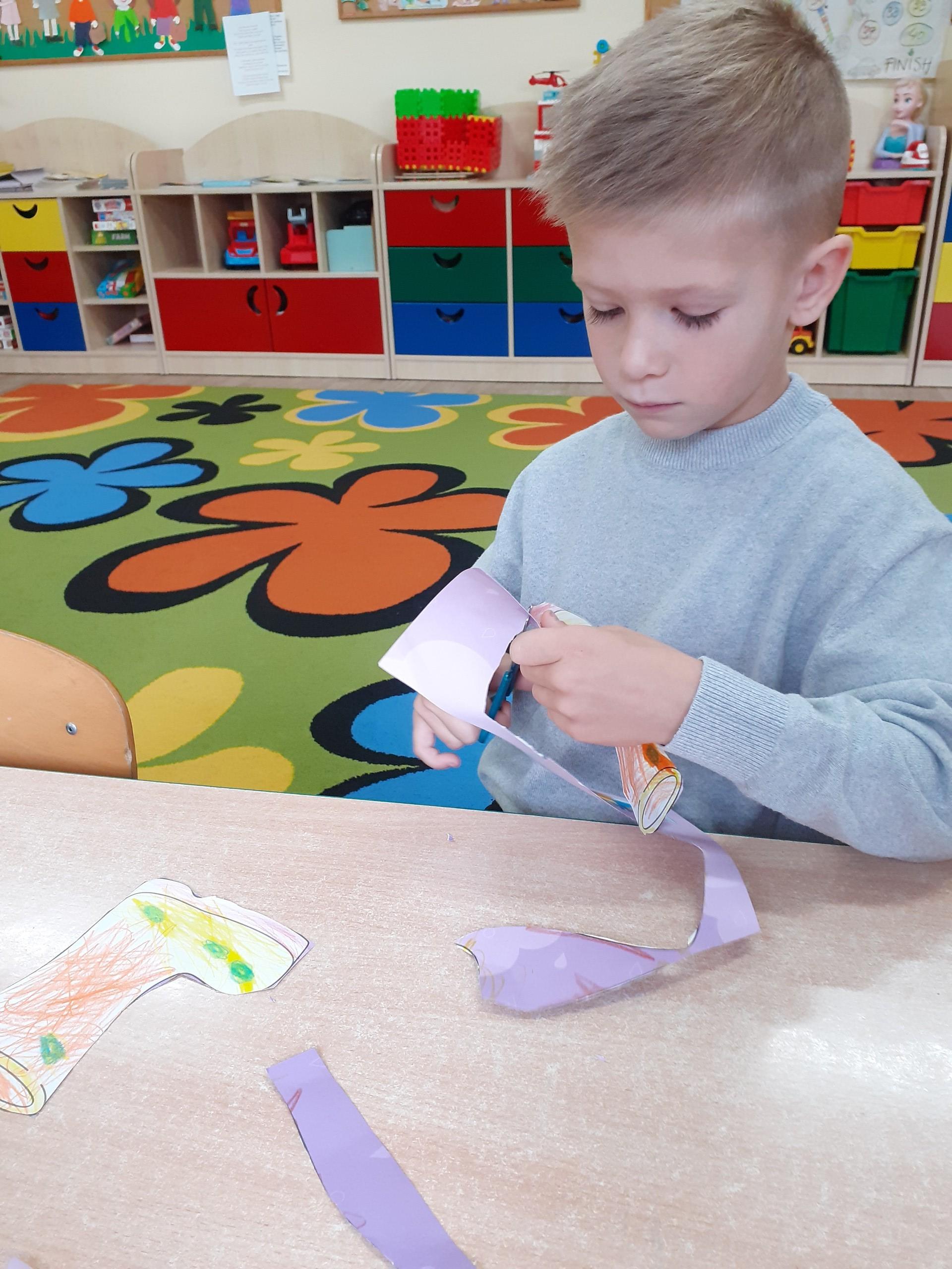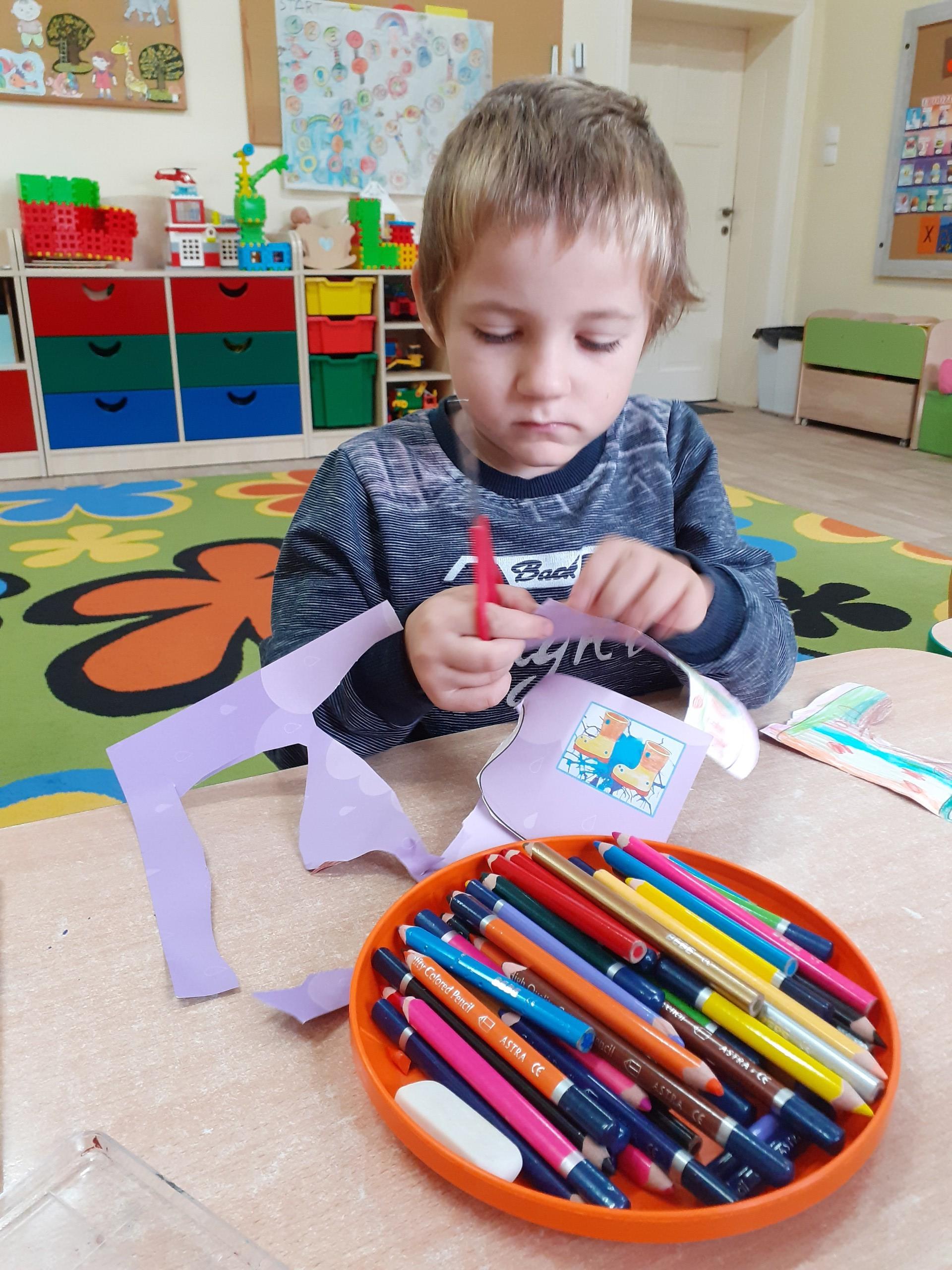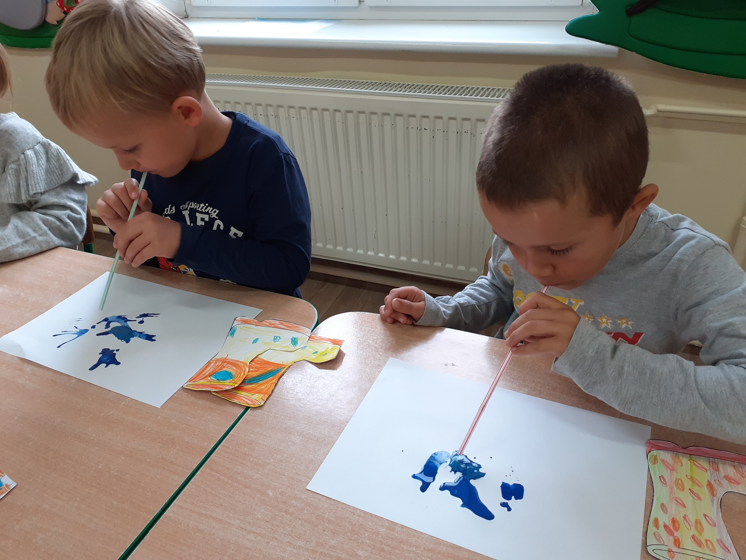 Kalosze na jesienny deszcz są już gotowe! Starszaki kolorowały obrazki kaloszy, wycinały je, a następnie naklejały na rozdmuchaną za pomocą słomki i farby - kałużę.