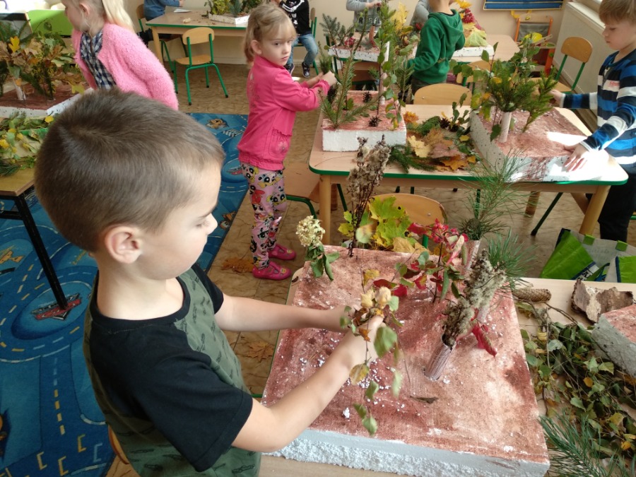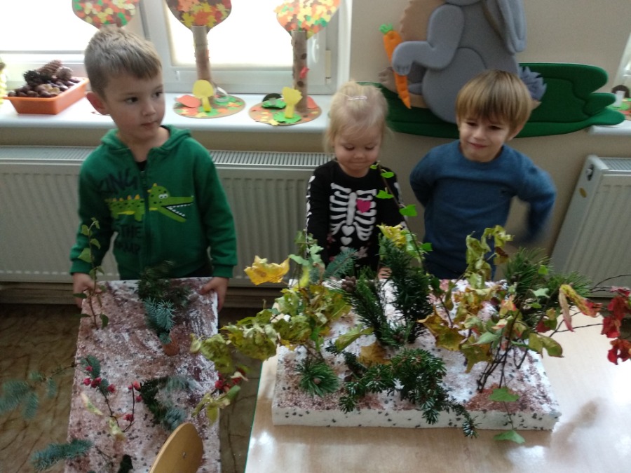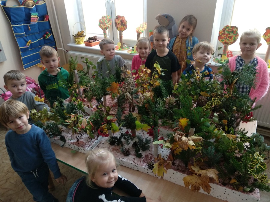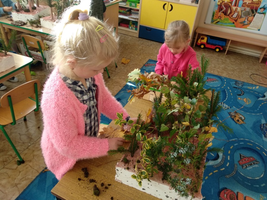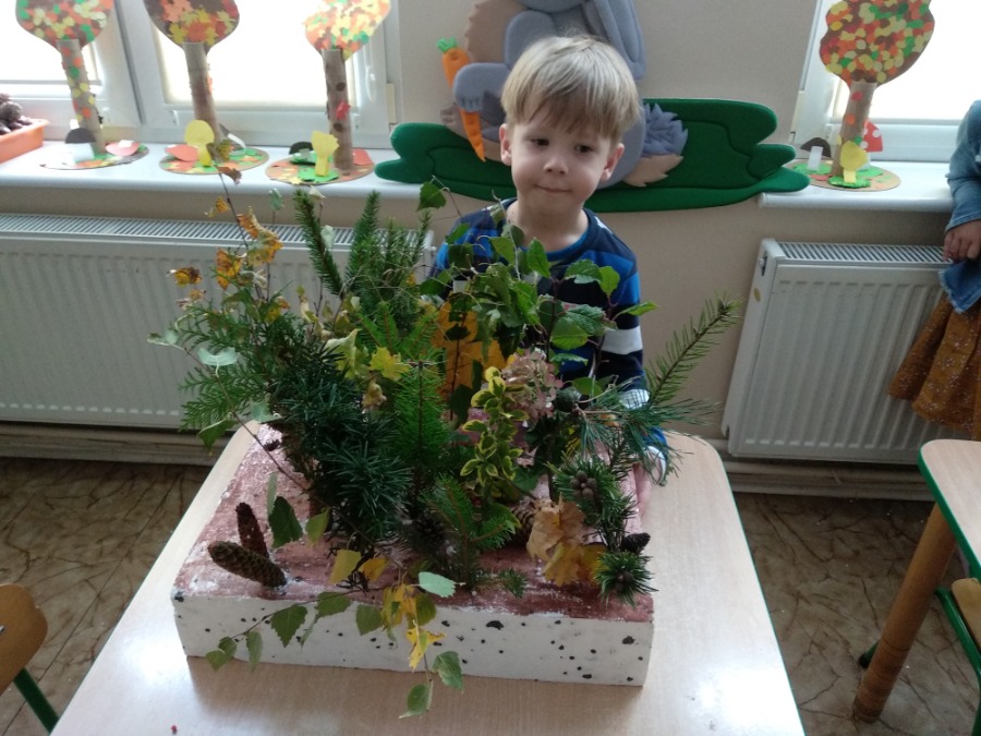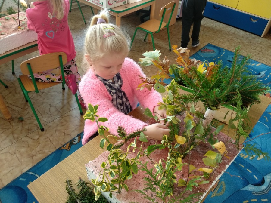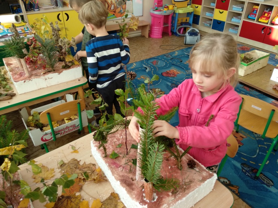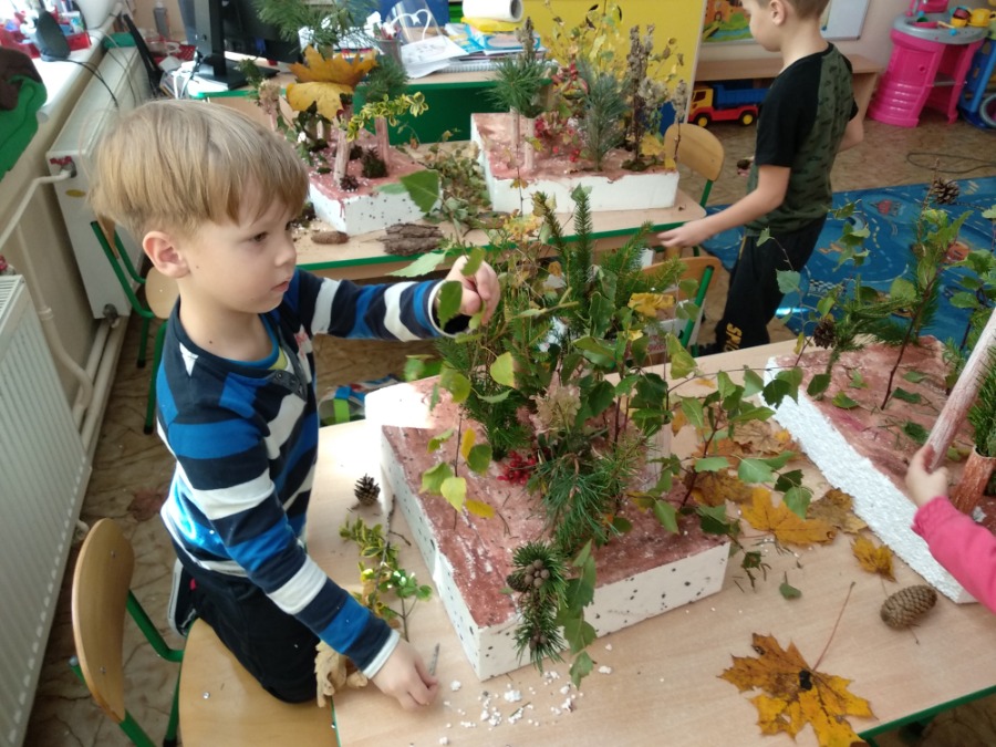 Przedszkolaki z zapałem wykonywali makietę lasu z przyniesionego przez nie materiału przyrodniczego. Powstałe prace pozwoliły utrwalić wiedzę na temat różnego rodzaju drzew, ale przede wszystkim rozwijały twórczą wyobraźnię dzieci.