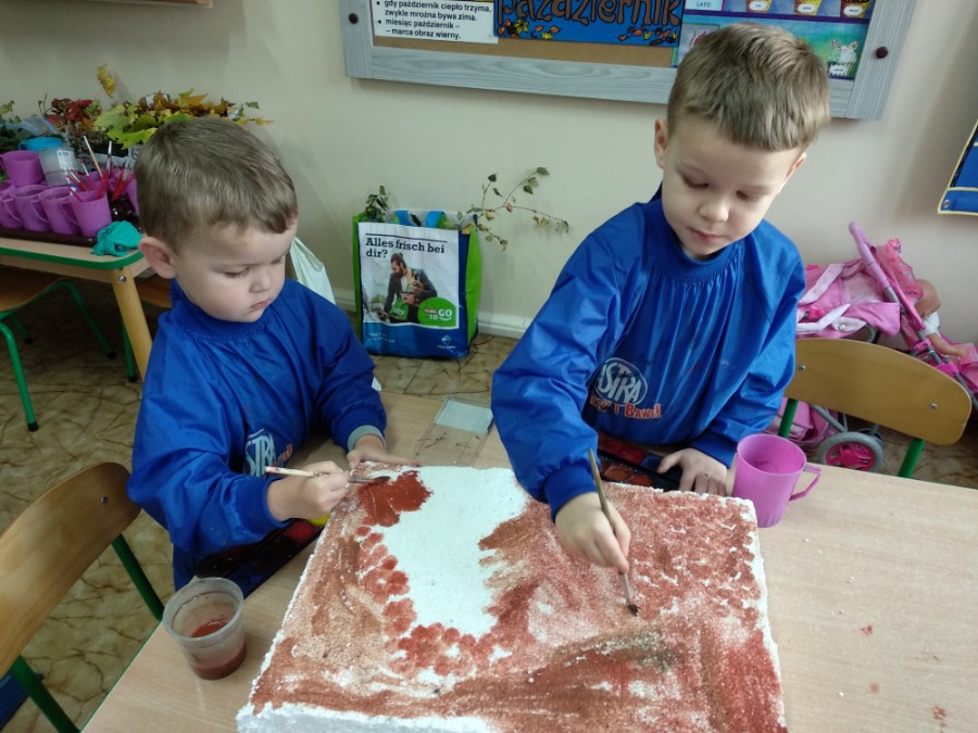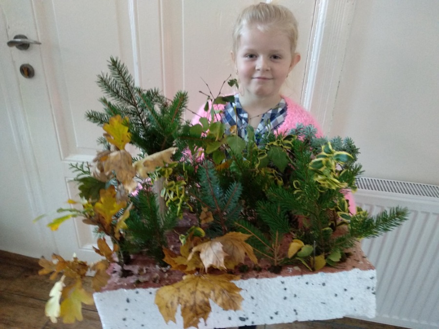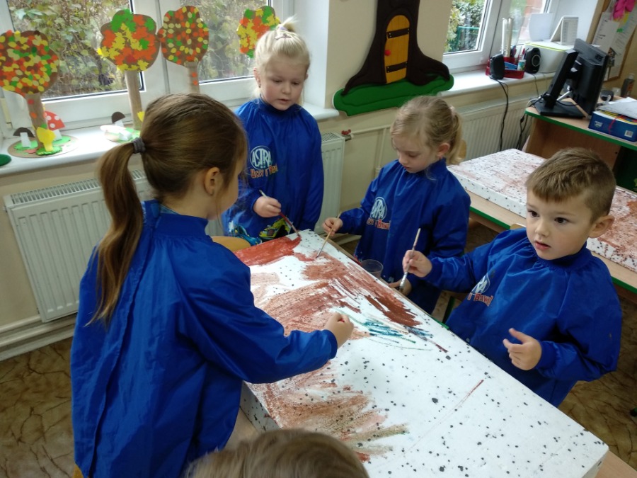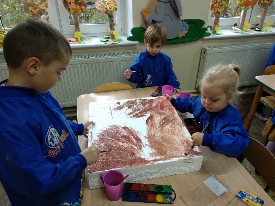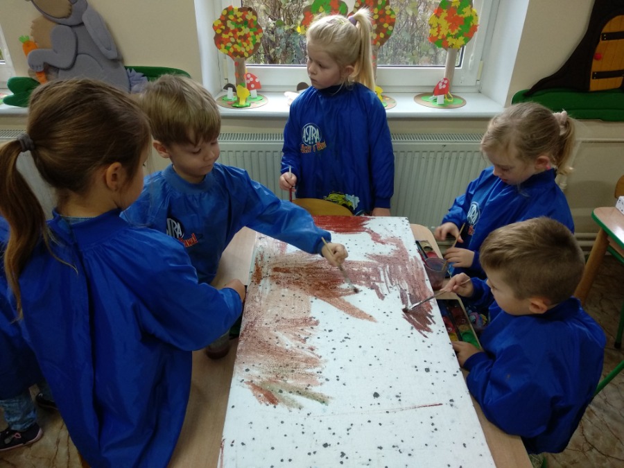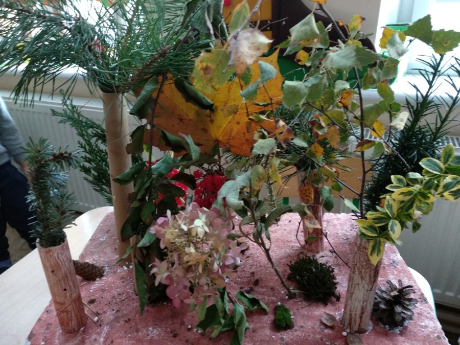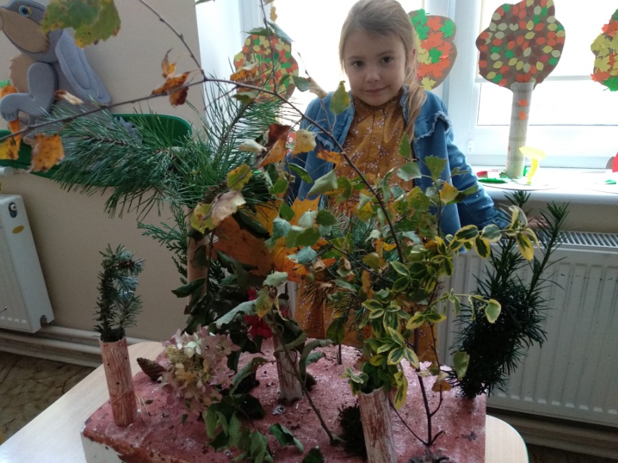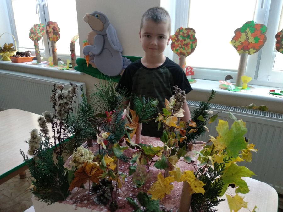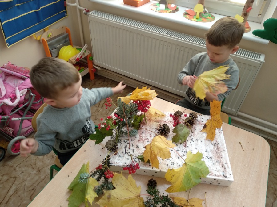 Przedszkolaki z zapałem wykonywali makietę lasu z przyniesionego przez nie materiału przyrodniczego. Powstałe prace pozwoliły utrwalić wiedzę na temat różnego rodzaju drzew, ale przede wszystkim rozwijały twórczą wyobraźnię dzieci.