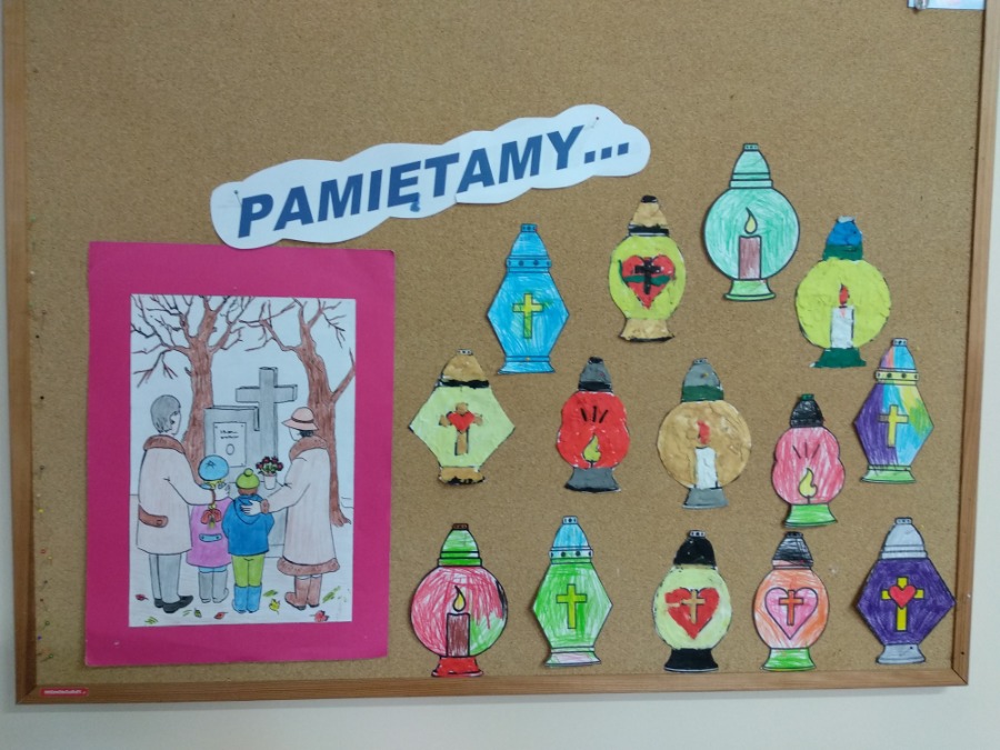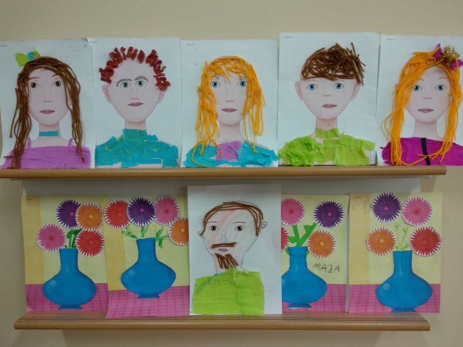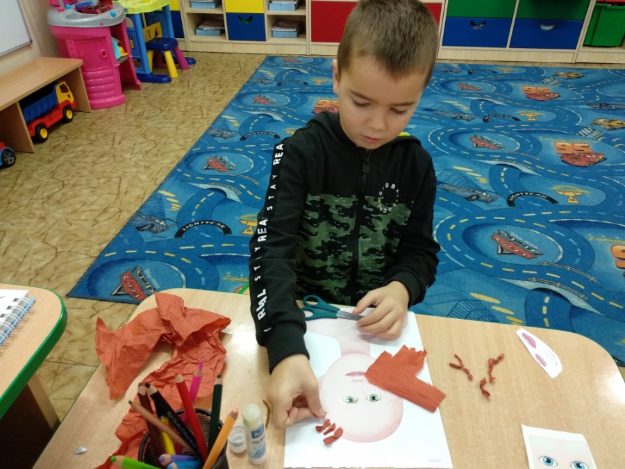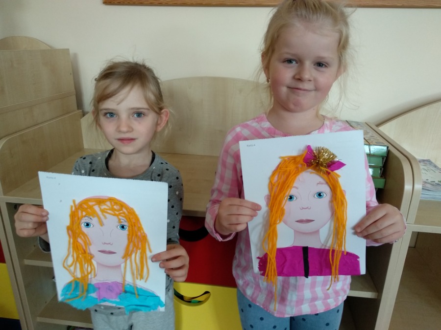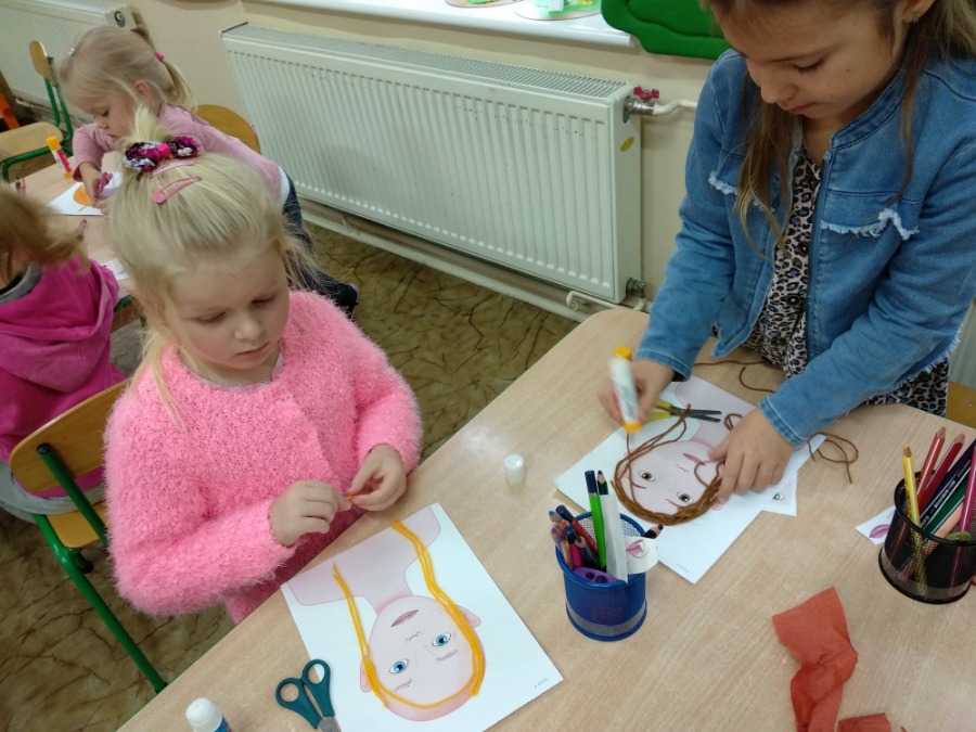 Starszaki tworzyły swoje portrety używając gotowych elementów oraz kolorowej bibuły i włóczki. Maluszki, z racji deszczowej pogody, wykonywały kolorowe parasole. Dzień wcześniej powstały kolorowe znicze.