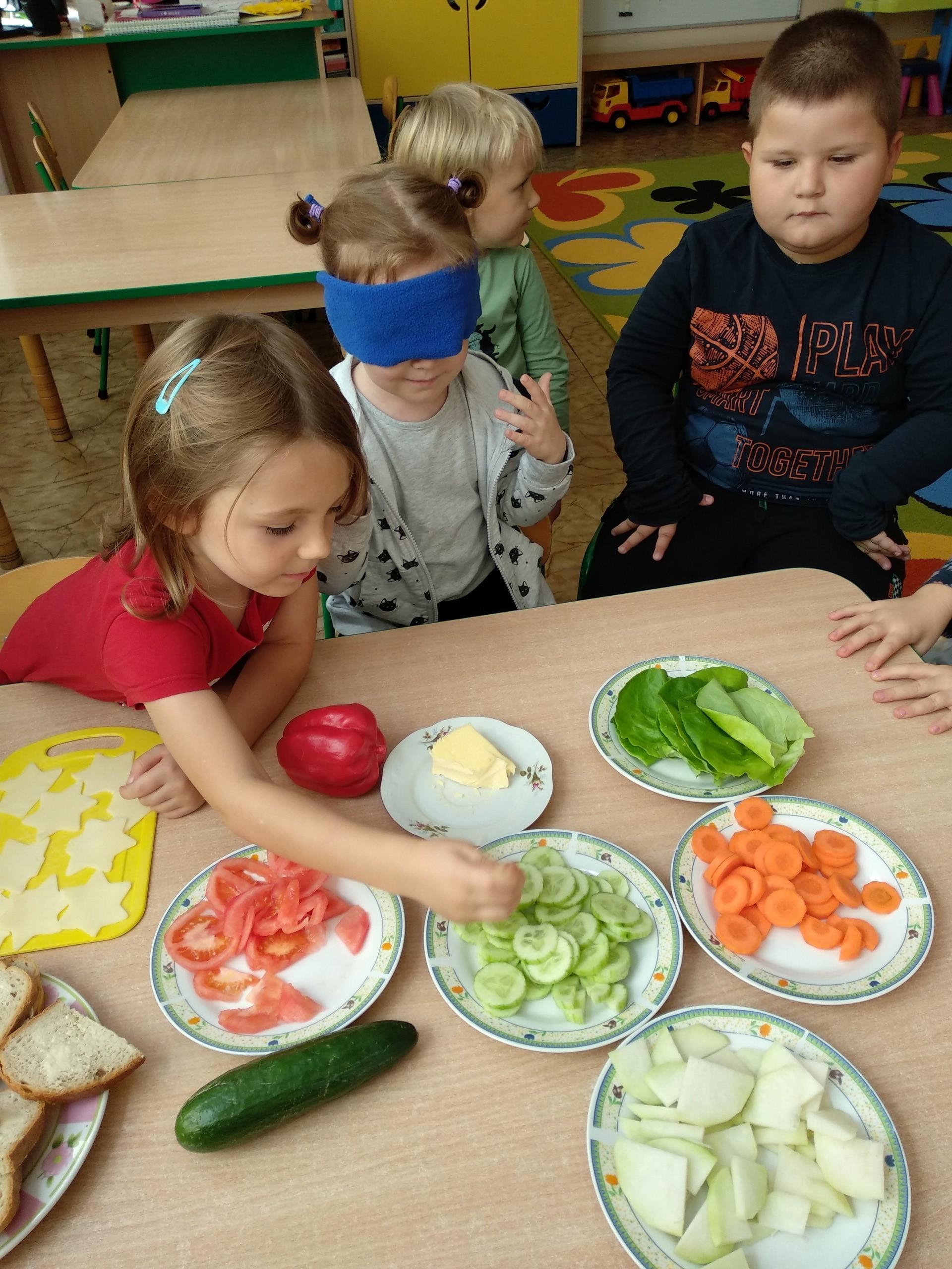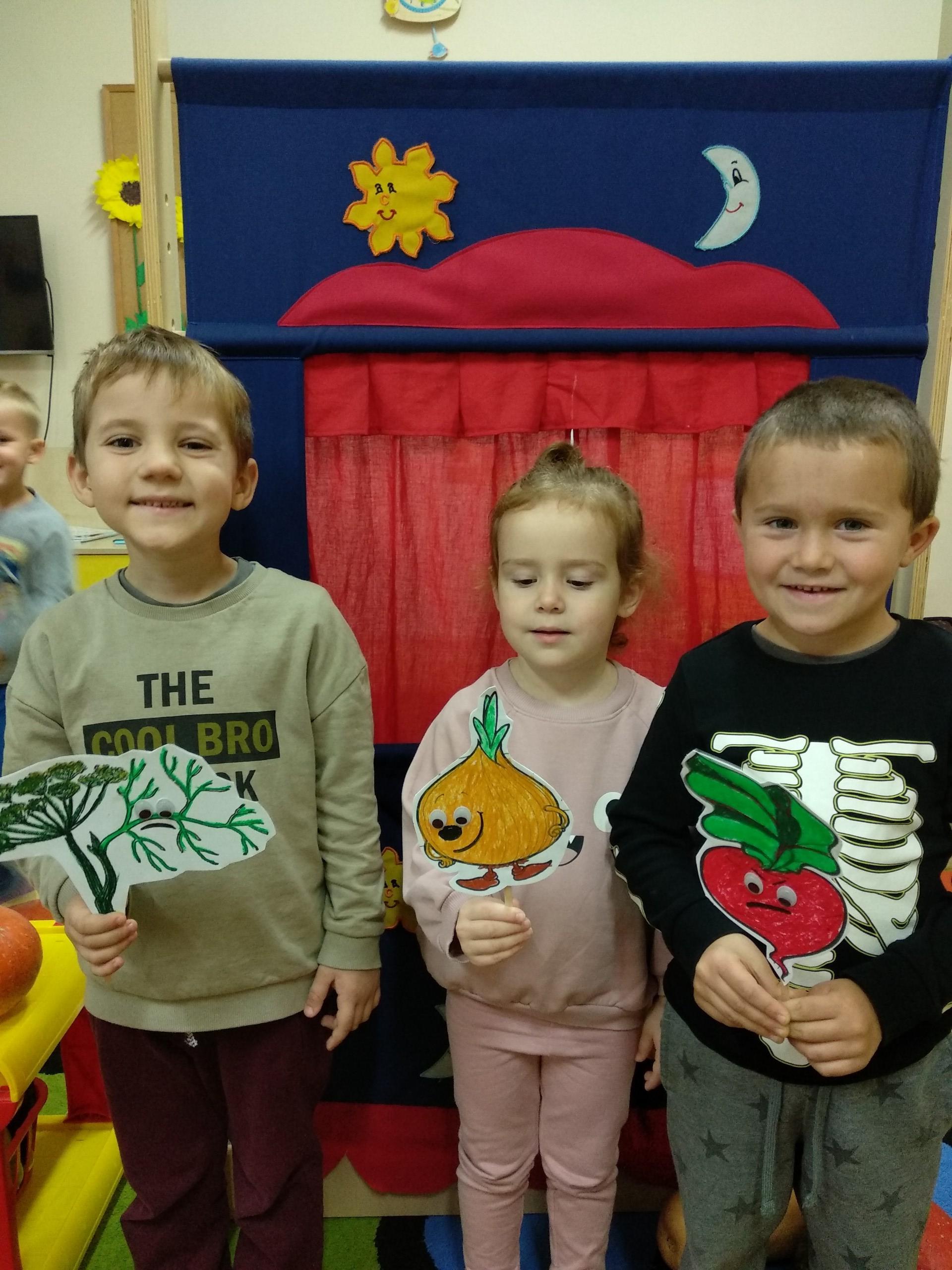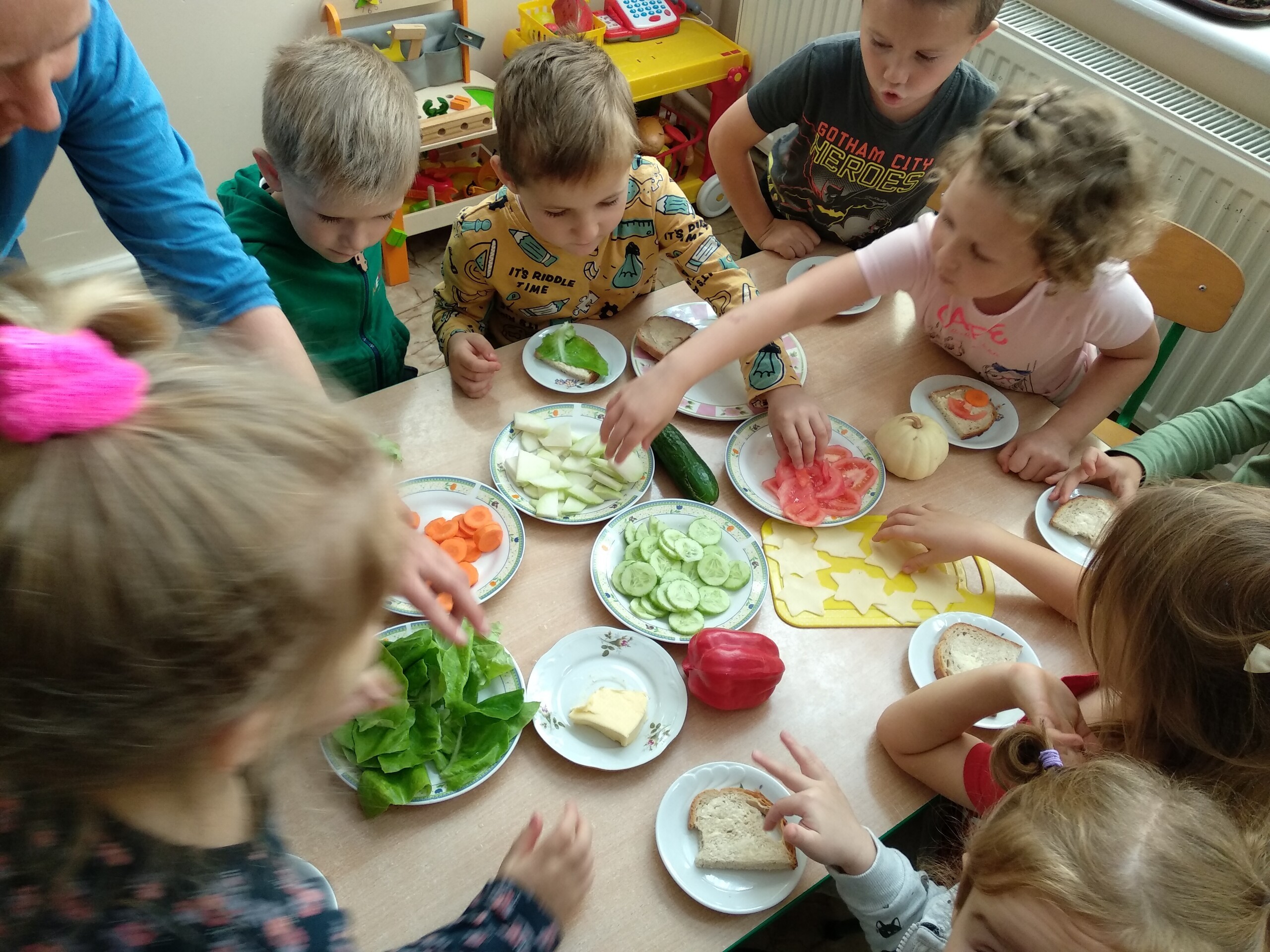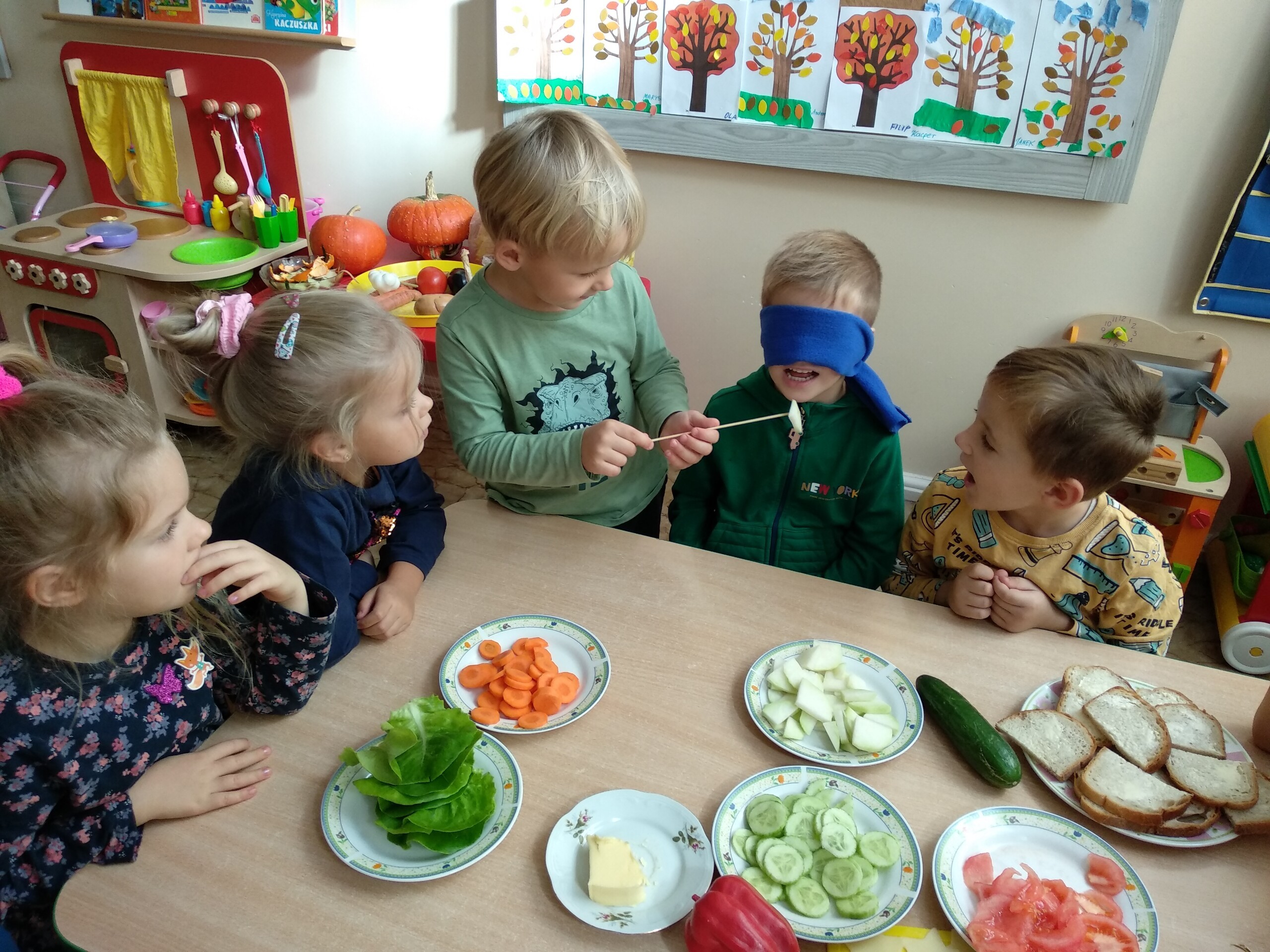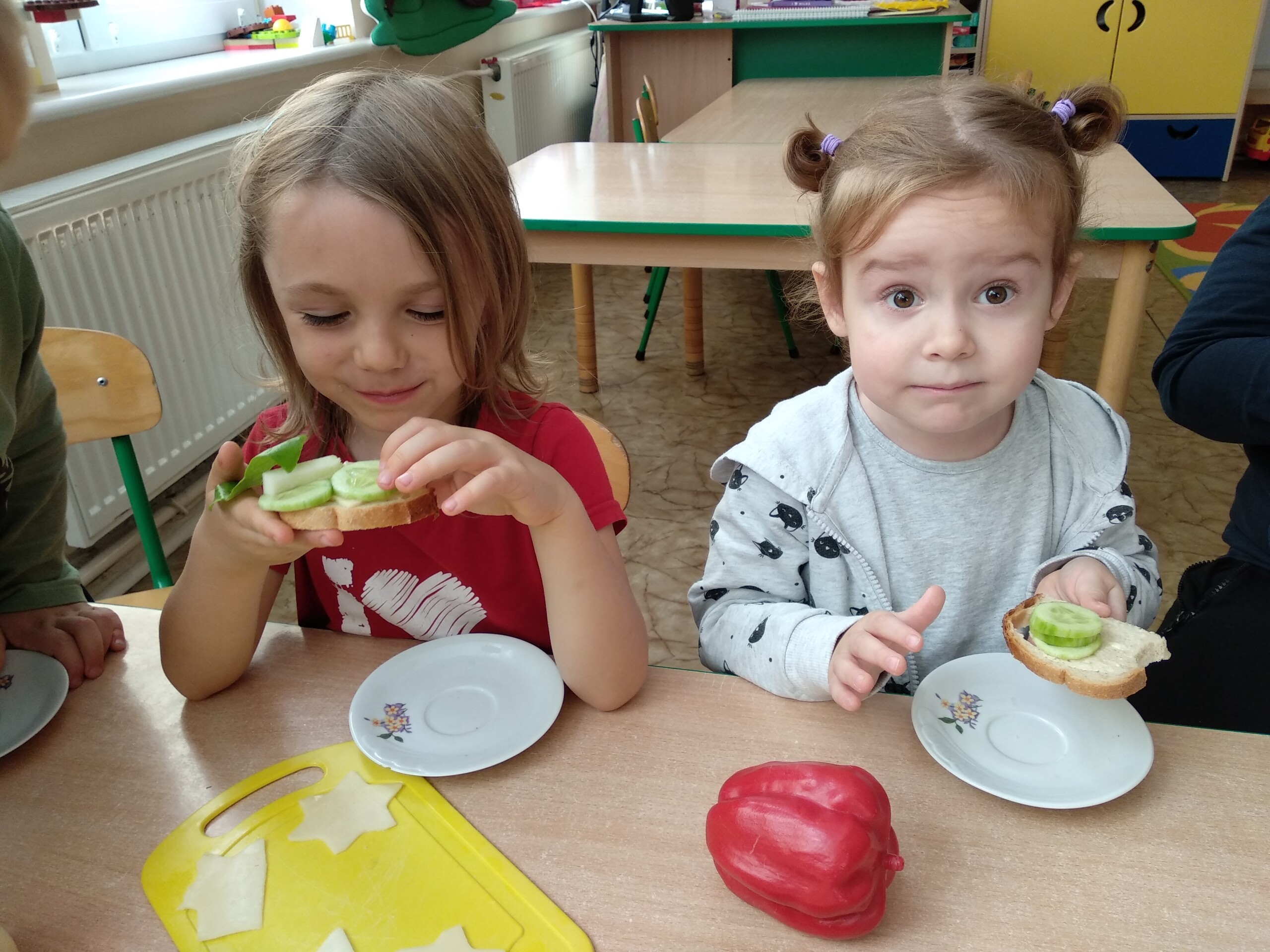 Bohaterami zajęć były warzywa. Rozwijaliśmy zmysł dotyku oraz smaku, tworzyliśmy witaminowe kanapki oraz sok. Oglądaliśmy teatrzyk ,,Na straganie" J. Brzechwy, w którym wykorzystaliśmy wspólnie wykonane sylwety warzyw. Maluchy wykonały zapasy na zimę:)
