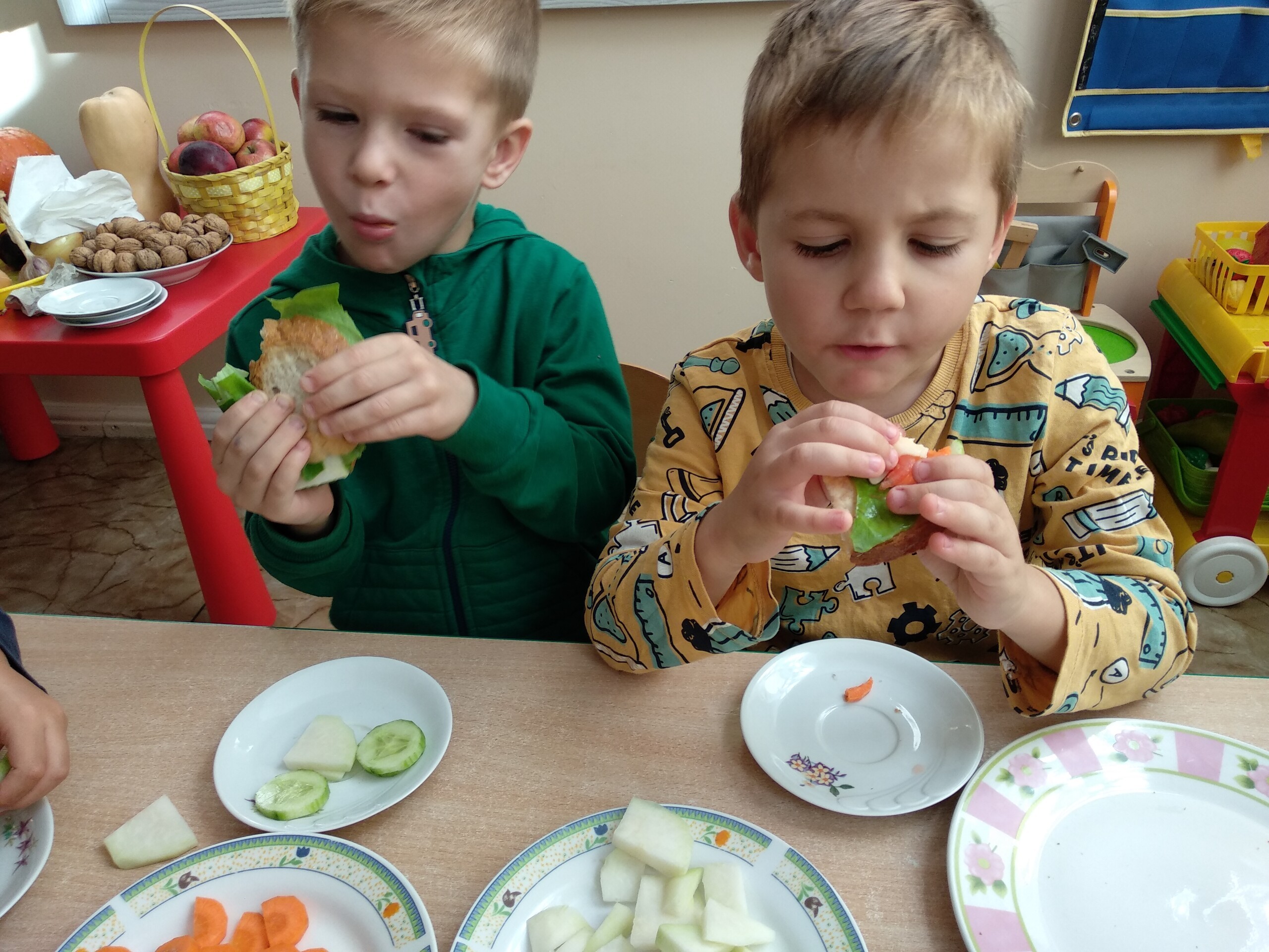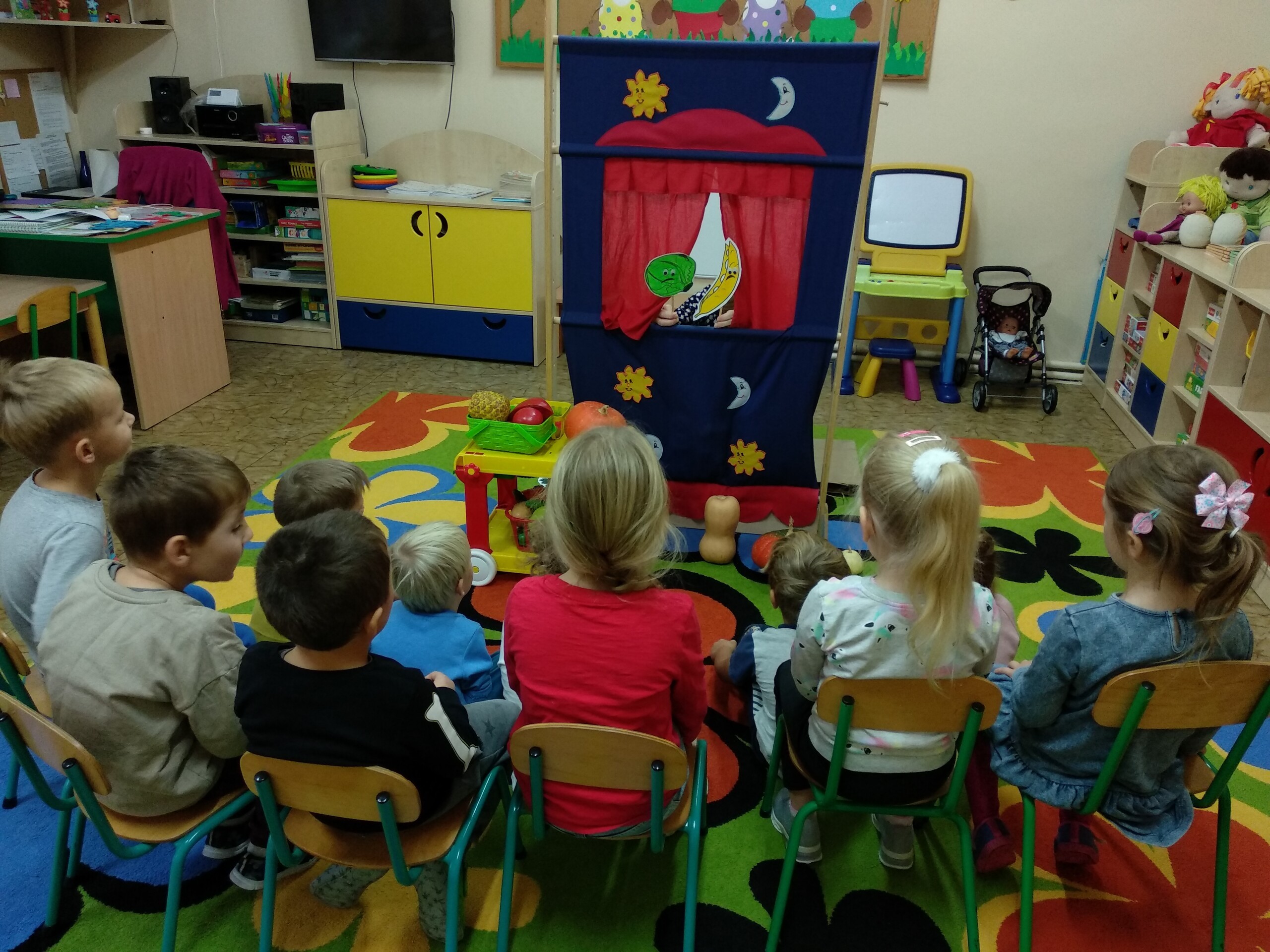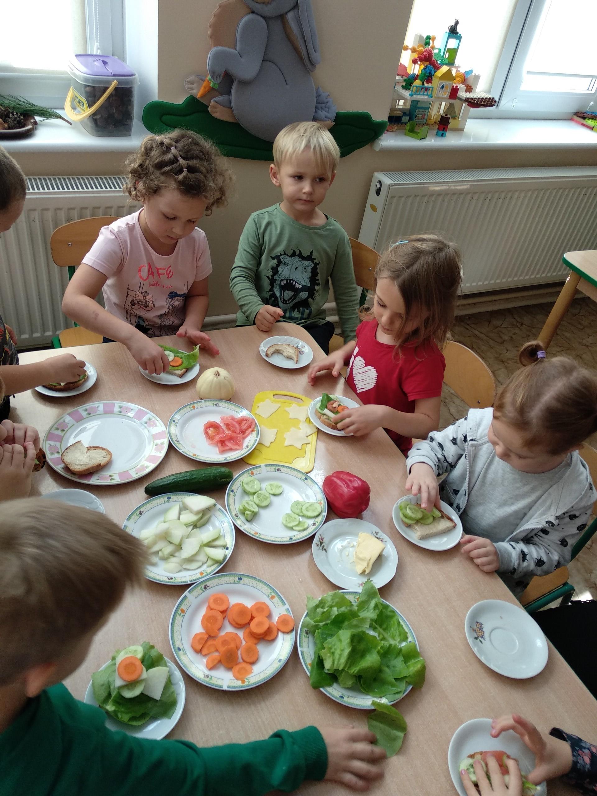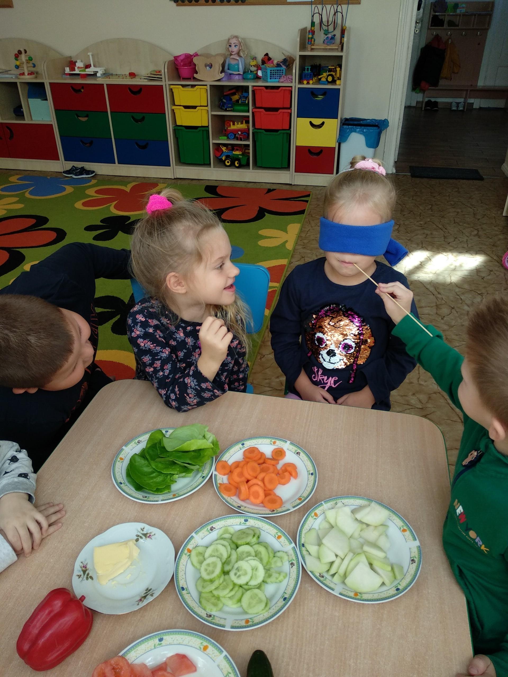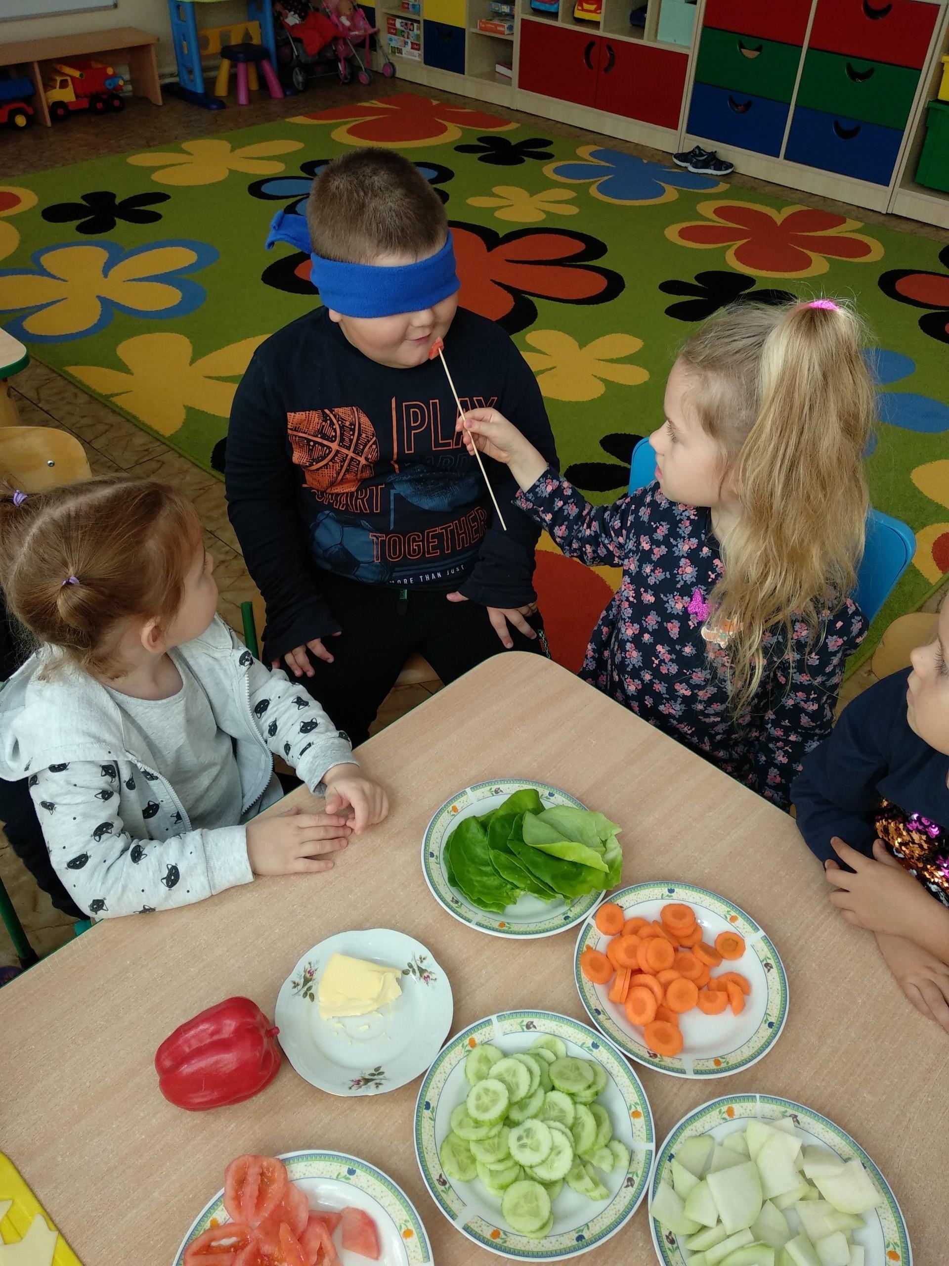 Bohaterami zajęć były warzywa. Rozwijaliśmy zmysł dotyku oraz smaku, tworzyliśmy witaminowe kanapki oraz sok. Oglądaliśmy teatrzyk ,,Na straganie" J. Brzechwy, w którym wykorzystaliśmy wspólnie wykonane sylwety warzyw. Maluchy wykonały zapasy na zimę:)