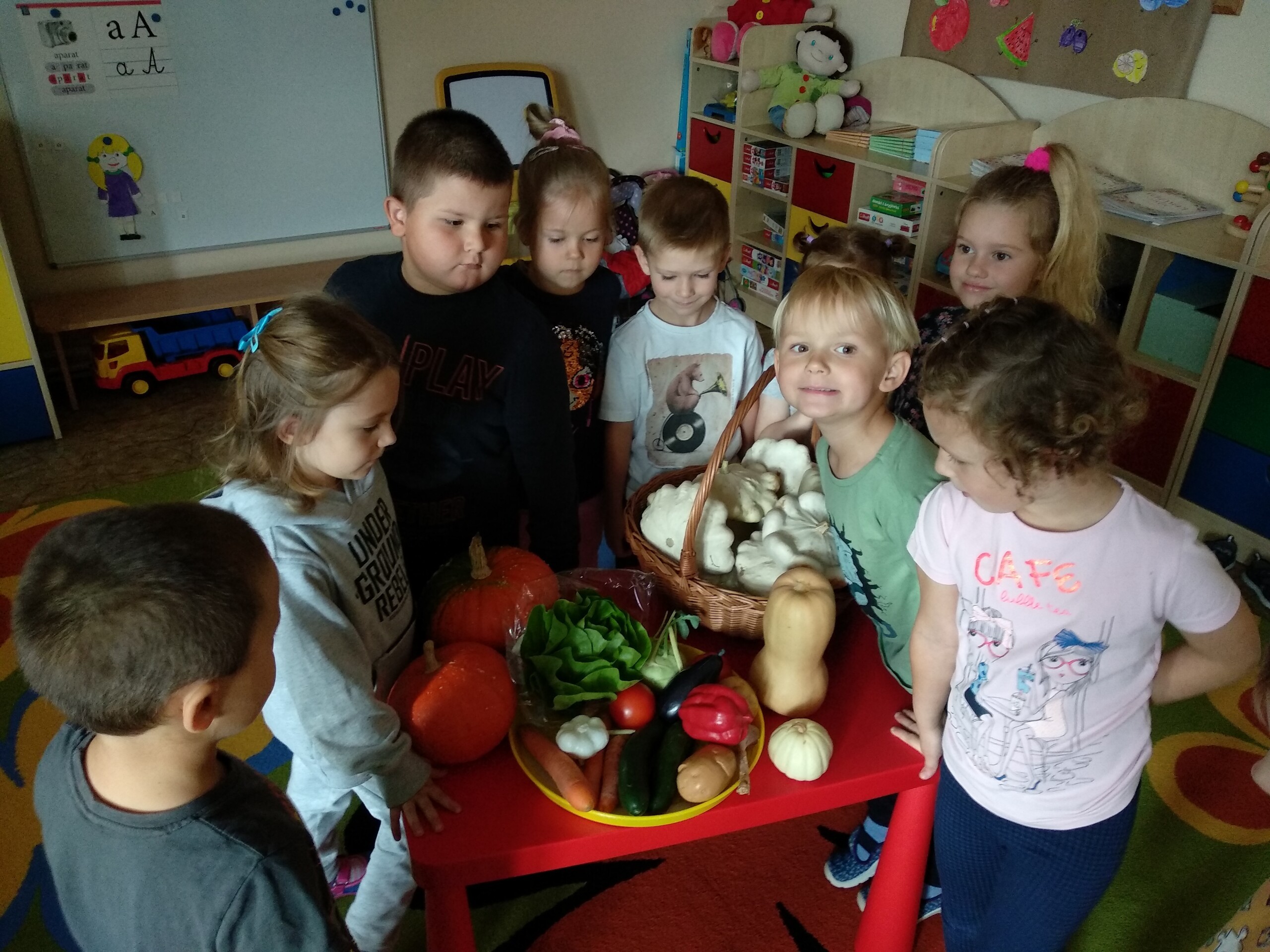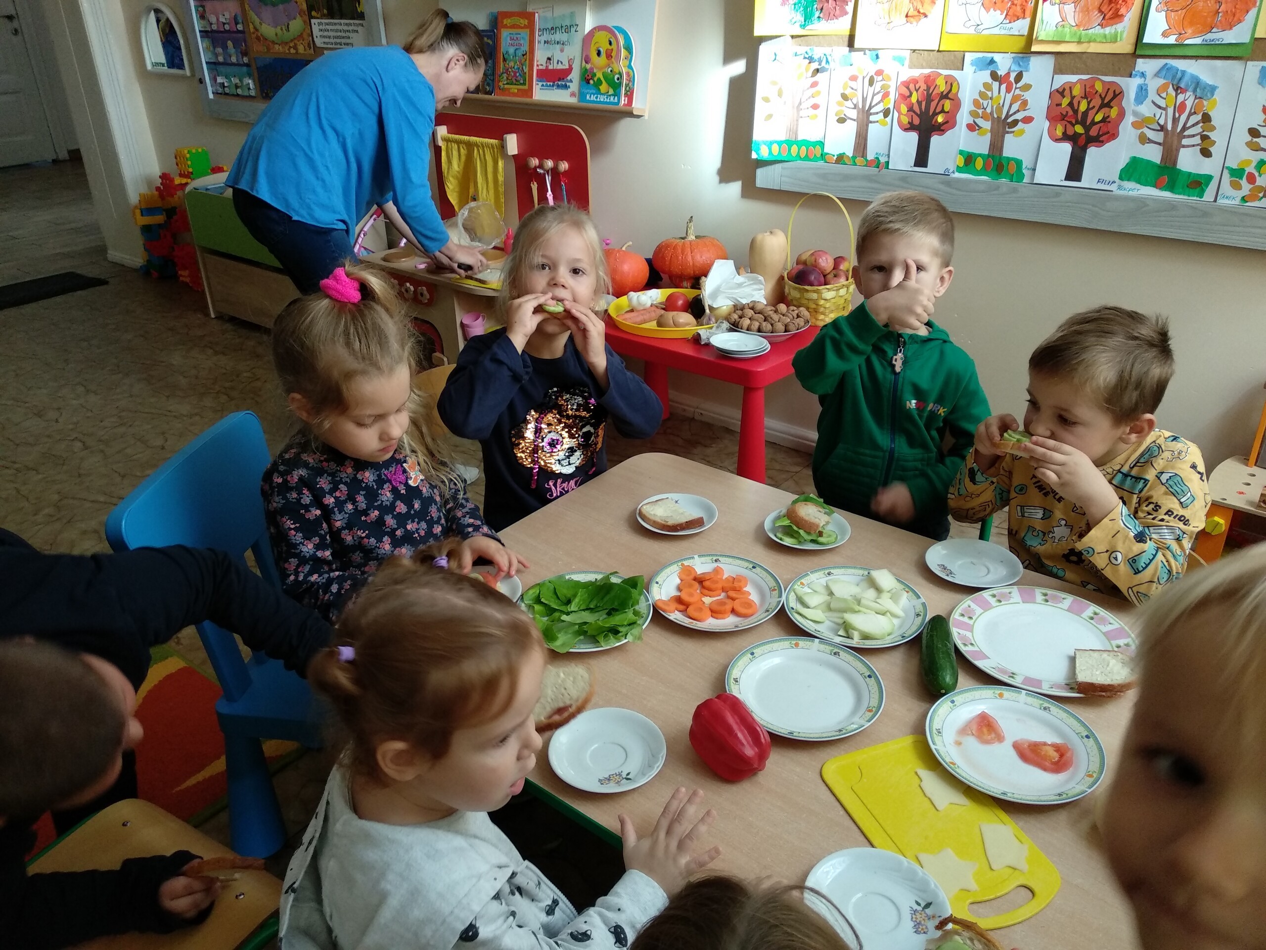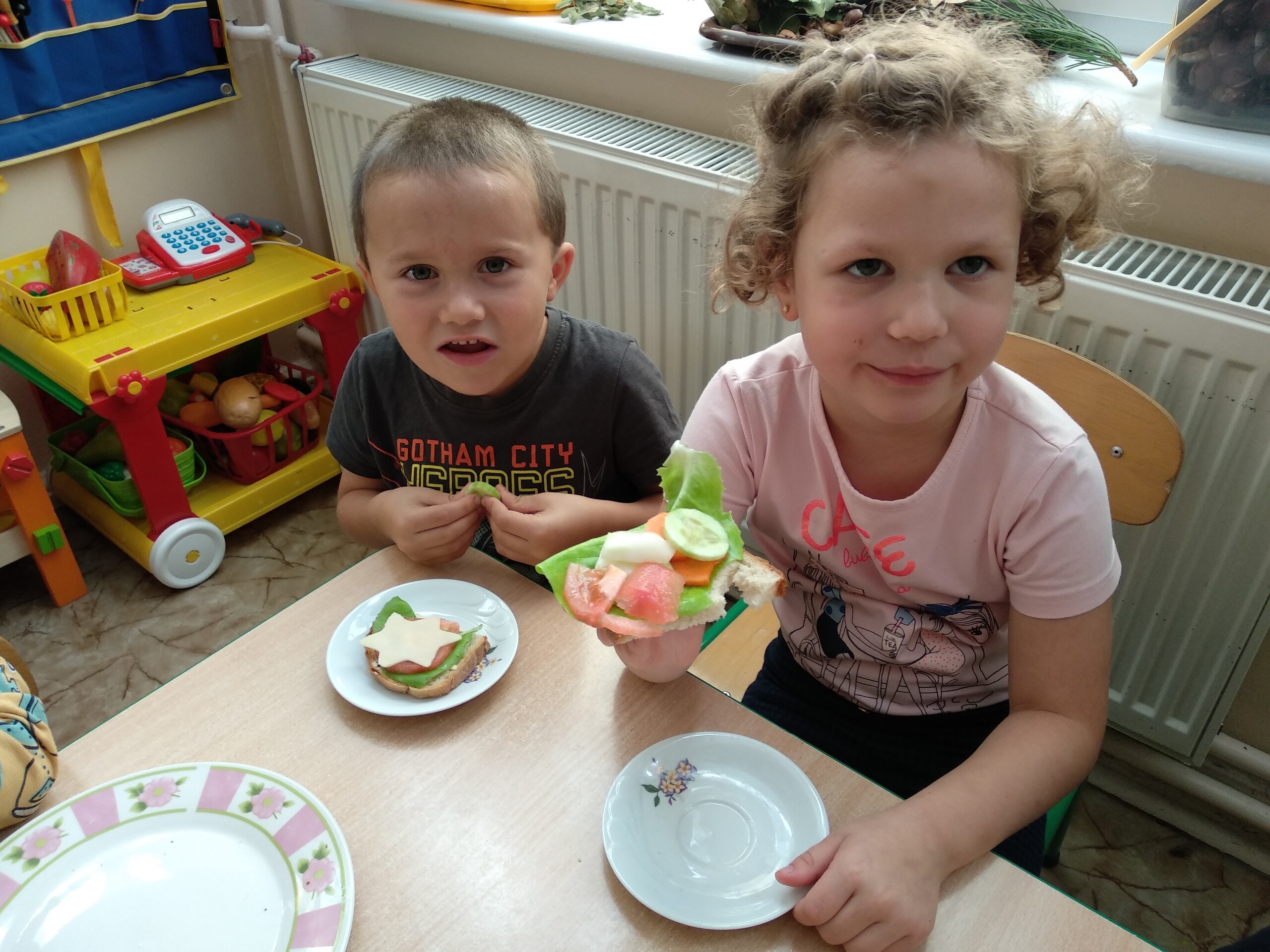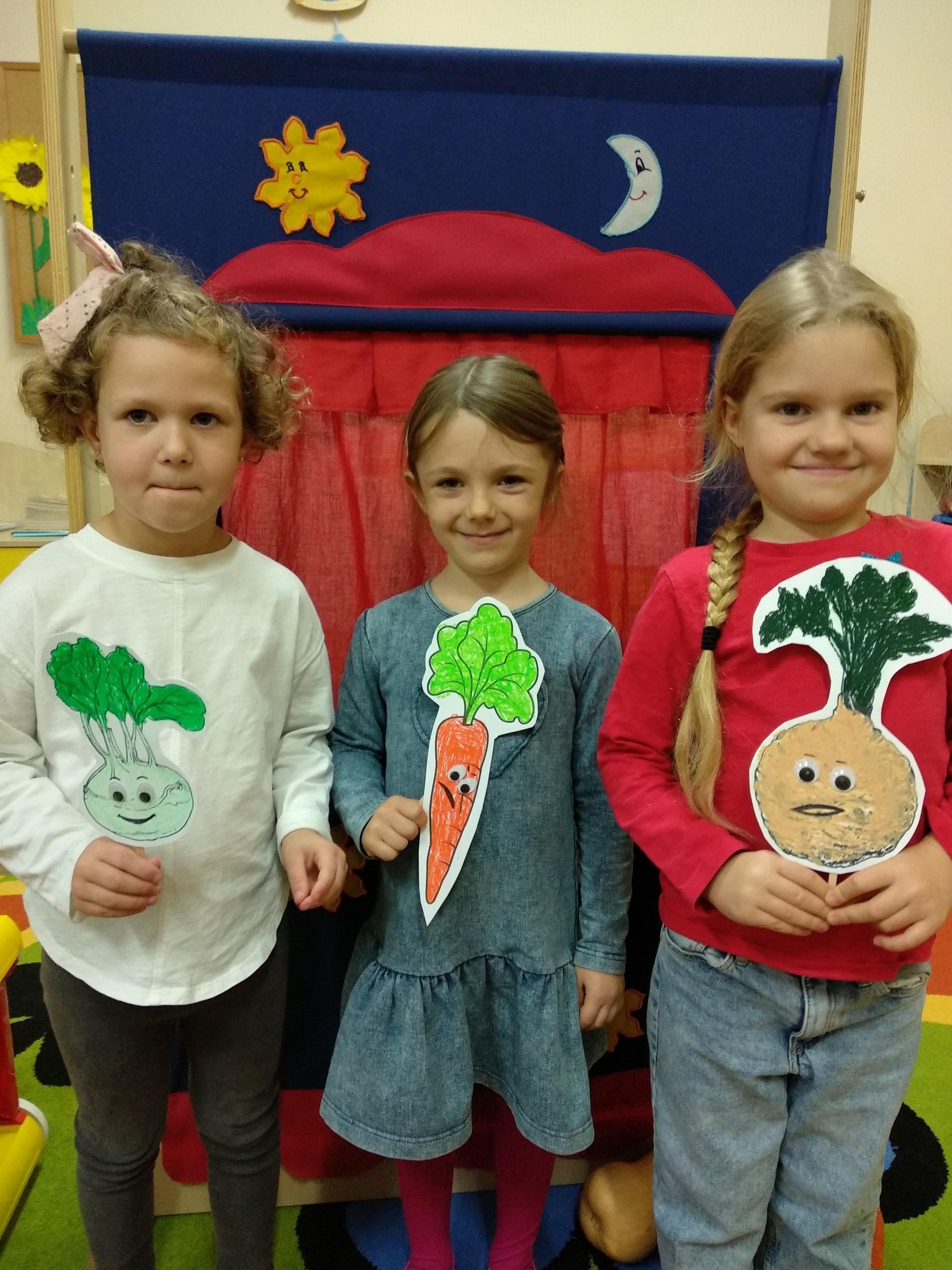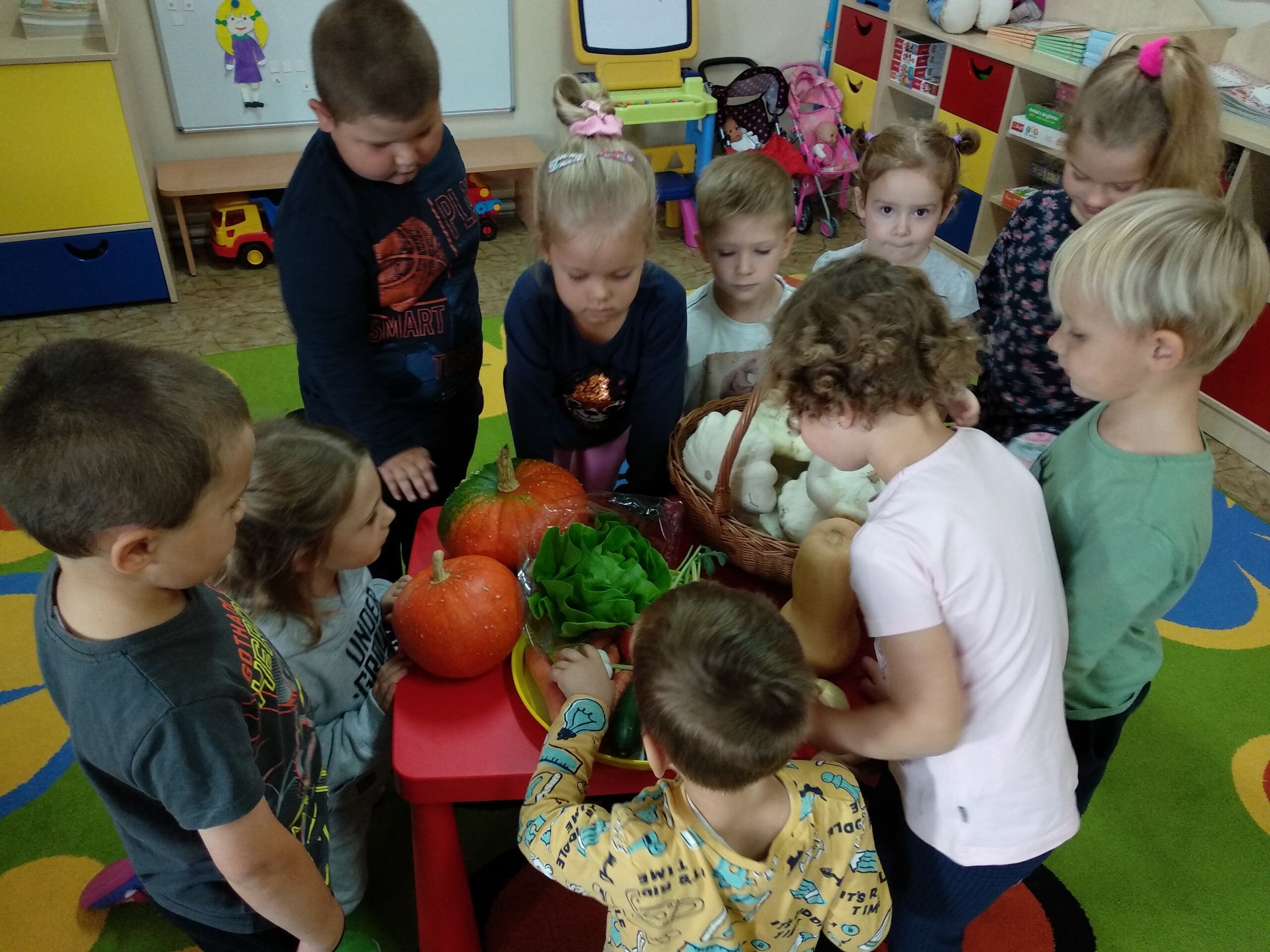 Bohaterami zajęć były warzywa. Rozwijaliśmy zmysł dotyku oraz smaku, tworzyliśmy witaminowe kanapki oraz sok. Oglądaliśmy teatrzyk ,,Na straganie" J. Brzechwy, w którym wykorzystaliśmy wspólnie wykonane sylwety warzyw. Maluchy wykonały zapasy na zimę:)