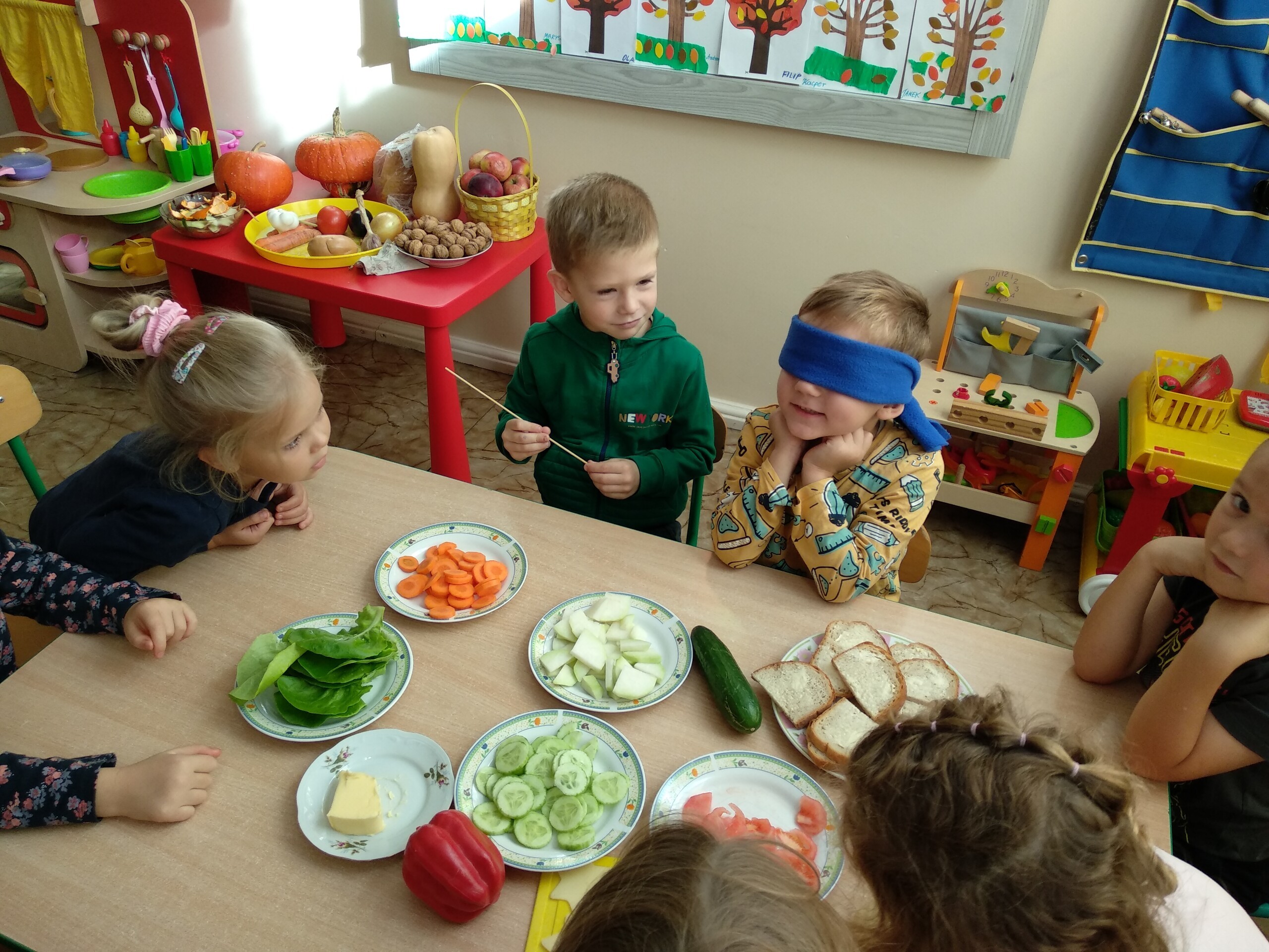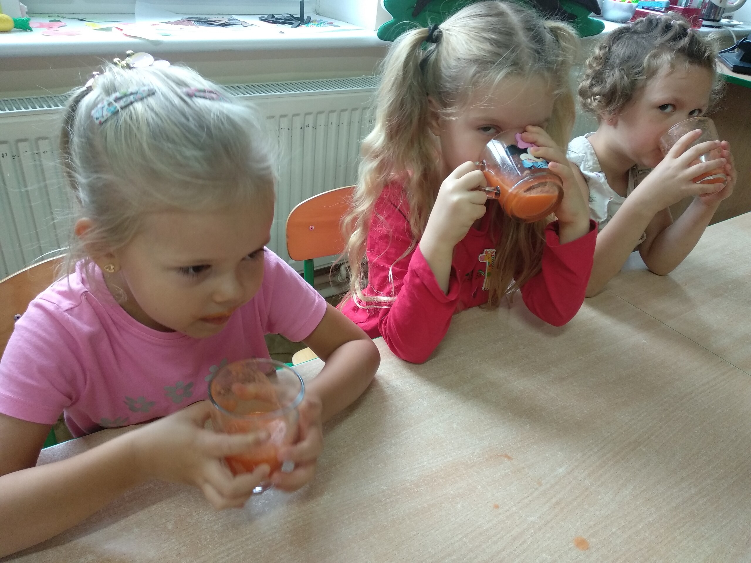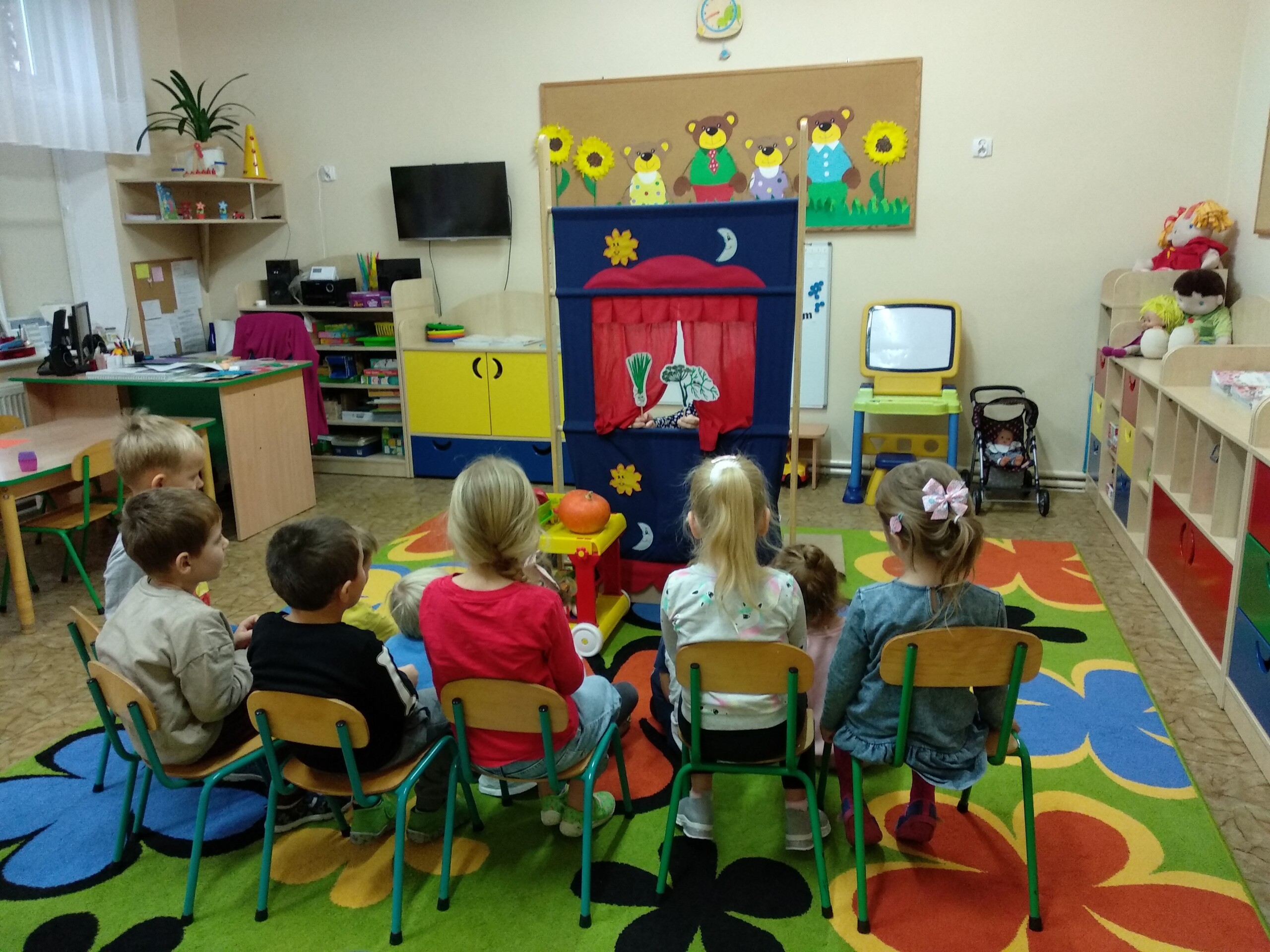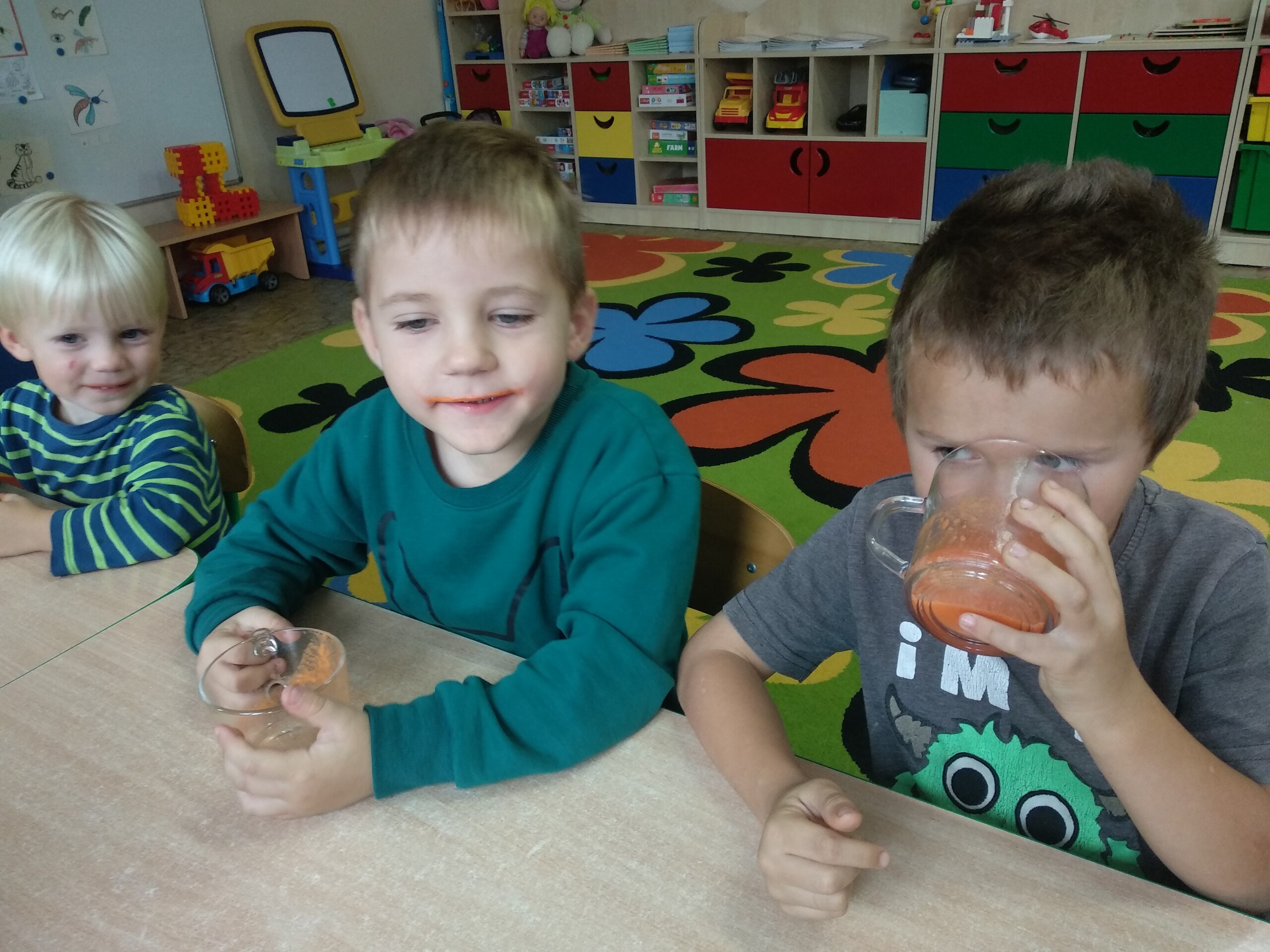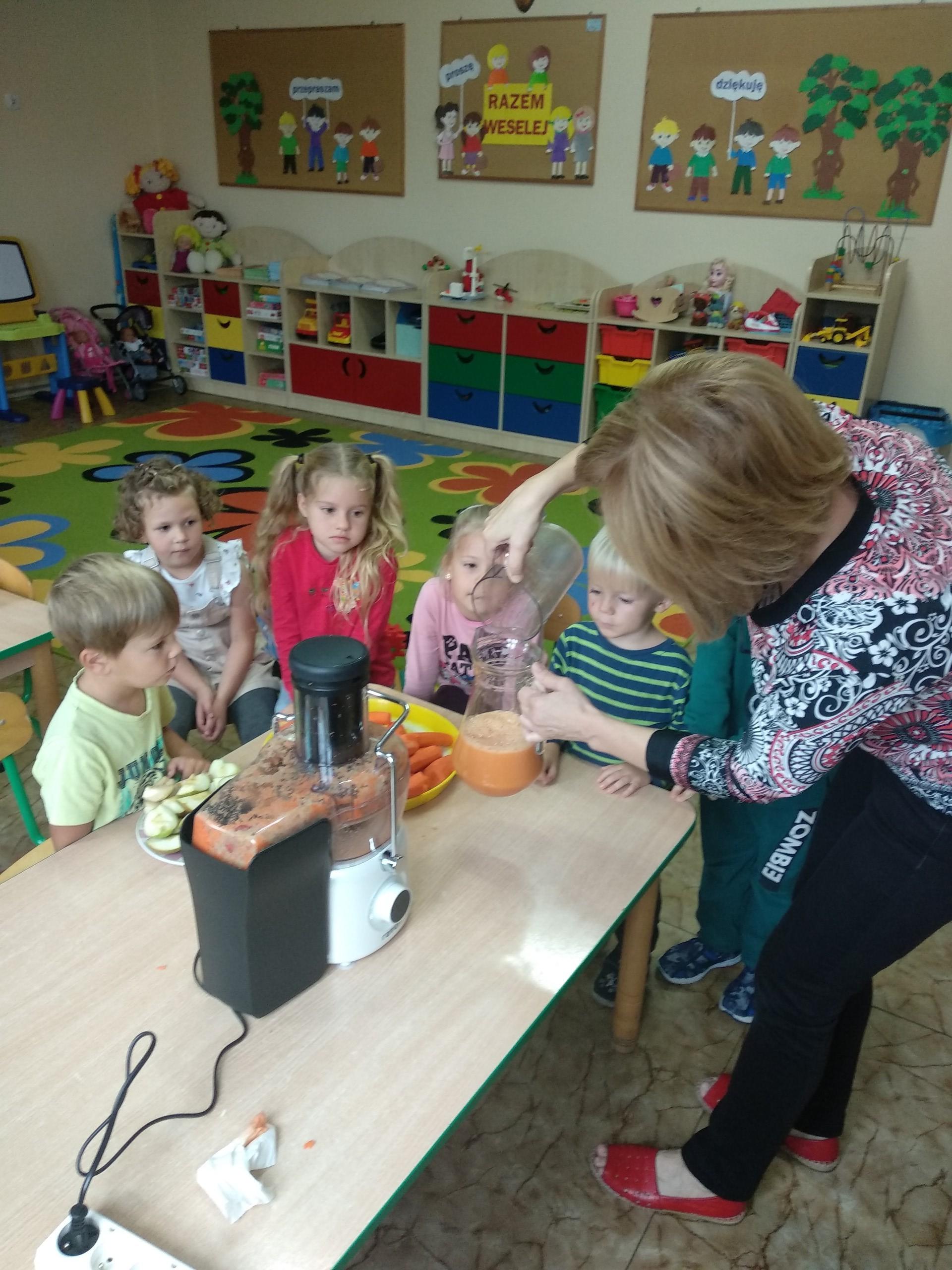 Bohaterami zajęć były warzywa. Rozwijaliśmy zmysł dotyku oraz smaku, tworzyliśmy witaminowe kanapki oraz sok. Oglądaliśmy teatrzyk ,,Na straganie" J. Brzechwy, w którym wykorzystaliśmy wspólnie wykonane sylwety warzyw. Maluchy wykonały zapasy na zimę:)