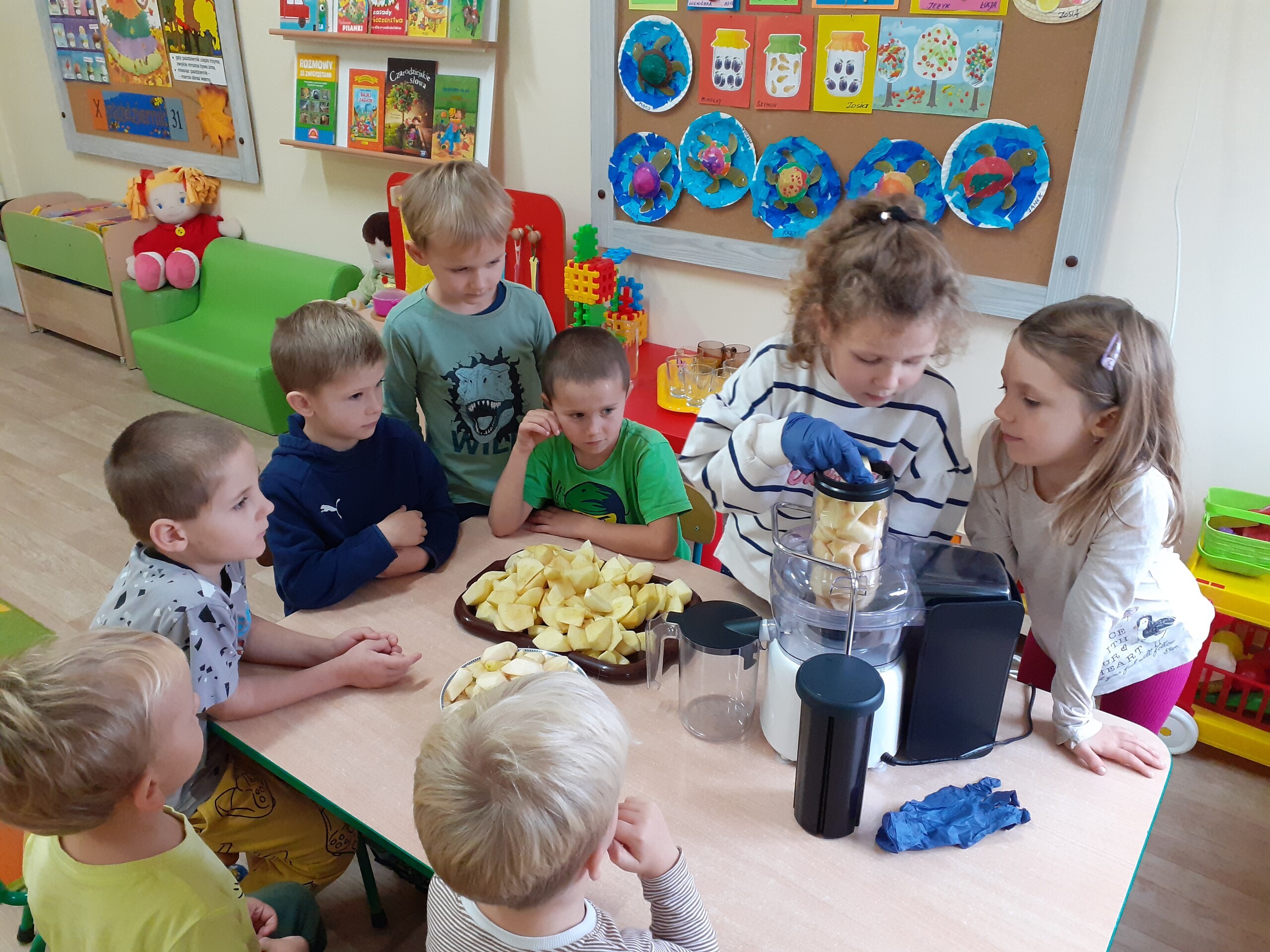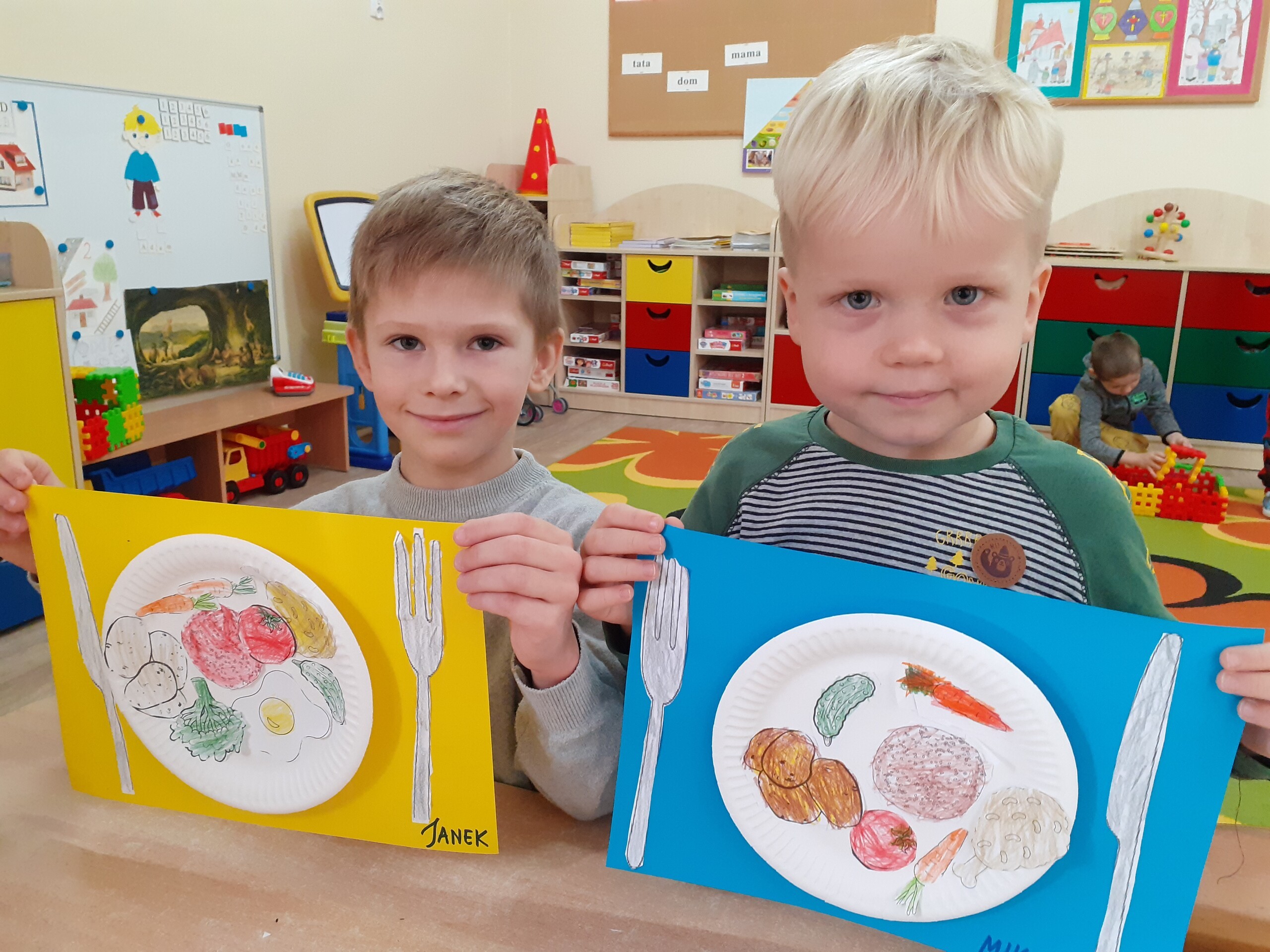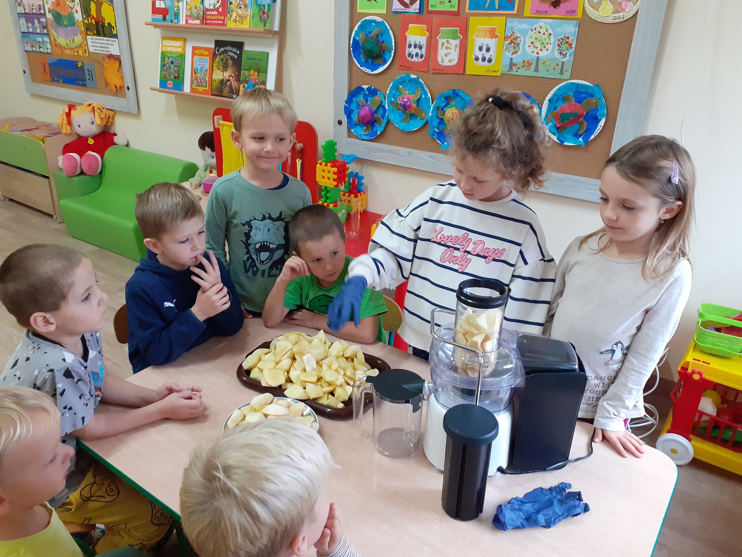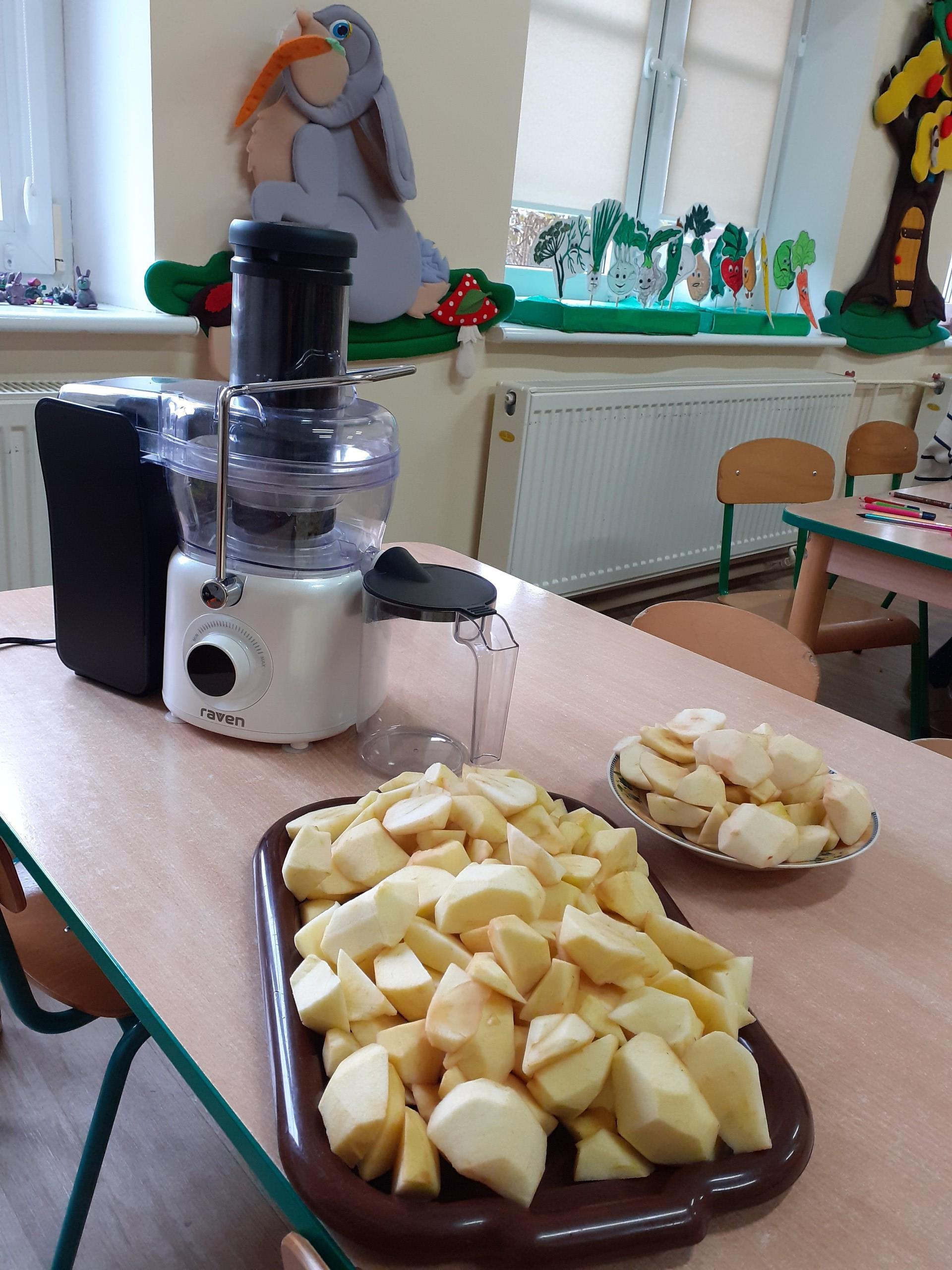 W związku z omawianą tematyką ,,Zdrowie naszym skarbem" powstały prace plastyczne pod hasłem ,,Zdrowie na talerzu" oraz ponownie przyrządziliśmy sok owocowy z jabłek przyniesionych przez Maksa, Kacpra i Szymona. Dziękujemy, były pyszne!