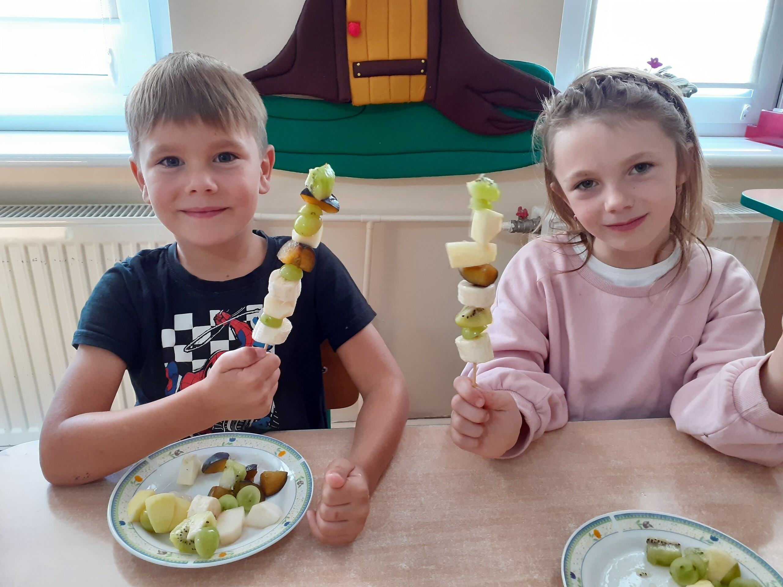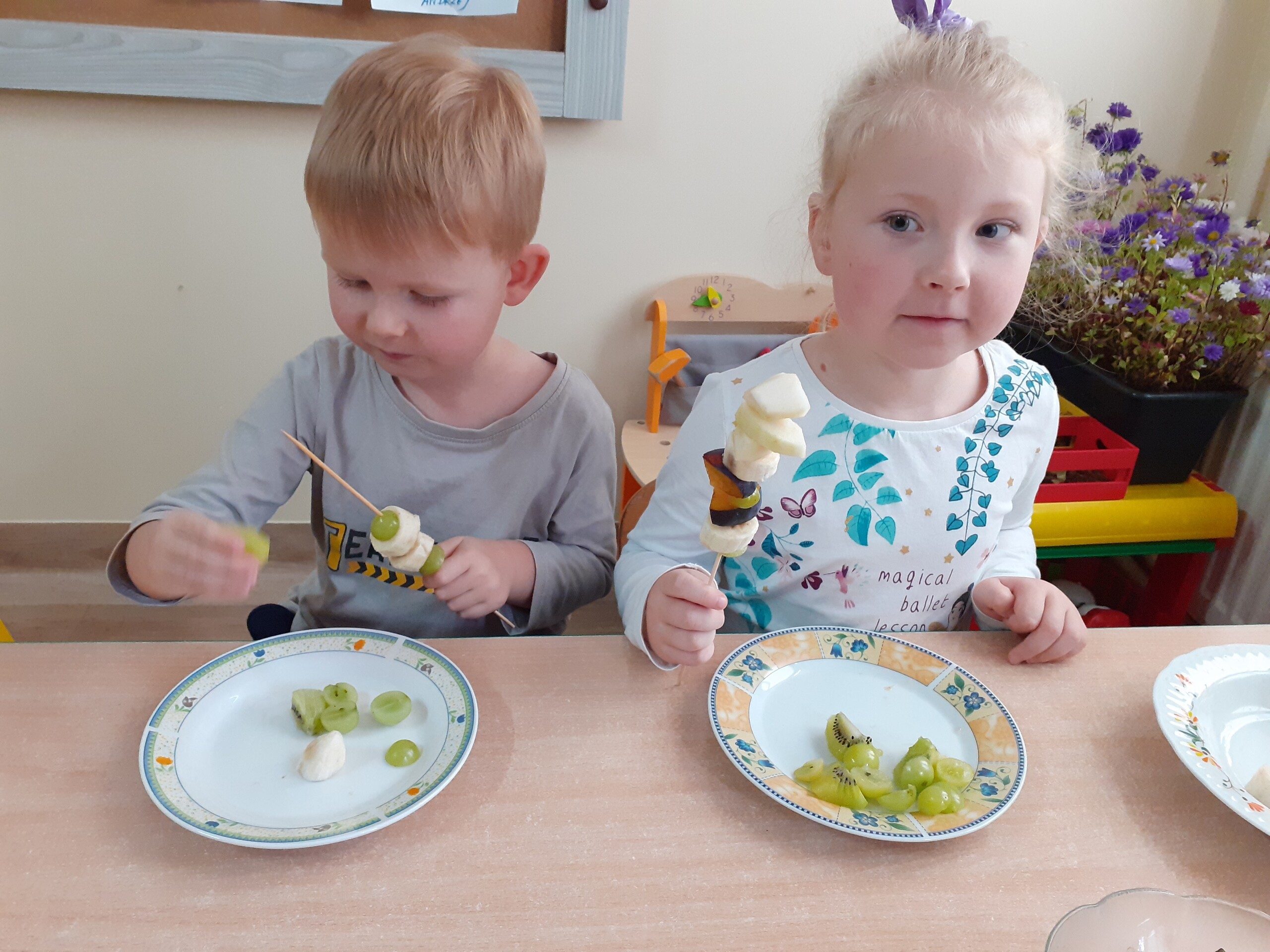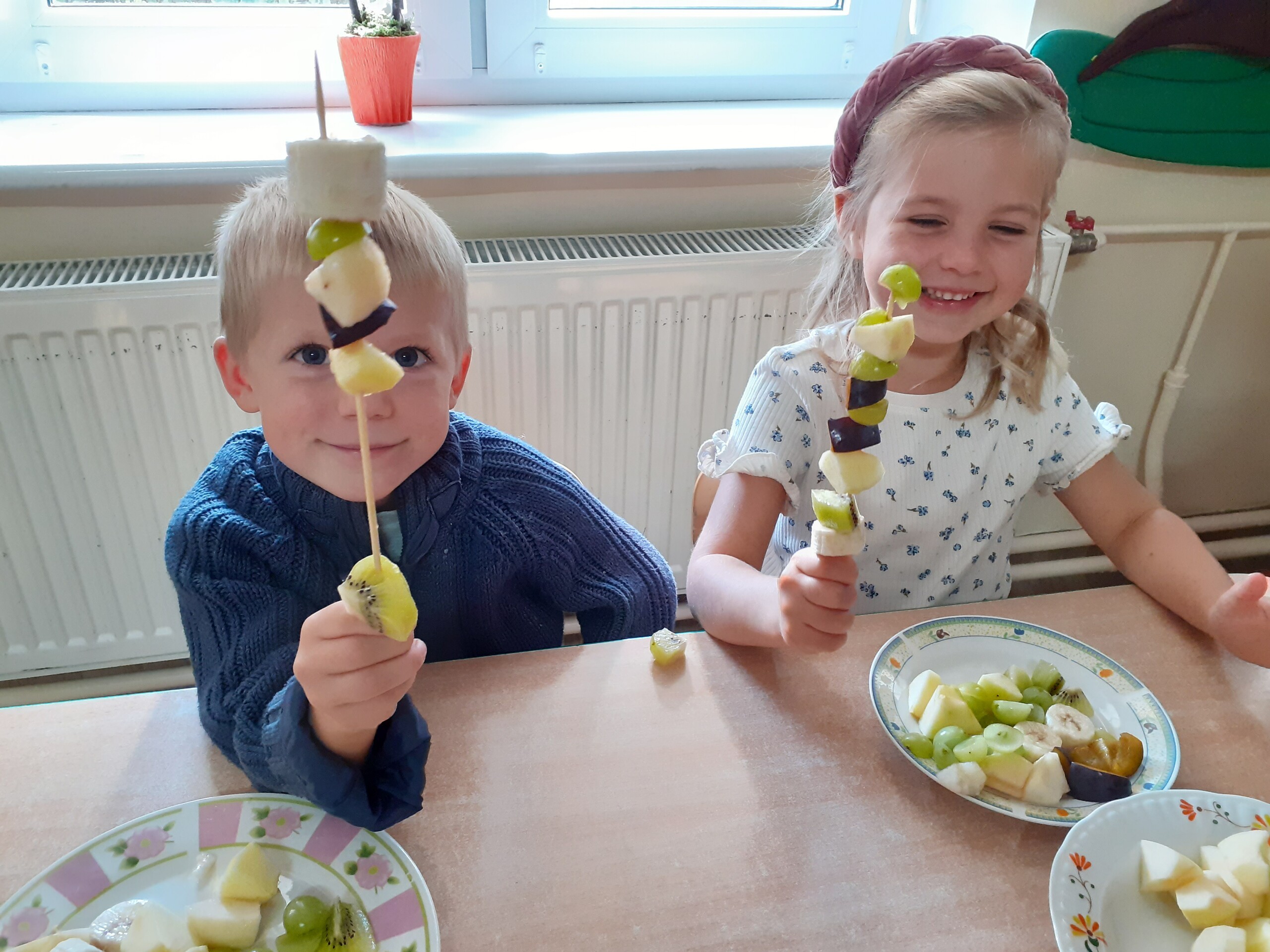 Korzystając z darów jesieni przedszkolaki przygotowały owocowe szaszłyki, które nie tylko pięknie wyglądały, ale i pysznie smakowały. Była to dla nich okazja do nauki zdrowych nawyków żywieniowych, rozwijania samodzielności i motoryki małej.