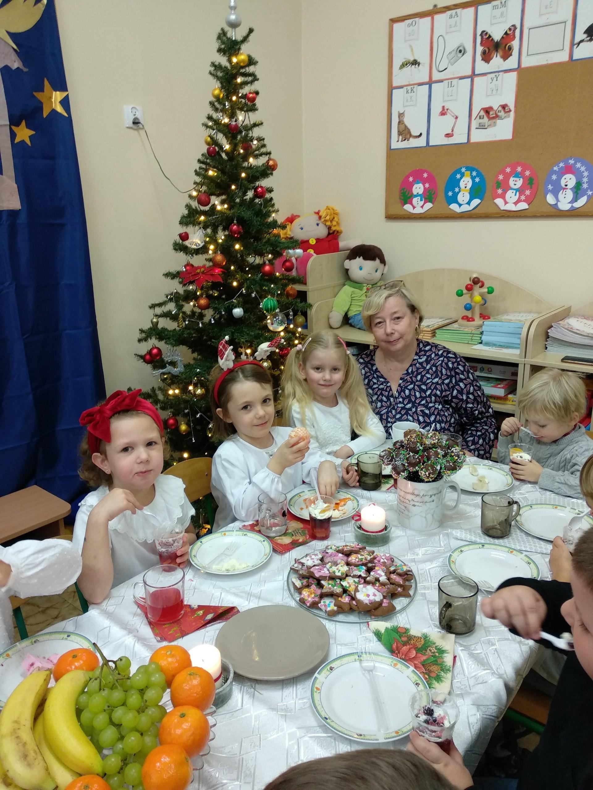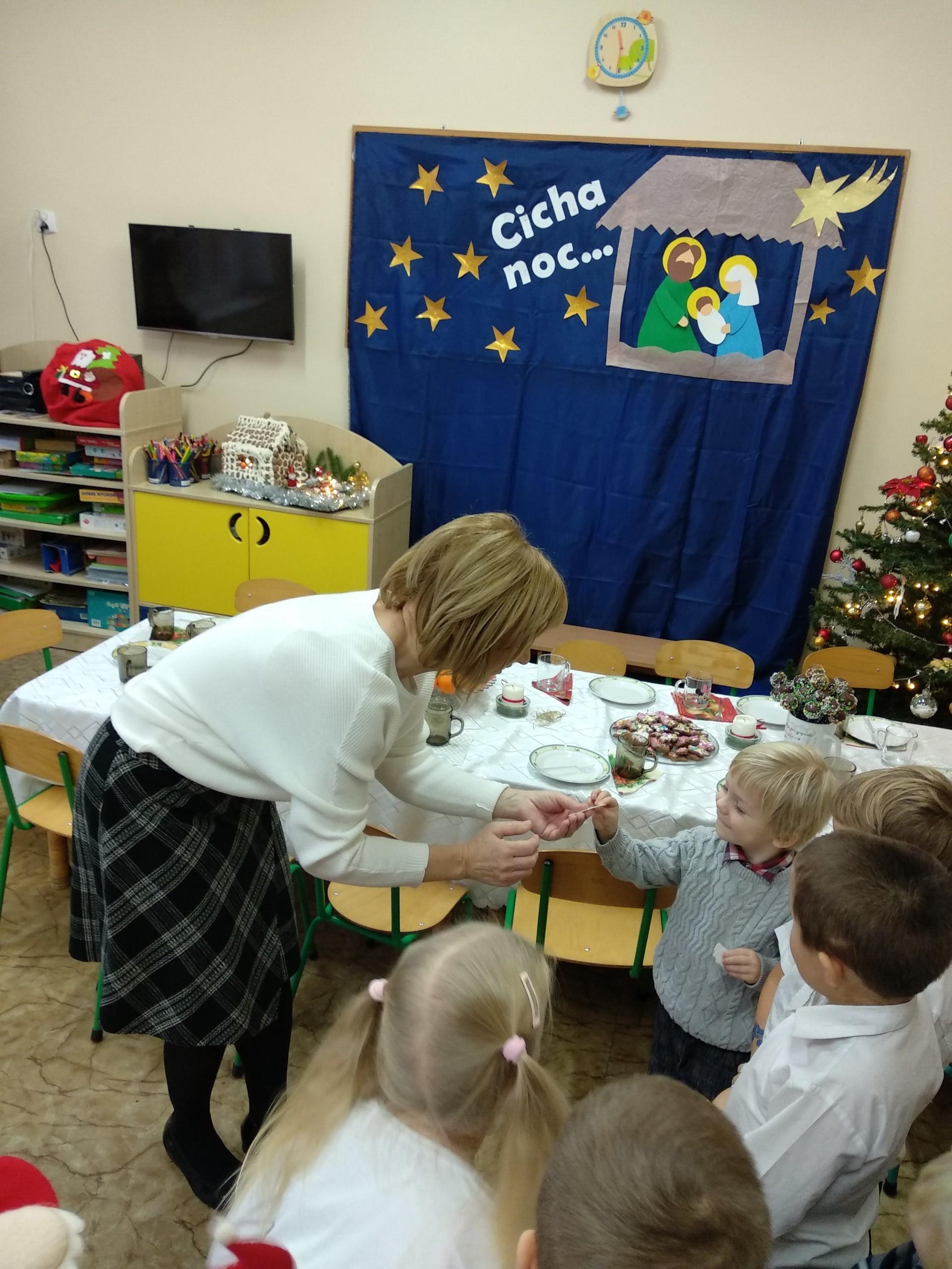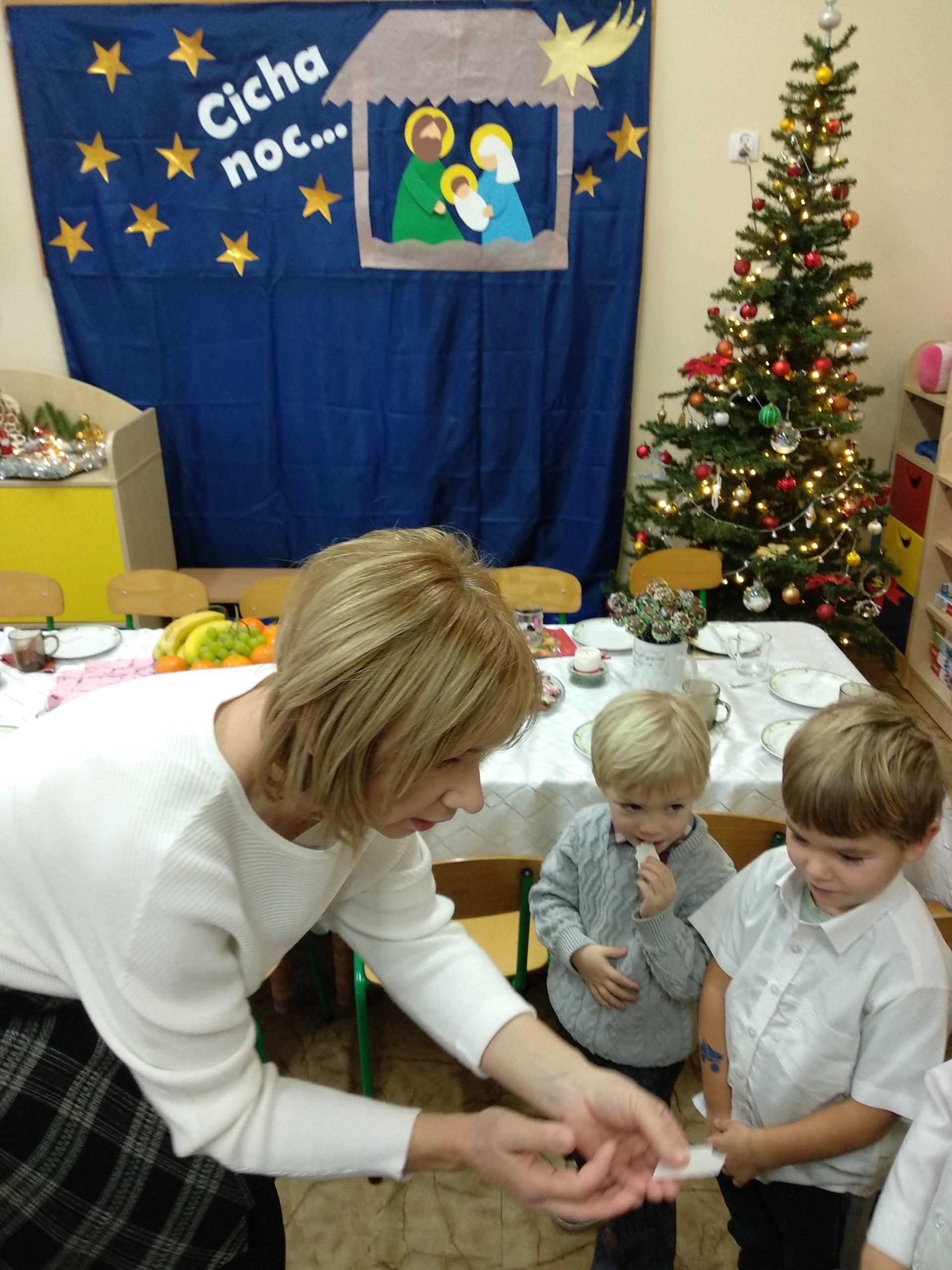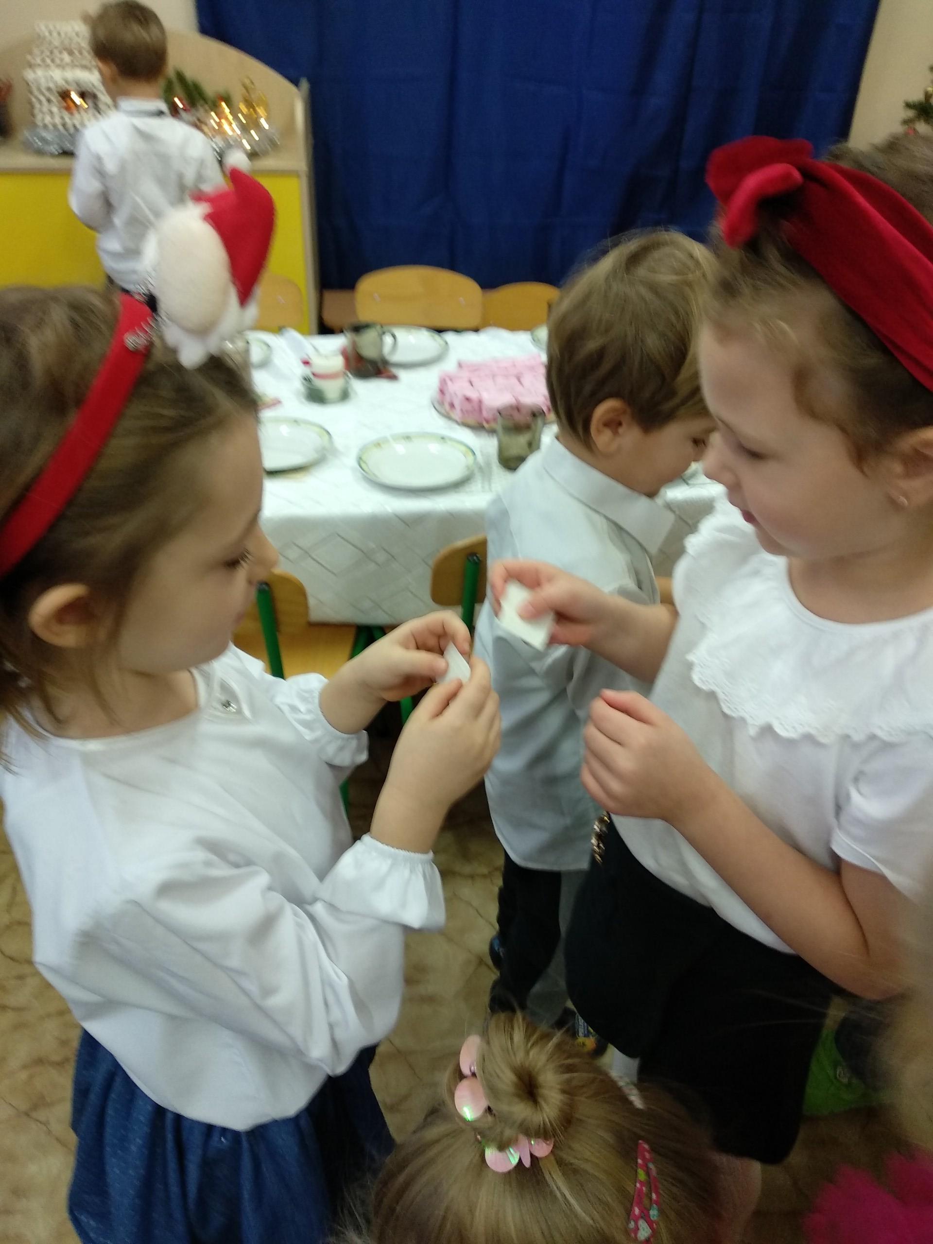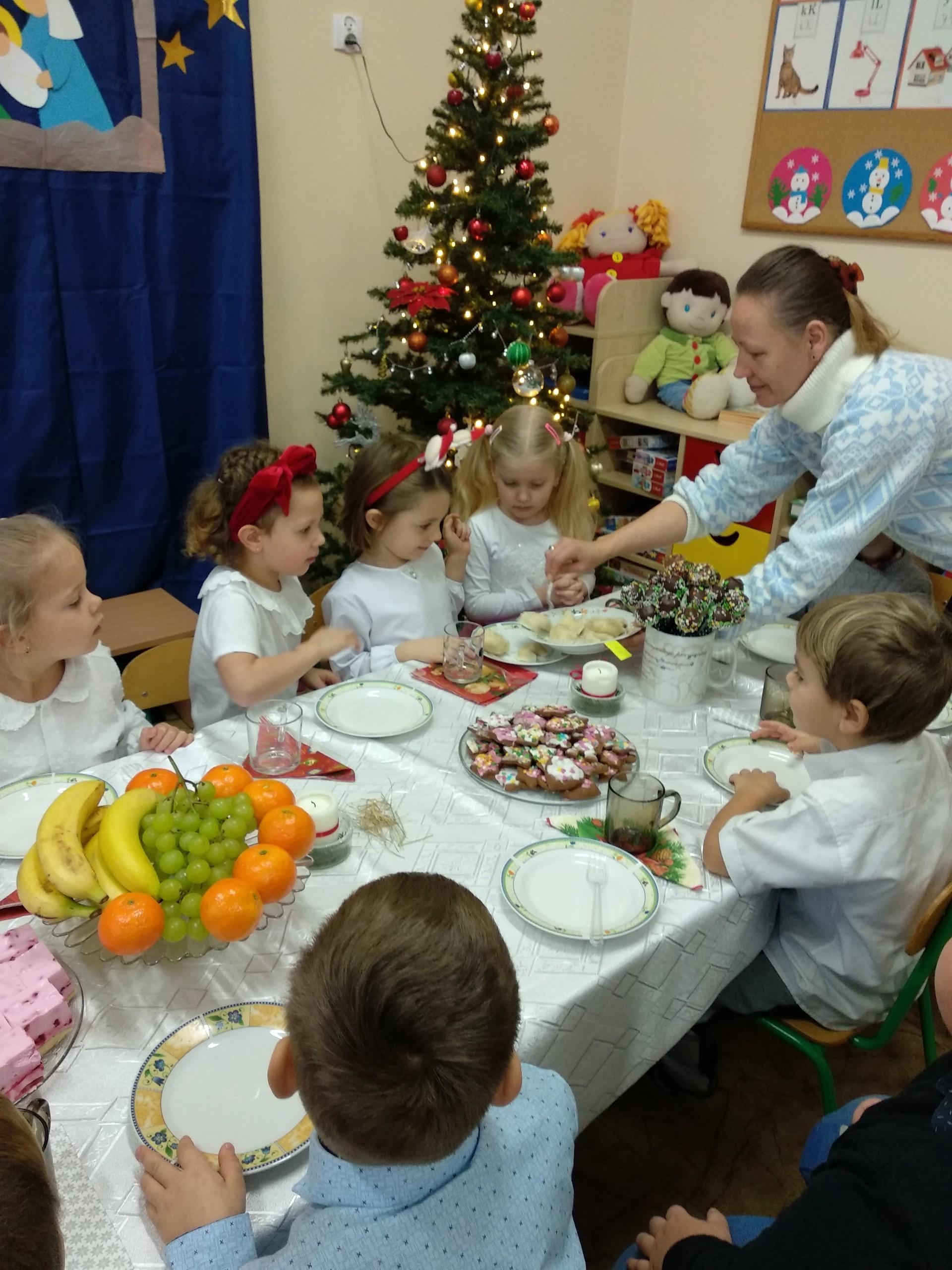 Przygotowania do wigilii z udziałem przedszkolaków. Mamie Kacperka dziękujemy za pyszne słodkości.