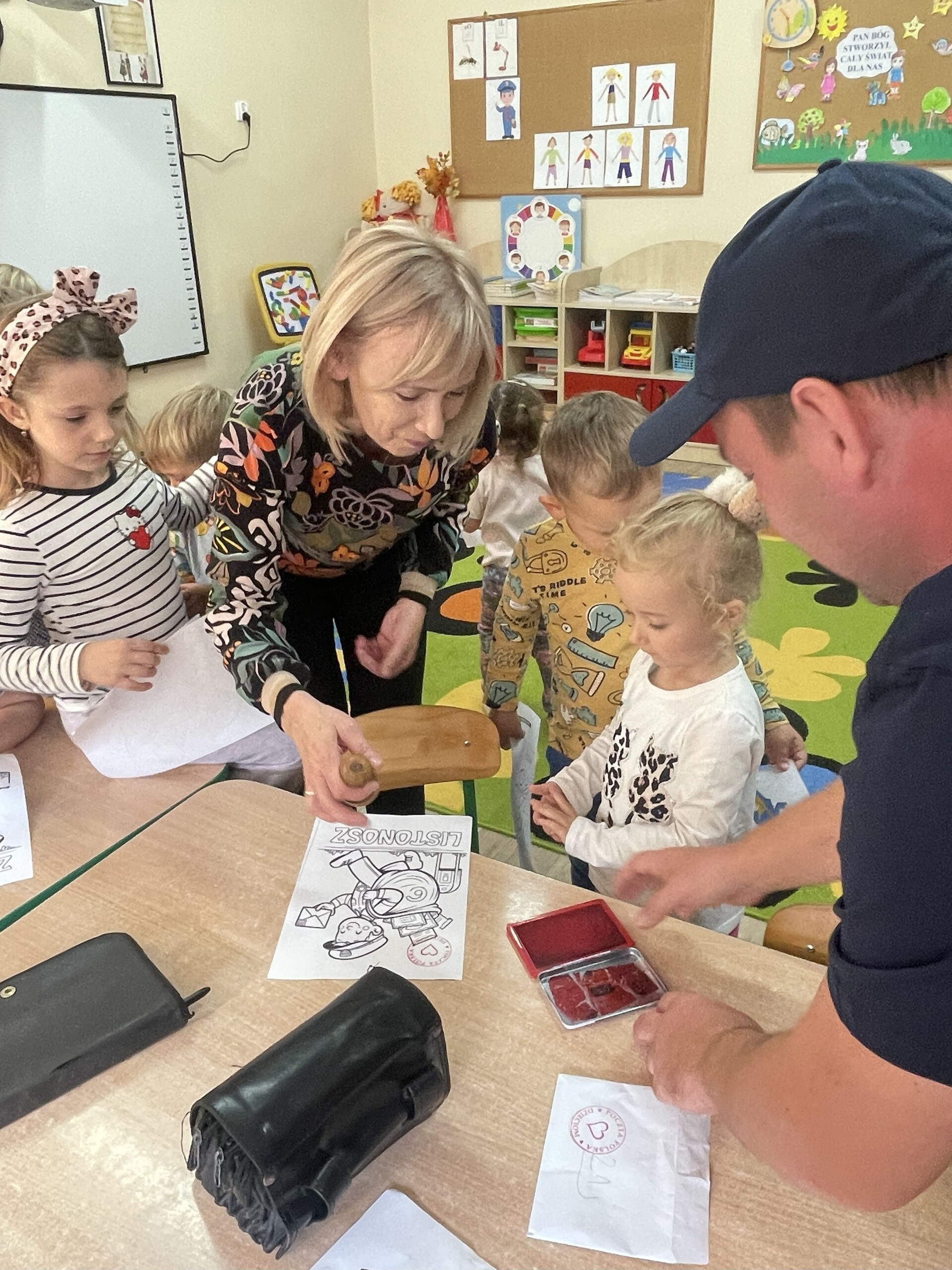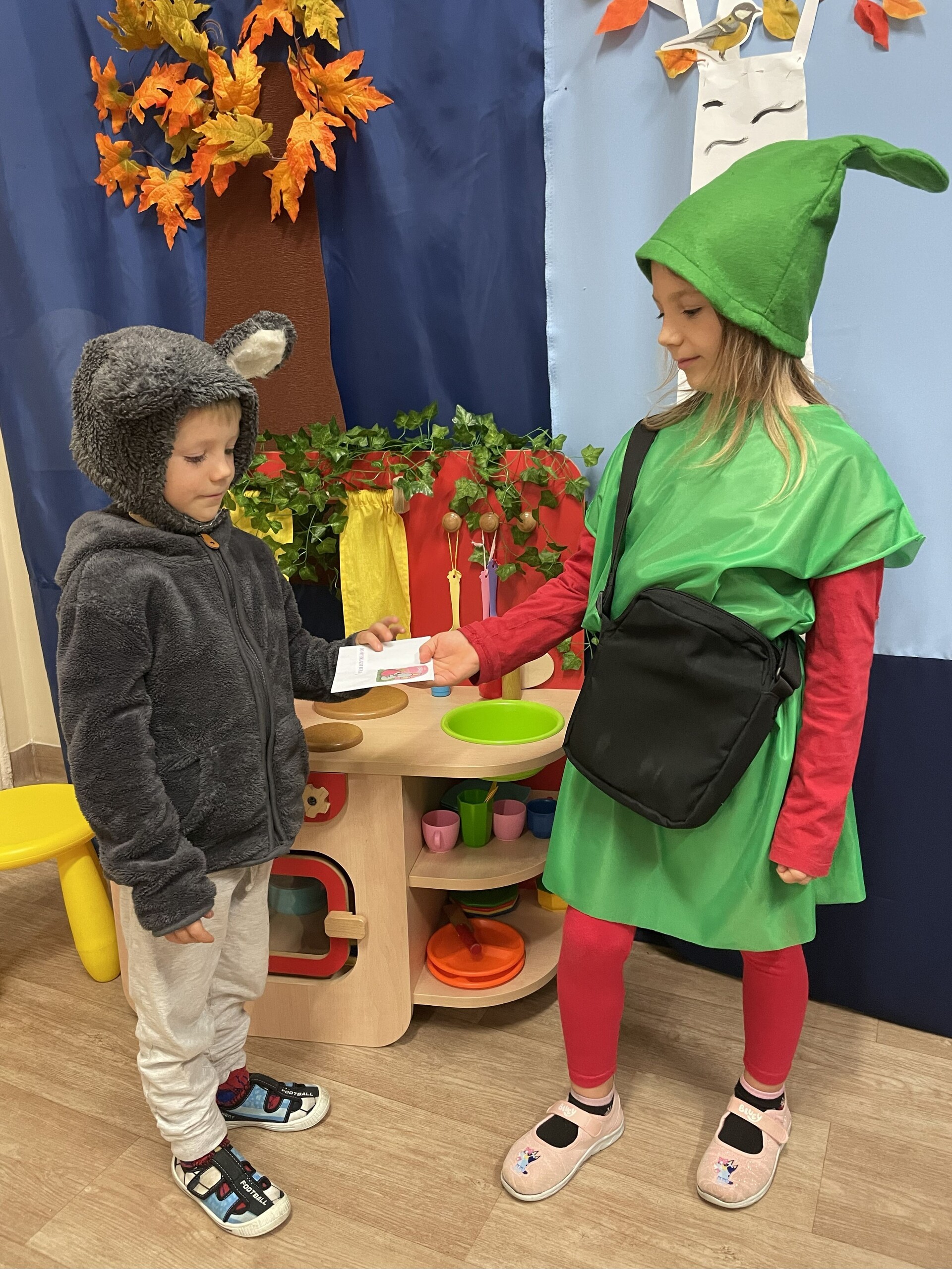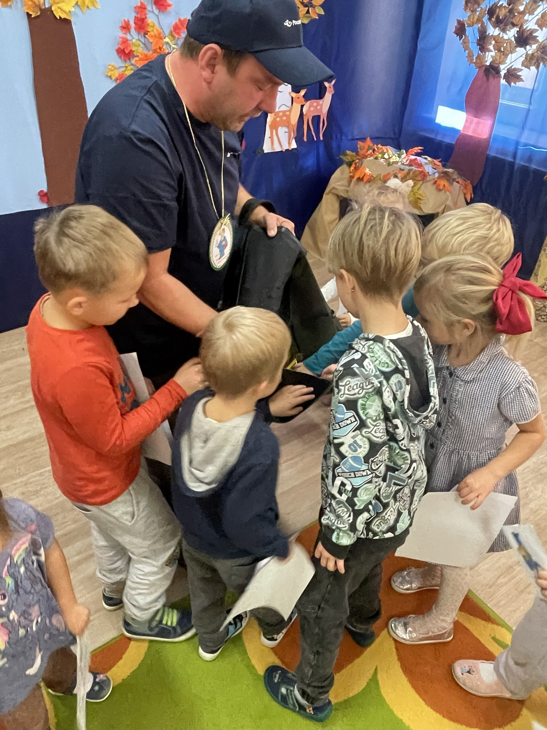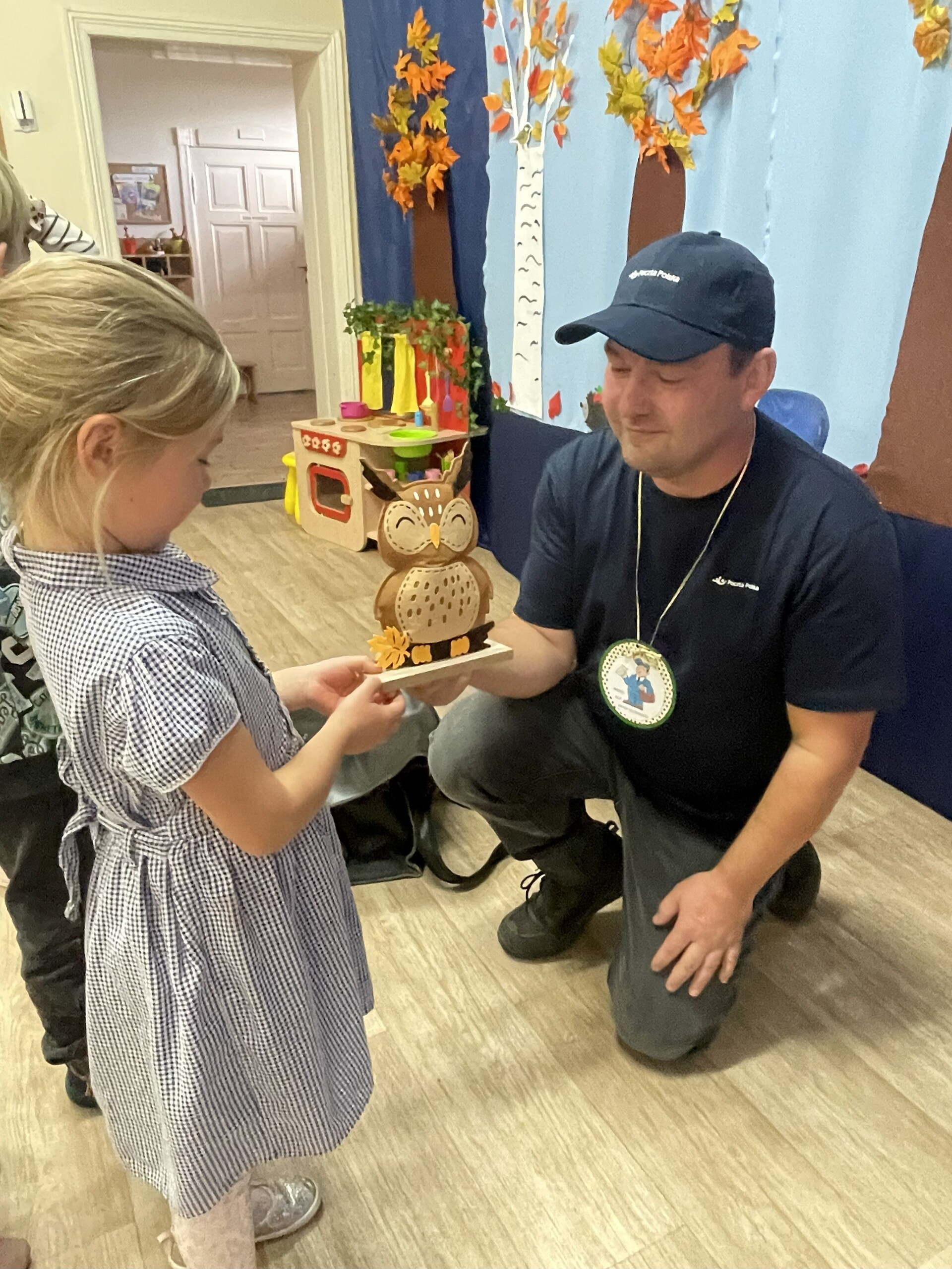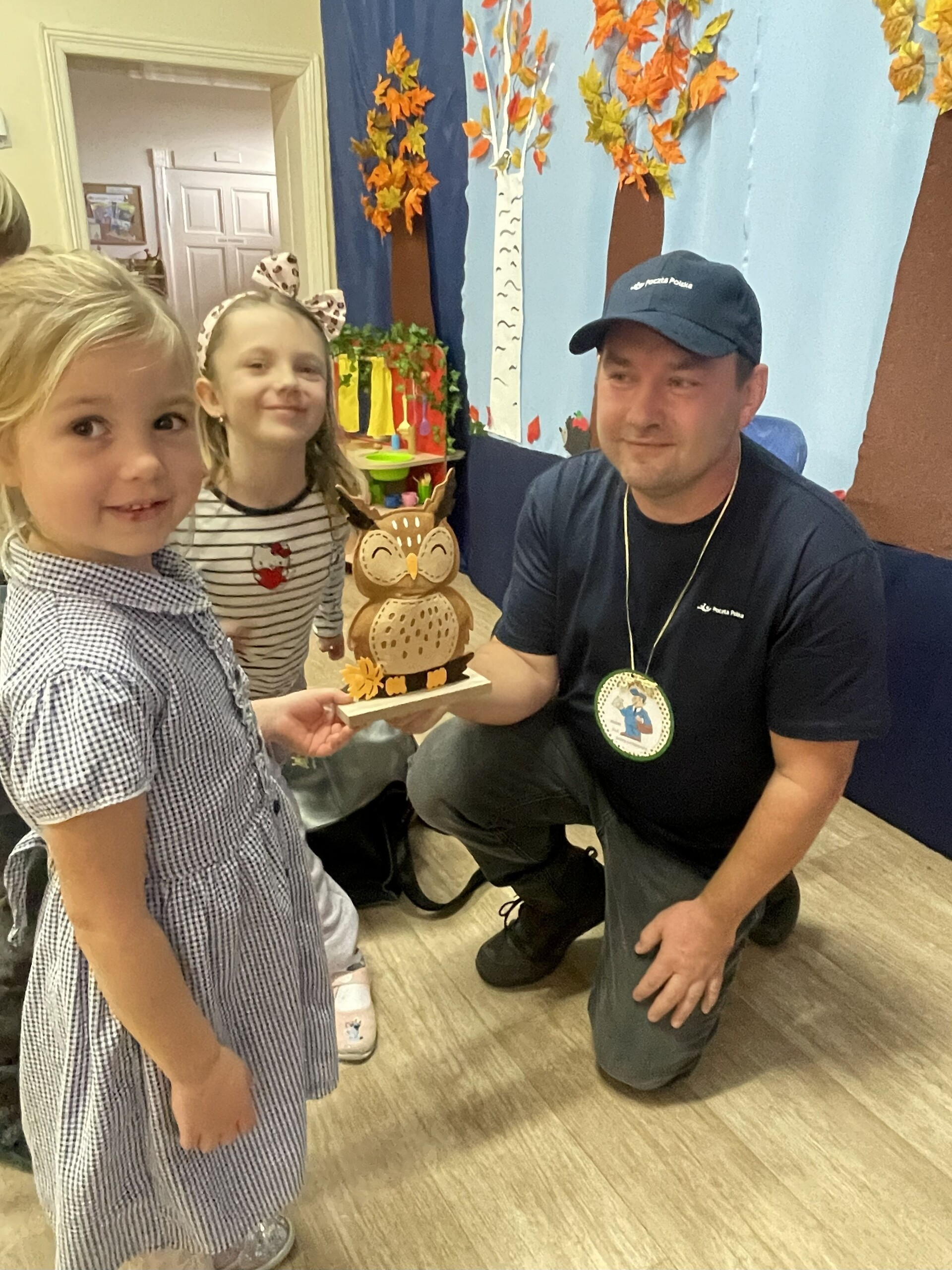 Pan Radek - nasz listonosz, był gościem przedszkolaków. Wszyscy, od dłuższego czasu, przygotowywaliśmy się do tego spotkania aby wypadło ono jak najlepiej i aby nasz gość był zadowolony. Tak też było, pan Radek nie spodziewał się takiej gościnności. Również pani dyrektor doceniła nasze starania. Dzieci w pięknych strojach i leśnej scenerii wystawiły teatrzyk ,,Leśny listonosz". Nasz gość również opowiedział o swojej pracy, pokazał akcesoria, których używa, umożliwił dzieciom postawienie stempla (każde chciało spróbować). Na koniec wspólna zabawa i poczęstunek (dziękuję p. Małgosi i p. Beacie). Pan listonosz również zaskoczył dzieci. Miał dla nich słodycze, kolorowanki, koperty i znaczki pocztowe. Wszyscy stwierdziliśmy, że zasługuje na ,,Medal dla super listonosza" oraz dodatkowym upominkiem była sowa, która miała przypominać gościowi teatrzyk i nasze spotkanie.