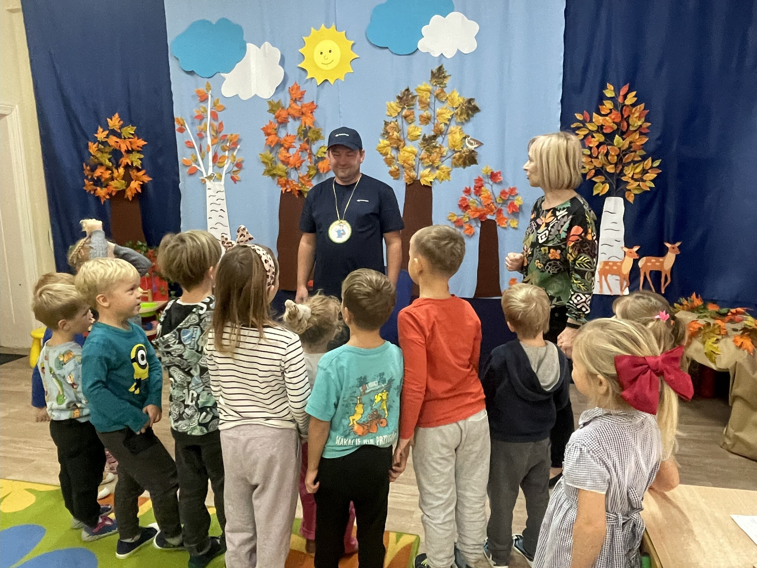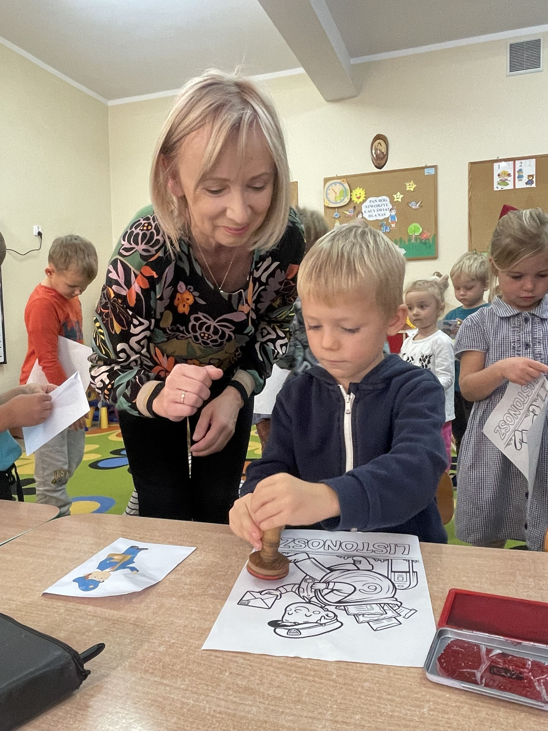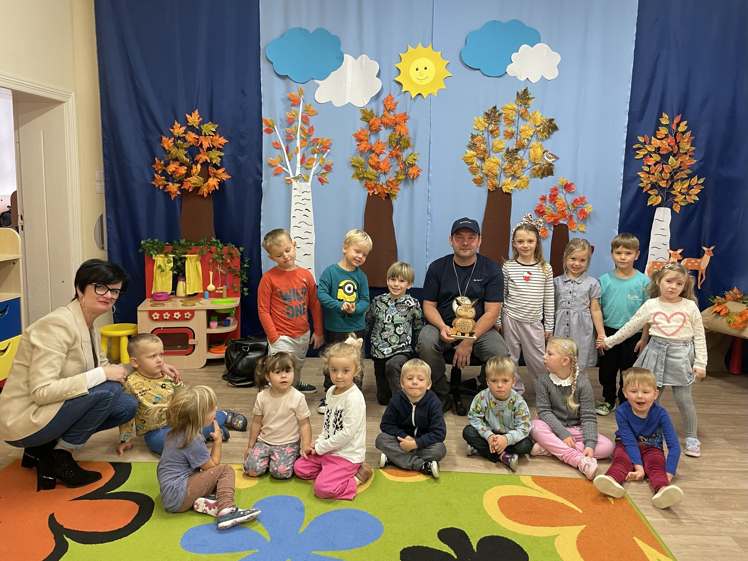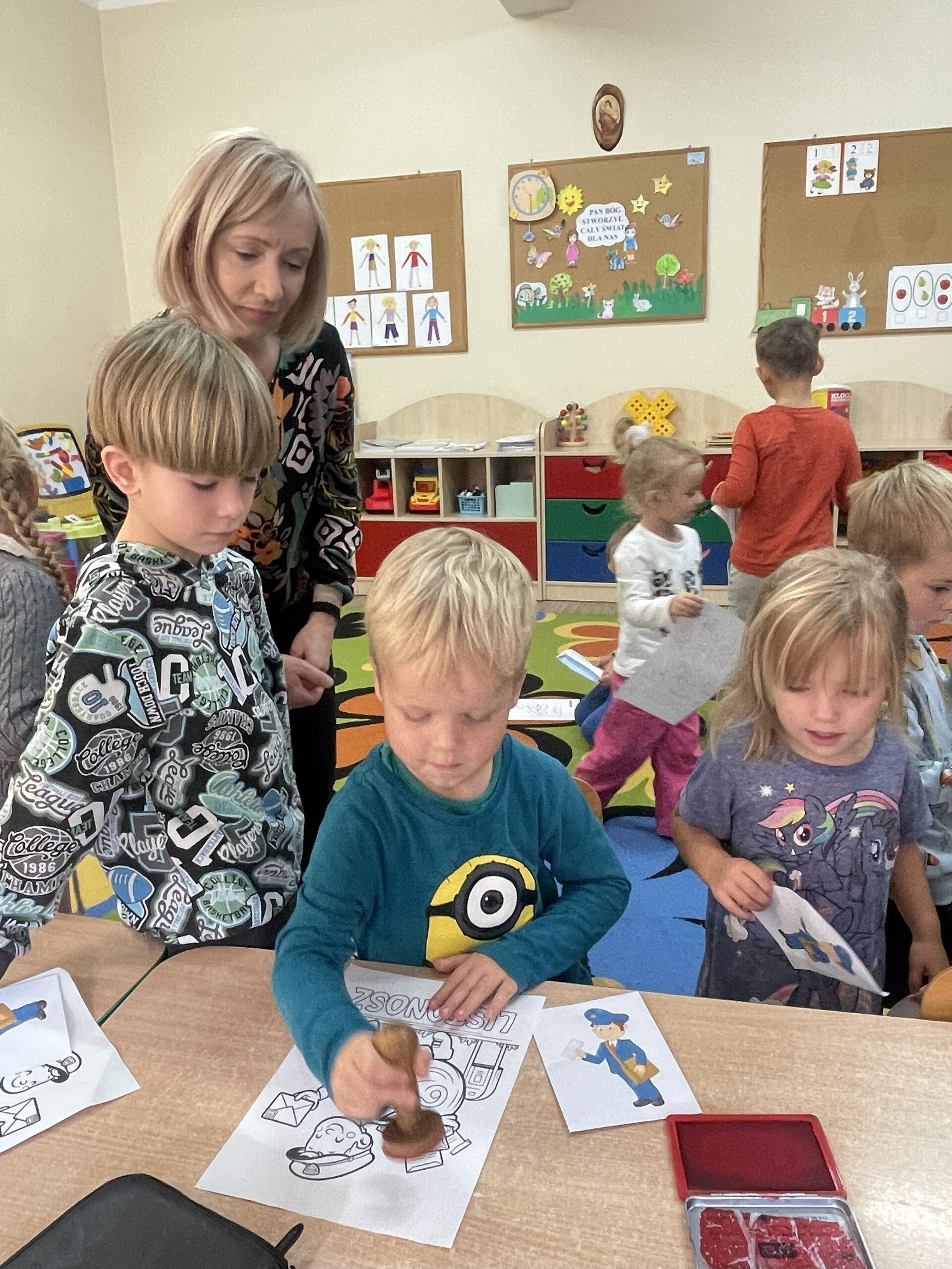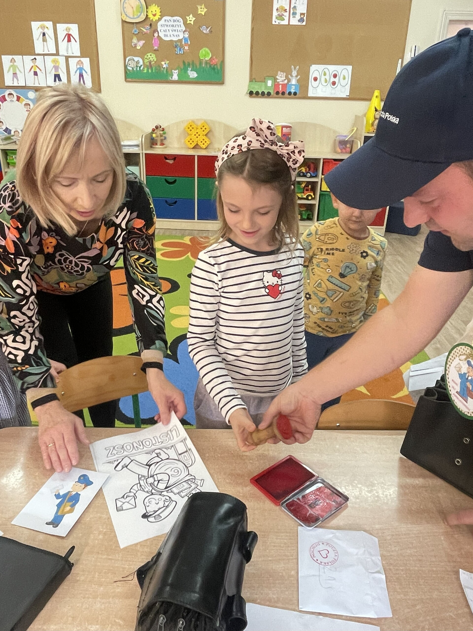Pan Radek - nasz listonosz, był gościem przedszkolaków. Wszyscy, od dłuższego czasu, przygotowywaliśmy się do tego spotkania aby wypadło ono jak najlepiej i aby nasz gość był zadowolony. Tak też było, pan Radek nie spodziewał się takiej gościnności. Również pani dyrektor doceniła nasze starania. Dzieci w pięknych strojach i leśnej scenerii wystawiły teatrzyk ,,Leśny listonosz". Nasz gość również opowiedział o swojej pracy, pokazał akcesoria, których używa, umożliwił dzieciom postawienie stempla (każde chciało spróbować). Na koniec wspólna zabawa i poczęstunek (dziękuję p. Małgosi i p. Beacie). Pan listonosz również zaskoczył dzieci. Miał dla nich słodycze, kolorowanki, koperty i znaczki pocztowe. Wszyscy stwierdziliśmy, że zasługuje na ,,Medal dla super listonosza" oraz dodatkowym upominkiem była sowa, która miała przypominać gościowi teatrzyk i nasze spotkanie.