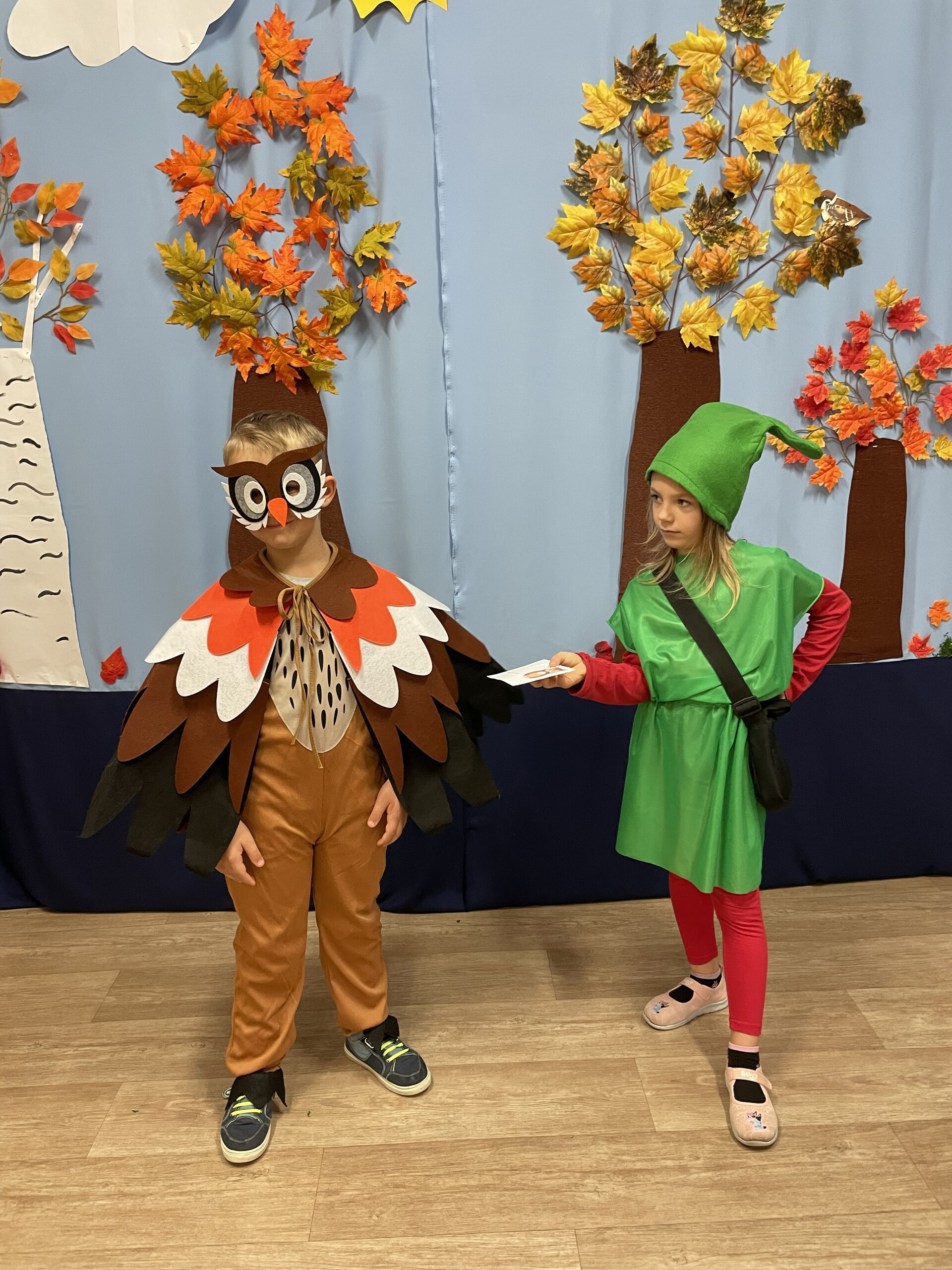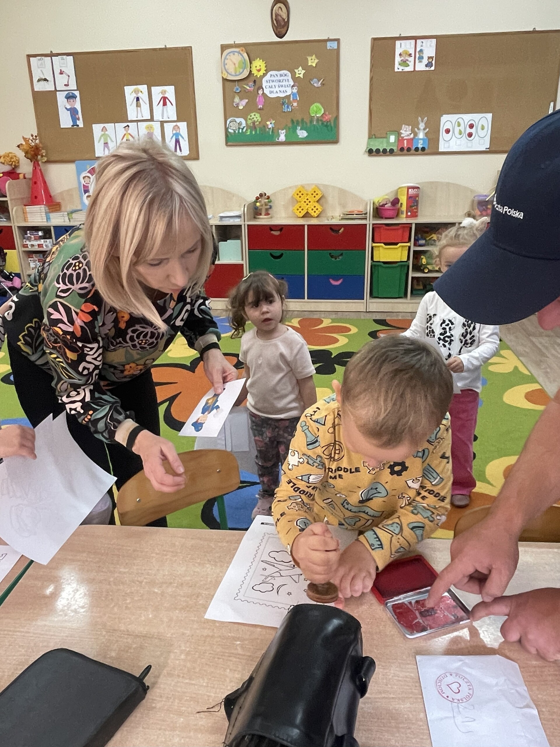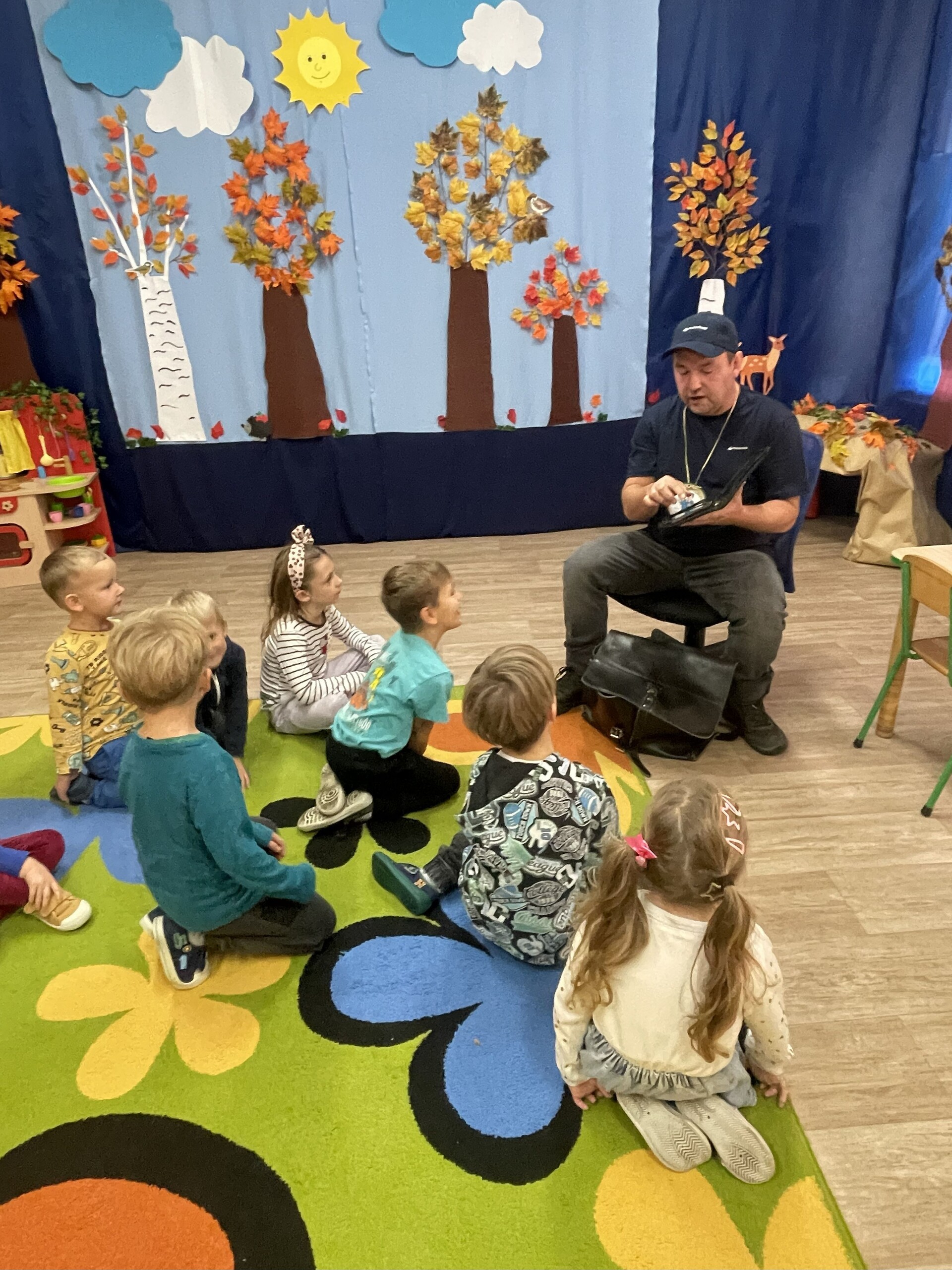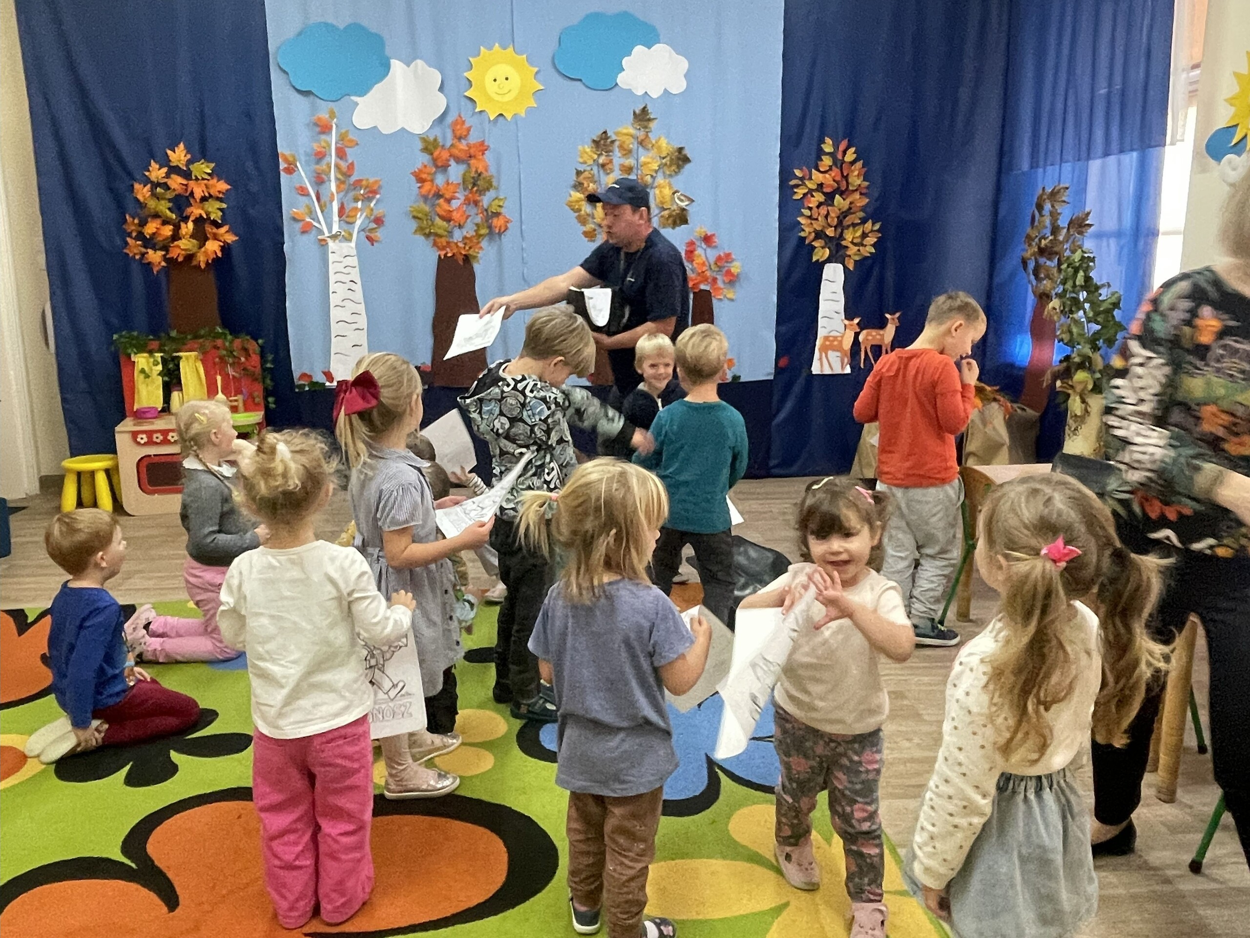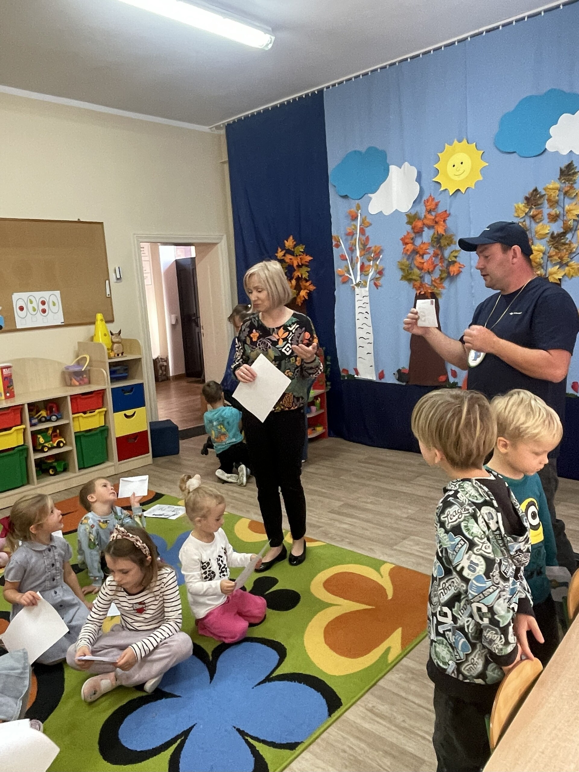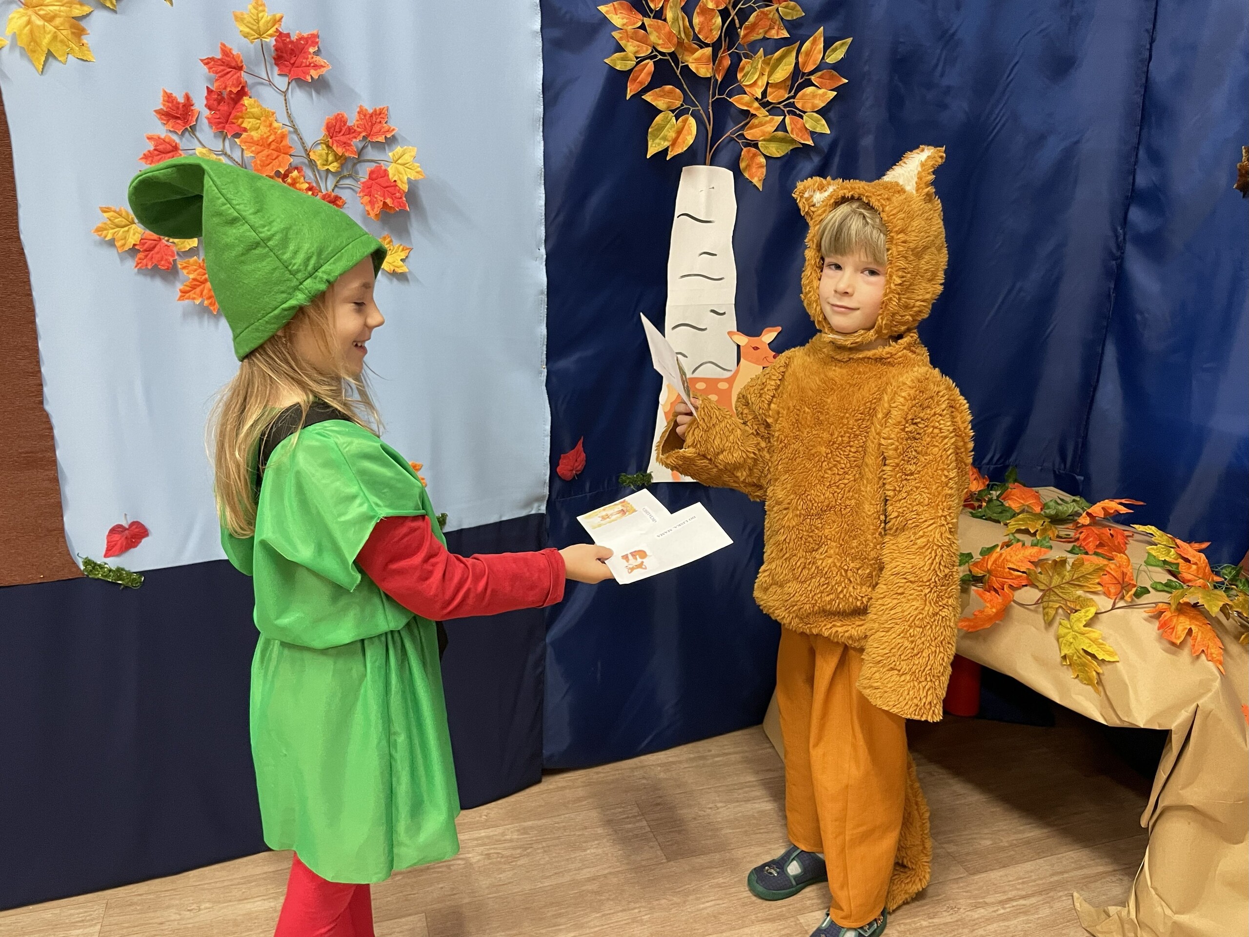 Pan Radek - nasz listonosz, był gościem przedszkolaków. Wszyscy, od dłuższego czasu, przygotowywaliśmy się do tego spotkania aby wypadło ono jak najlepiej i aby nasz gość był zadowolony. Tak też było, pan Radek nie spodziewał się takiej gościnności. Również pani dyrektor doceniła nasze starania. Dzieci w pięknych strojach i leśnej scenerii wystawiły teatrzyk ,,Leśny listonosz". Nasz gość również opowiedział o swojej pracy, pokazał akcesoria, których używa, umożliwił dzieciom postawienie stempla (każde chciało spróbować). Na koniec wspólna zabawa i poczęstunek (dziękuję p. Małgosi i p. Beacie). Pan listonosz również zaskoczył dzieci. Miał dla nich słodycze, kolorowanki, koperty i znaczki pocztowe. Wszyscy stwierdziliśmy, że zasługuje na ,,Medal dla super listonosza" oraz dodatkowym upominkiem była sowa, która miała przypominać gościowi teatrzyk i nasze spotkanie.