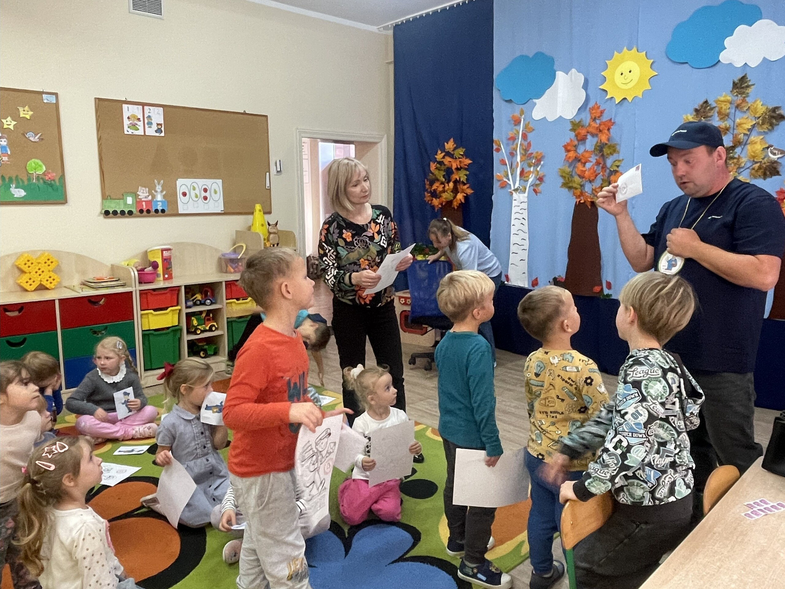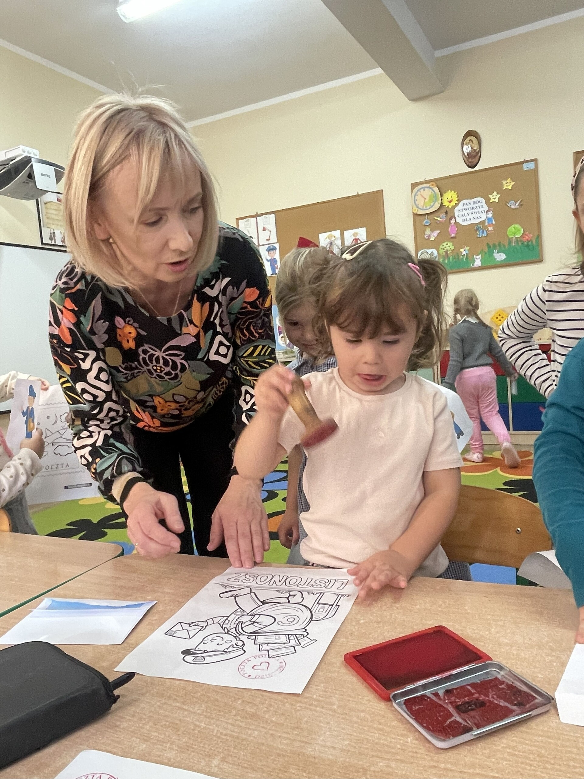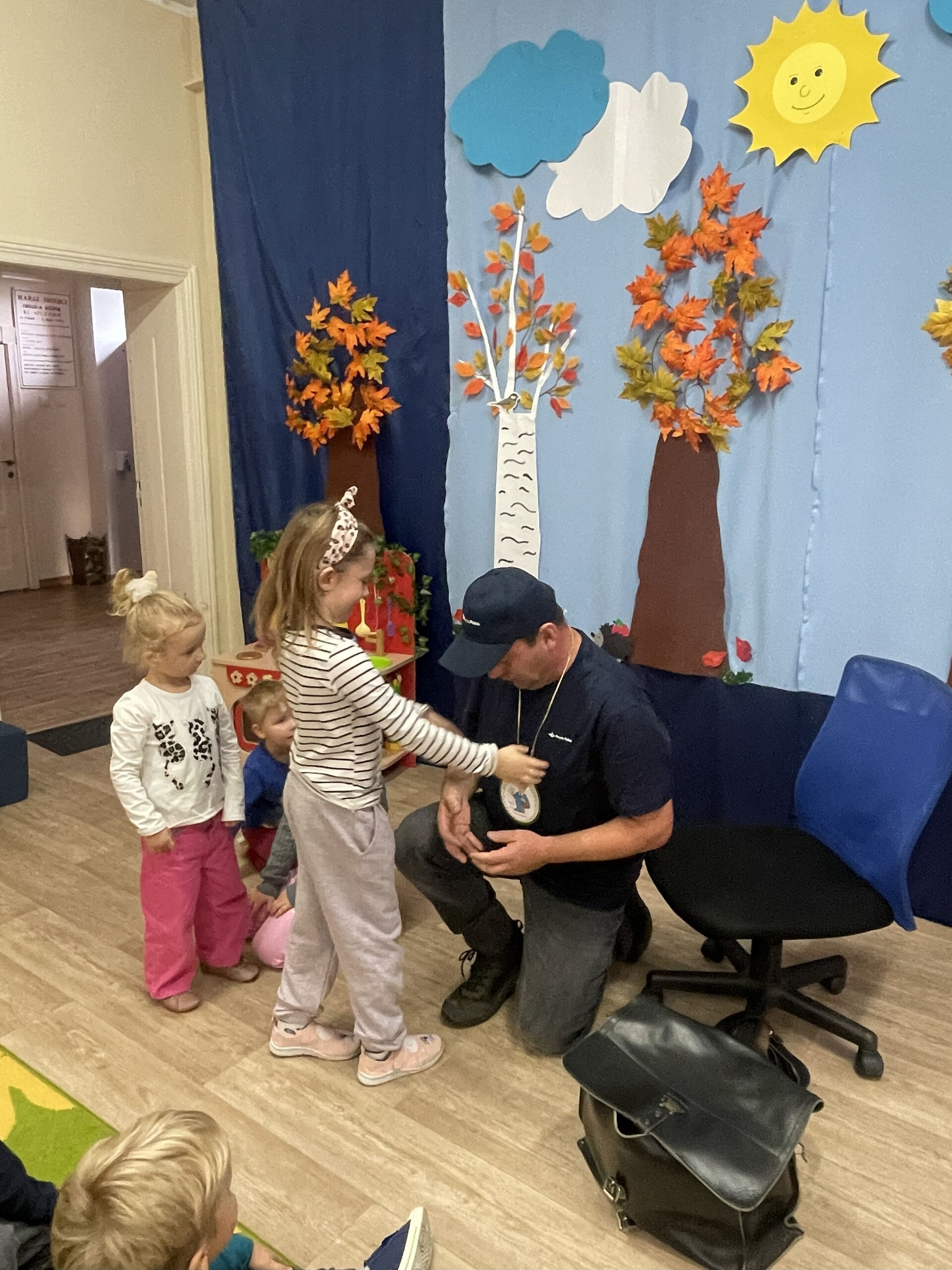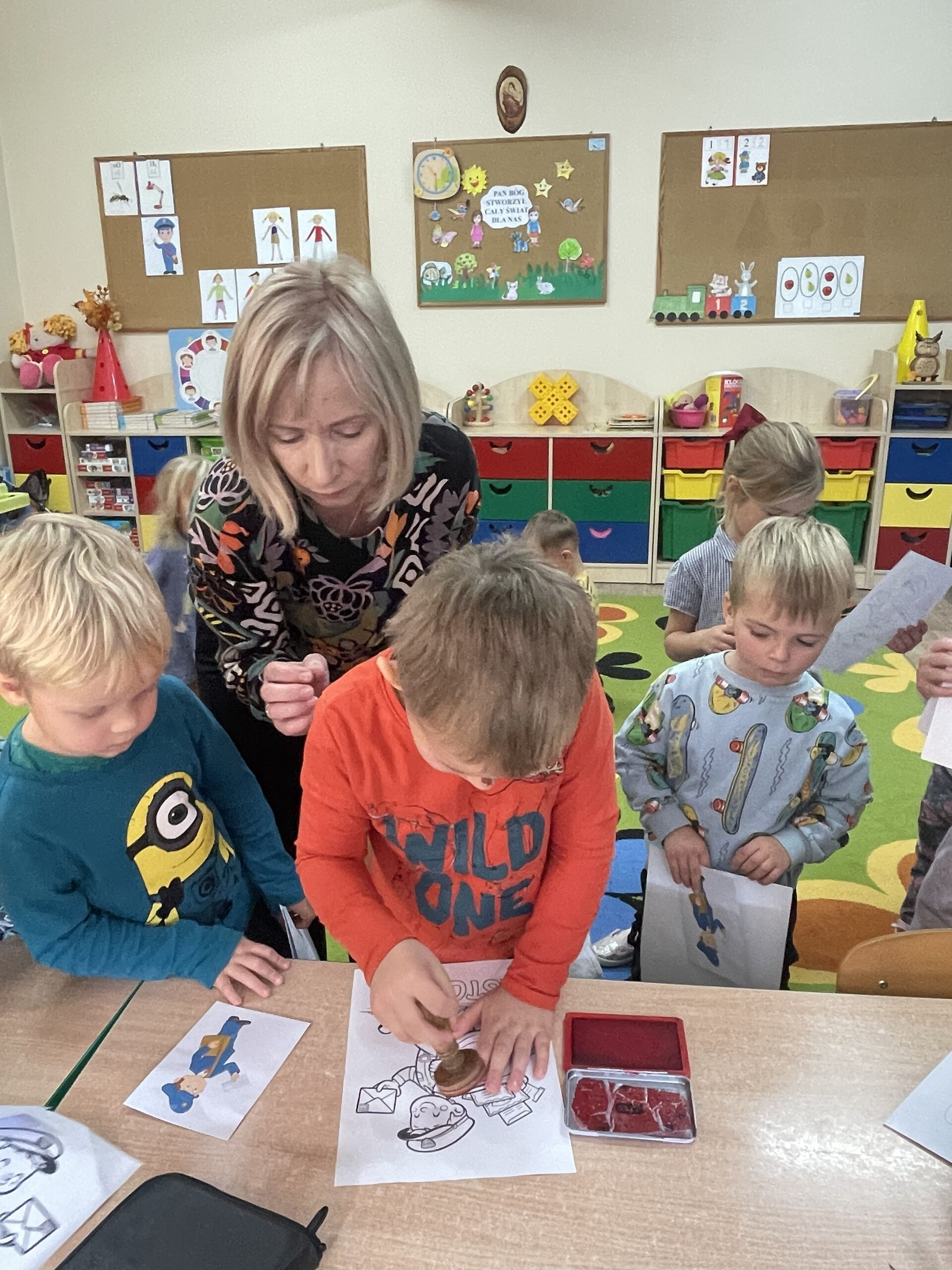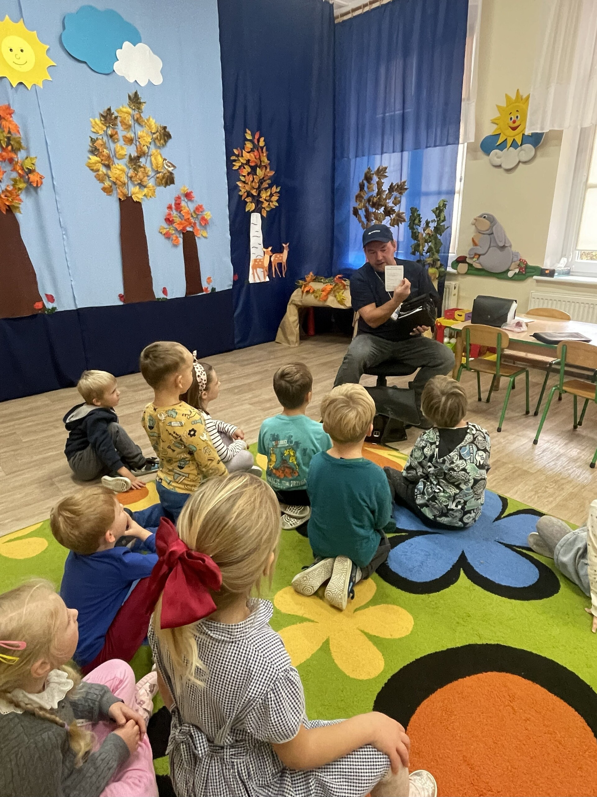 Pan Radek - nasz listonosz, był gościem przedszkolaków. Wszyscy, od dłuższego czasu, przygotowywaliśmy się do tego spotkania aby wypadło ono jak najlepiej i aby nasz gość był zadowolony. Tak też było, pan Radek nie spodziewał się takiej gościnności. Również pani dyrektor doceniła nasze starania. Dzieci w pięknych strojach i leśnej scenerii wystawiły teatrzyk ,,Leśny listonosz". Nasz gość również opowiedział o swojej pracy, pokazał akcesoria, których używa, umożliwił dzieciom postawienie stempla (każde chciało spróbować). Na koniec wspólna zabawa i poczęstunek (dziękuję p. Małgosi i p. Beacie). Pan listonosz również zaskoczył dzieci. Miał dla nich słodycze, kolorowanki, koperty i znaczki pocztowe. Wszyscy stwierdziliśmy, że zasługuje na ,,Medal dla super listonosza" oraz dodatkowym upominkiem była sowa, która miała przypominać gościowi teatrzyk i nasze spotkanie.
