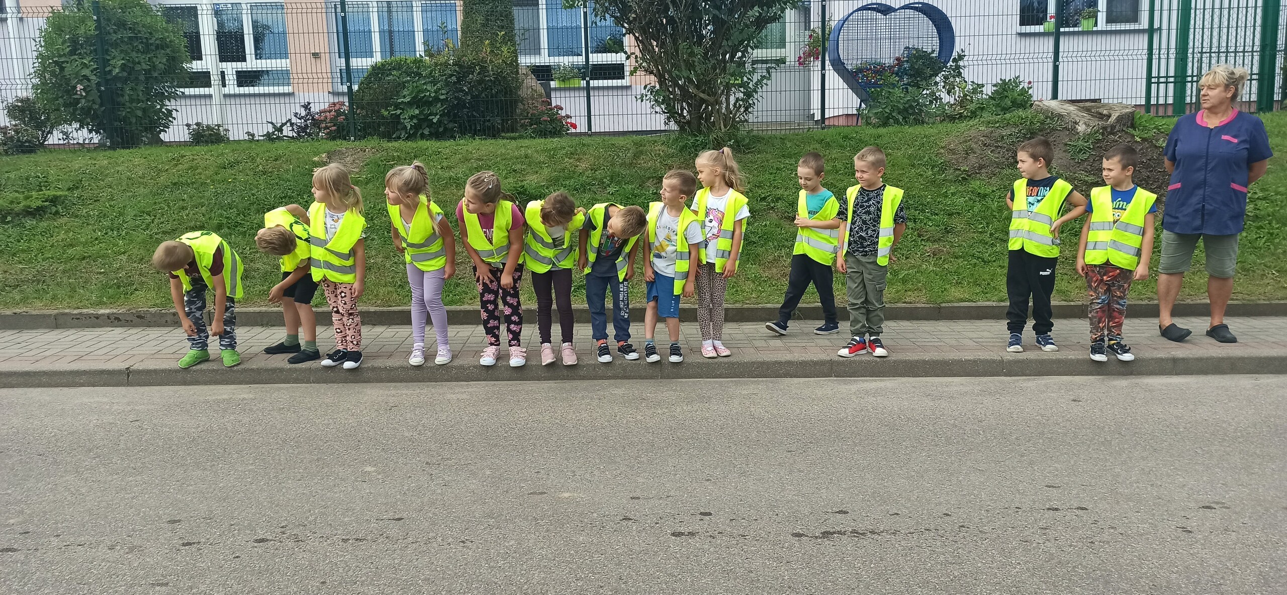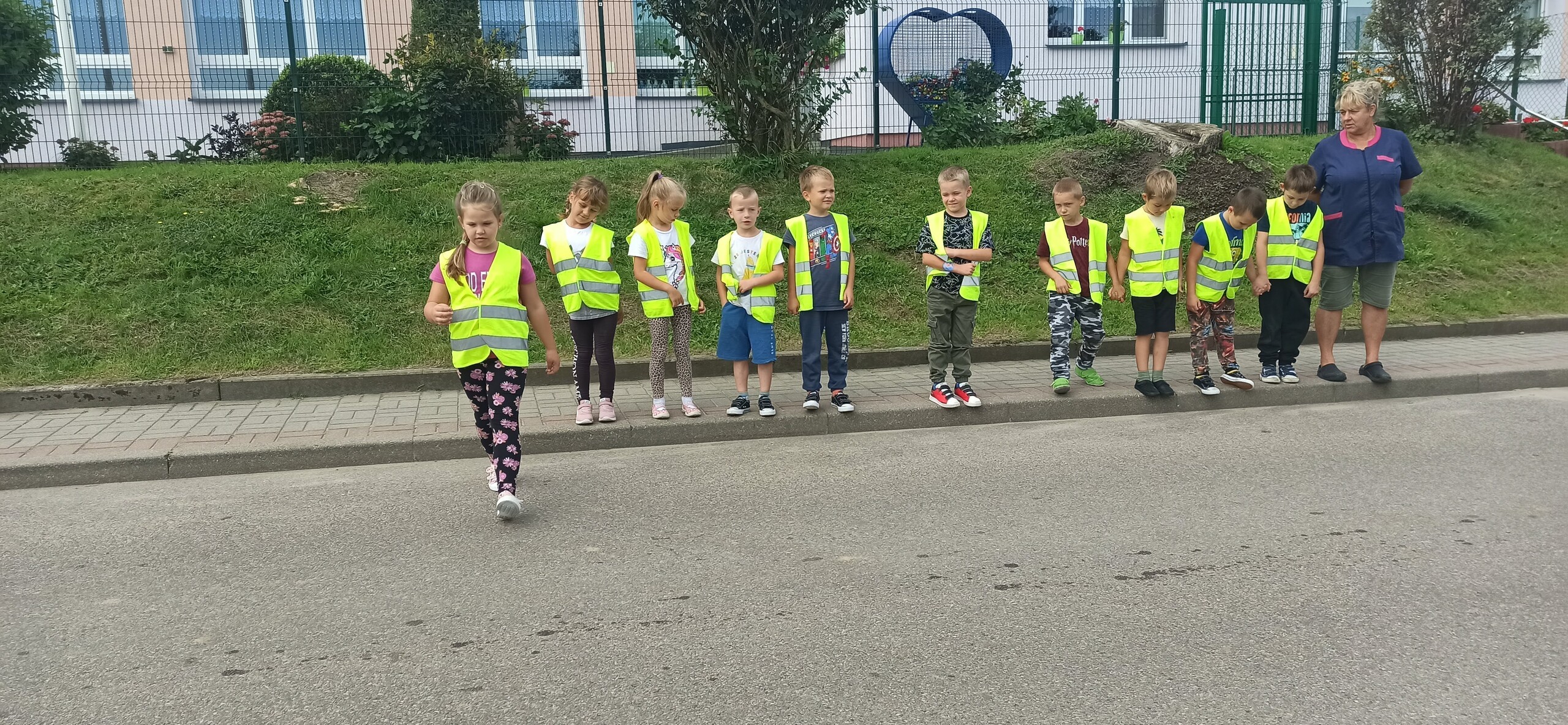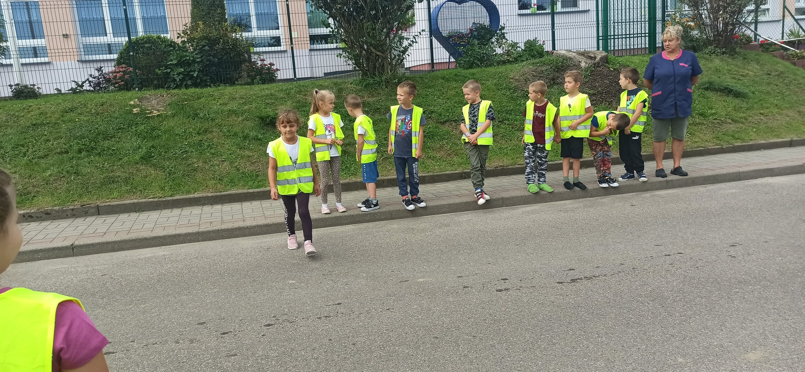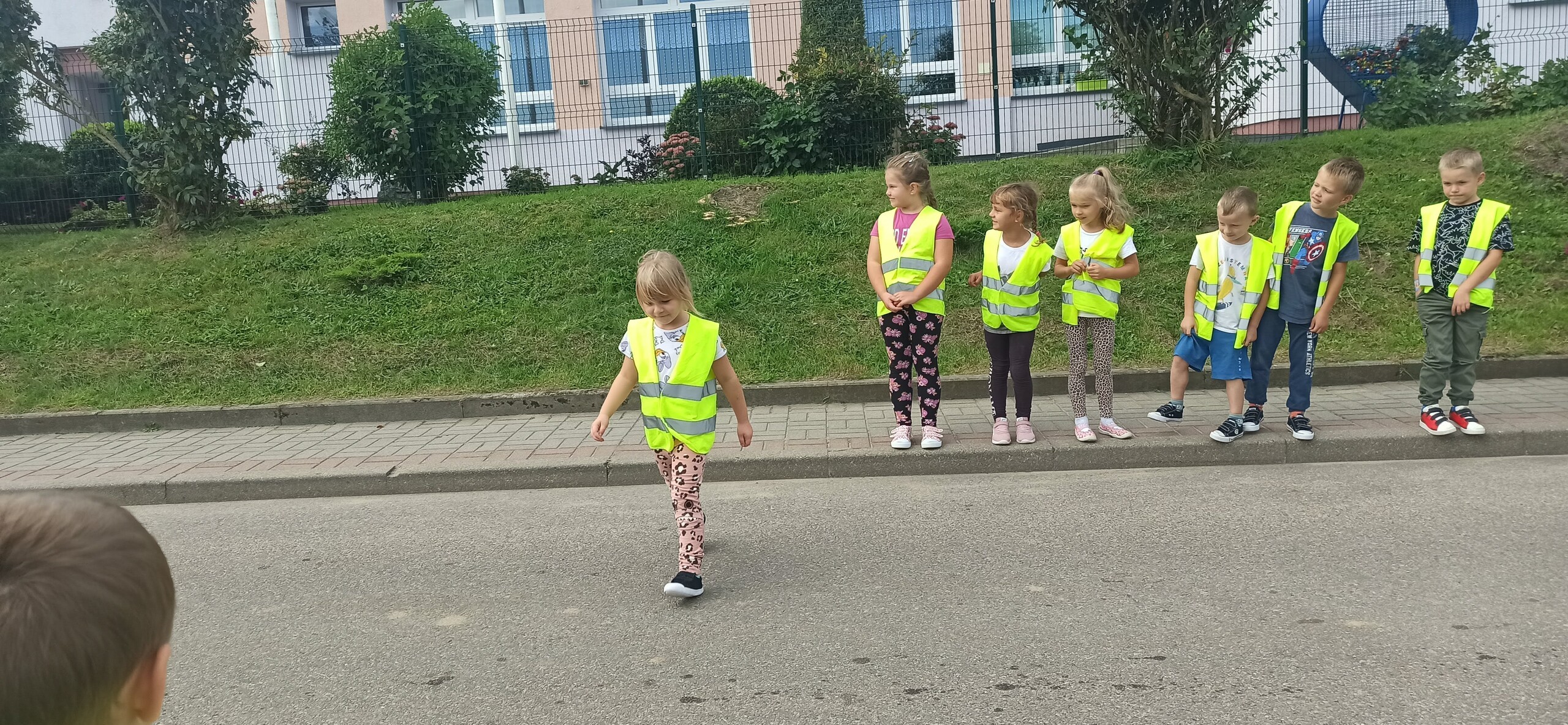 Uczymy się bezpiecznego poruszania się po drogach. Ćwiczyliśmy prawidłowe przechodzenie przez ulicę, o bezpieczeństwo pomagała nam zadbać pani Zosia Giełażyn.