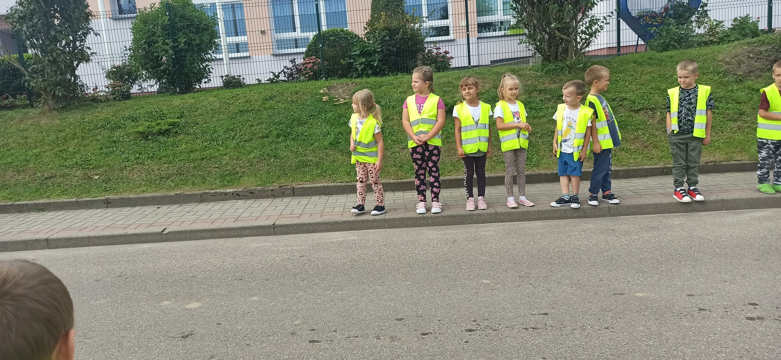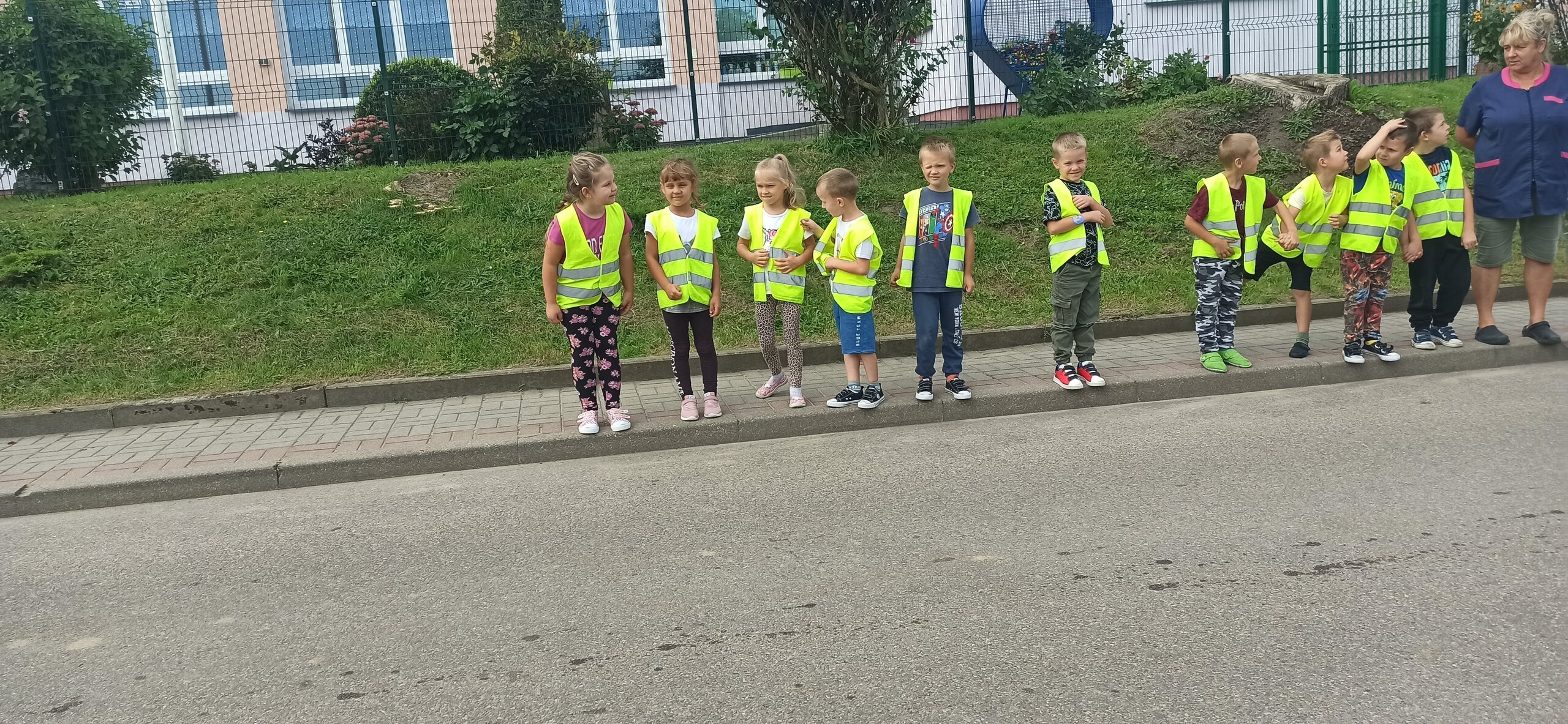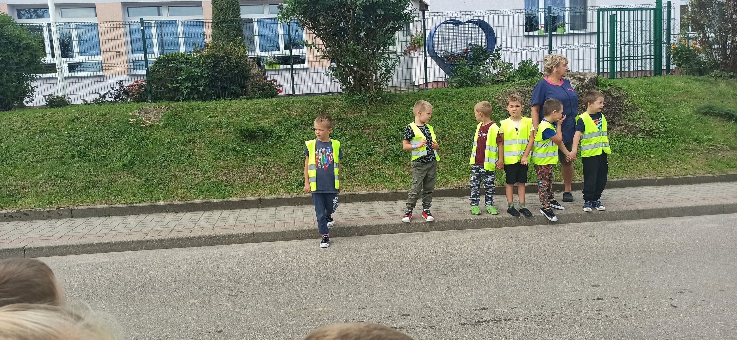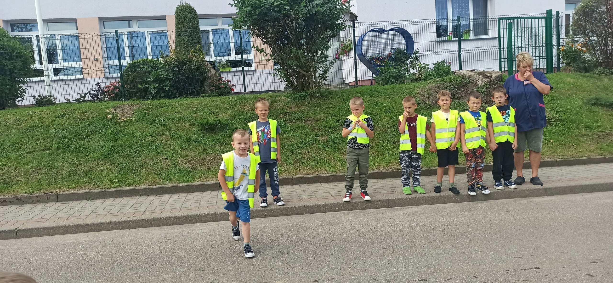 Uczymy się bezpiecznego poruszania się po drogach. Ćwiczyliśmy prawidłowe przechodzenie przez ulicę, o bezpieczeństwo pomagała nam zadbać pani Zosia Giełażyn.