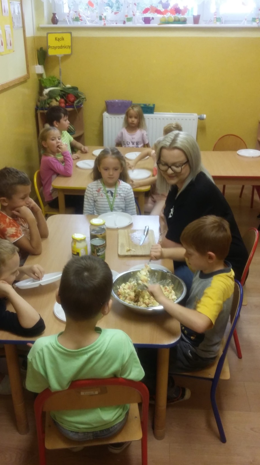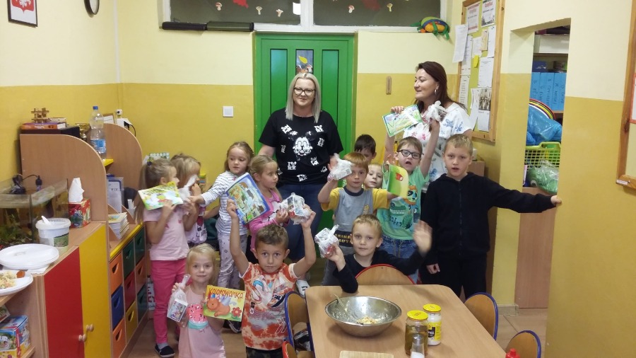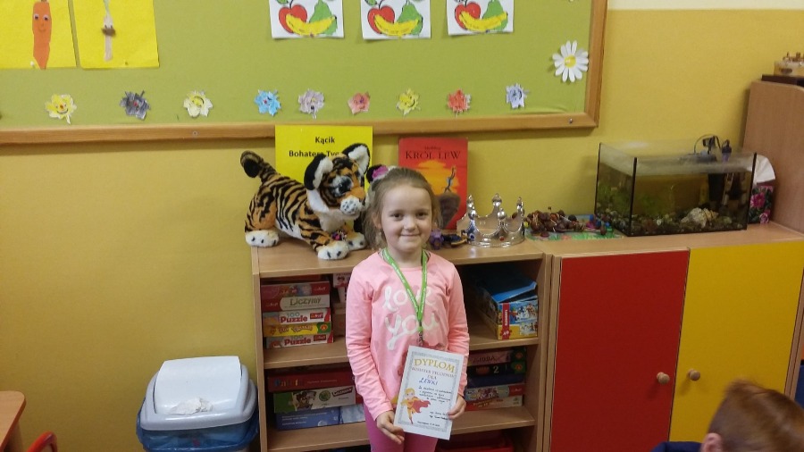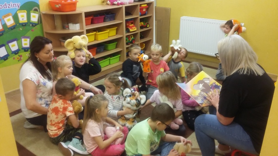 Lenka zaprosiła do naszej grupy swoją mamę. Jedną z atrakcji, którą przygotowaliśmy z tej okazji było wykonanie własnej sałatki z jesiennych warzyw. Pani Karolina opowiadała nam o tym, w jaki sposób spędza wolny czas z Lenką. Mówiła także o miłości do zwierząt, których nie brakuje u Lenki w domu. Gość specjalny przeczytał dzieciom bajkę pt. „Król Lew”, którą przyniosła Lenka. To był dla nas radosny, choć pracowity dzień. Było słodko, zdrowo i radośnie. Pani Karolina przygotowała dla dzieci wiele prezentów, m.in. puzzle, ciepłe lody, babeczki i inne smakołyki. Gościowi specjalnemu jeszcze raz serdecznie dziękujemy za przybycie.