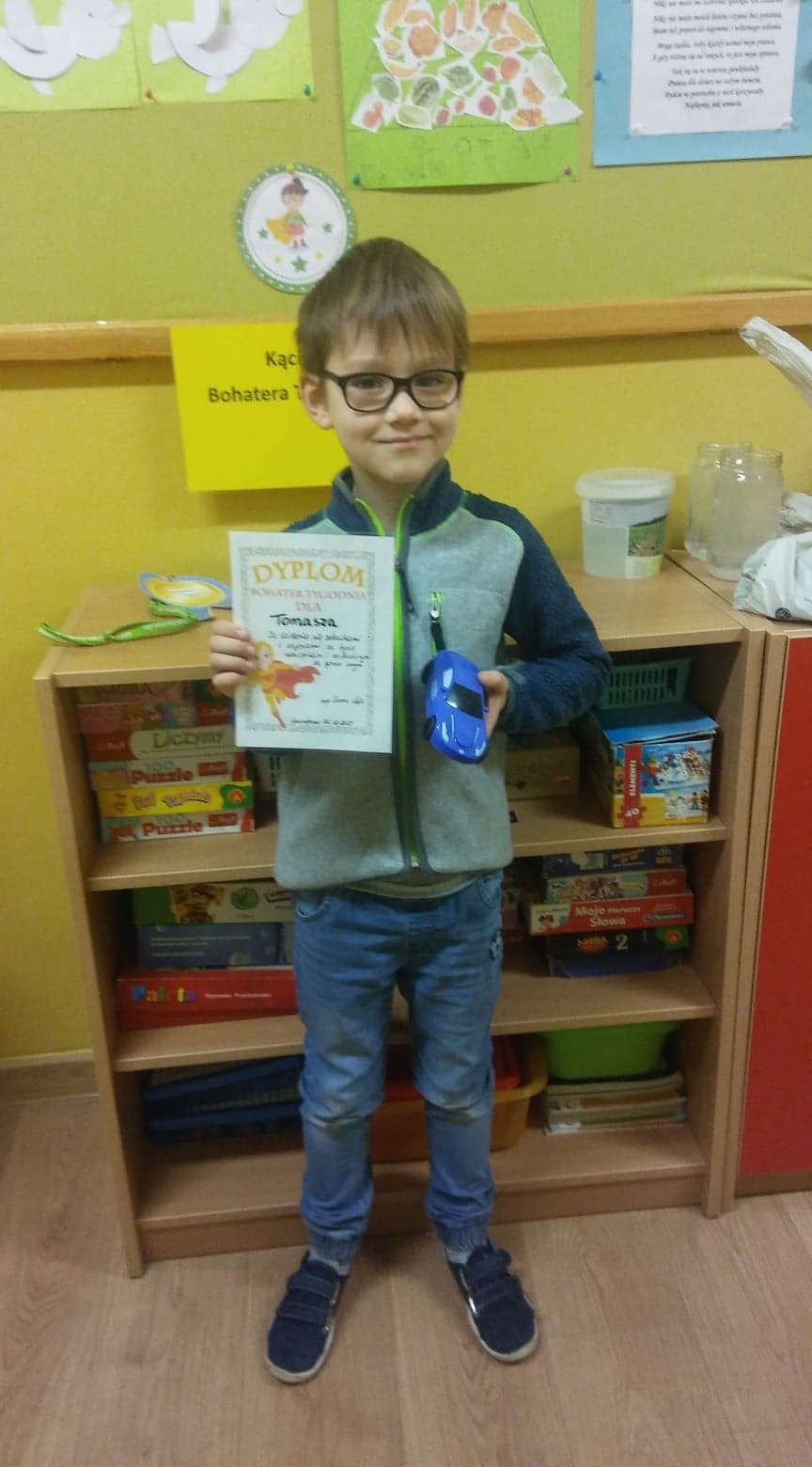 Tradycyjnie gościliśmy u siebie osoby bliskie bohaterowi. Tomasz zaprosił swoją mamę i babcię. Dzieci jak zwykle miały wiele pytań dotyczących tego, co nasz bohater lubi jeść, jak spędza wolny czas, czym lubi się bawić. Na wszystkie pytania goście udzielali wyczerpujących odpowiedzi. Po długim wywiadzie oraz wspólnym zdjęciu zajęliśmy się malowaniem i ozdabianiem choinek z szyszek. Dzieciom bardzo podobały się te zajęcia. Nie obyło się bez upominków, za które jeszcze raz dziękujemy.