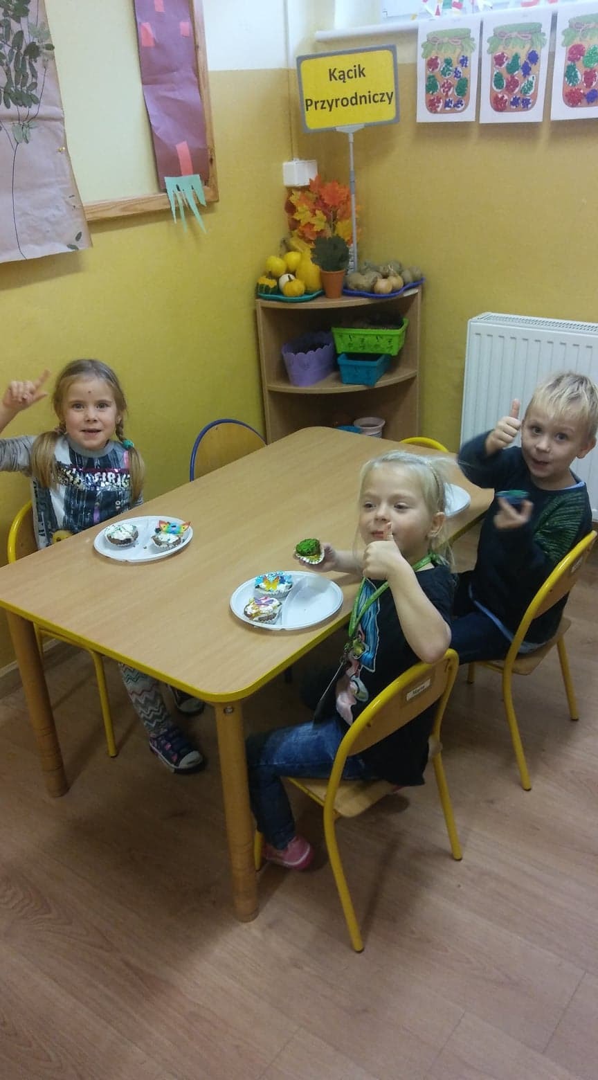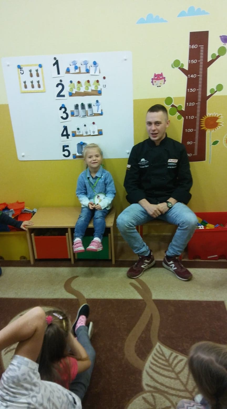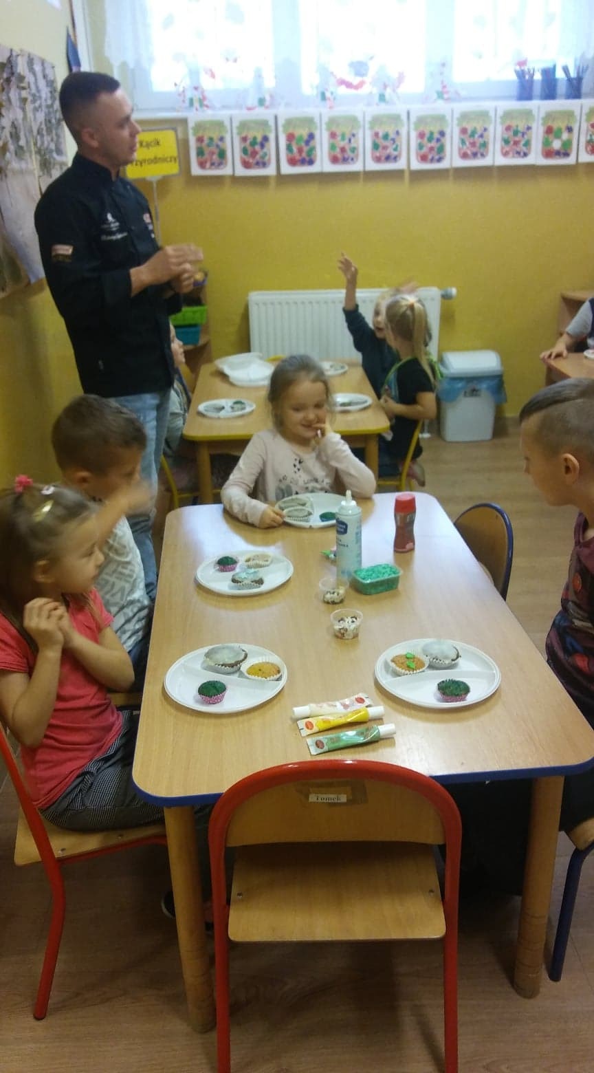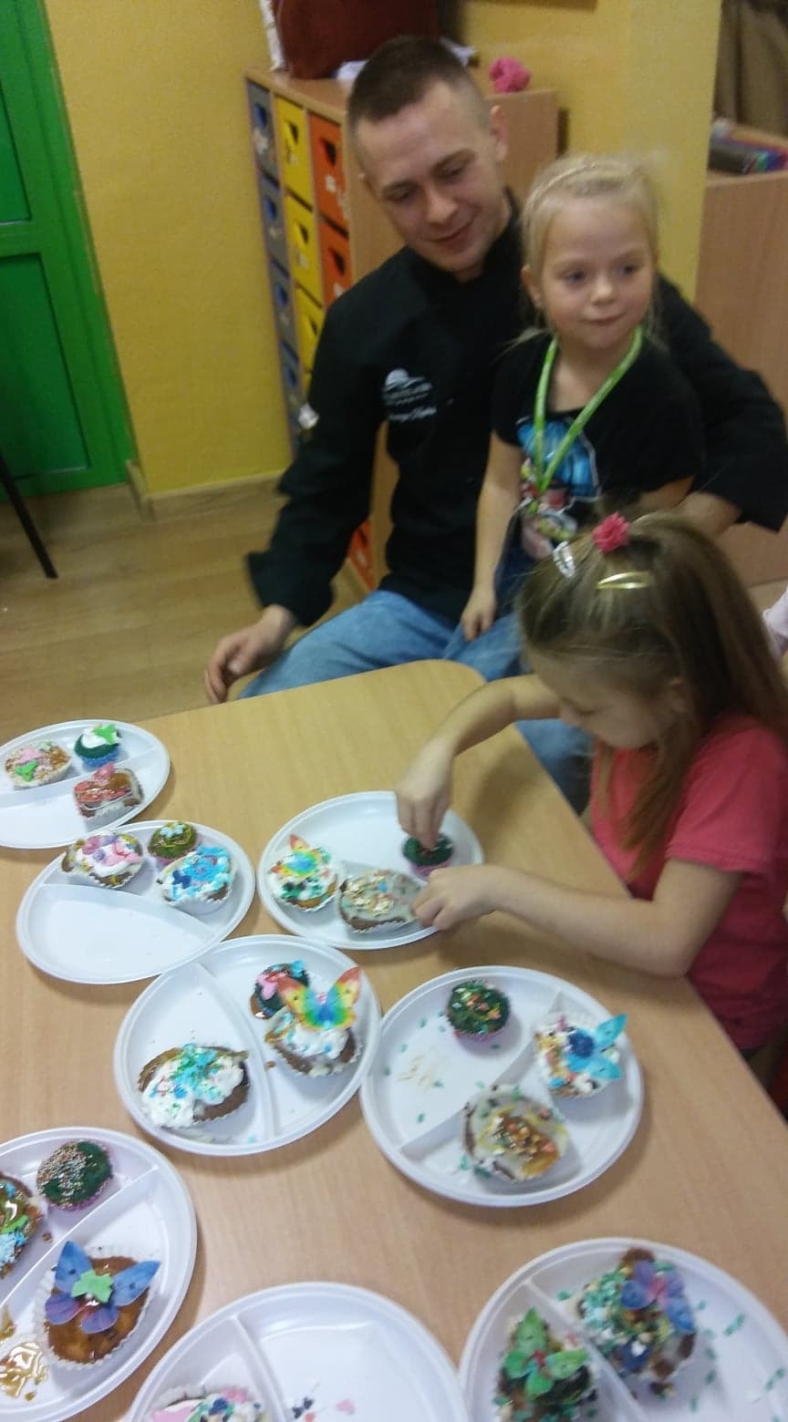 Marta zaprosiła do nas wyjątkowego gościa, ubranego w charakterystyczny uniform. Był to jej wujek. Pan Marcin nie tylko opowaiadał o Marcie. Dzieci dowiedziały się od gościa, jaki zawód wykonuje. Jest kucharzem w Hotelu "Łeba". Zapoznał dzieci z tym zawodem i być może zaraził je pasją do gotowania. Zaprosił też na specjalne warsztaty dla dzieci organizowane podczas przyszłorocznych ferii zimowych. Wszystkie dzieci dekorowały dziś babeczki, które upiekł nasz gość. Radość była ogromna, przede wszystkim w trakcie konsumpcji