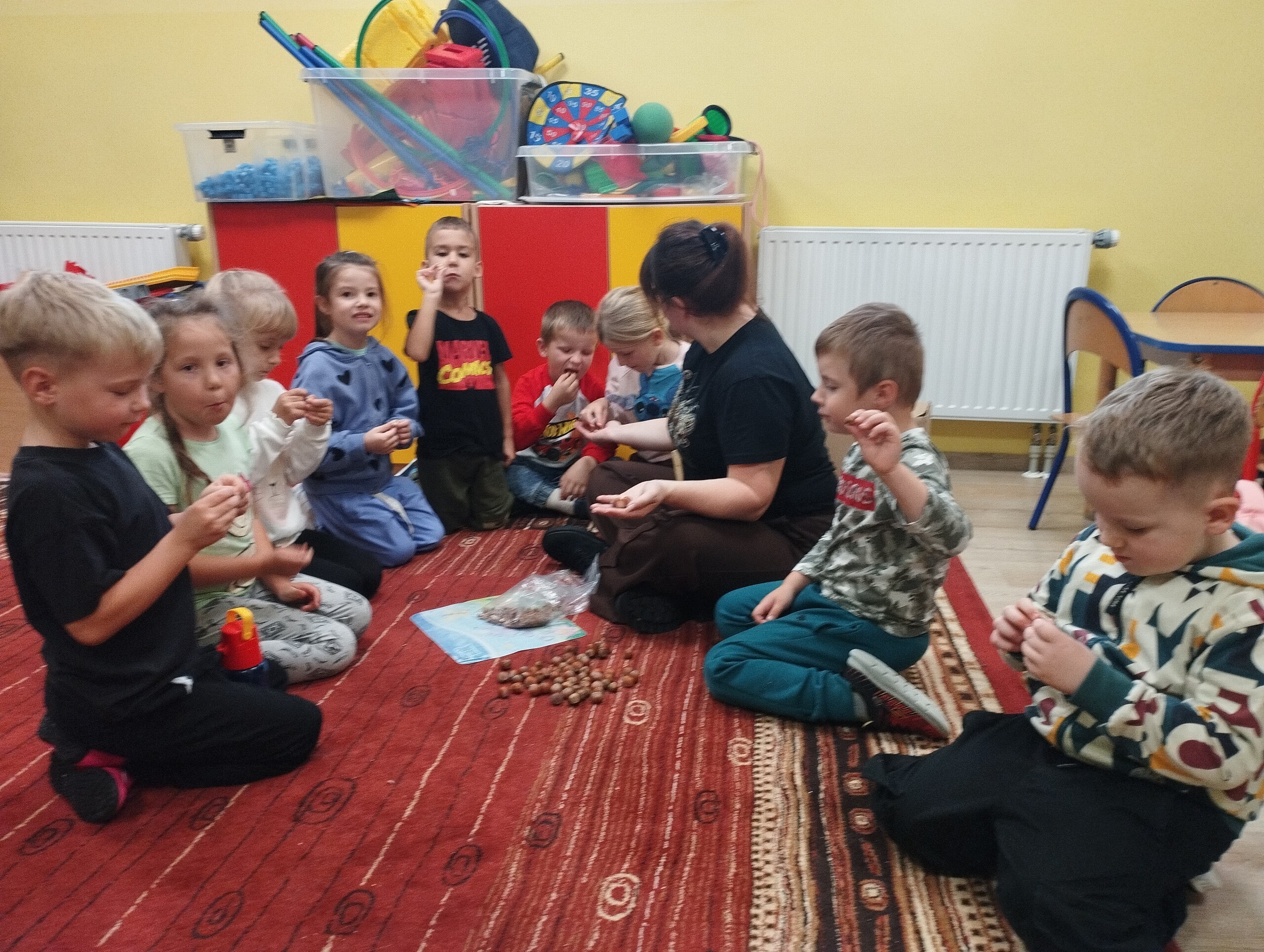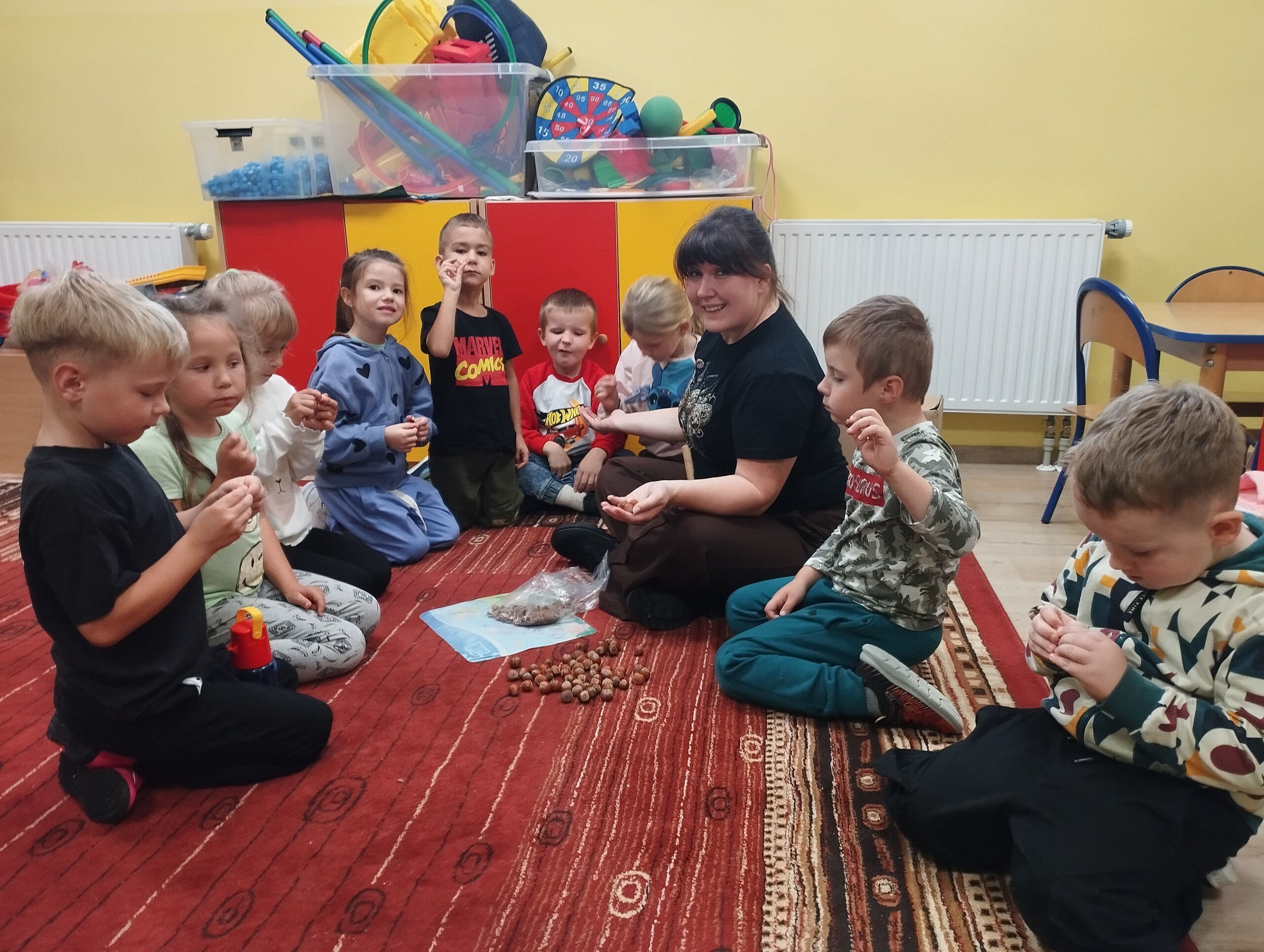 Pani Patrycja Czachorowska utrwalała z dziećmi słownictwo związane z darami jesieni. Dodatkową atrakcja było rozbijanie orzechów laskowych. Myślę, że takie atrakcje pomogą lepiej zapamiętać angielskie nazwy.