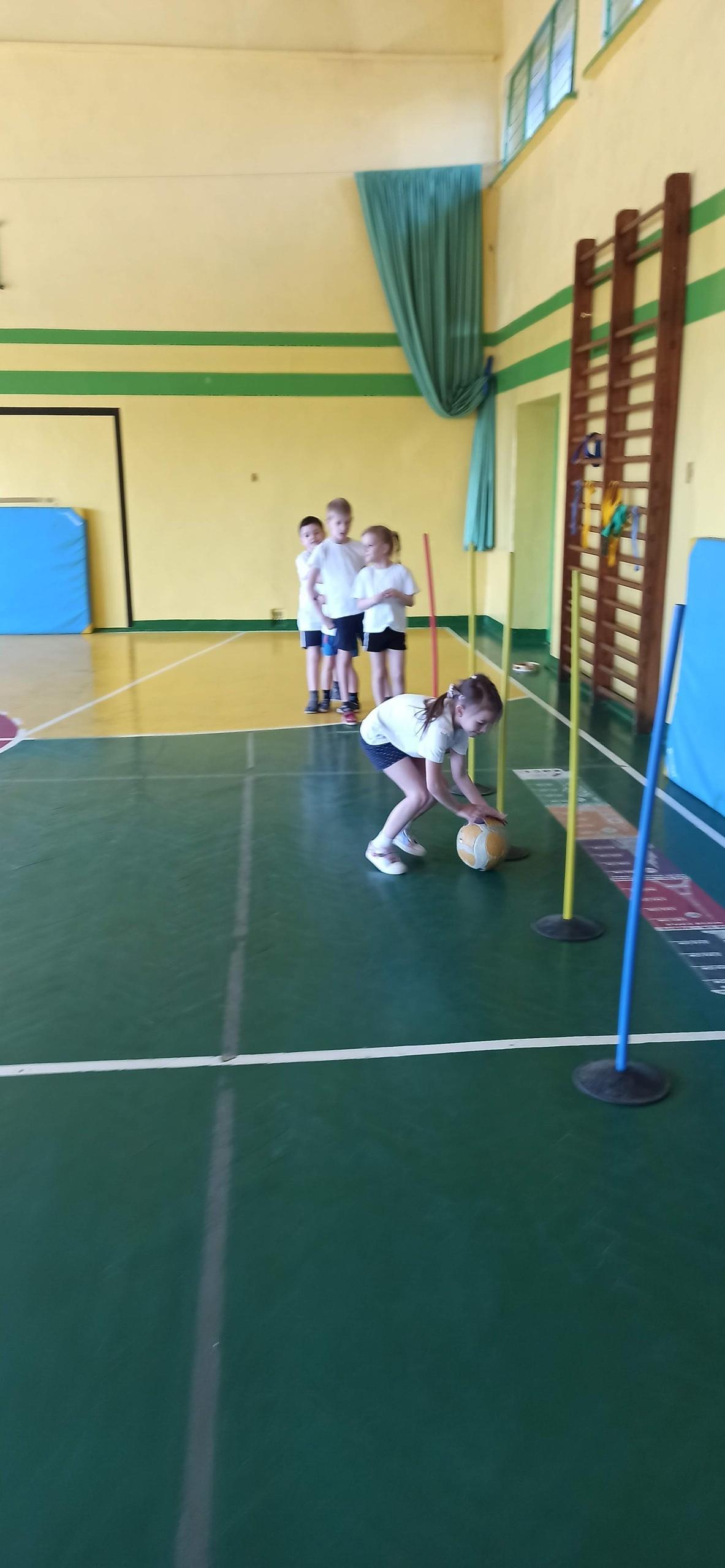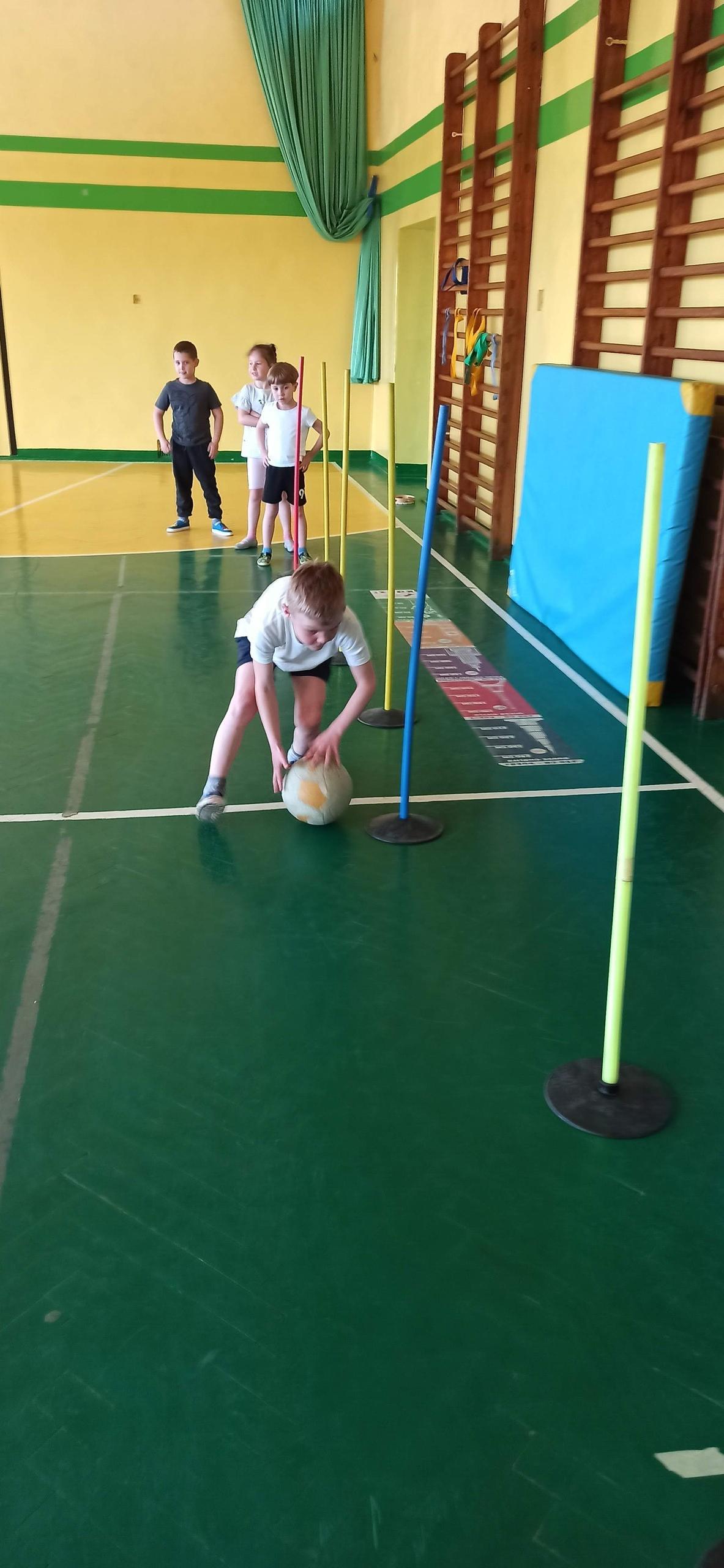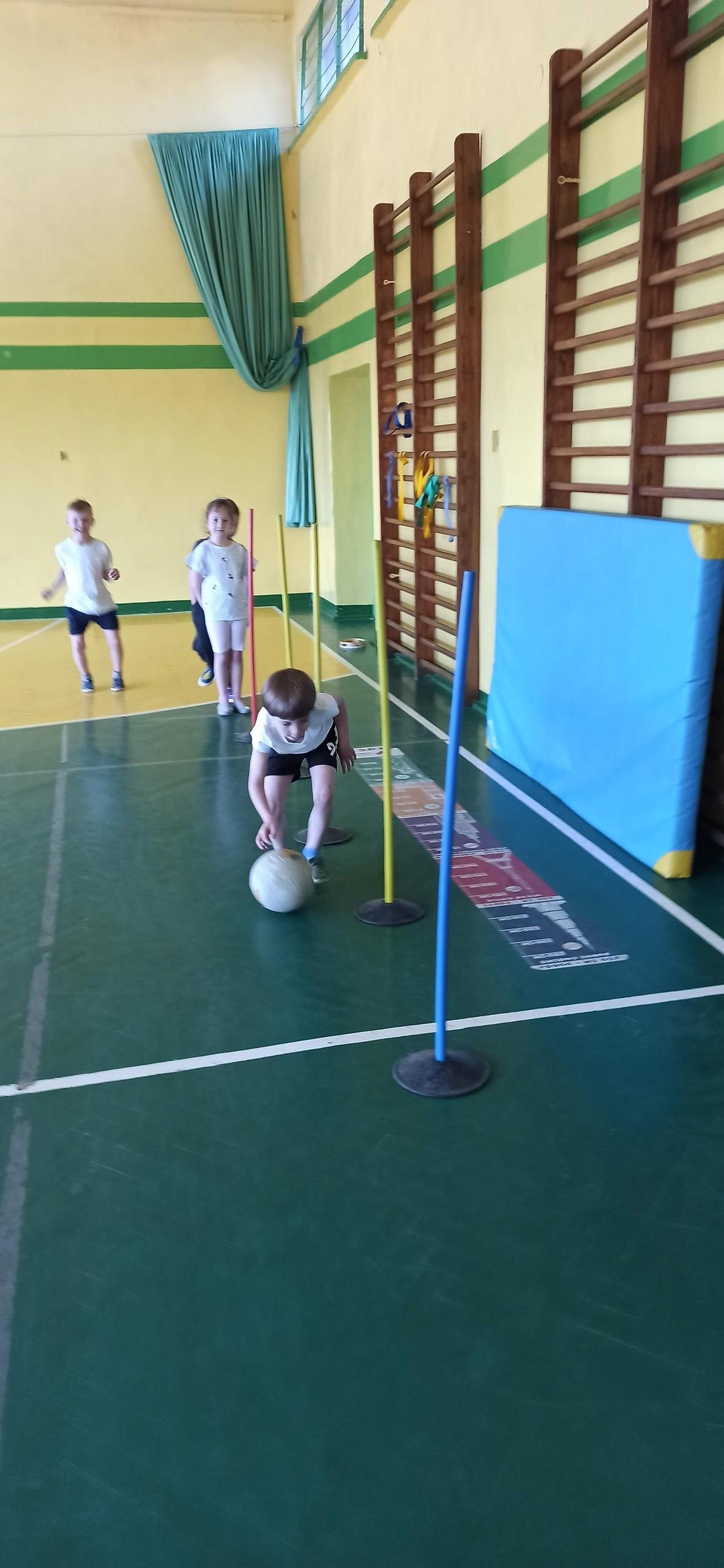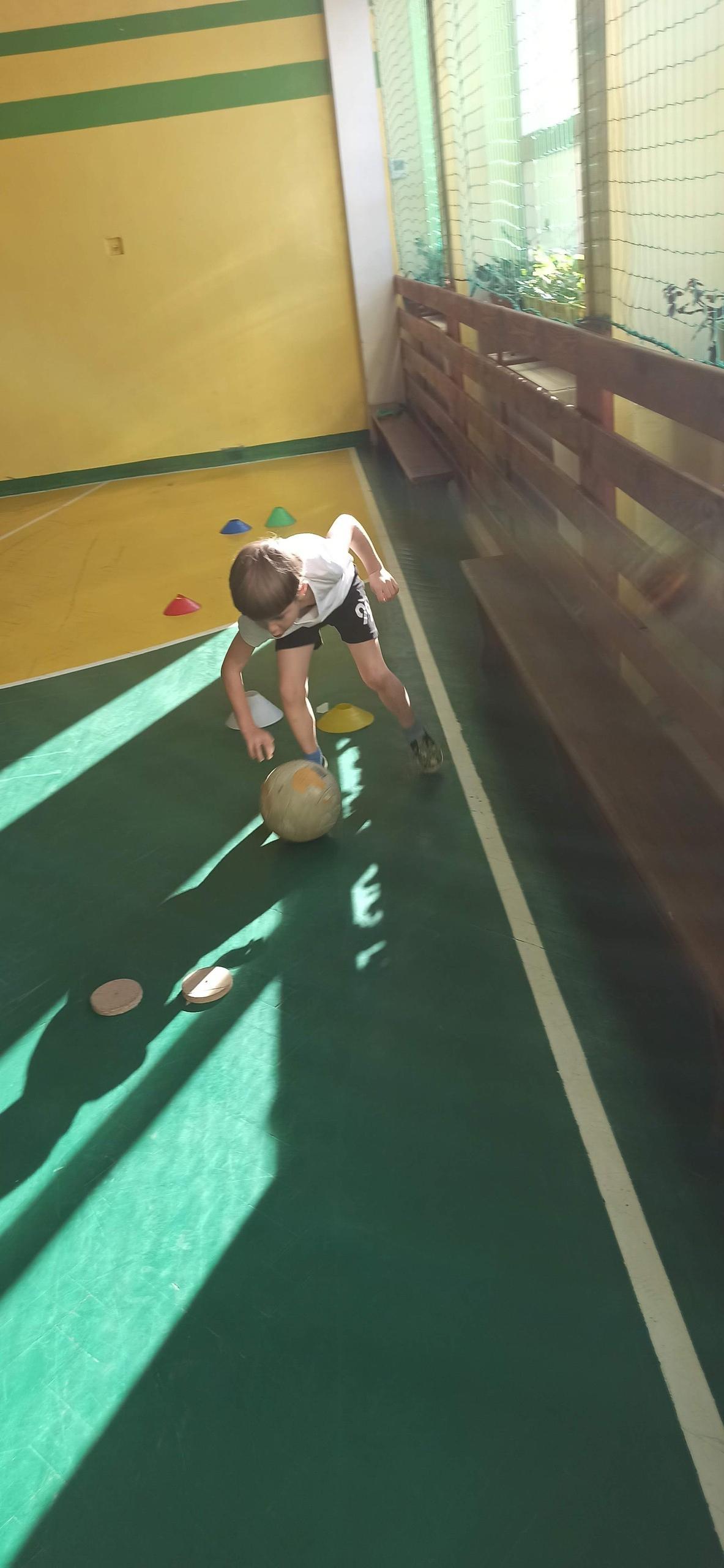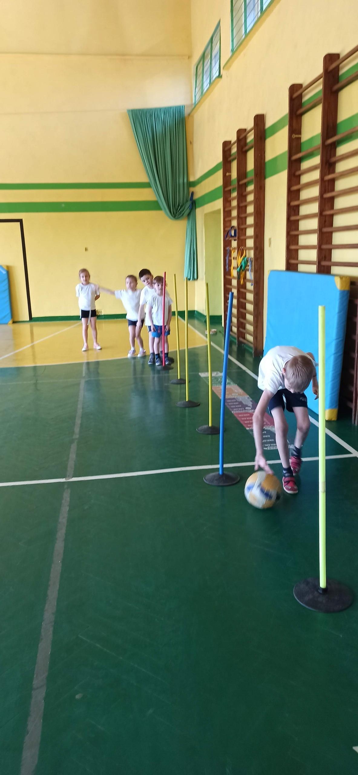 Wykonywaliśmy dziś ćwiczenia z piłką. Pokonywaliśmy tor przeszkód, slalom, ćwiczyliśmy podania i kozłowanie.
