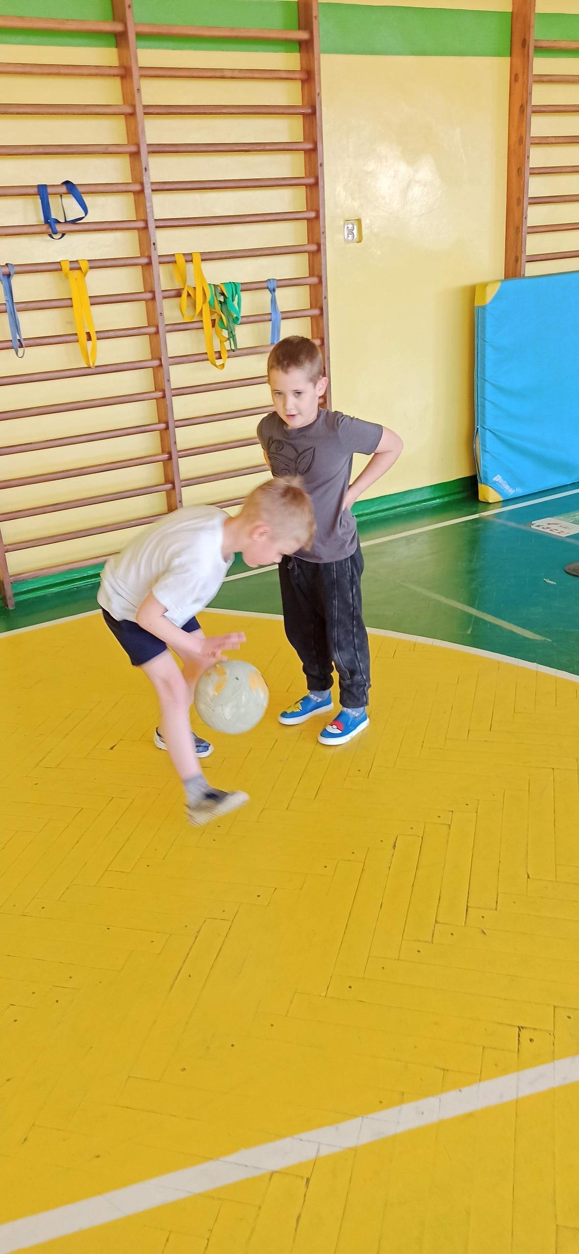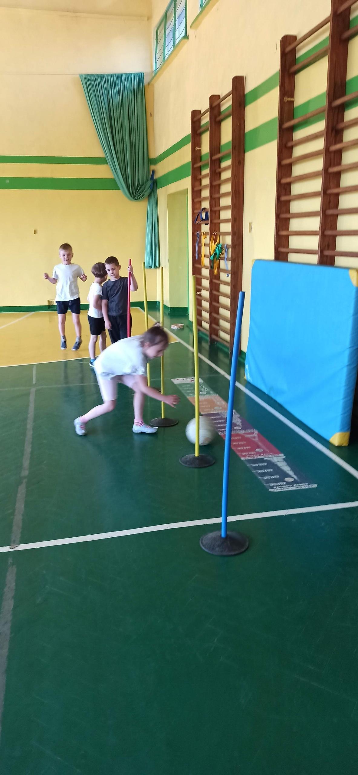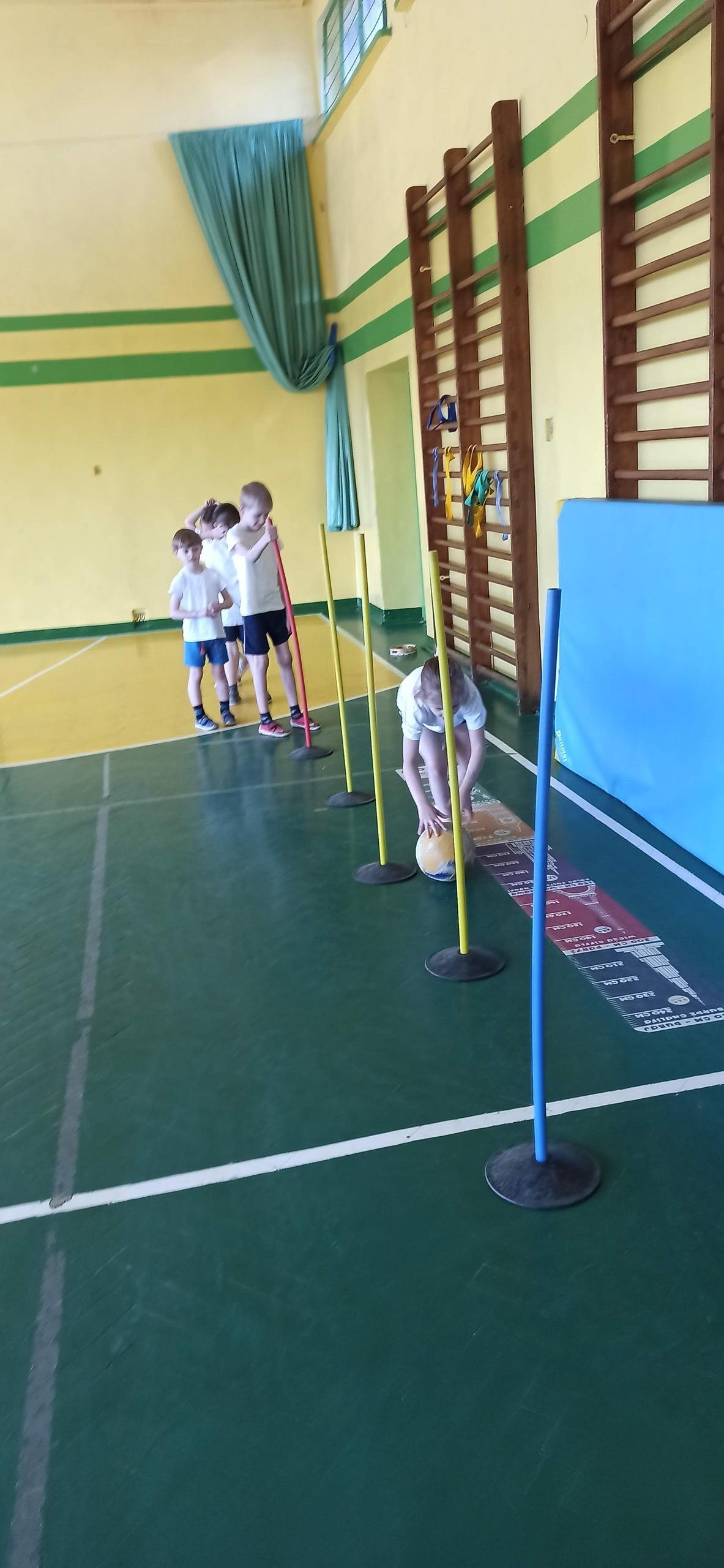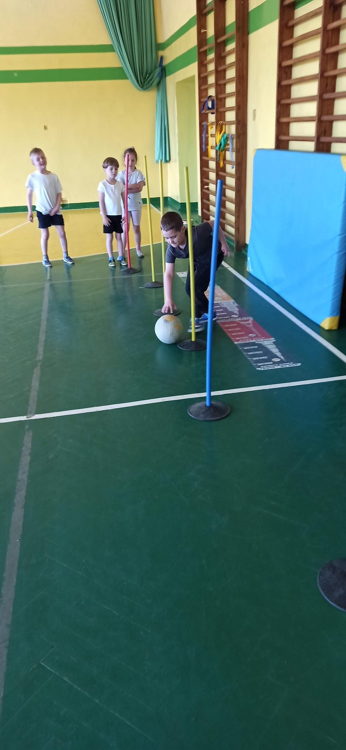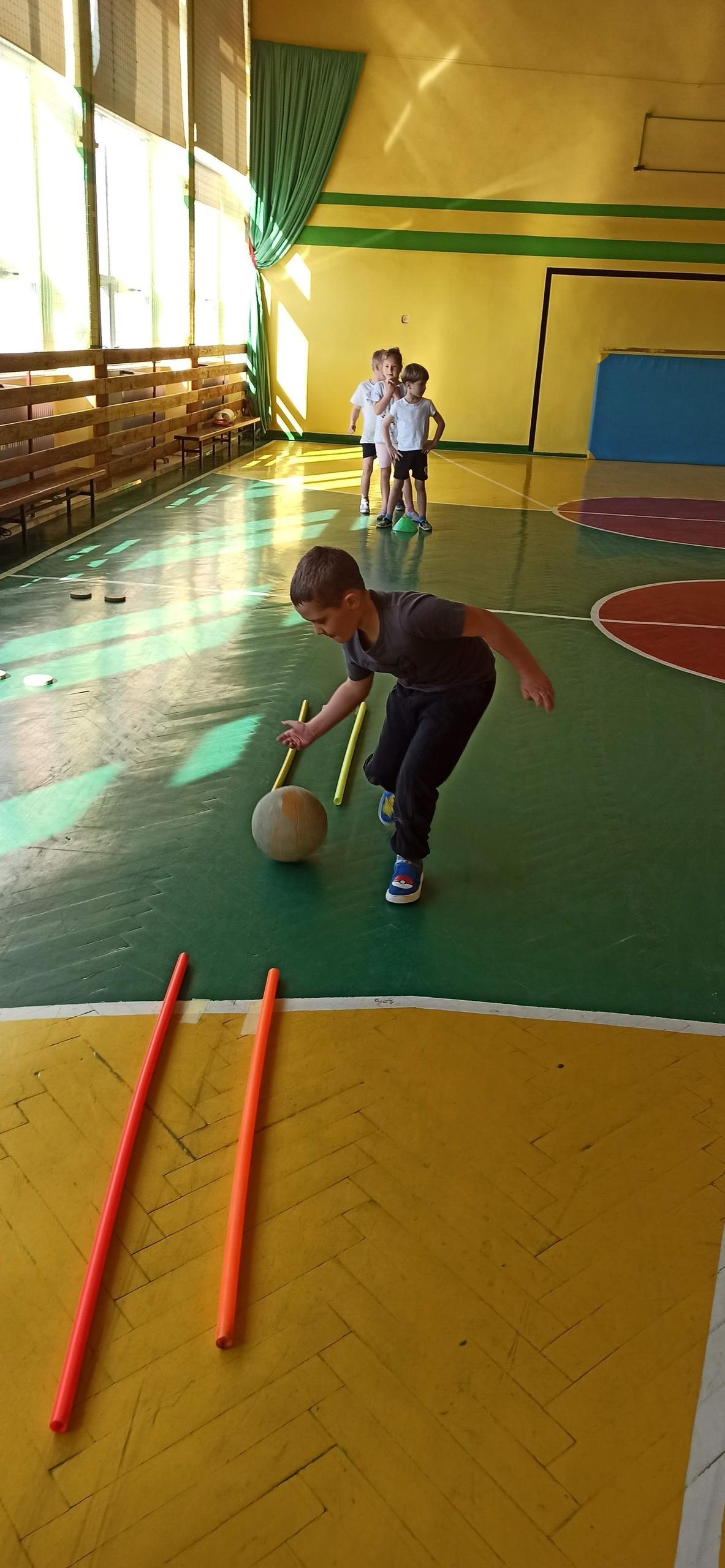 Wykonywaliśmy dziś ćwiczenia z piłką. Pokonywaliśmy tor przeszkód, slalom, ćwiczyliśmy podania i kozłowanie.