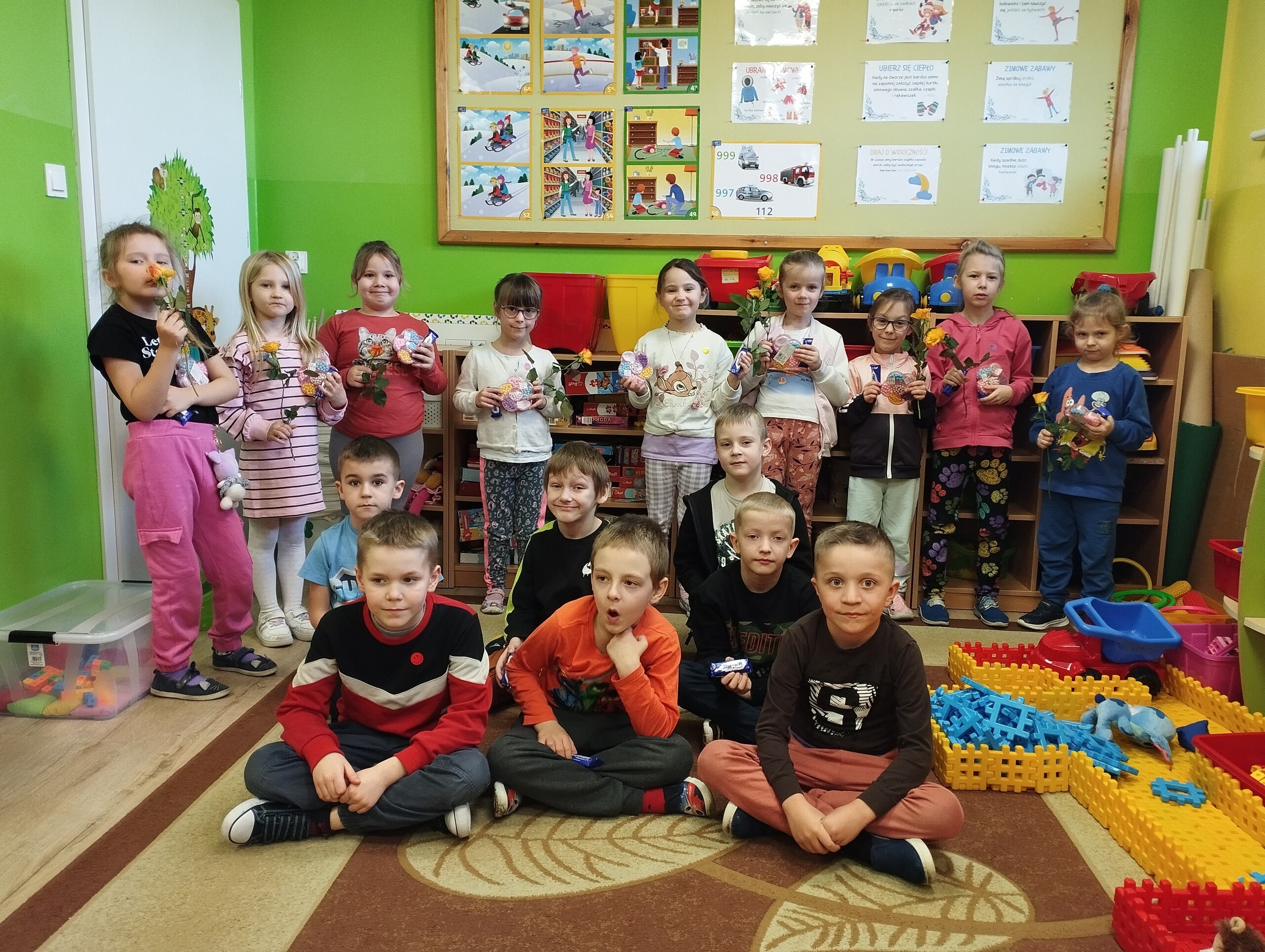 Dziś w całej szkole dziewczynki i panie przyjmują życzenia z okazji swojego święta. Dziewczynki z naszej grupy otrzymały od chłopców koraliki do samodzielnego wykonania ozdób, słodycze. Adaś dodatkowo dla wszystkich dziewczynek i pań przyniósł kwiaty.