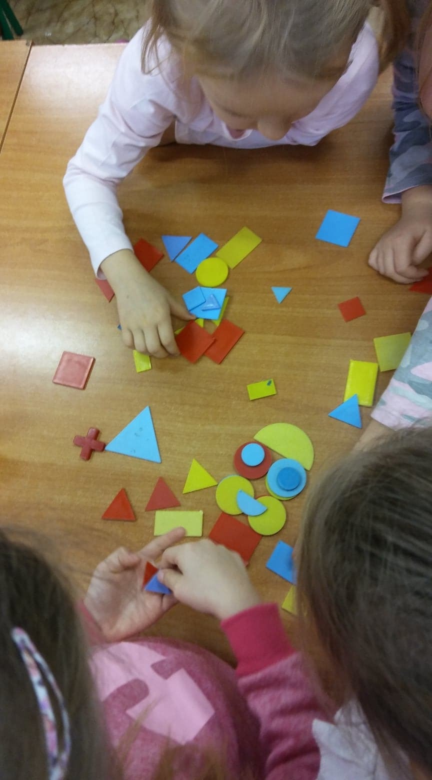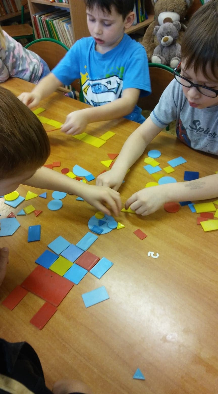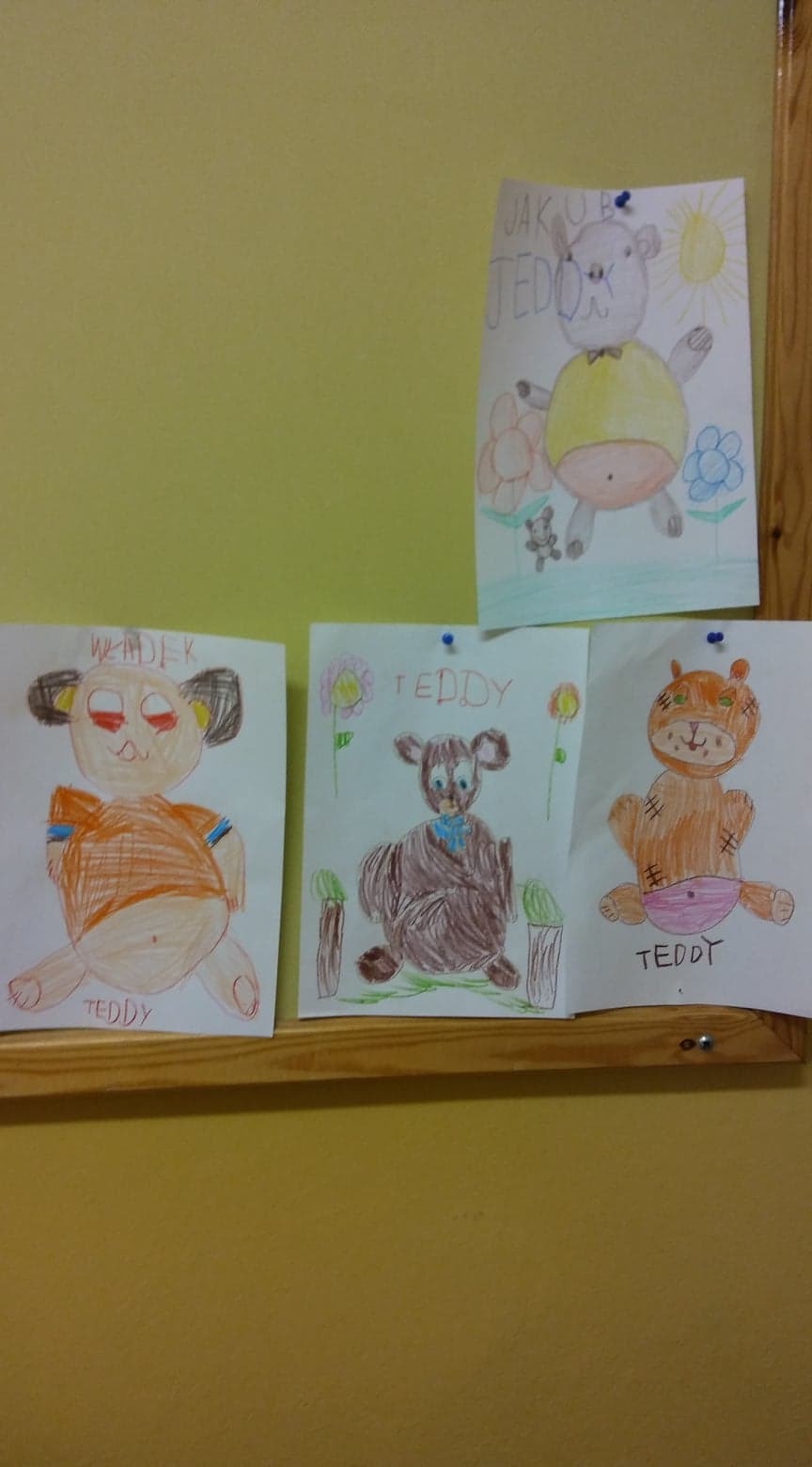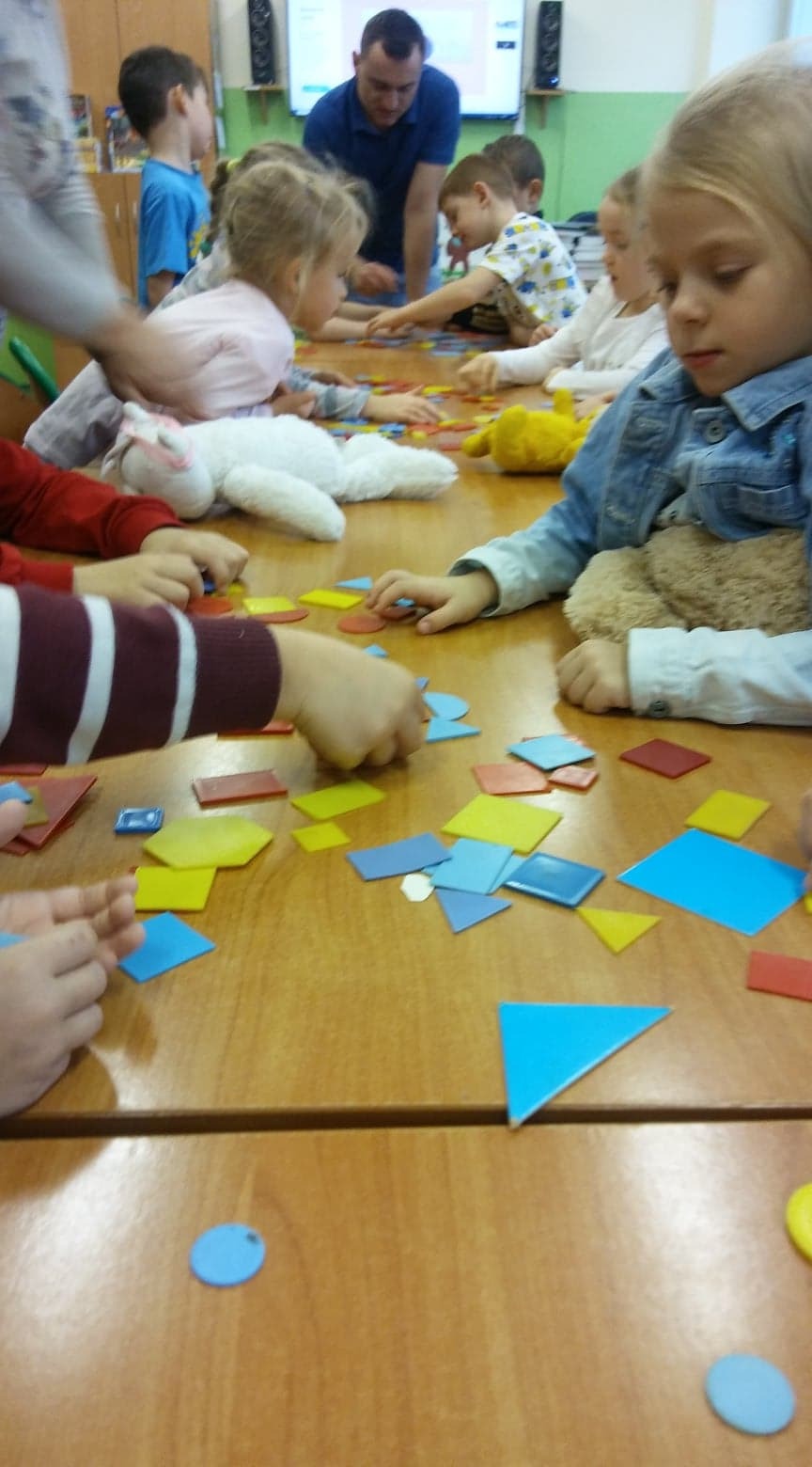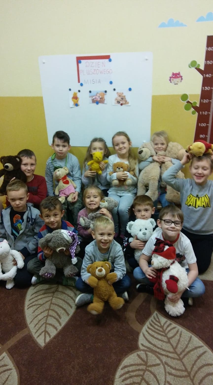 Tego dnia wszystkie dzieci przyniosły do szkoły swoje pluszaki. Pani opowiedziała dzieciom, o tym jak powstał miś. Dzieci wykonały pracę plastyczną. Pani Bożena zaprosiła nas do biblioteki na zajęcia. W ich trakcie rozmawialiśmy o misiach, które występują w bajkach. Dzieci układały postać misia z figur geometrycznych.