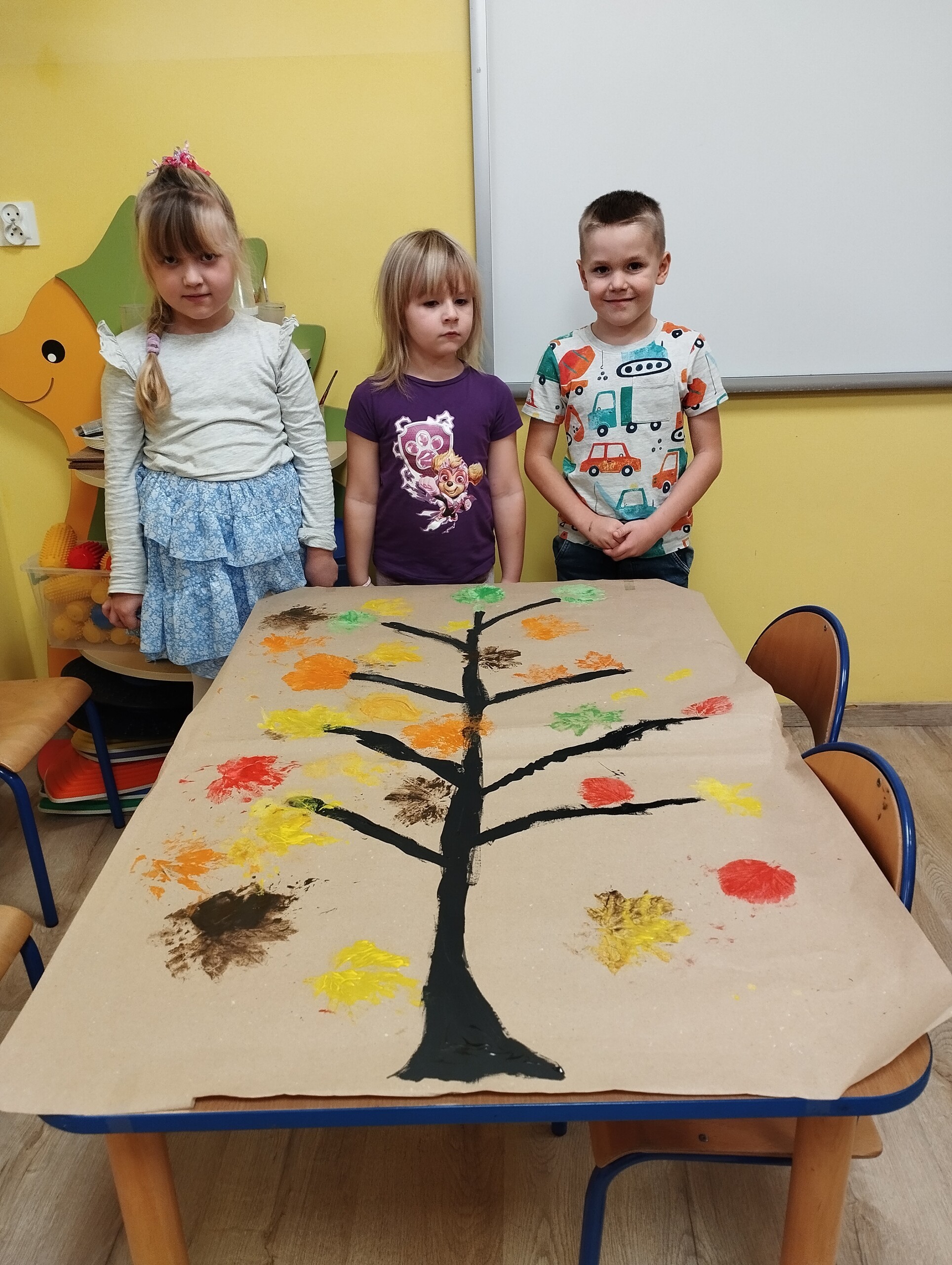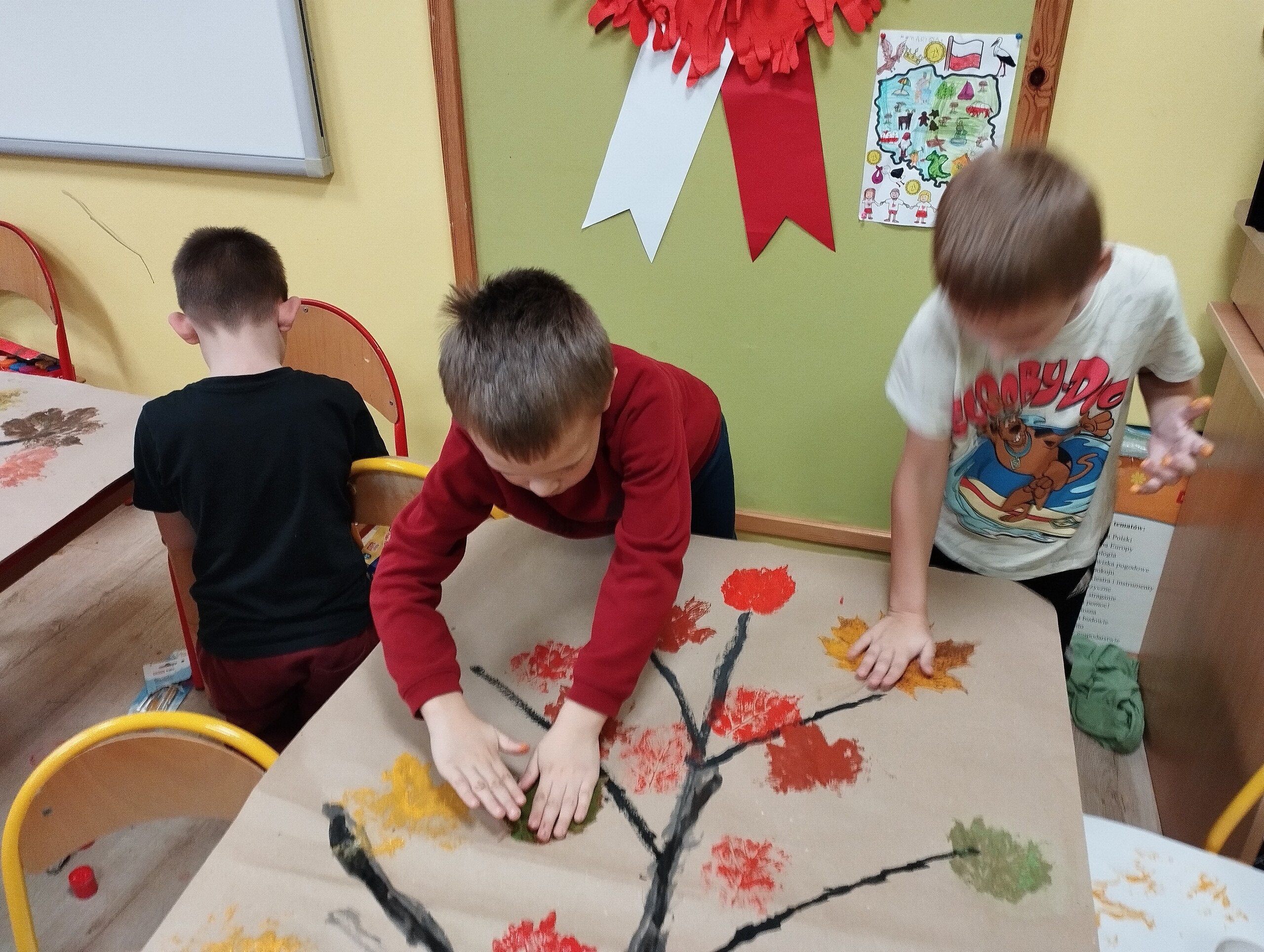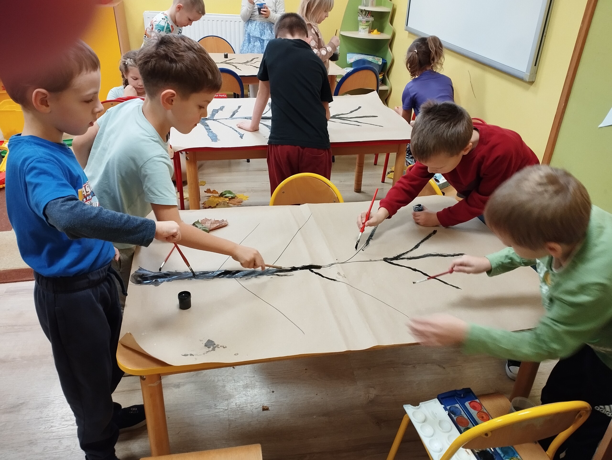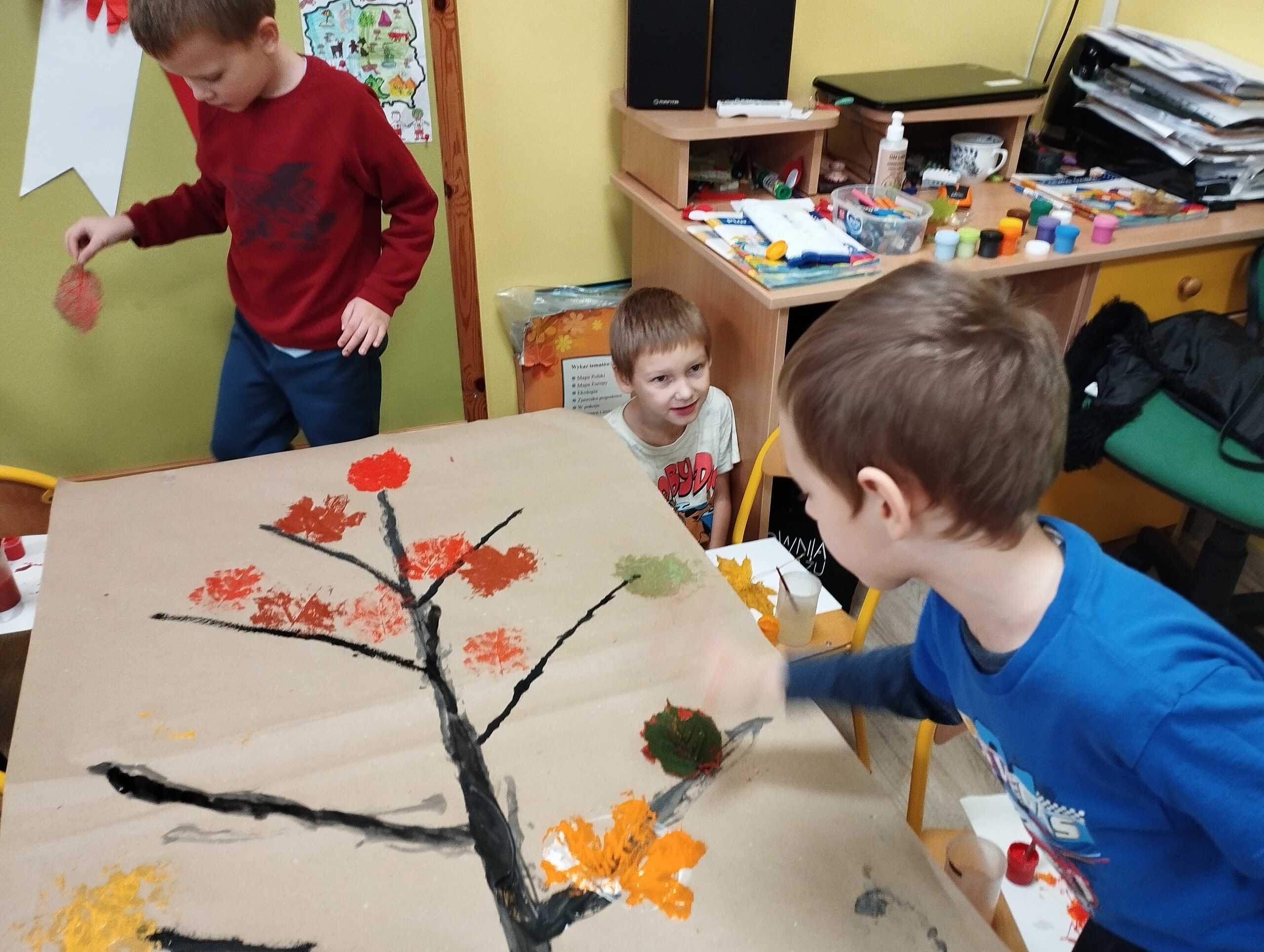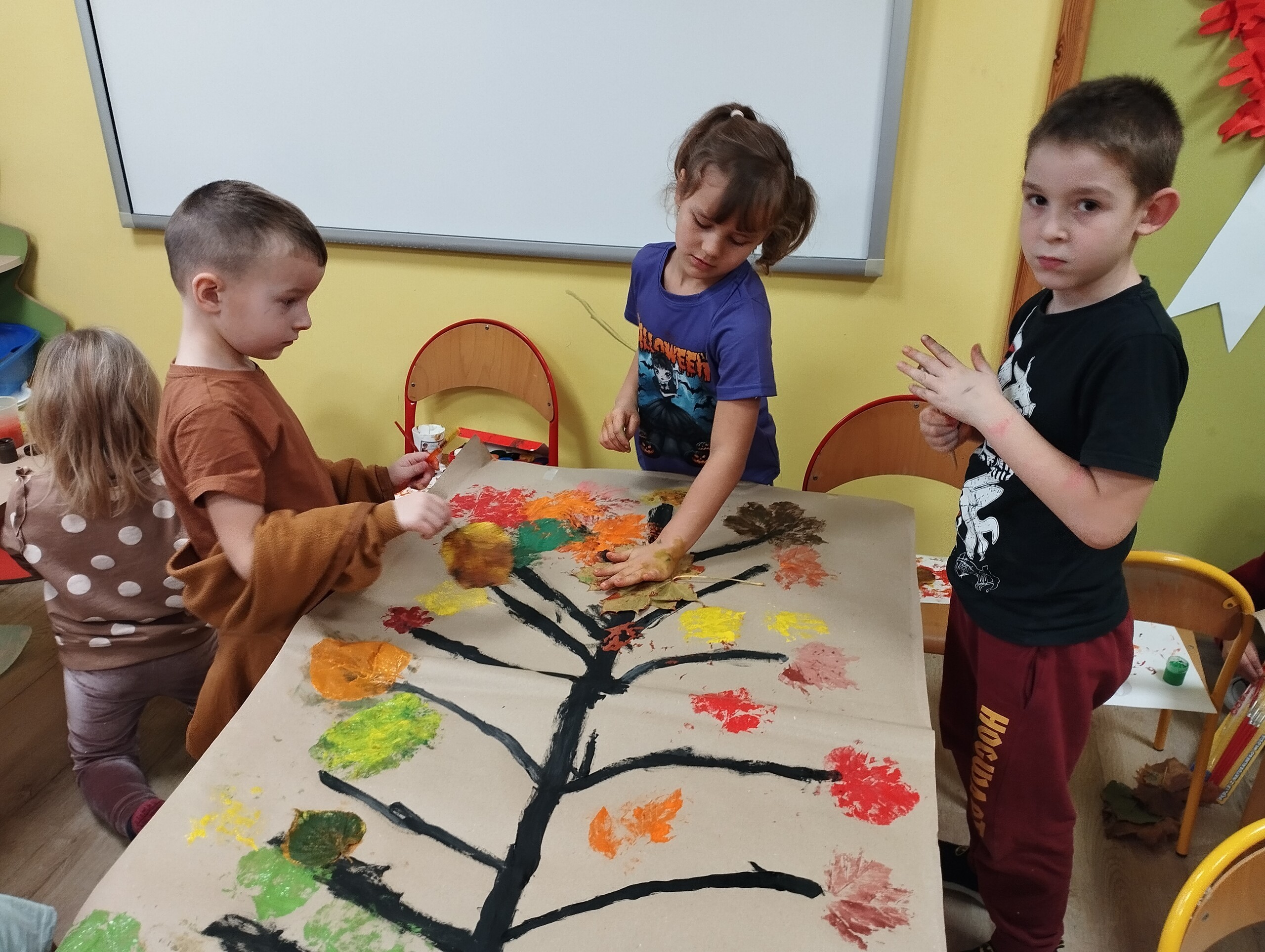 Dziś zbieraliśmy kolorowe jesienne liście i przy ich pomocy wykonaliśmy jesienne drzewa.