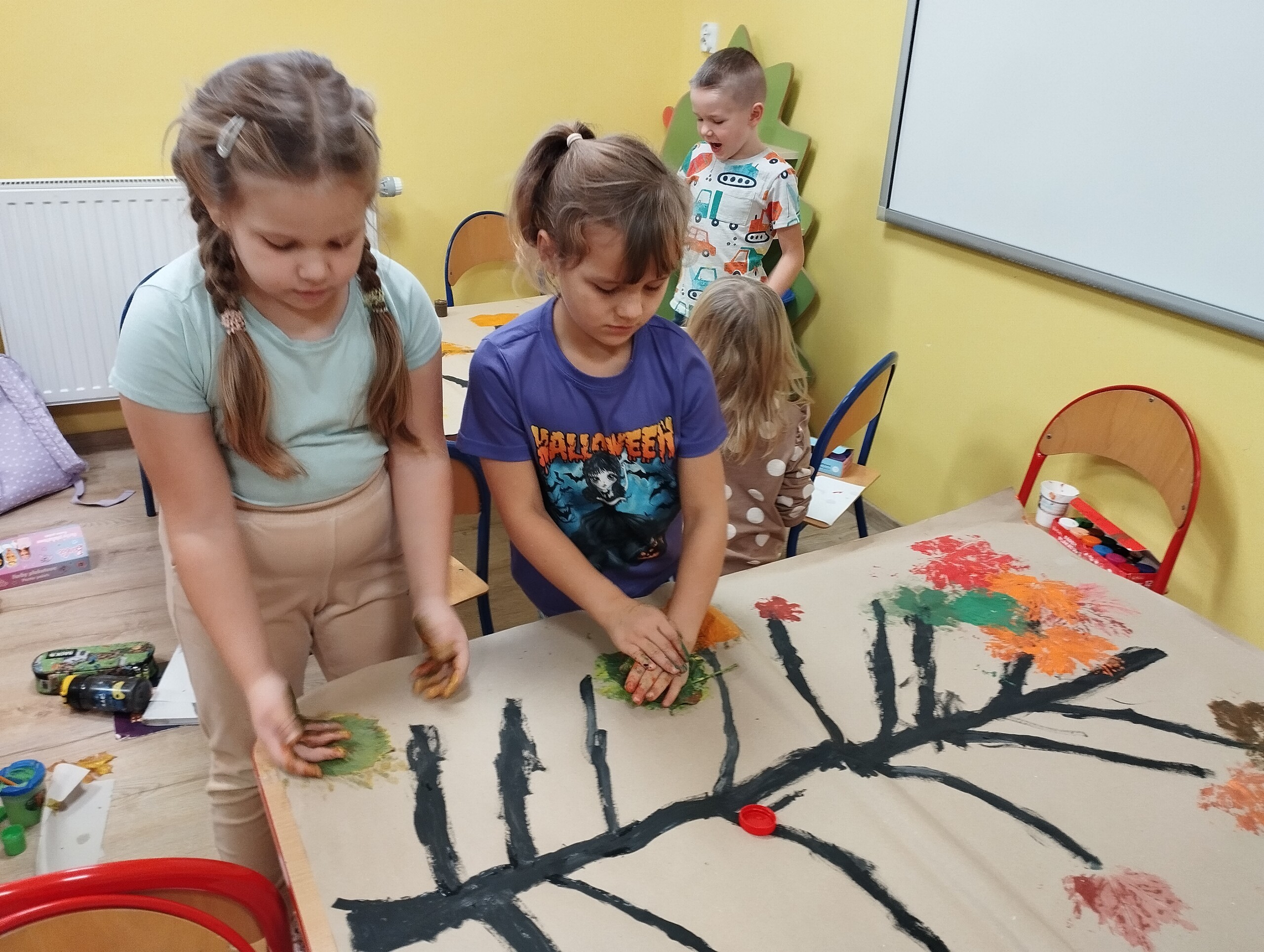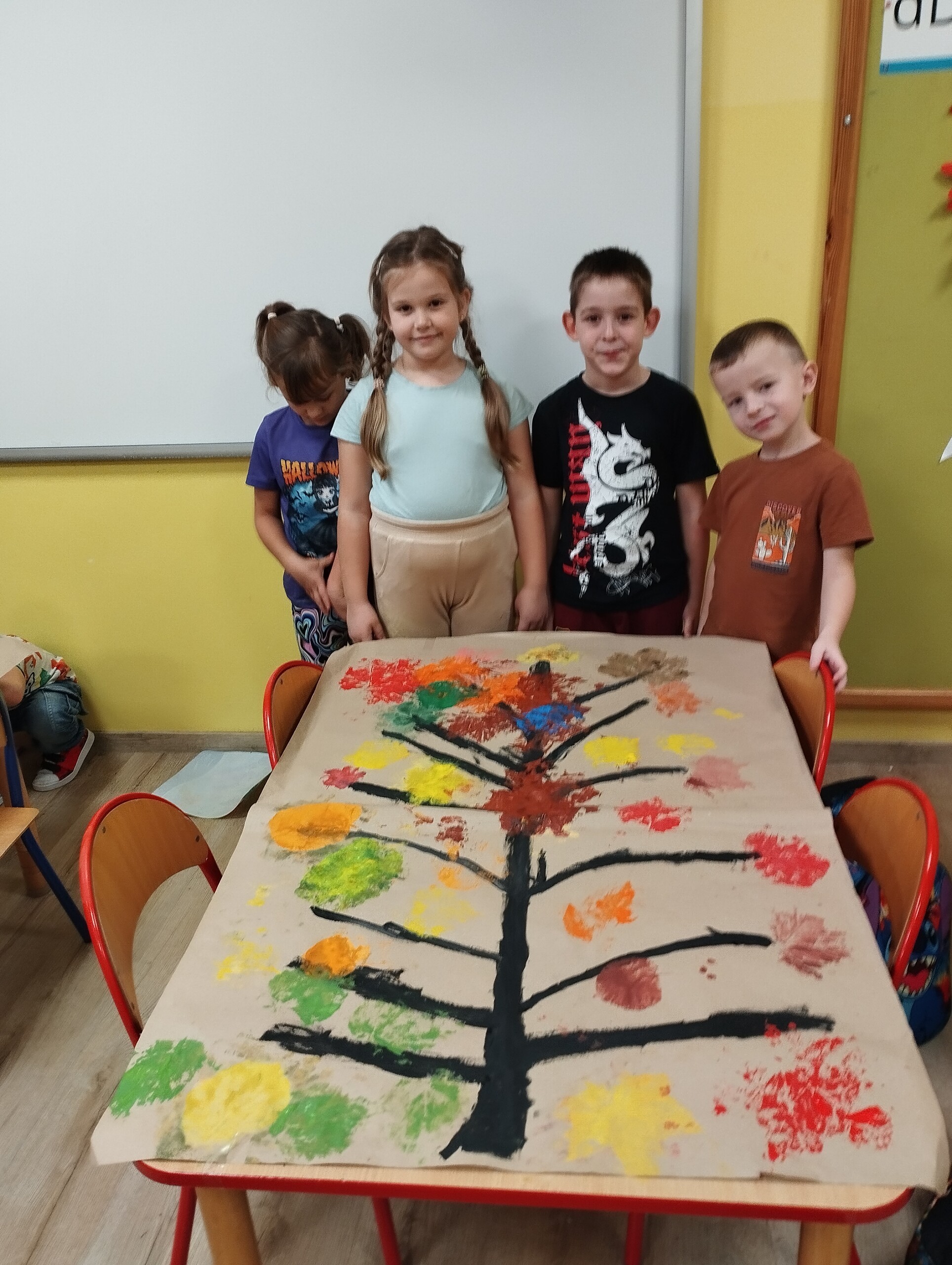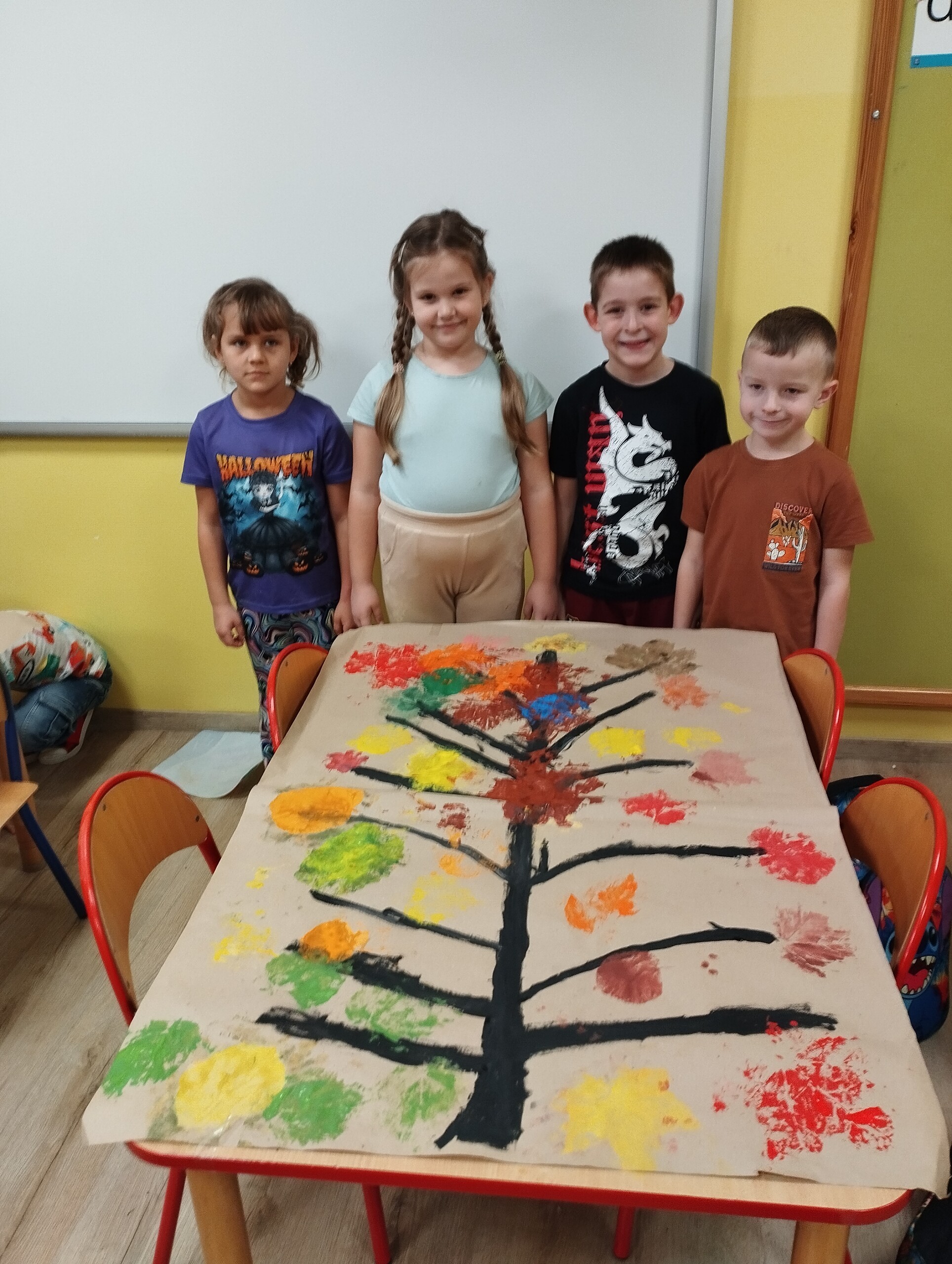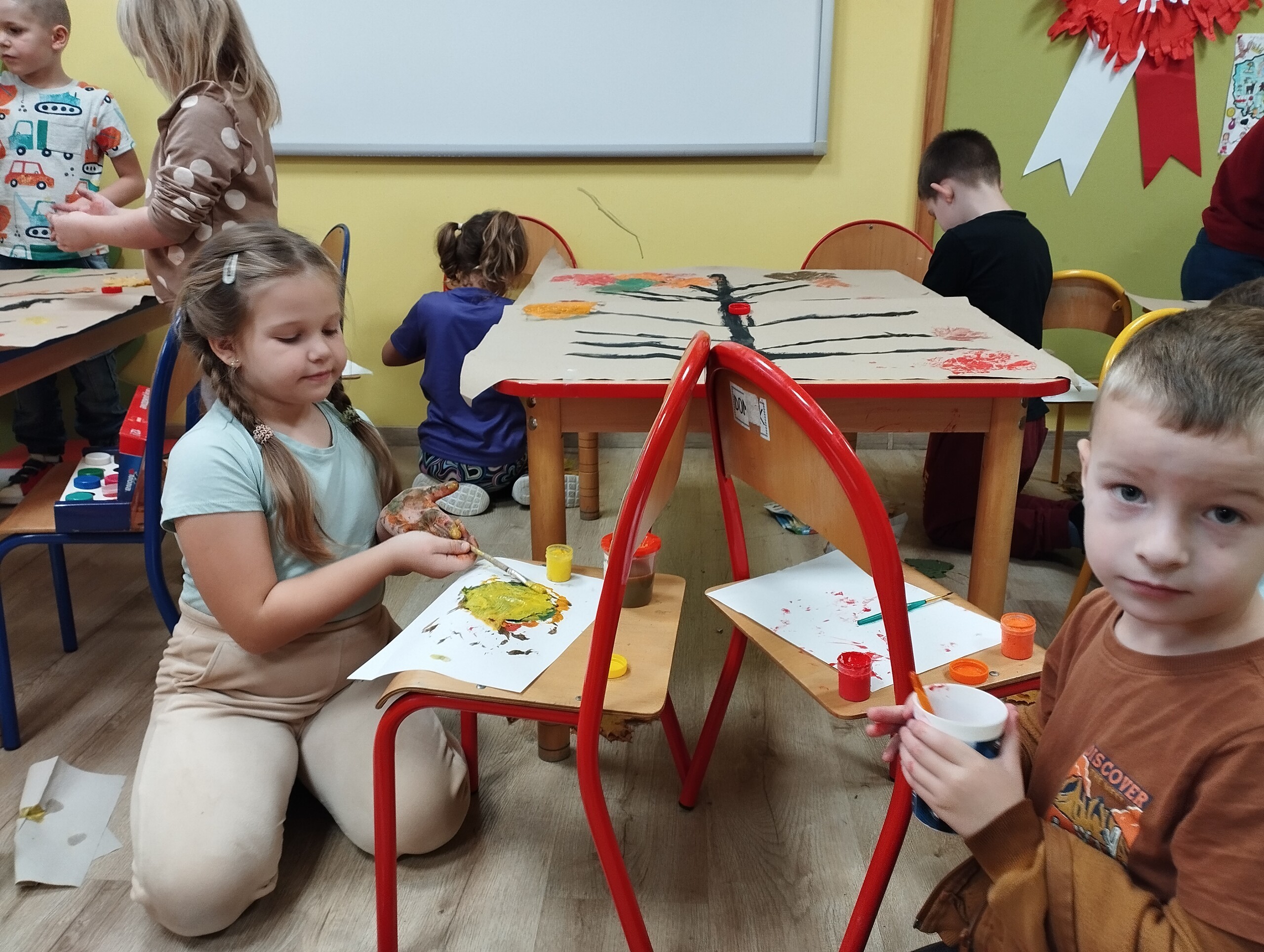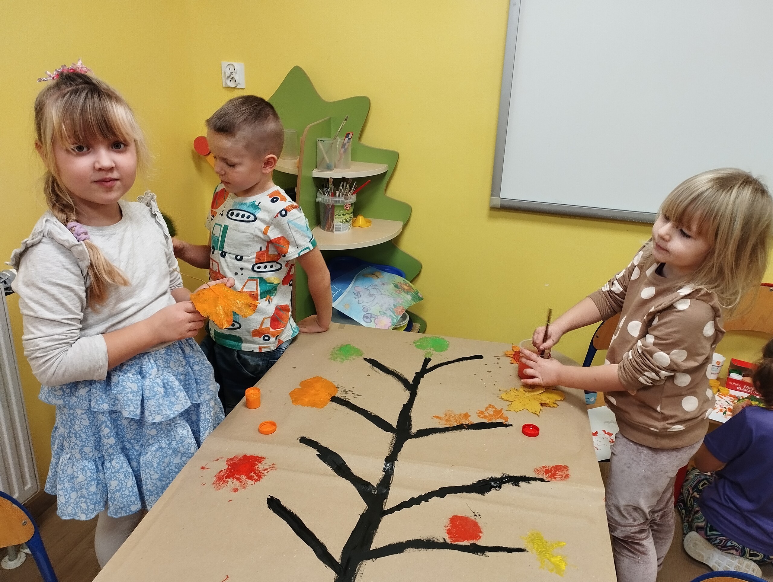 Dziś zbieraliśmy kolorowe jesienne liście i przy ich pomocy wykonaliśmy jesienne drzewa.