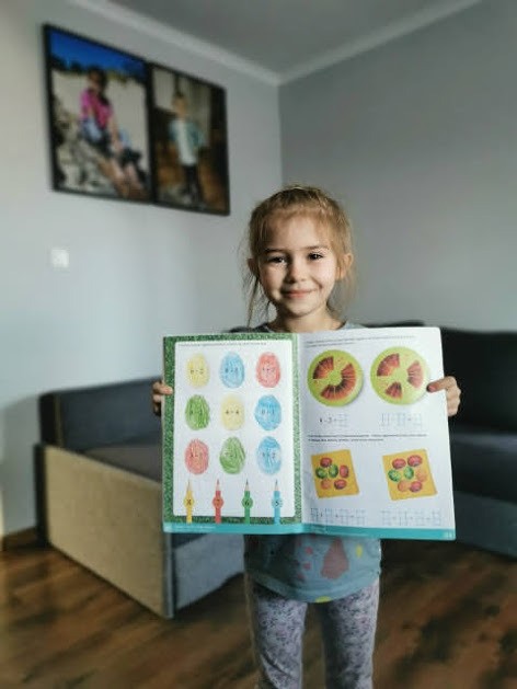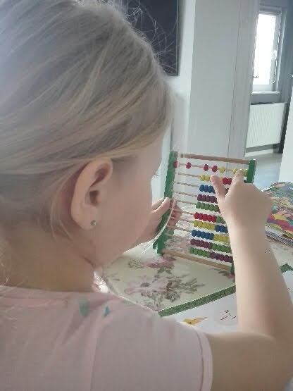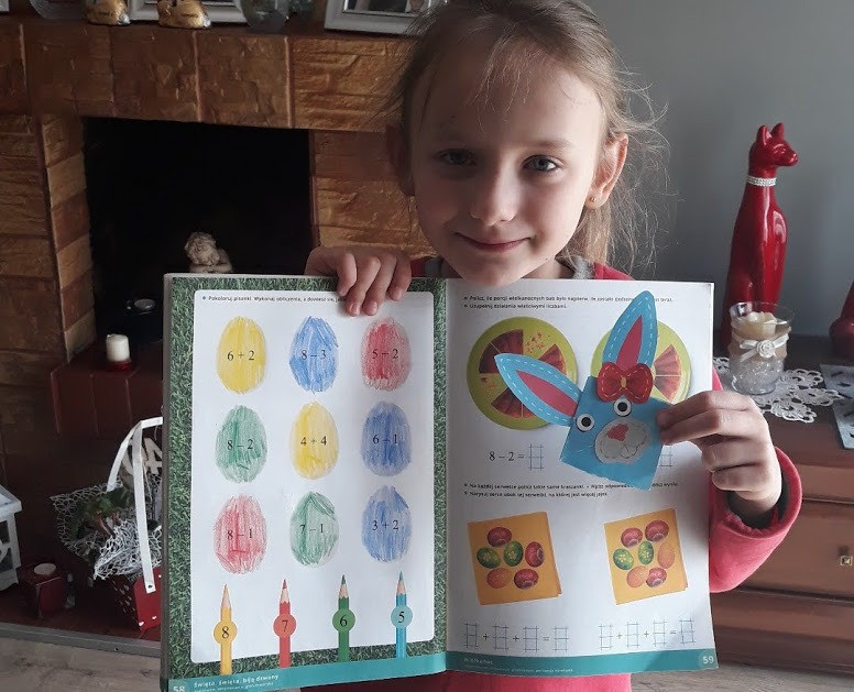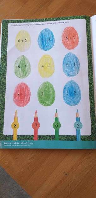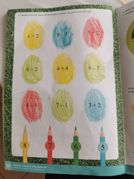 2. Zadanie ze str.58. Wykonaj obliczenia posługując się patyczkami, klockami lub innymi liczmanami. Ustal jakim kolorem wypełnić pisanki.