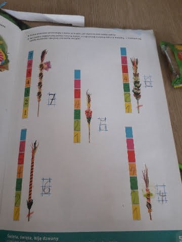 1. Zadania z książki "Liczenie". Na str. 57 zmierz przedstawione palmy za pomocą kolorowych cegiełek, wpisz wynik w kratki.