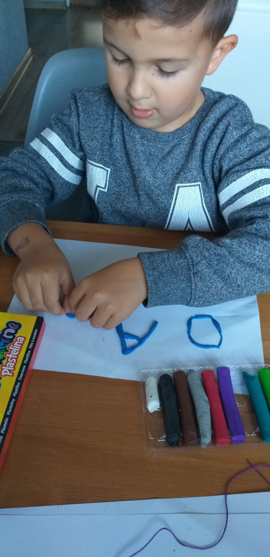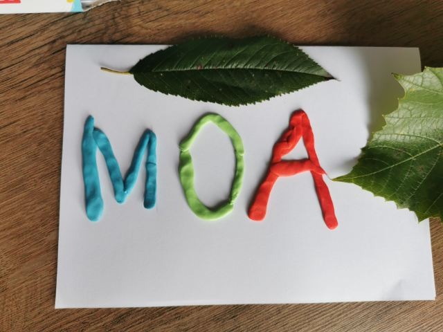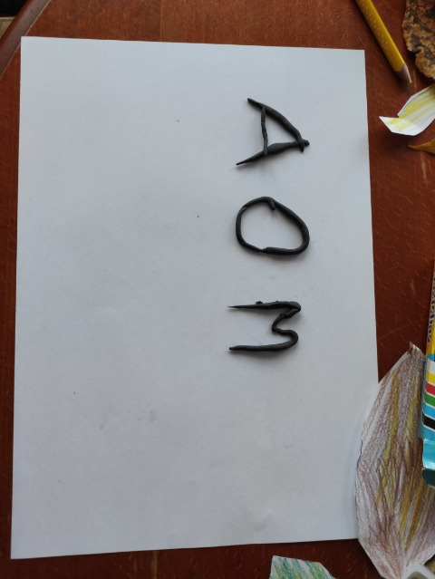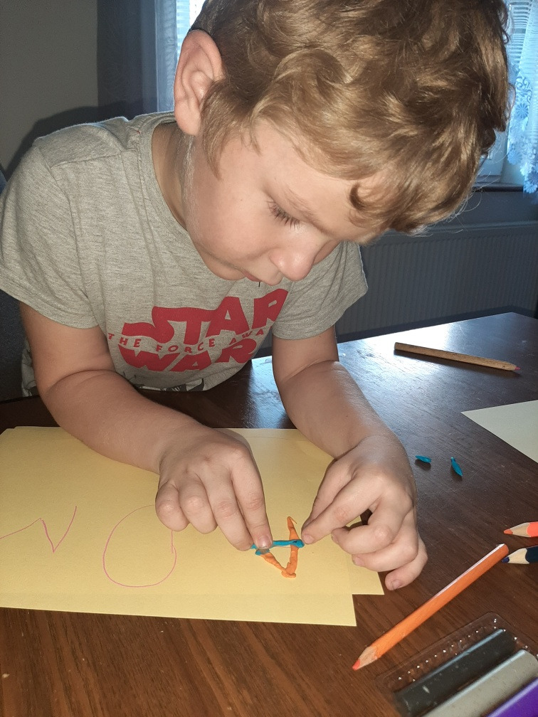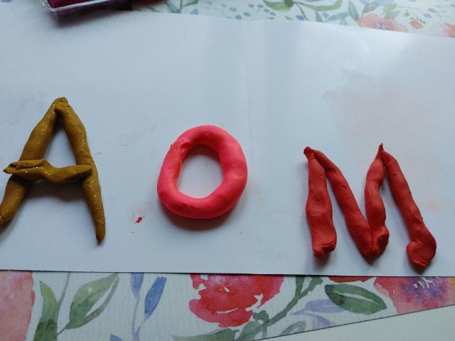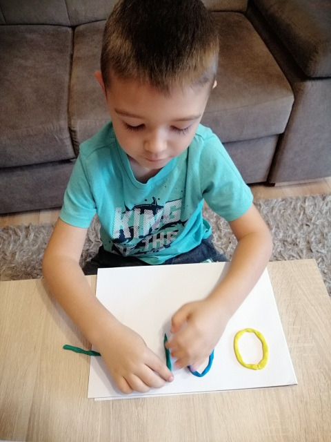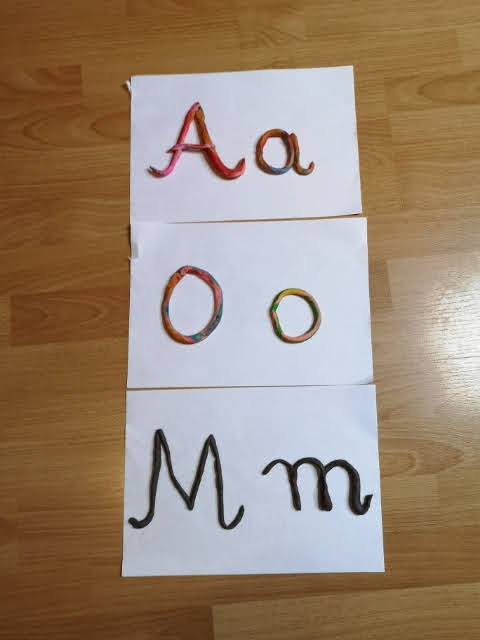 4. Ułóż z plasteliny, sznurka lub innego materiału kształt liery: A, O, M.