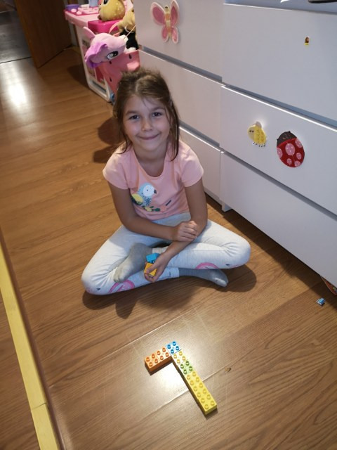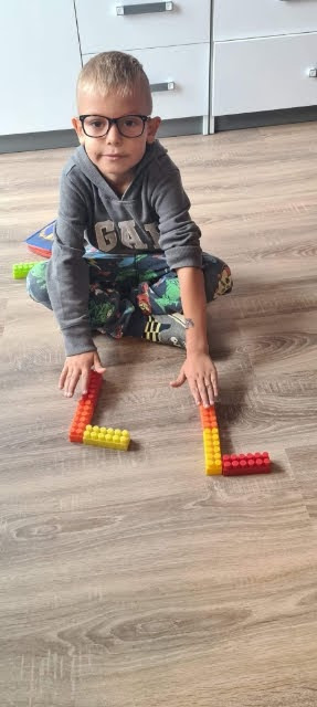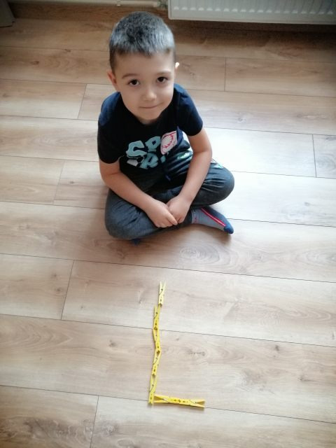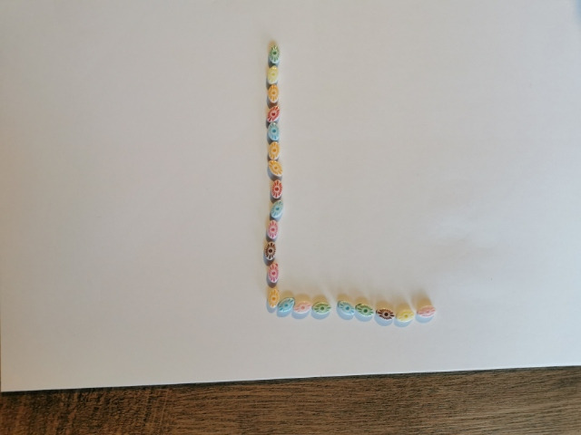 5. ułóż z zakrętek od napoi, małych klocków, guzików lub kamyczków kształt litery wielkiej drukowanej L. Możesz to zrobić za pomocą klamerki.