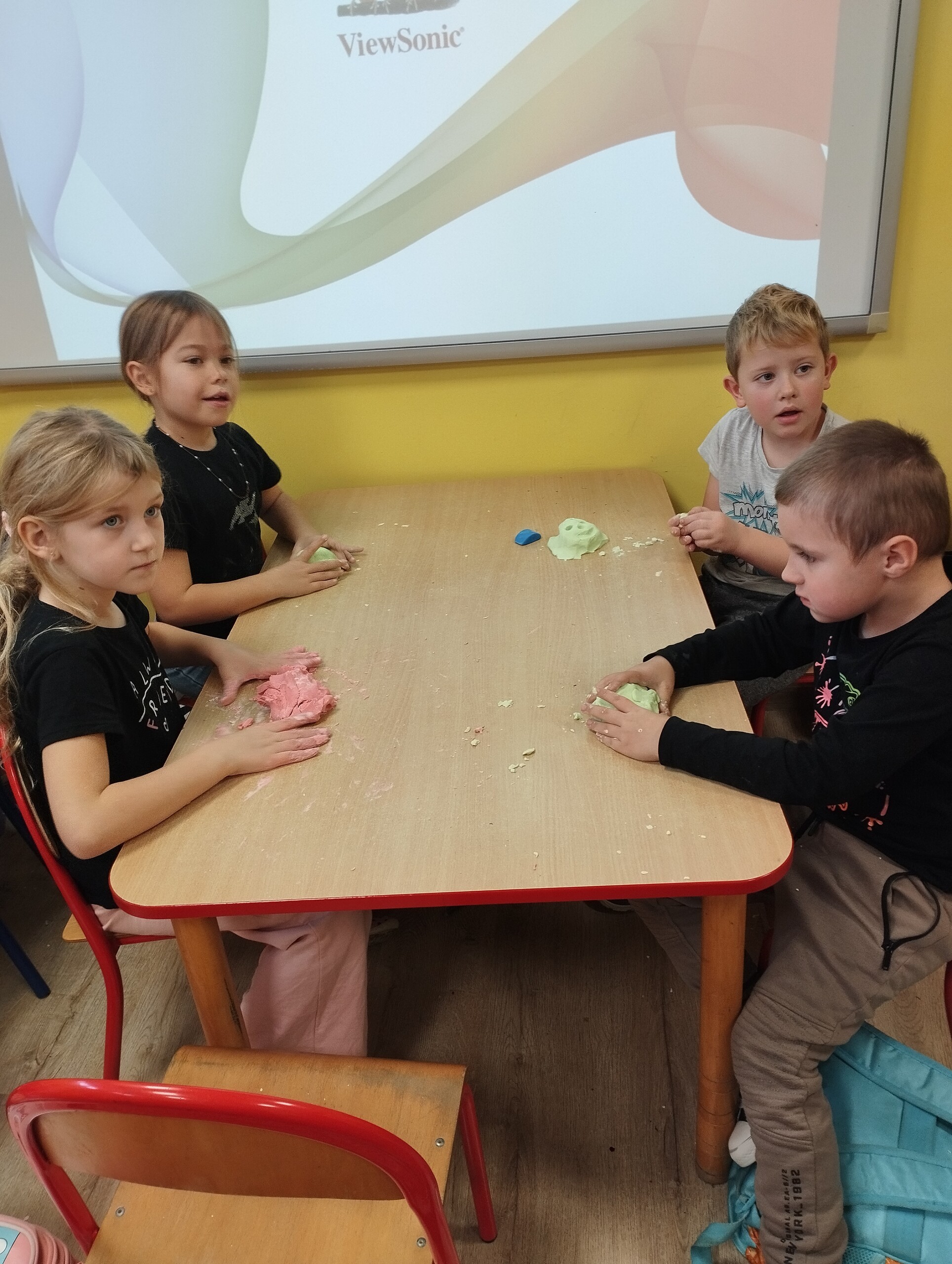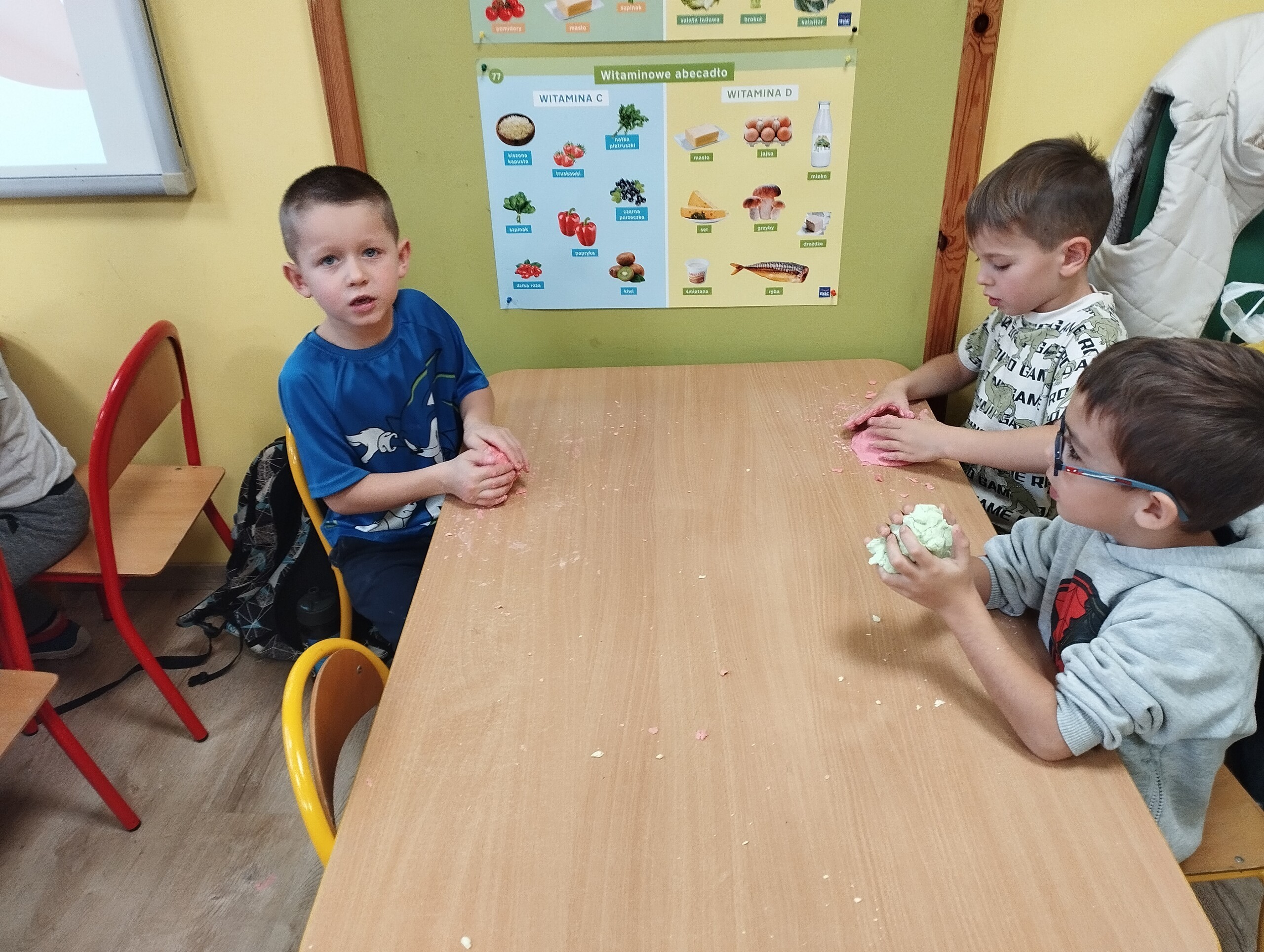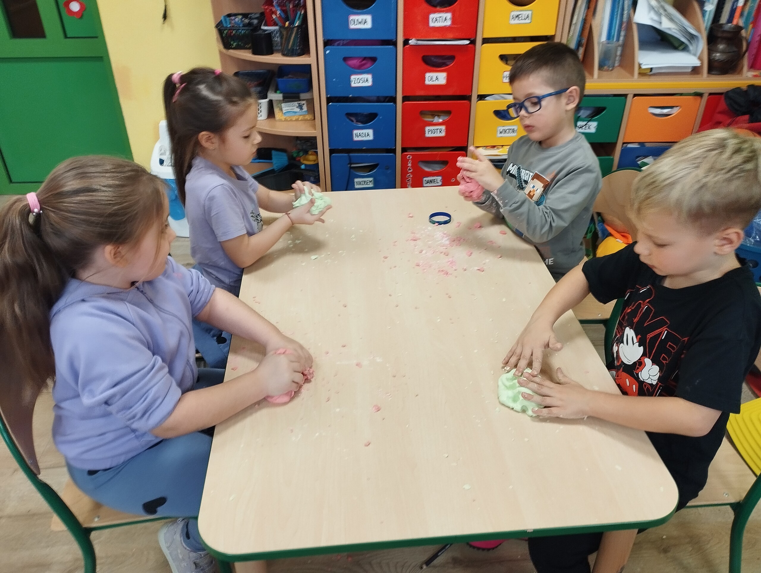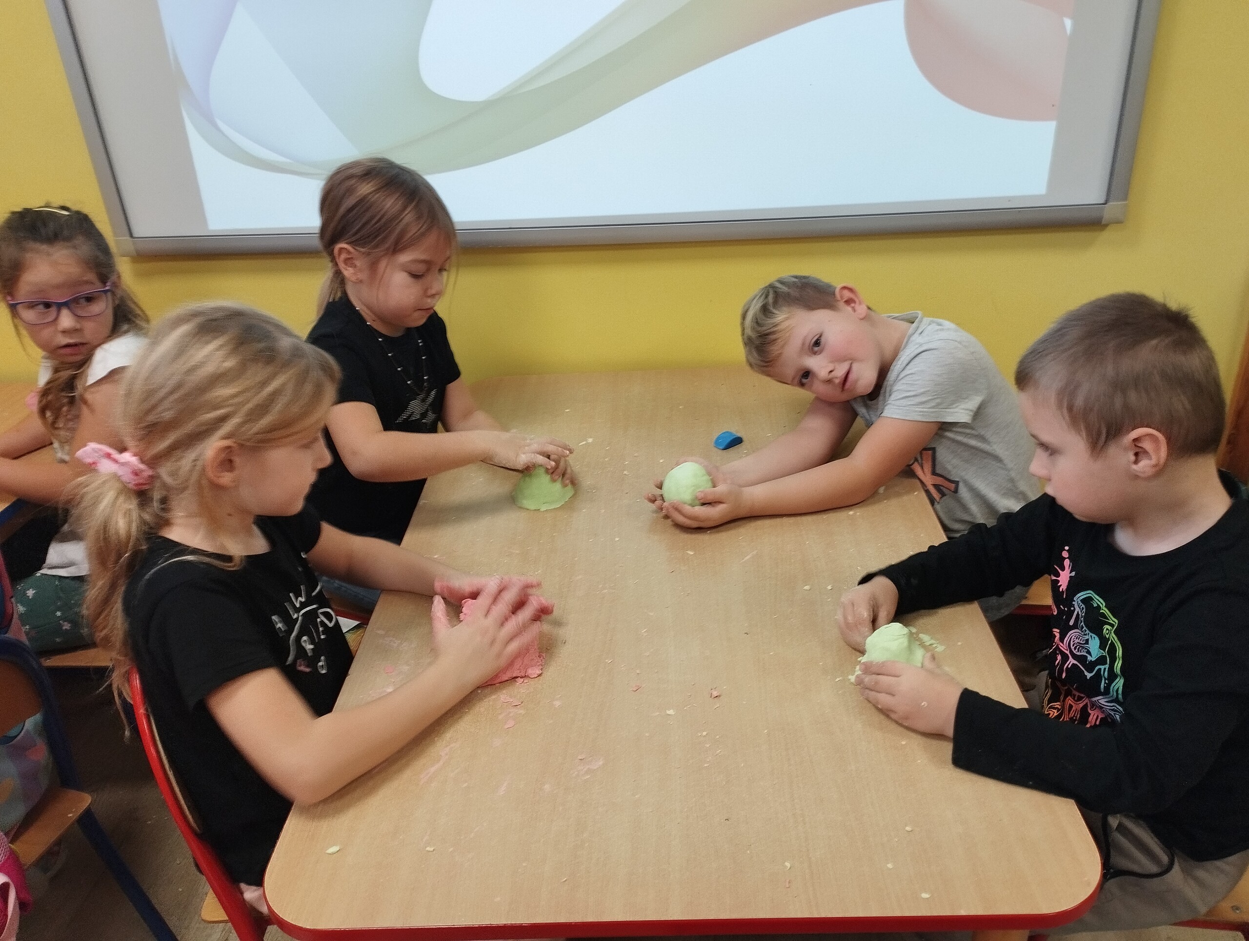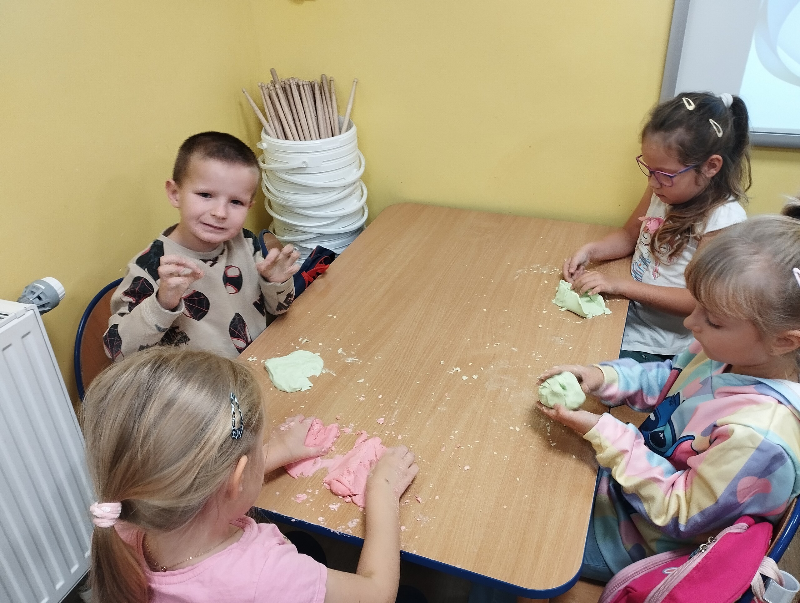Dziś w ramach ćwiczeń manualnych przygotowaliśmy kolorową, pachnącą ciastolinę. Było dużo zabawy, po zajęciach spakowaliśmy ją do domu. Oprócz sprawności manualnej znakomicie można również rozwijać wyobraźnię.