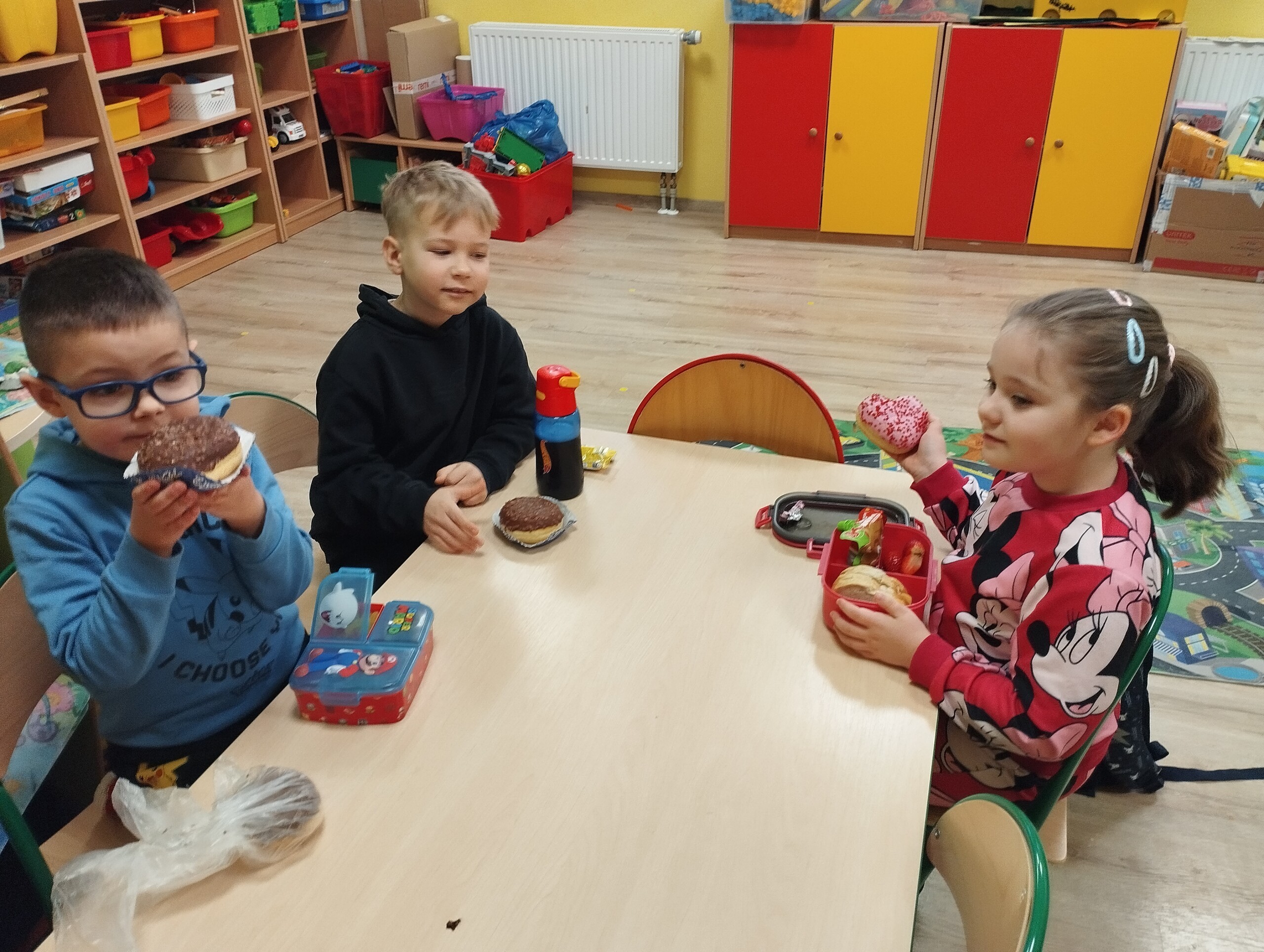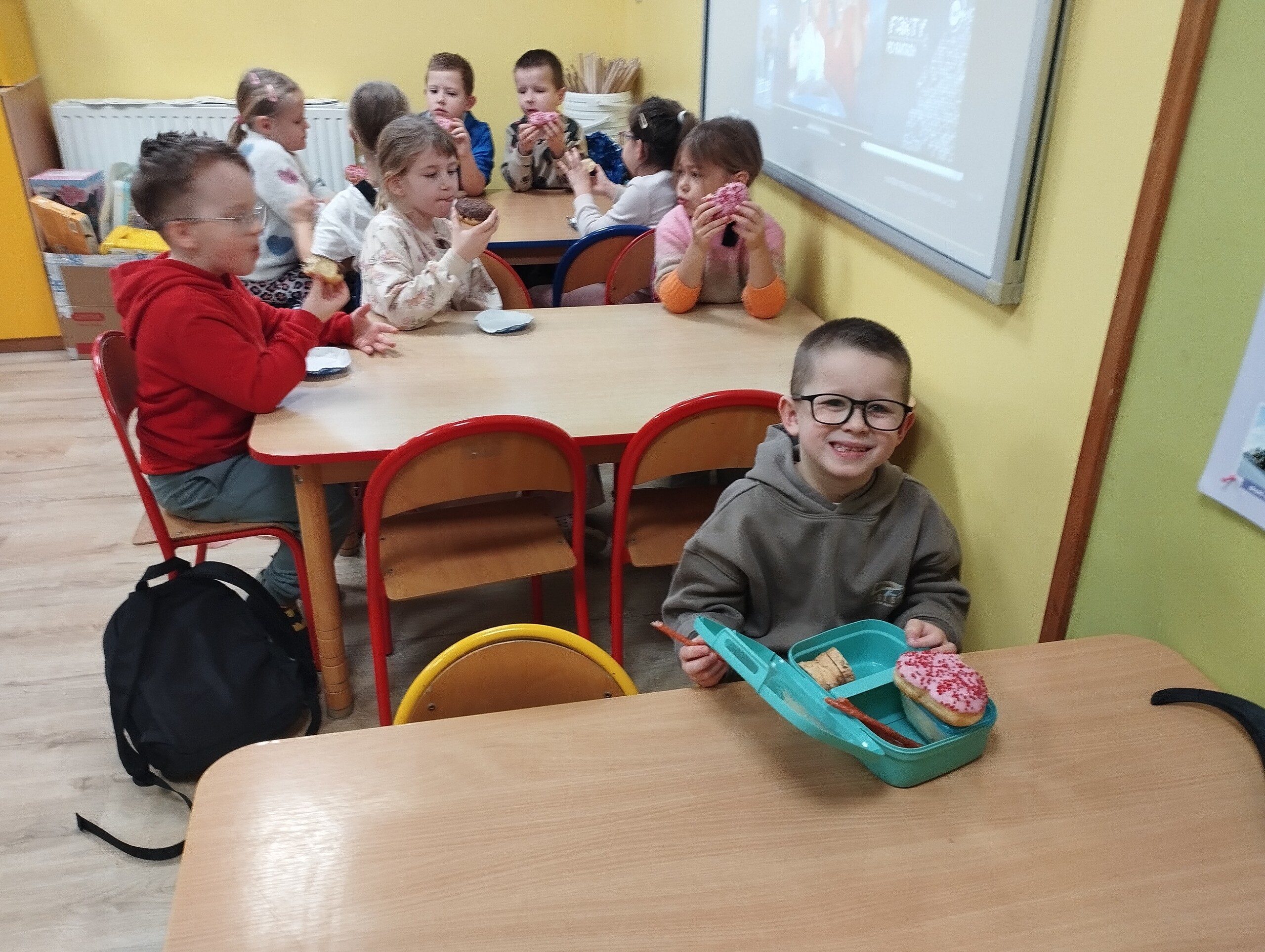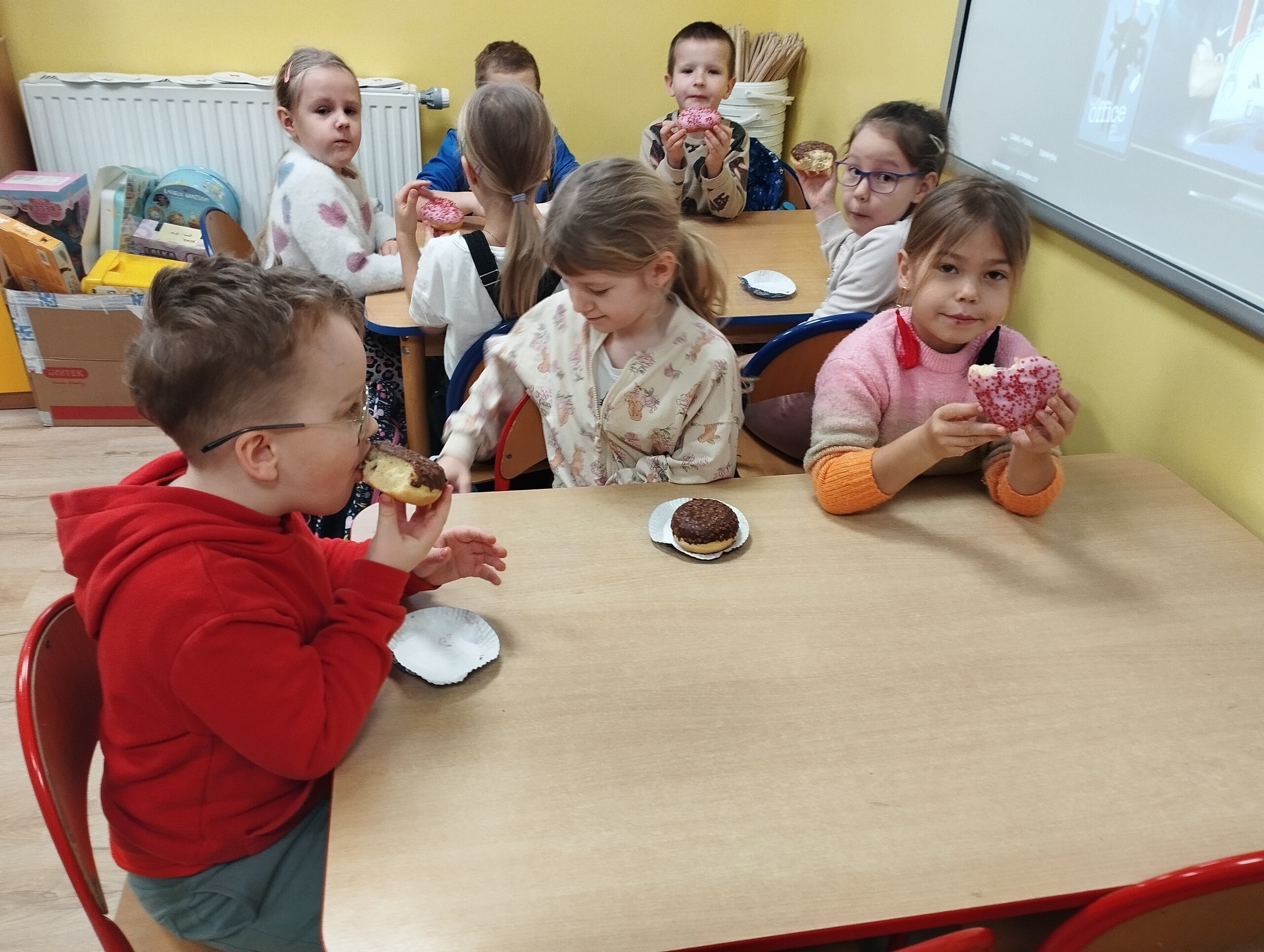 "Tłusty czwartek" rozpoczyna ostatni tydzień karnawału. Według ludowych tradycji, pączek zjedzony w tym dniu miał przynosić szczęście i zapewniać dostatek przez cały rok. Tradycja ta przetrwała do dziś - wielu Polaków stara się zjeść pierwszy pączek już rano, choć dziś motywacja jest raczej symboliczna. My również poznając nasze tradycje, postanowiliśmy zjeść pączki. Wspólnie z klasami 1-3 zamówiliśmy pączki o różnych smakach. Mama Nikodema, Pani Dorota Czaja również podarowała nam cały karton pysznych pączków. Dziękujemy za ten słodki prezent.