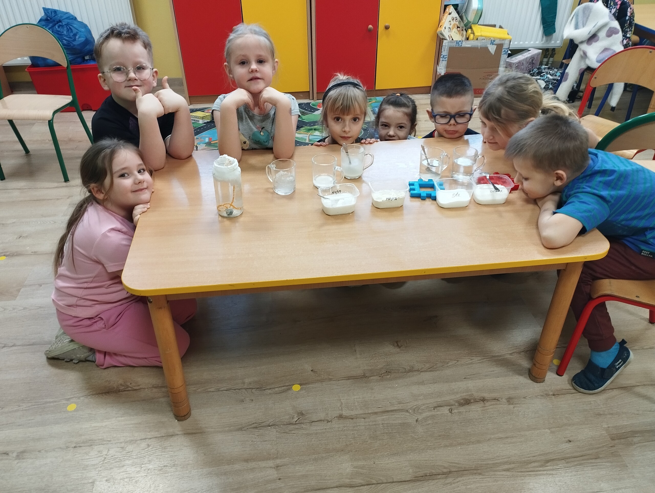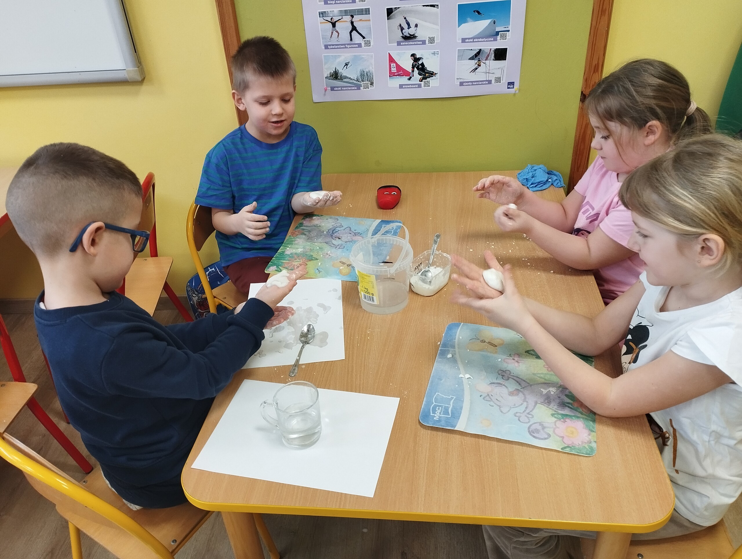 Badamy właściwości fizyczne wody. Zamrażamy, topimy śnieg, sprawdzamy rozpuszczalność soli, cukru, mąki i mąki ziemniaczanej w wodzie. Wszyscy chętnie bawili się mieszaniną wody i mąki ziemniaczanej.