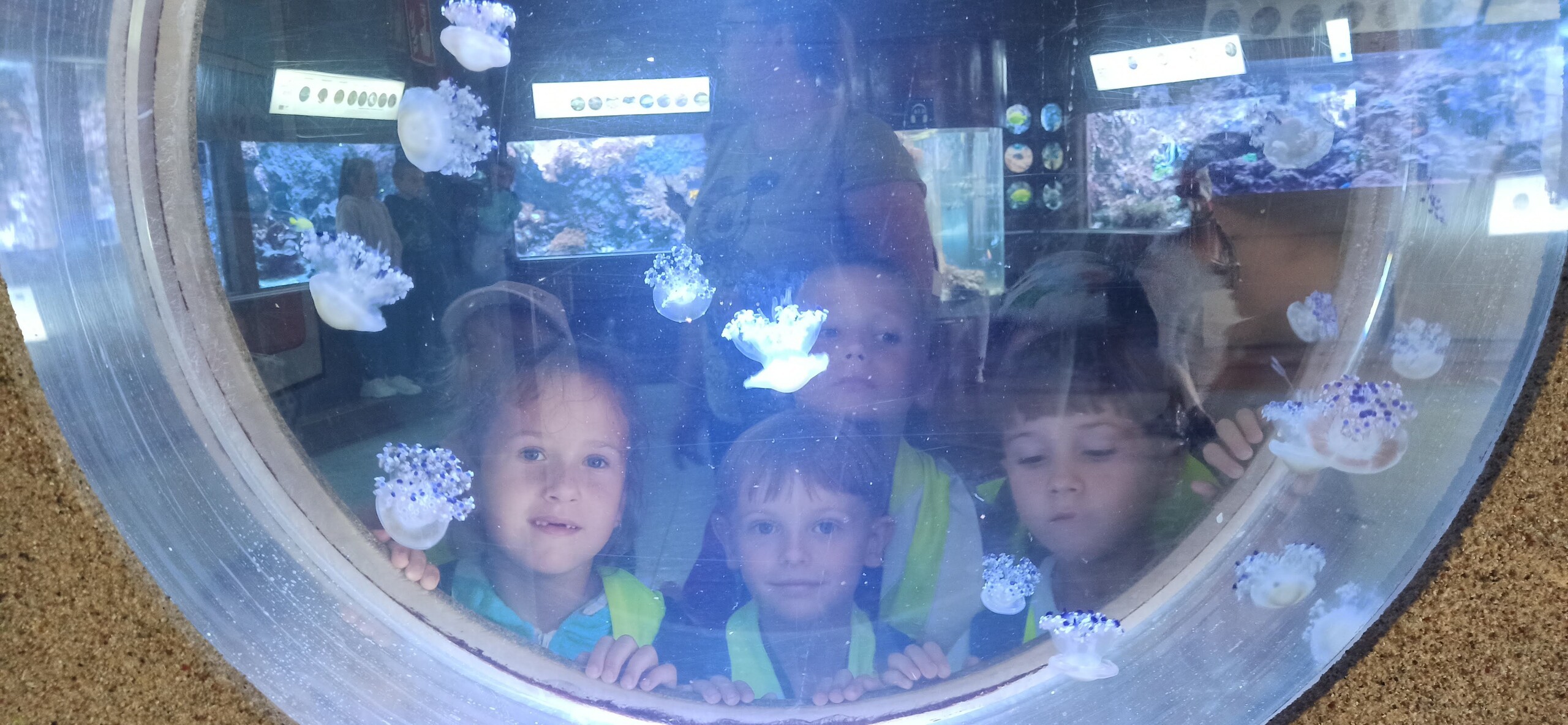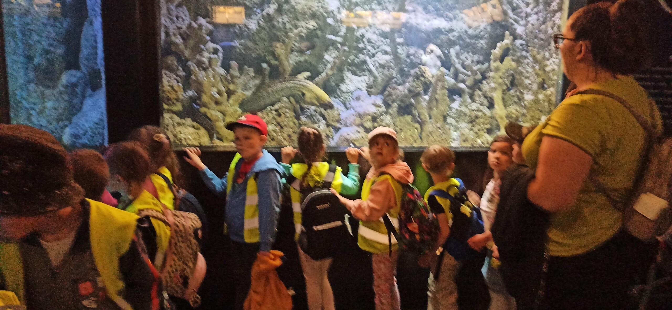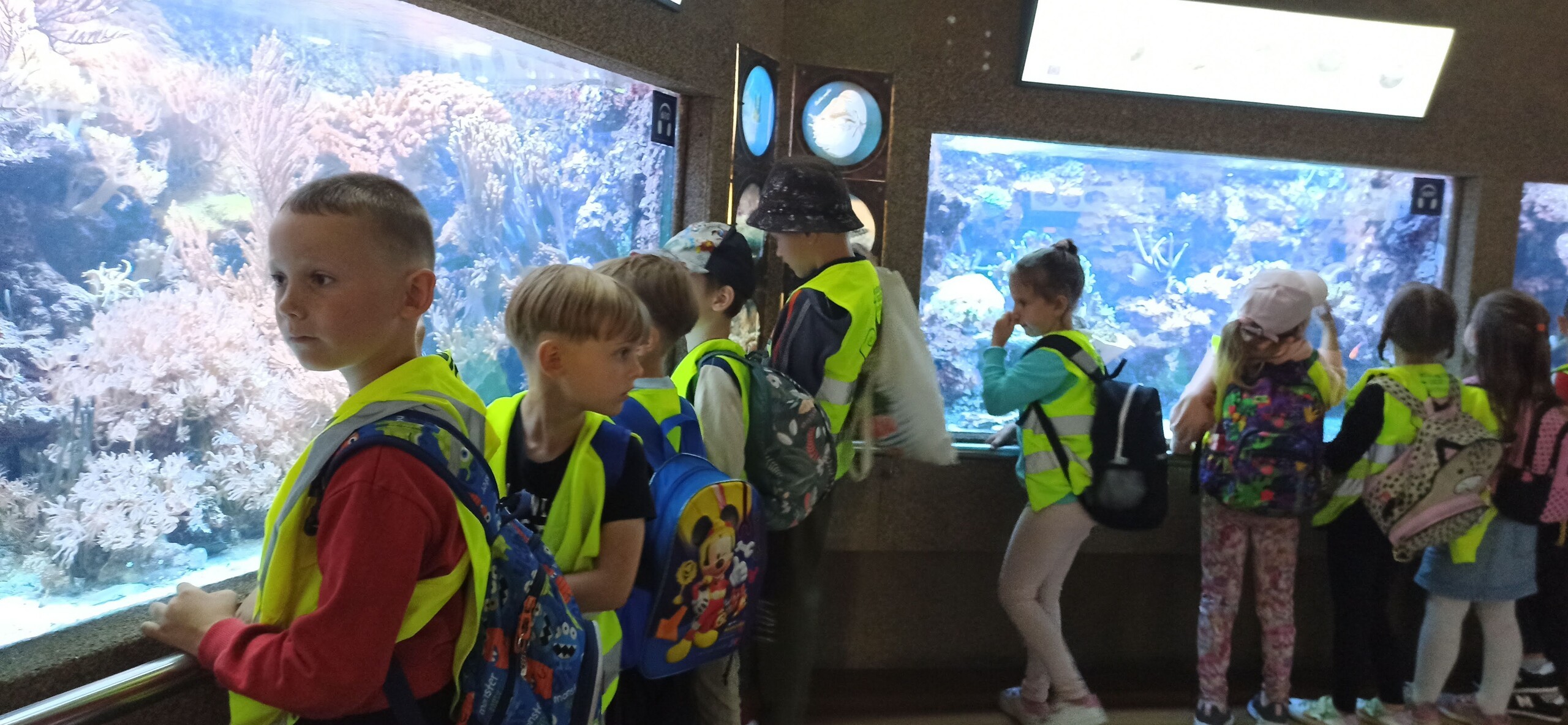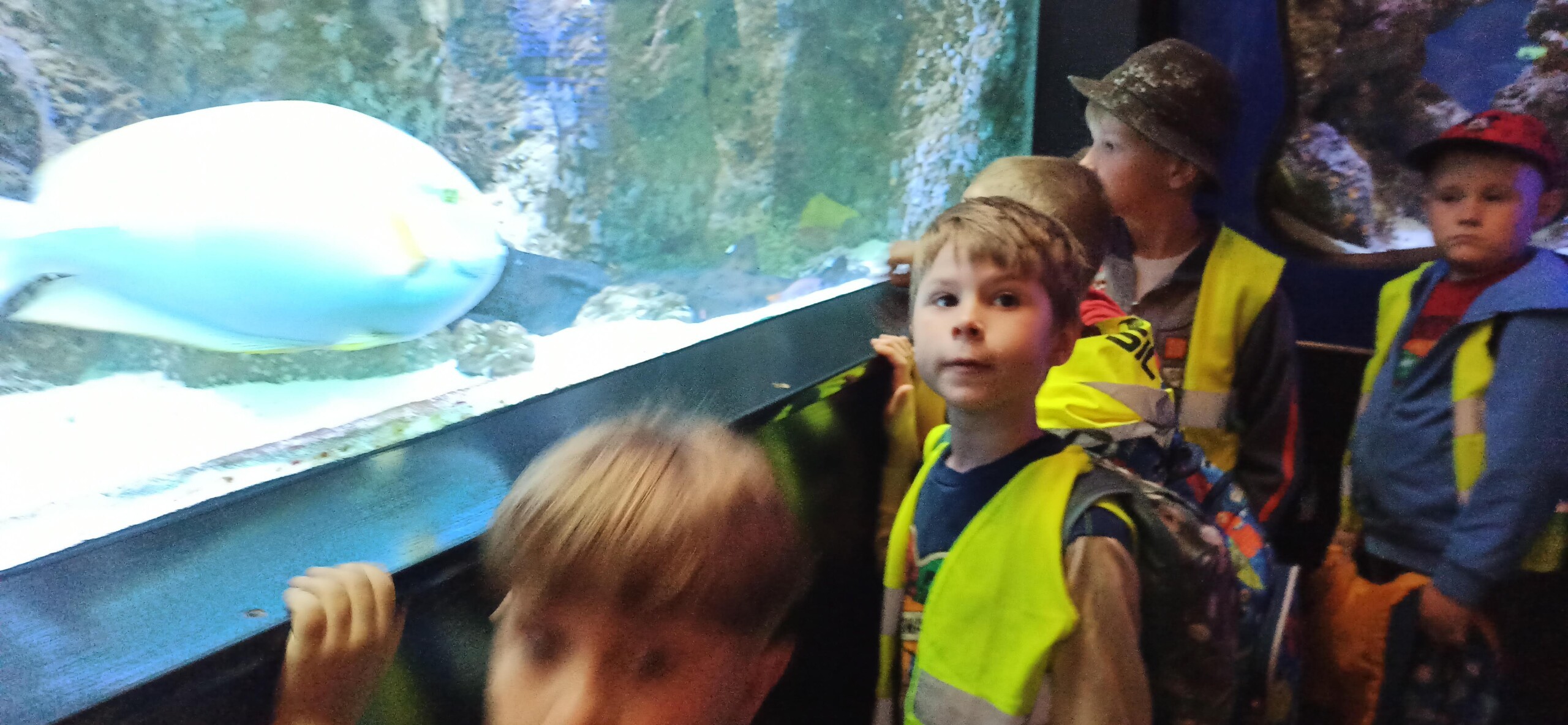 Wybraliśmy się do Akwarium Gdyńskiego. Oglądaliśmy różne gatunki ryb i zwierząt wodnych, od tych mieszkających w naszych stawach i jeziorach, do tych bardzo egzotycznych. Dzieci zachwycały się rekinami, płaszczkami, błazenkami, murenami, węgorzem elektrycznym, anakondą i wieloma innymi. Uczestniczyliśmy też w zajęciach edukacyjnych o mieszkańcach rafy koralowej. Na nabrzeżu mogliśmy obserwować cumowanie statku pirackiego oraz żaglowiec Dar Pomorza i okręt wojenny Błyskawica.