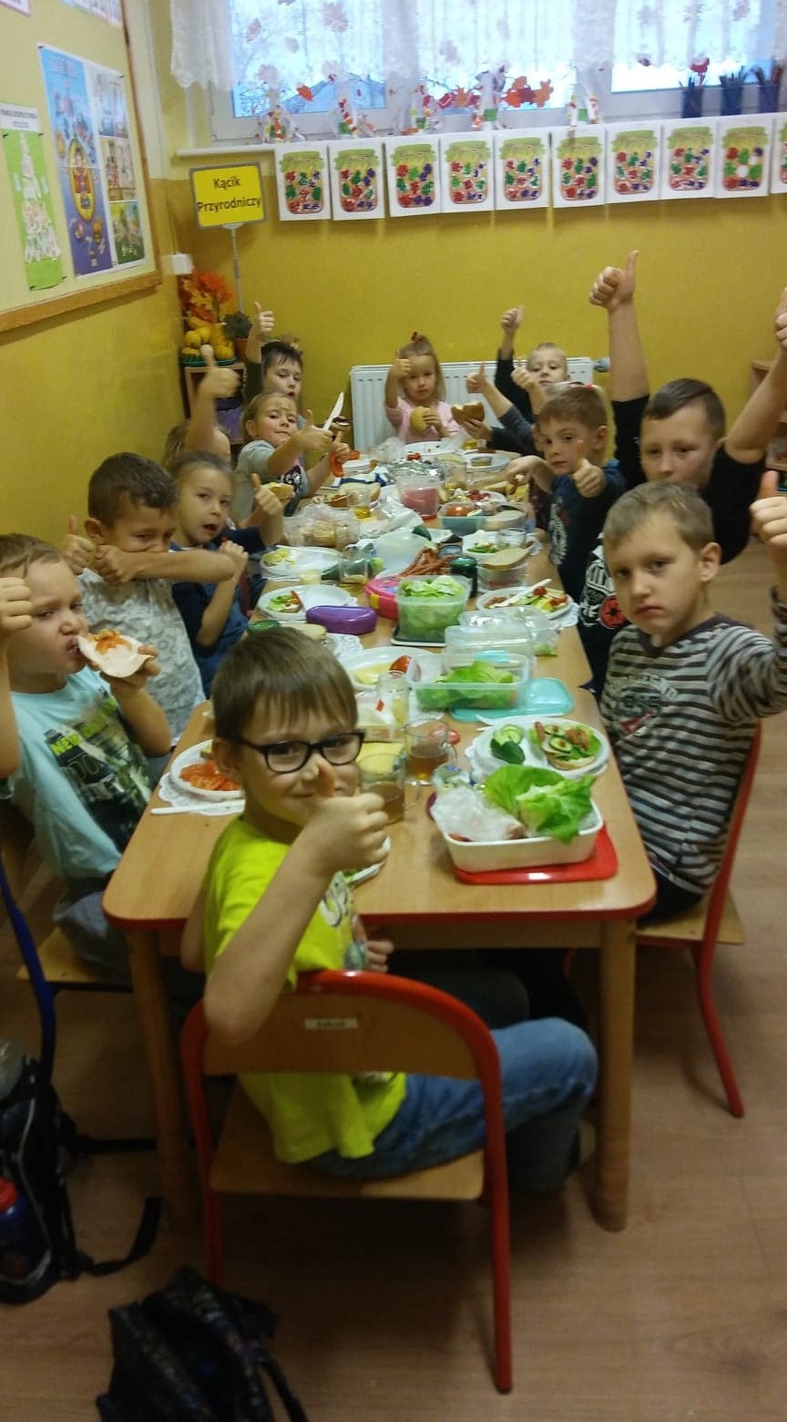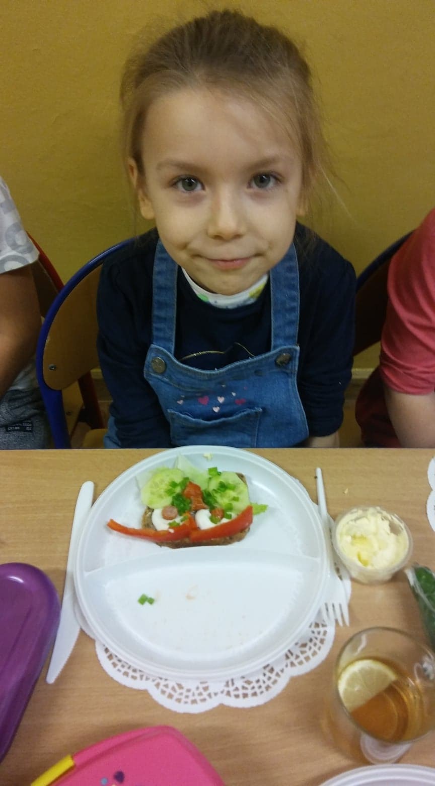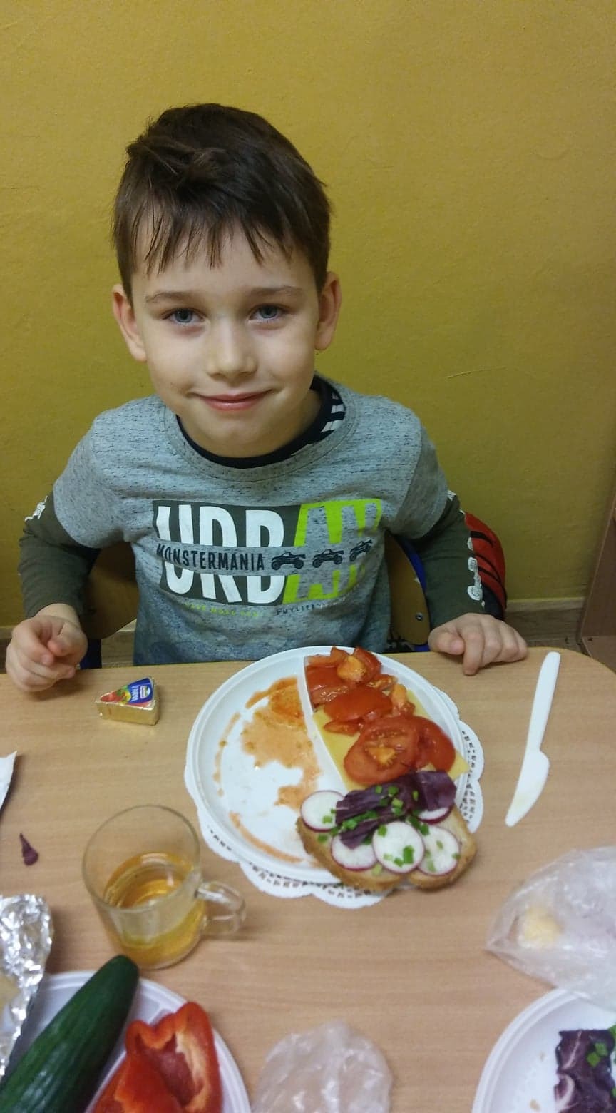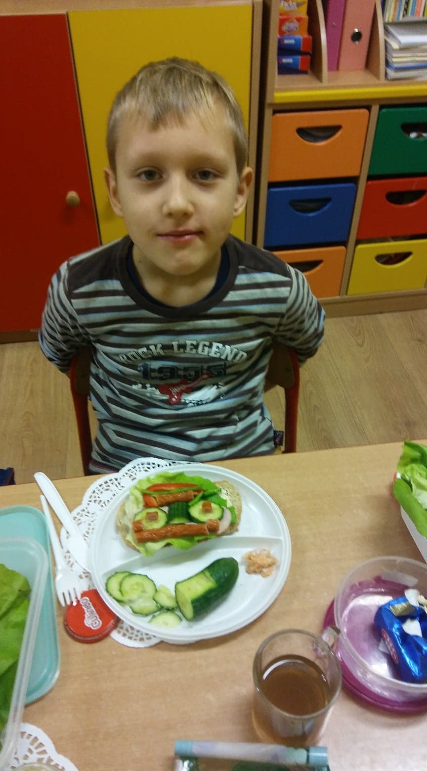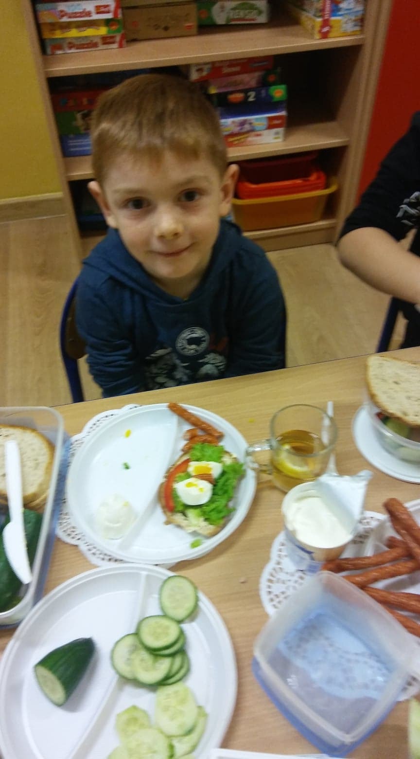Sześciolatki z oddziału przedszkolnego w Garczegorzu doskonale wiedzą, że warzywa są zdrowe, mają mnóstwo witamin i potrzebnych składników odżywczych. Dlatego tak chętnie przygotowały zdrowe i kolorowe śniadanie. Dzieci smarowały pieczywo masełkiem i układały na nich produkty, które przyniosły do szkoły (ser, wędlinę, pomidor, ogórek...). Do picia była herbatka z cytryną. Z wielkim apetytem zjadały swoje kanapeczki.