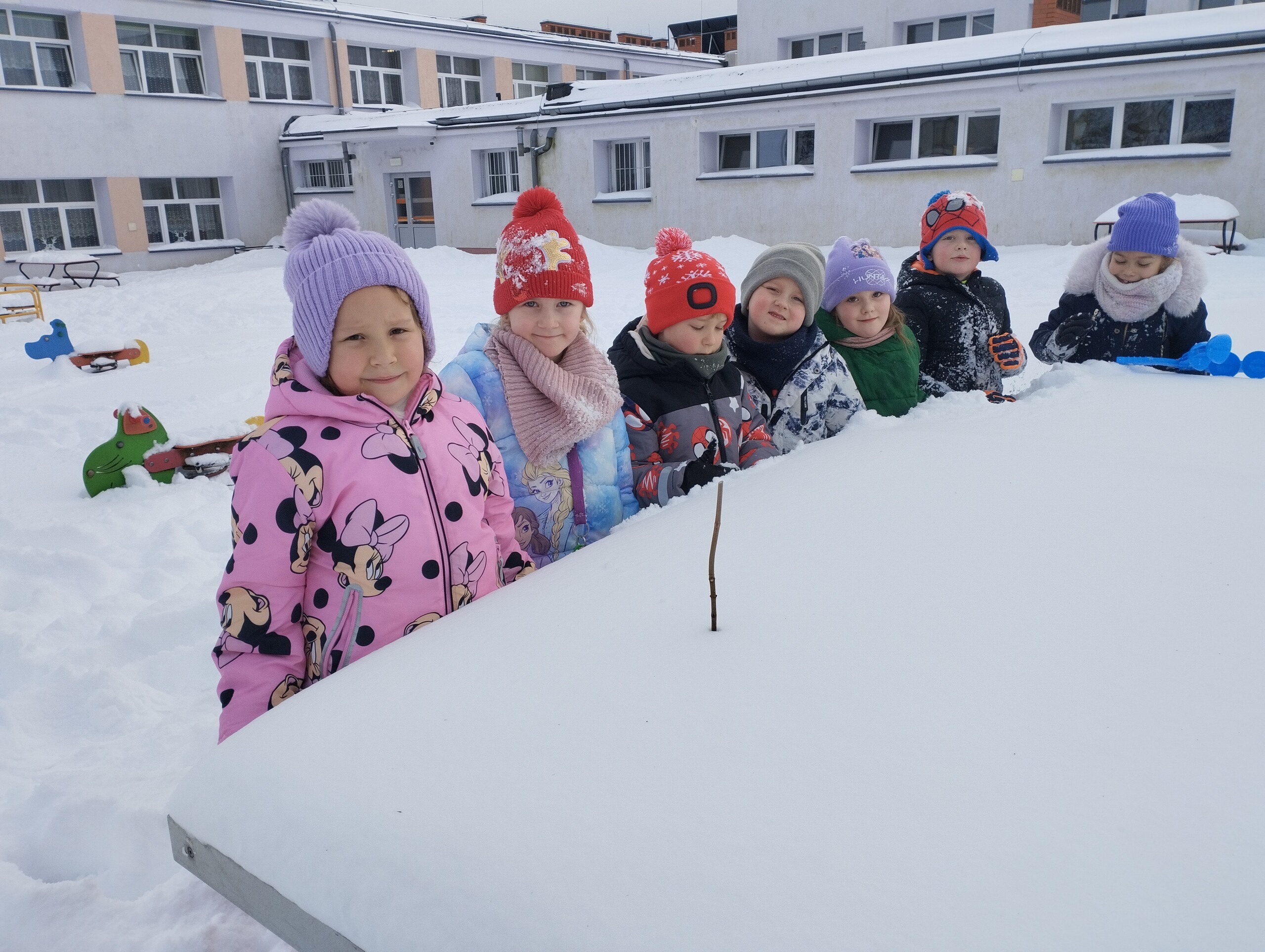 Tegoroczna zima zaskoczyła nas dużą ilością śniegu. Wszyscy bardzo chętnie skorzystali z możliwości zabawy w białym puchu. Rzucali się śnieżkami, lepili bałwana, robili śnieżne bazy, aniołki na śniegu. Próbowaliśmy zrobić zegar słoneczny, niestety słońce nam nie dopisało.