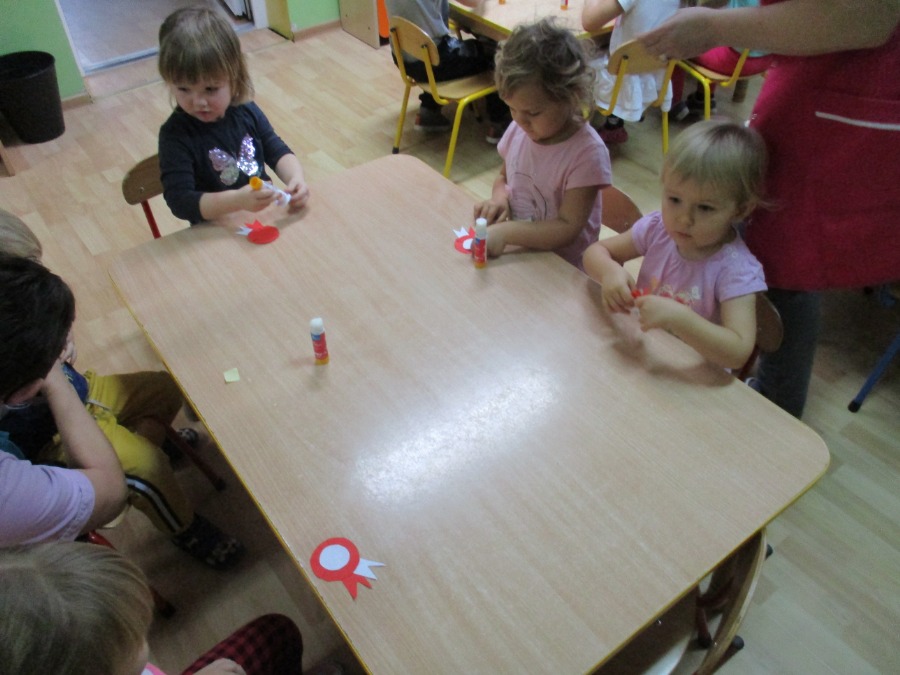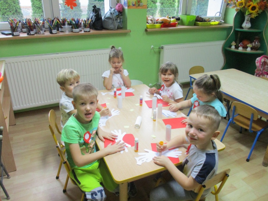 Z okazji nadchodzącego Święta Niepodległości wszystkie dzieci uroczyście przygotowały się do świętowania tego wyjątkowego dla Nas – Polaków dnia. Głównym celem dzisiejszych zajęć było kształtowanie miłości i przywiązania do kraju ojczystego, jego kultury i tradycji oraz poznanie symboli narodowych naszego kraju. Przedszkolaki wykonały prace plastyczne – symbole narodowe (Starszaki godło oraz flagę Polski, Średniaki i Maluchy kotyliony oraz godło Polski). Z przyczepionymi kotylionami dzieci, jak potrafiły, zaśpiewały hymn Polski przyłączając się w ten sposób do akcji „Szkoła do hymnu”.