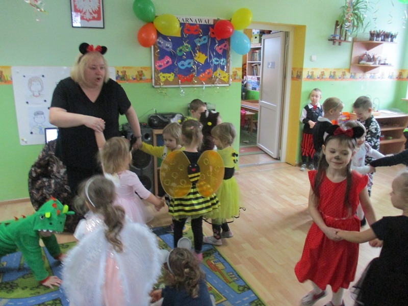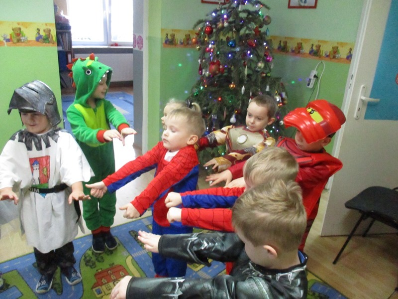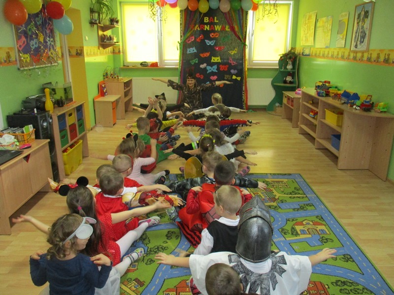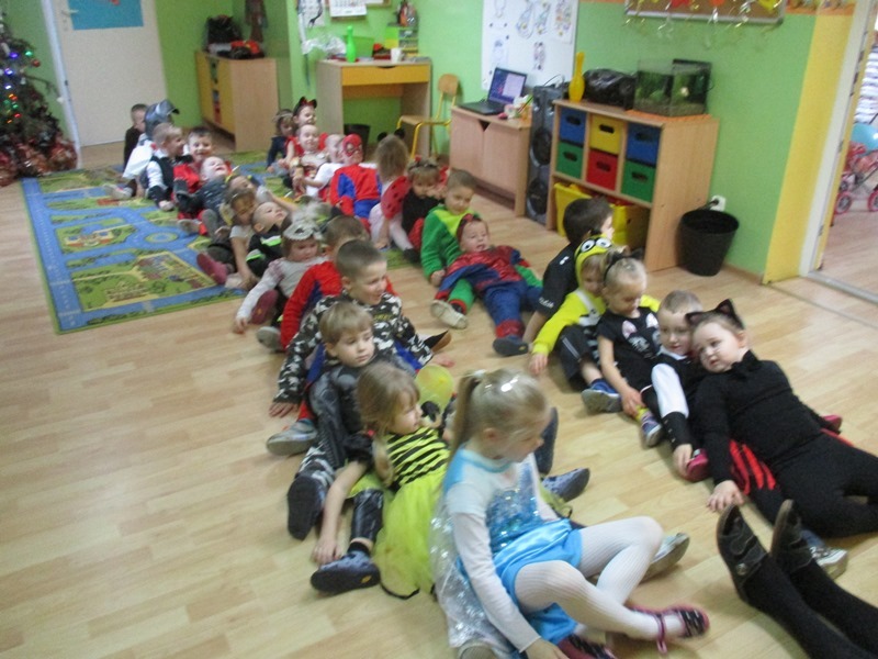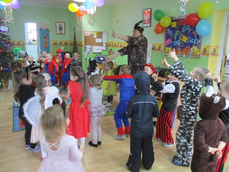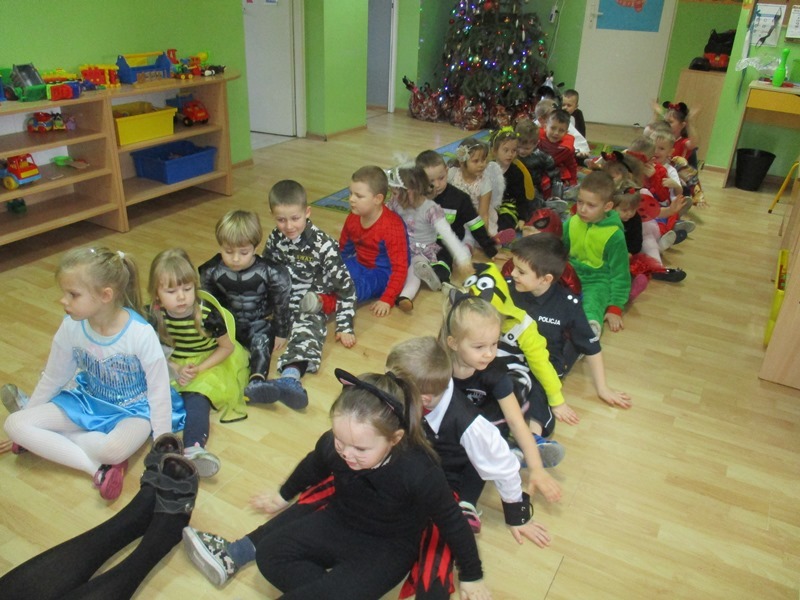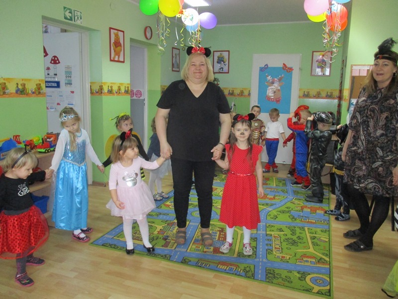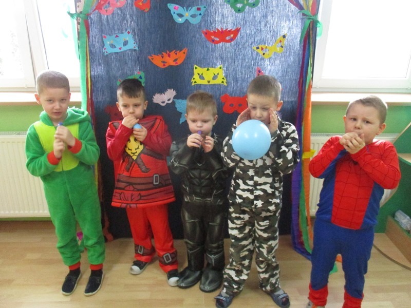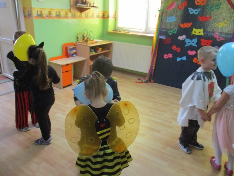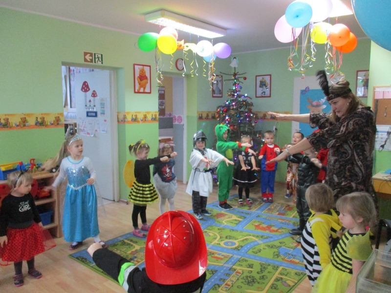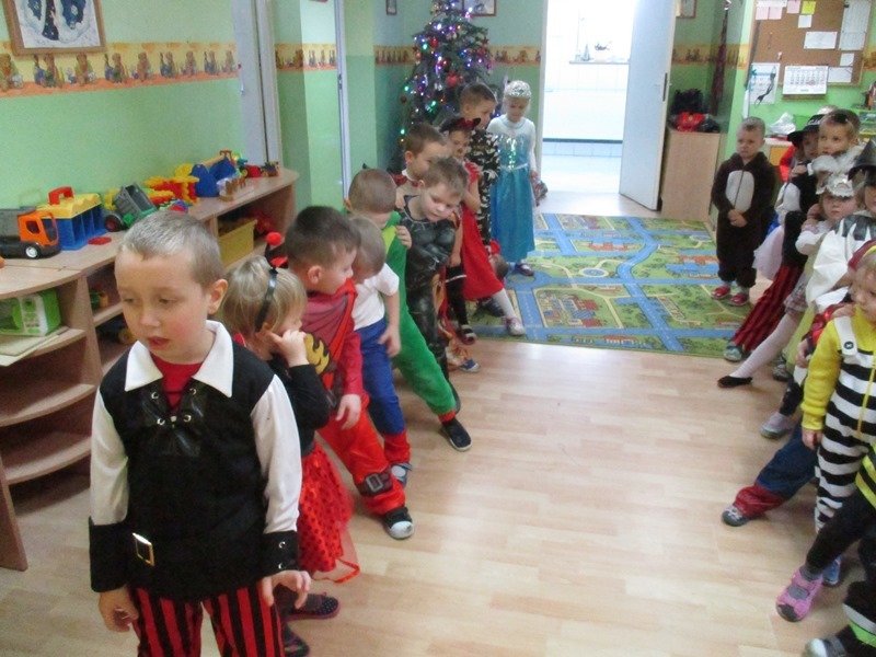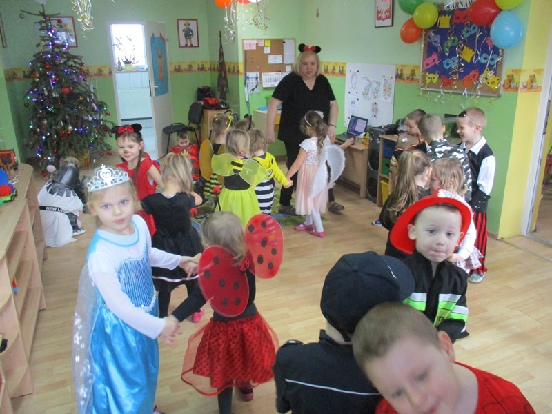 Na balu pojawiły się kotki, myszki, miś, księżniczka, rycerz, piraci, policjant, strażak, żołnierz, Spider-Many, Batmany, ludzik Lego, pszczółki, motylki, smok, Minionek oraz Iron Man. Rozpoznać dzieci było bardzo trudno! Przedszkolaki świetnie bawiły się przy rytmicznej i skocznej muzyce. Na sali, podczas pląsów, było bardzo wesoło oraz kolorowo. Uśmiech nie znikał z dziecięcych twarzy, mimo chwilowego zmęczenia. Nie zabrakło również konkursów, w których przedszkolaki chętnie uczestniczyły, dopingując się nawzajem. Do przedszkola zawitał długo oczekiwany gość. Mikołaj zjawił się z worem pełnym prezentów. Dzieci bardzo ucieszyły się z tego spotkania. Na zakończenie balu na przedszkolaki czekał słodki poczęstunek.