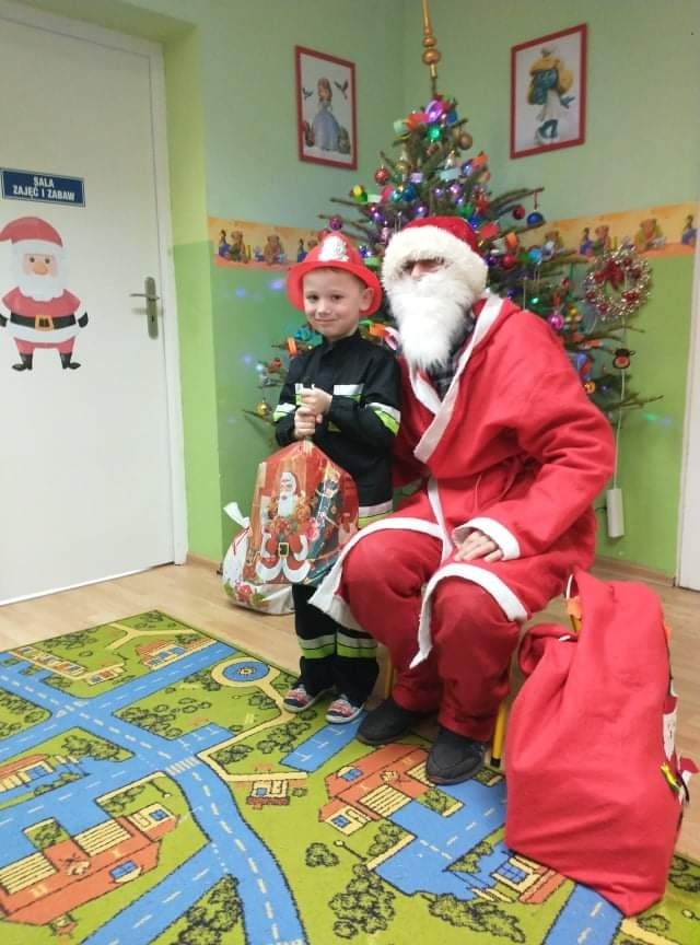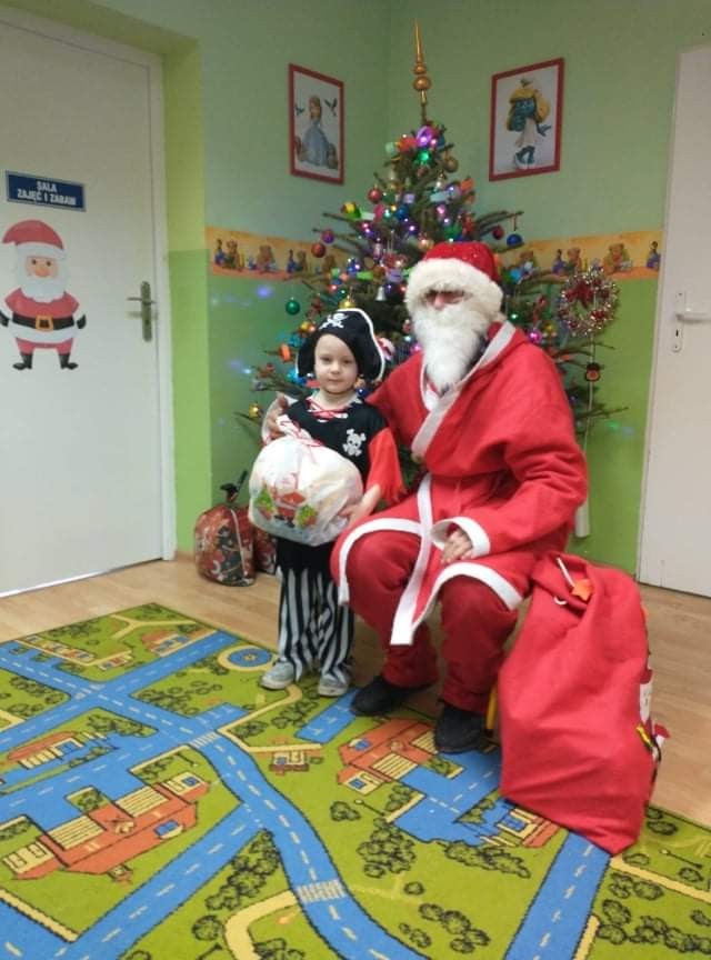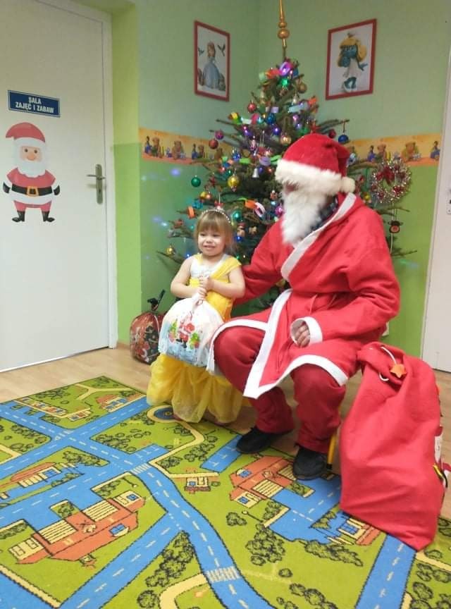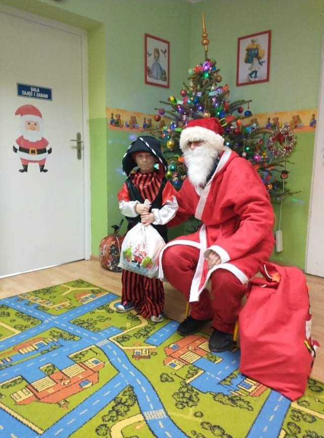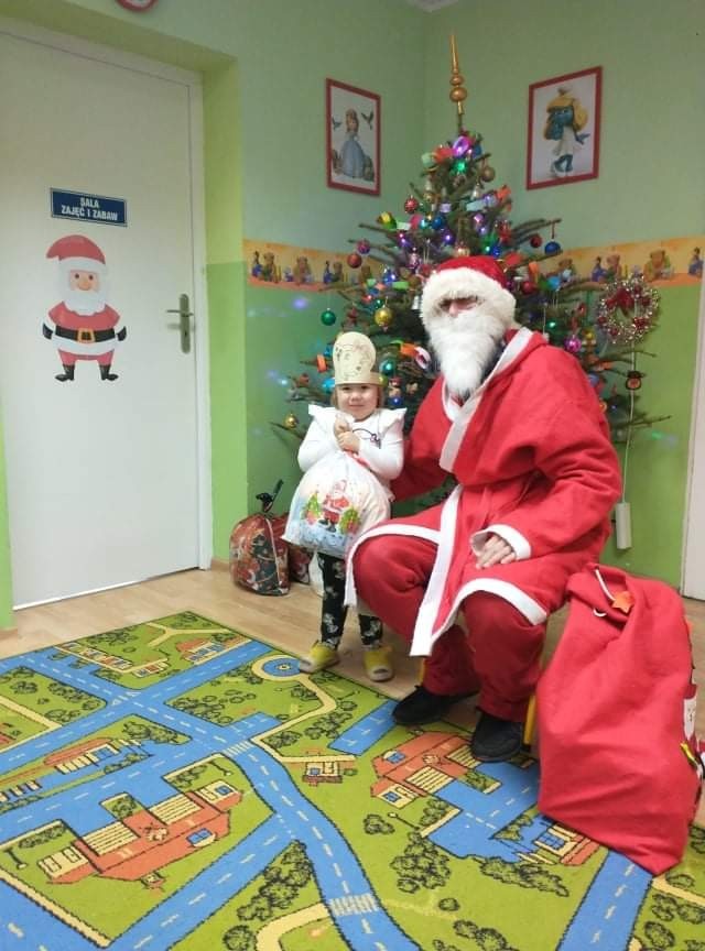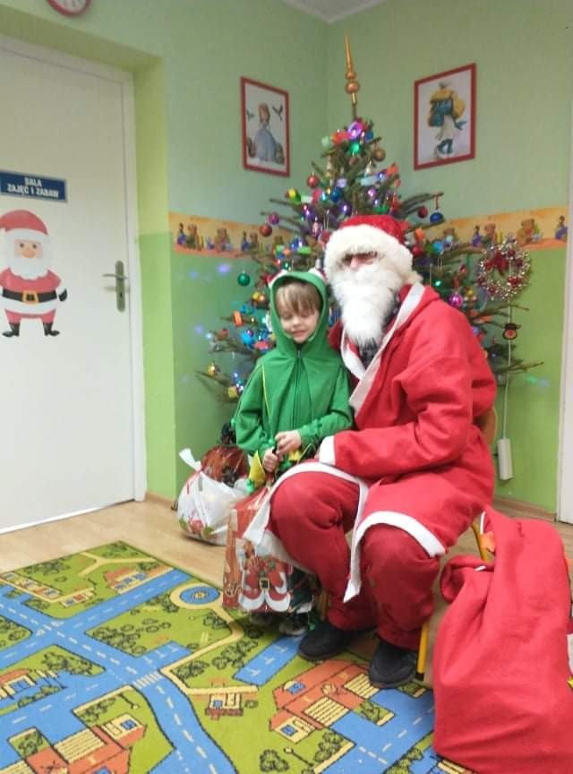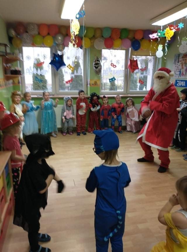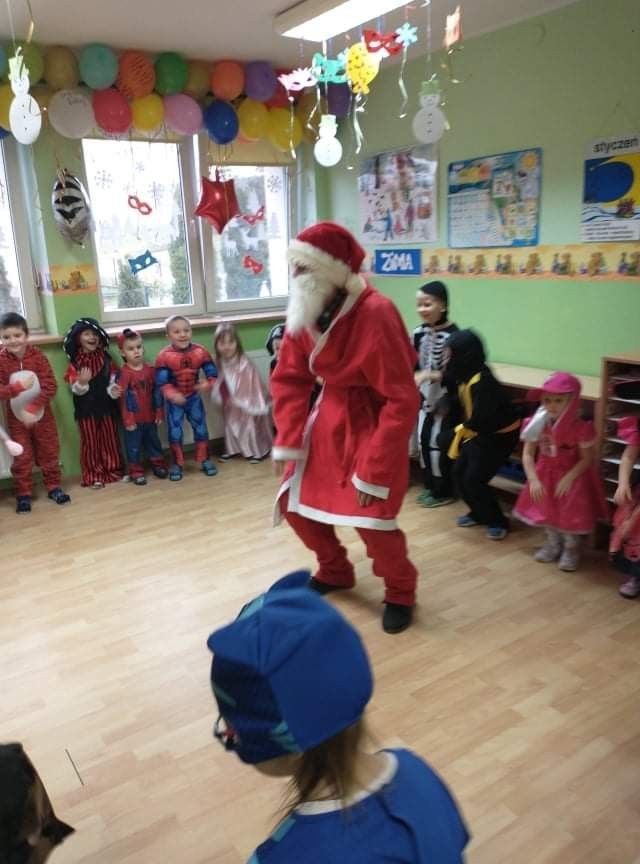 Odwiedził nas specjalny gość - Święty Mikołaj, który obdarował przedszkolaków prezentami. Dzieci zaprosiły Mikołaja do wspólnej zabawy. Na sali podczas pląsów robiło się kolorowo, wszyscy bawili się wesoło, uśmiech nie znikał z twarzy najmłodszych mimo chwilowego zmęczenia. W czasie przerwy w tańcach dzieci posiliły się słodkościami i owocowym soczkiem.