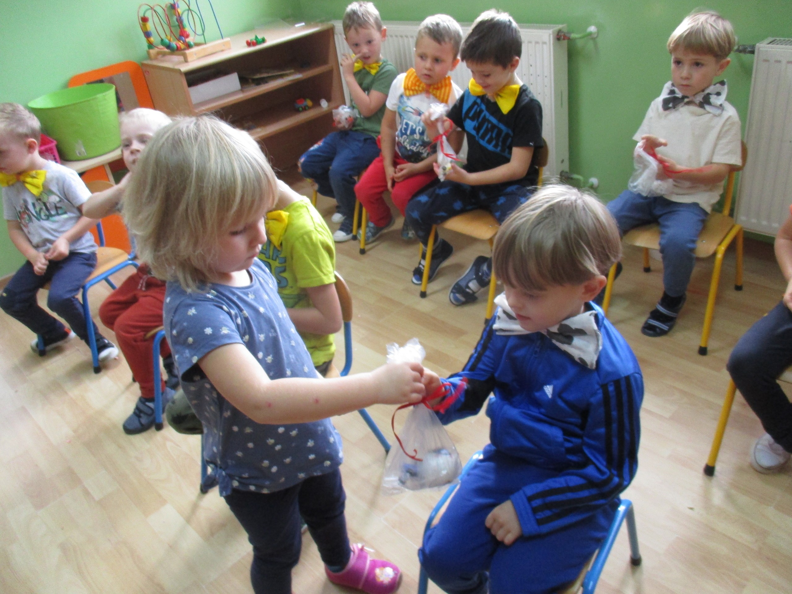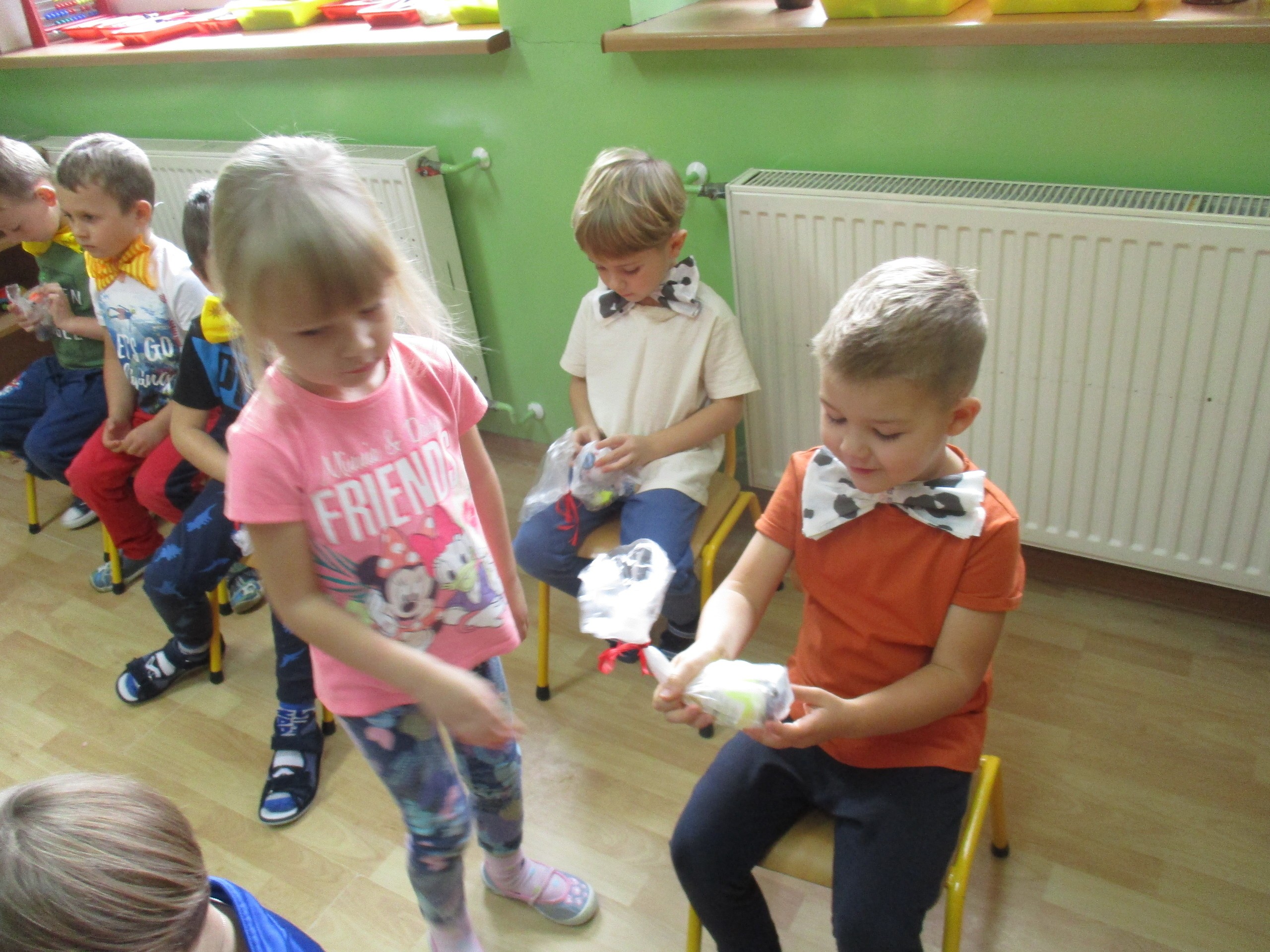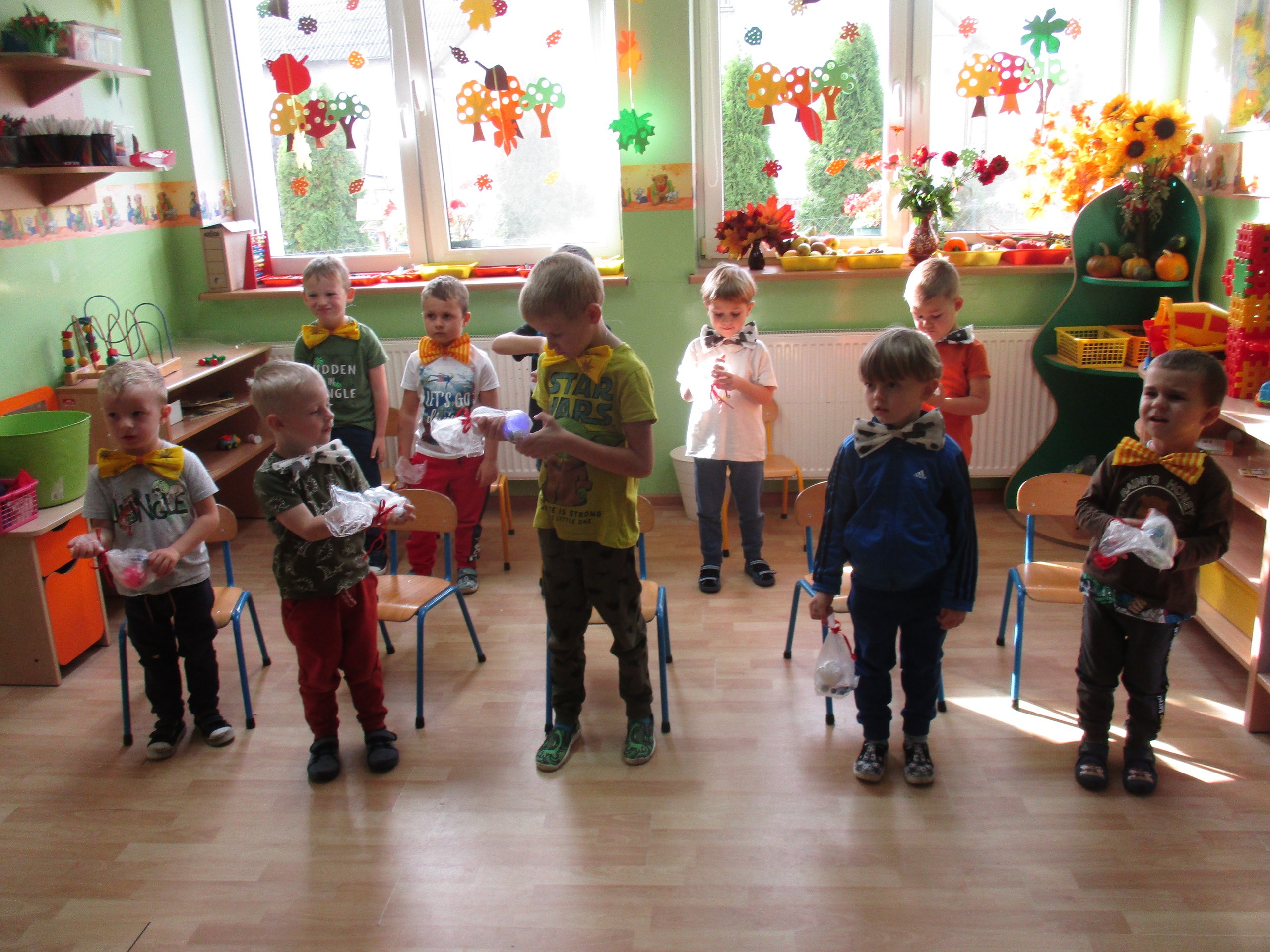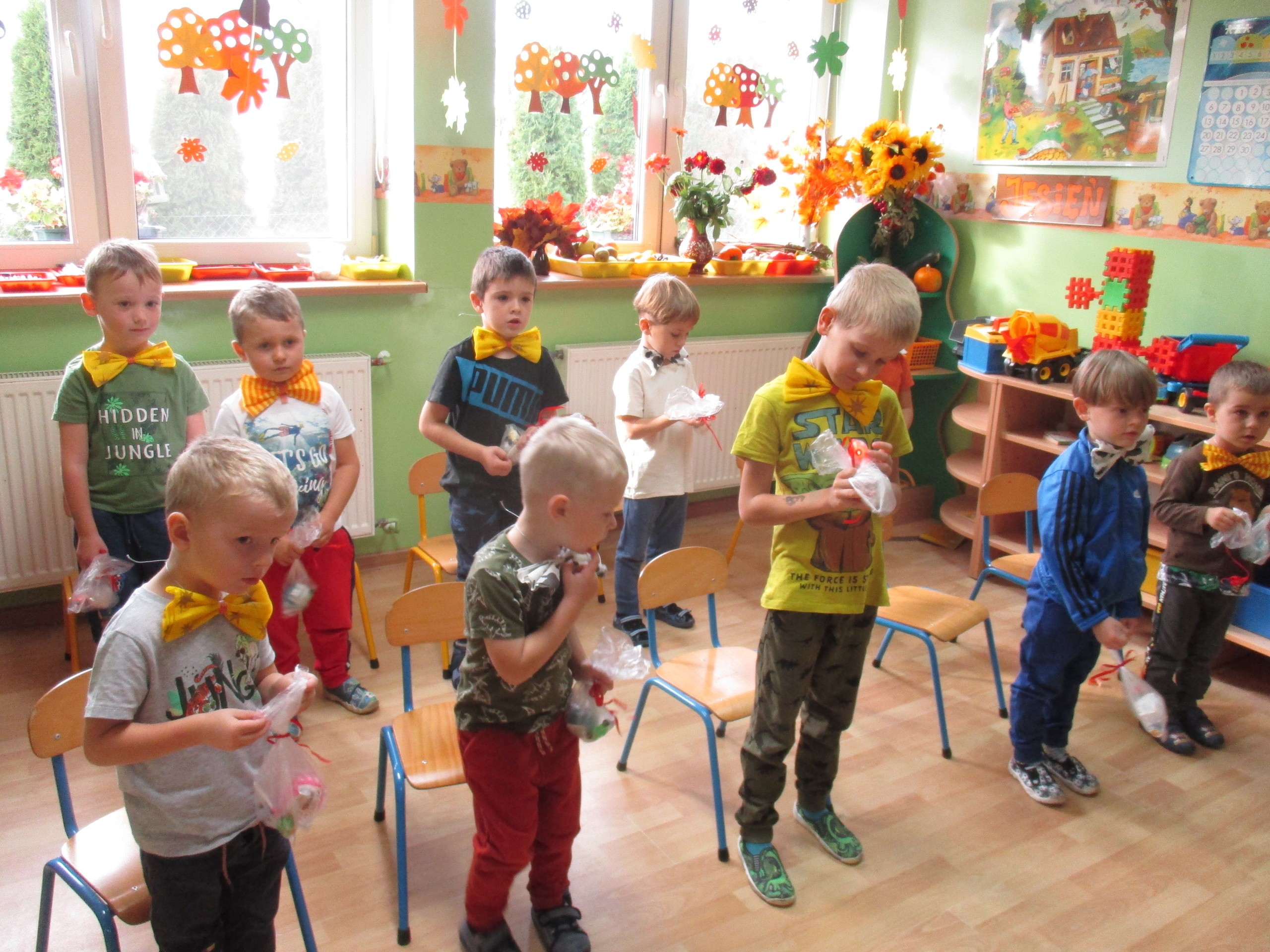 30 września chłopcy z naszego przedszkola udowodnili, że są prawdziwymi dżentelmenami. Na pewno mają bystre oko rzucając celnie do kosza, są wysportowani robiąc przysiady, potrafią się elegancko ubrać, znają tytuły bajek oraz fantastycznie potrafią tańczyć. Dlatego każdy dżentelmen otrzymał muszkę oraz upominki, które wręczyły chłopcom nasze dziewczynki. Słodką niespodziankę dla wszystkich dzieci przyniósł Kajtuś. Dziękujemy bardzo. Wszystkim chłopcom życzymy dużo uśmiechu, radości i wspaniałych przyjaciół.