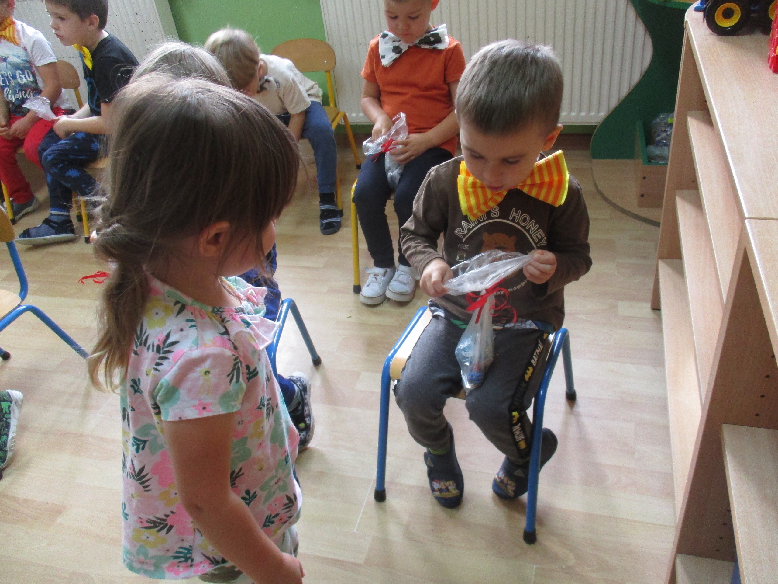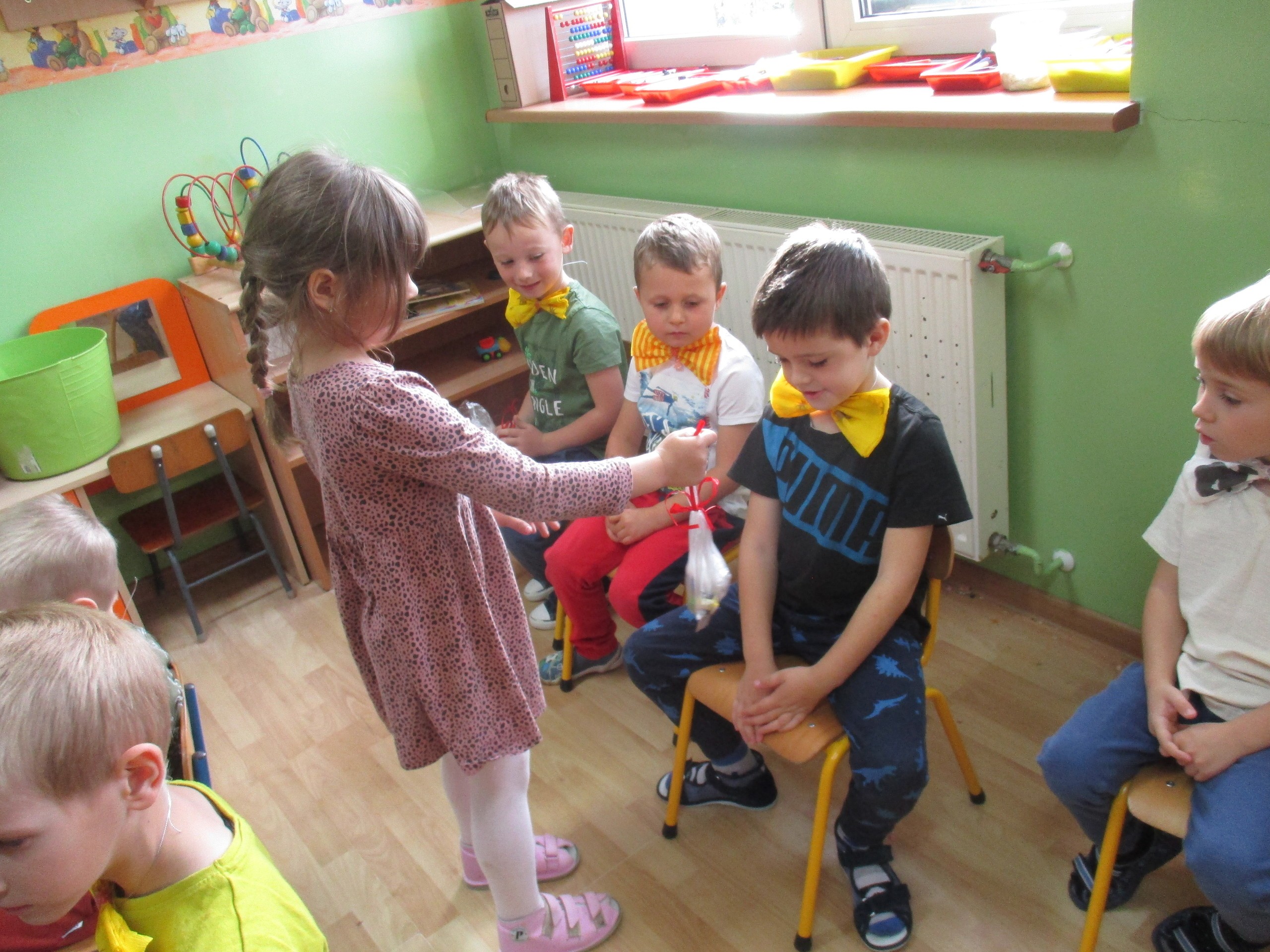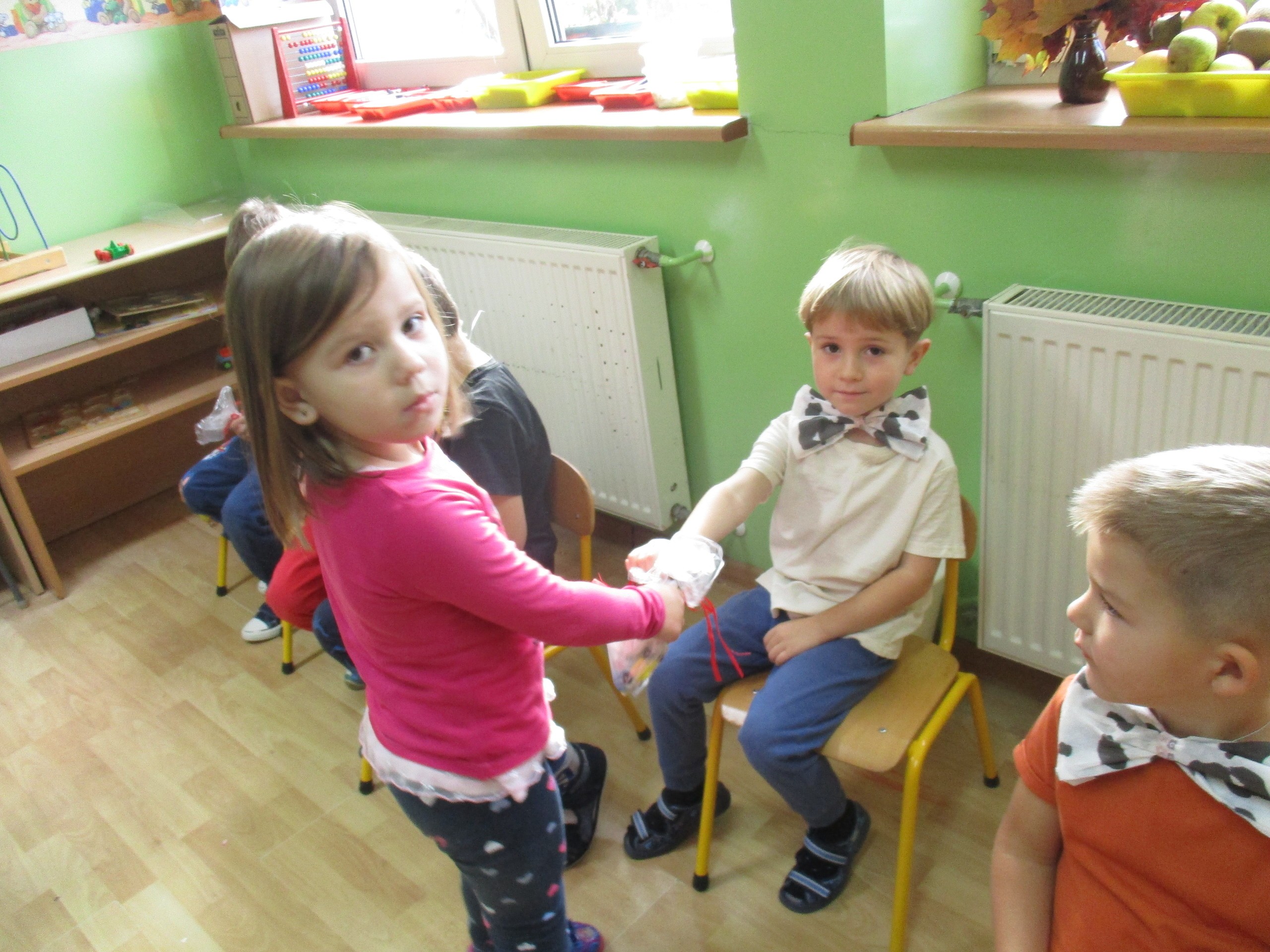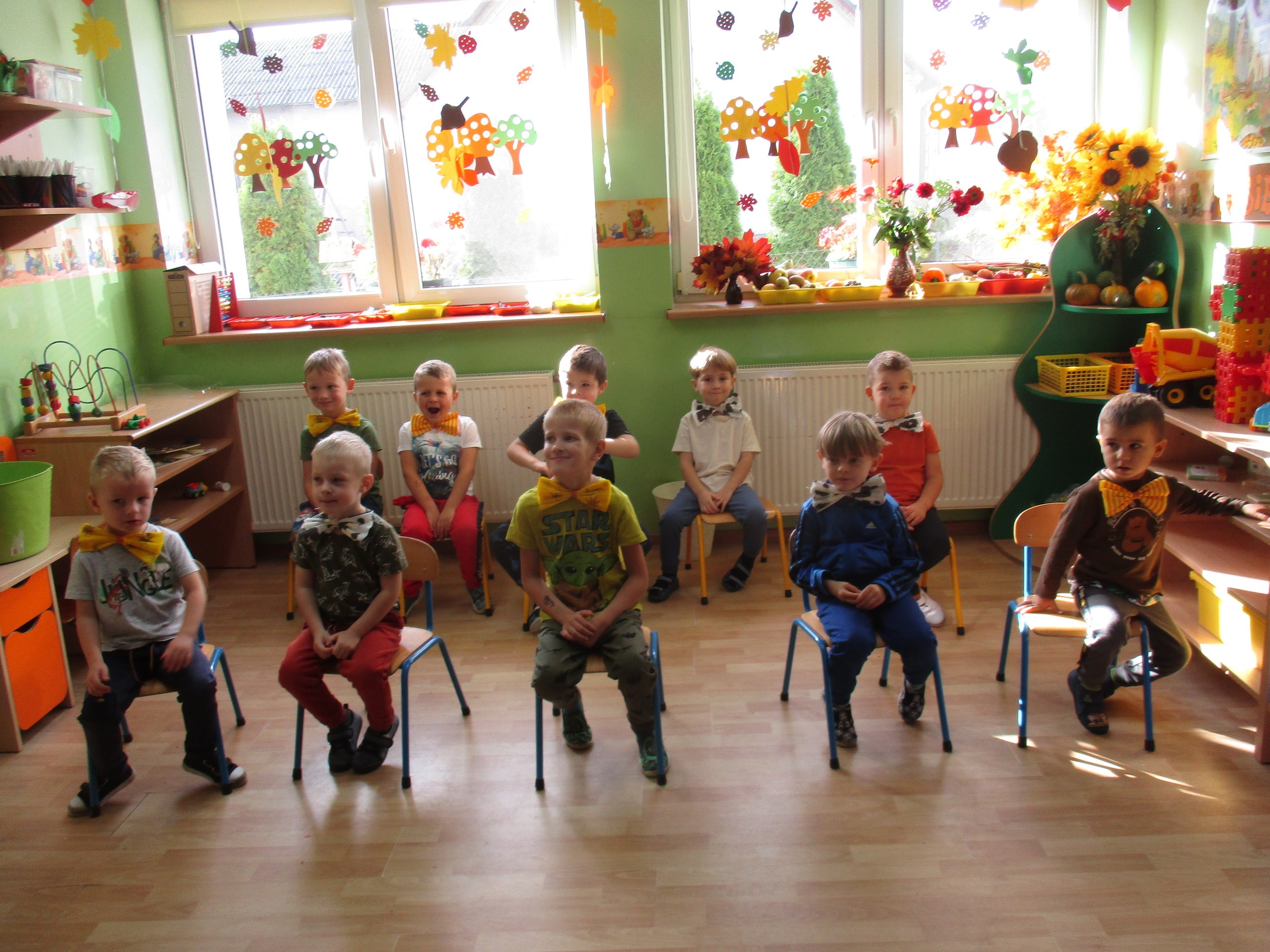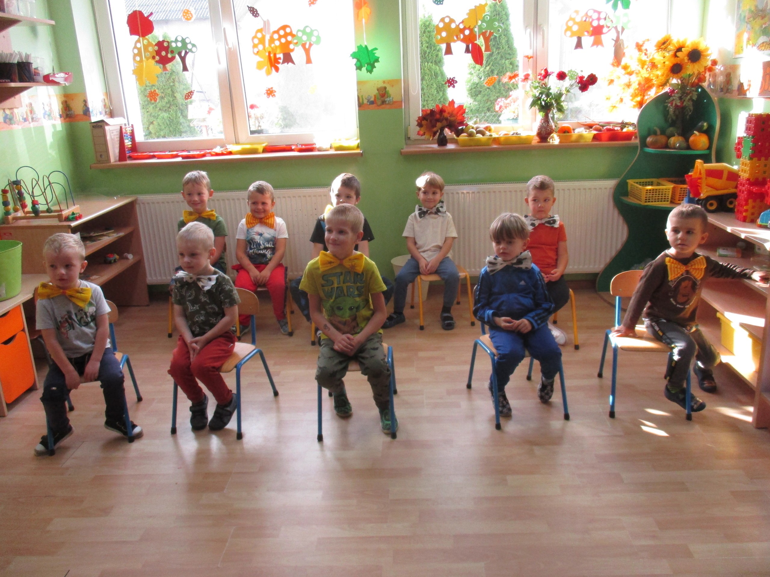 30 września chłopcy z naszego przedszkola udowodnili, że są prawdziwymi dżentelmenami. Na pewno mają bystre oko rzucając celnie do kosza, są wysportowani robiąc przysiady, potrafią się elegancko ubrać, znają tytuły bajek oraz fantastycznie potrafią tańczyć. Dlatego każdy dżentelmen otrzymał muszkę oraz upominki, które wręczyły chłopcom nasze dziewczynki. Słodką niespodziankę dla wszystkich dzieci przyniósł Kajtuś. Dziękujemy bardzo. Wszystkim chłopcom życzymy dużo uśmiechu, radości i wspaniałych przyjaciół.