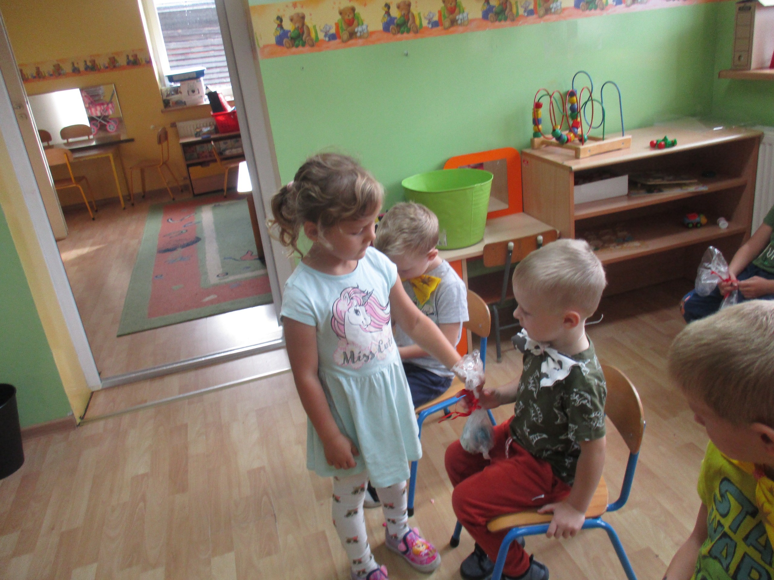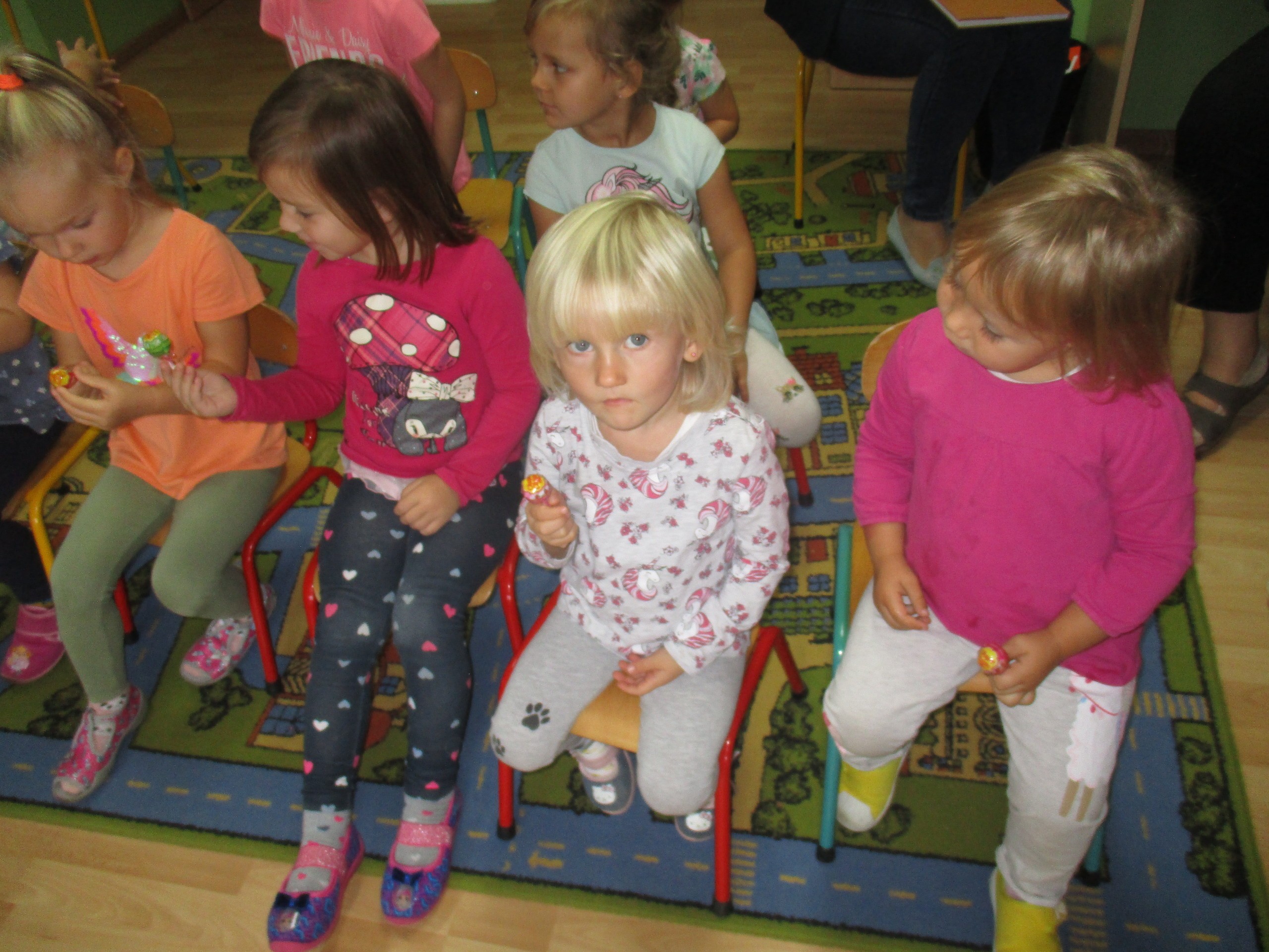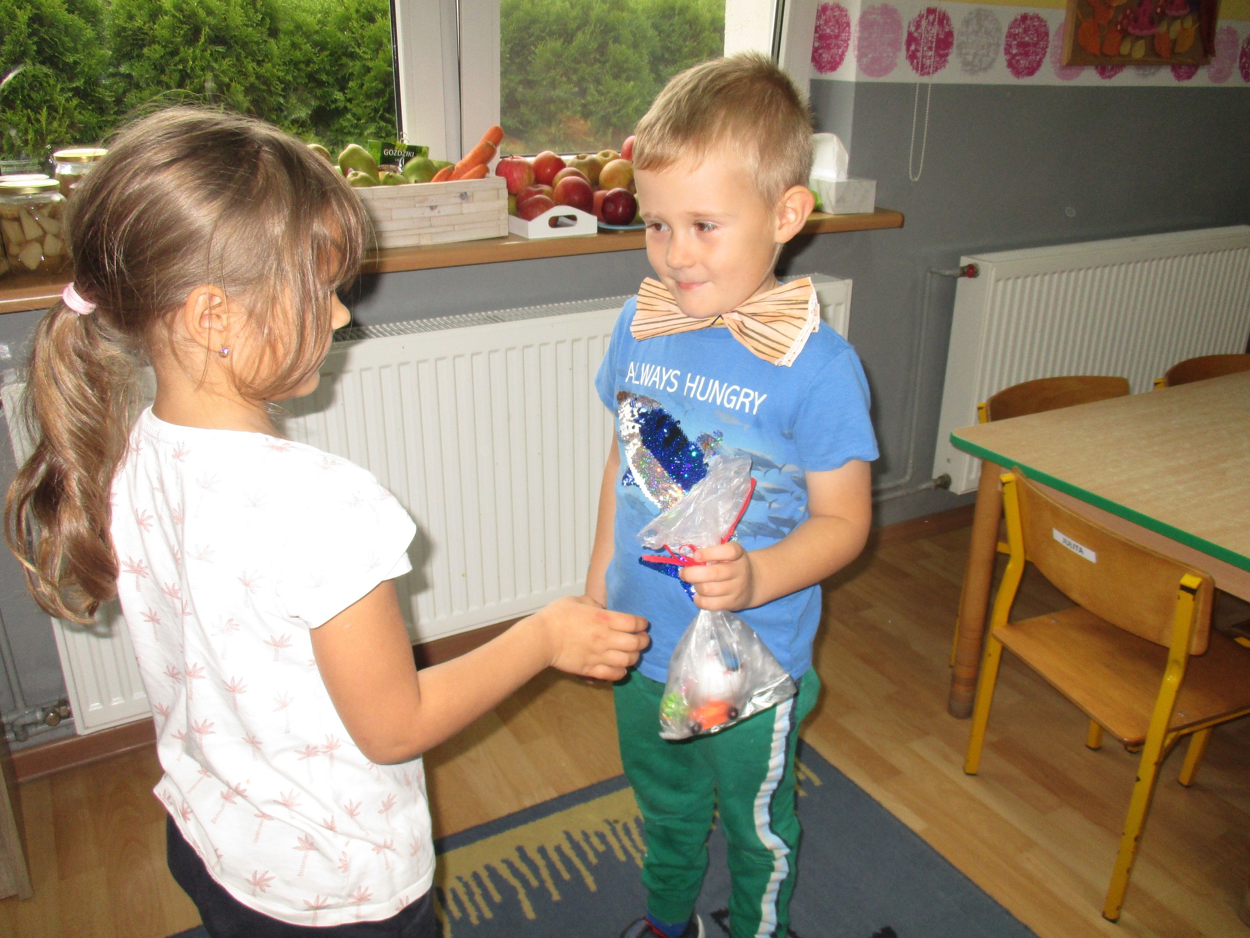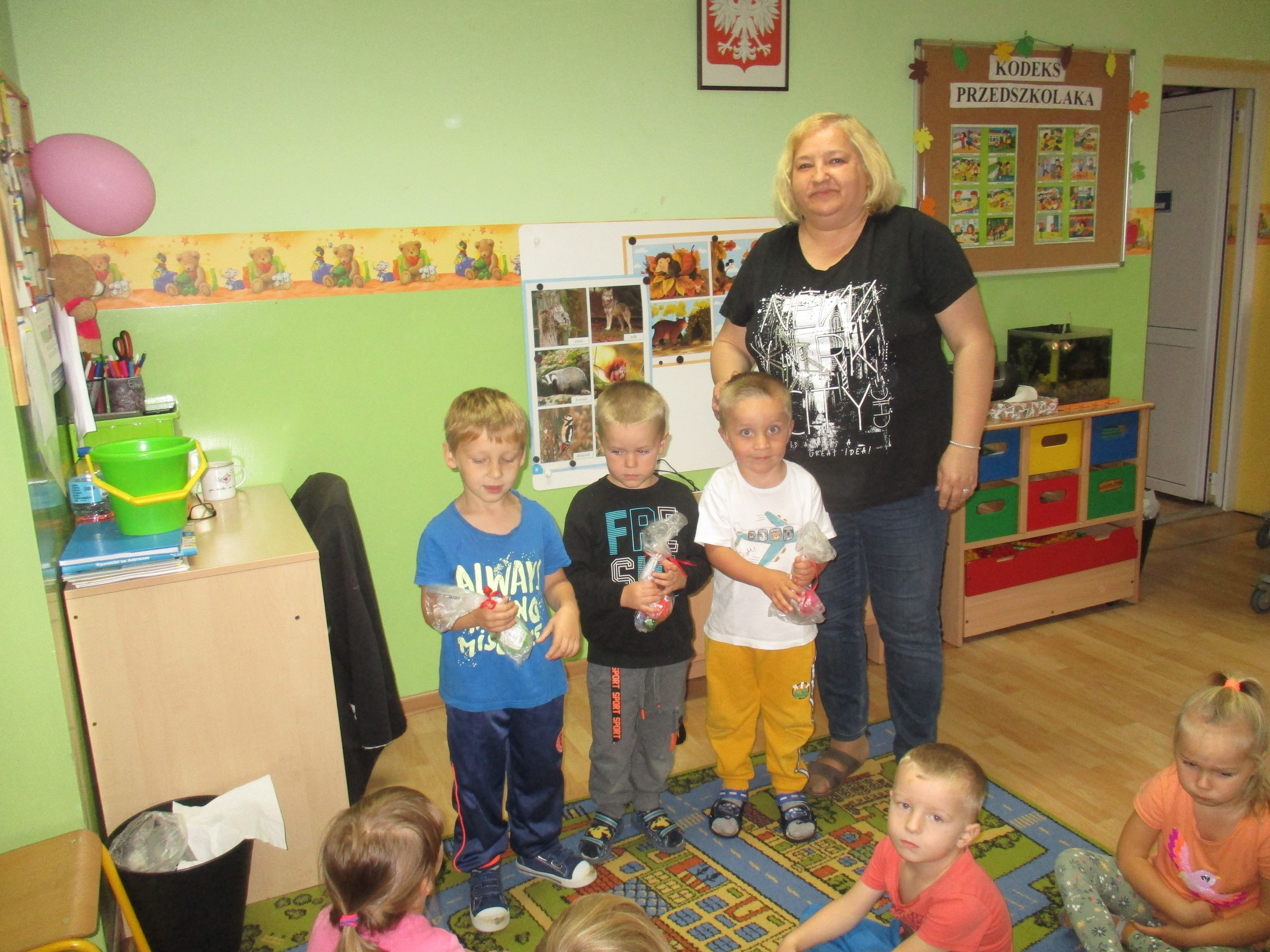 30 września chłopcy z naszego przedszkola udowodnili, że są prawdziwymi dżentelmenami. Na pewno mają bystre oko rzucając celnie do kosza, są wysportowani robiąc przysiady, potrafią się elegancko ubrać, znają tytuły bajek oraz fantastycznie potrafią tańczyć. Dlatego każdy dżentelmen otrzymał muszkę oraz upominki, które wręczyły chłopcom nasze dziewczynki. Słodką niespodziankę dla wszystkich dzieci przyniósł Kajtuś. Dziękujemy bardzo. Wszystkim chłopcom życzymy dużo uśmiechu, radości i wspaniałych przyjaciół.