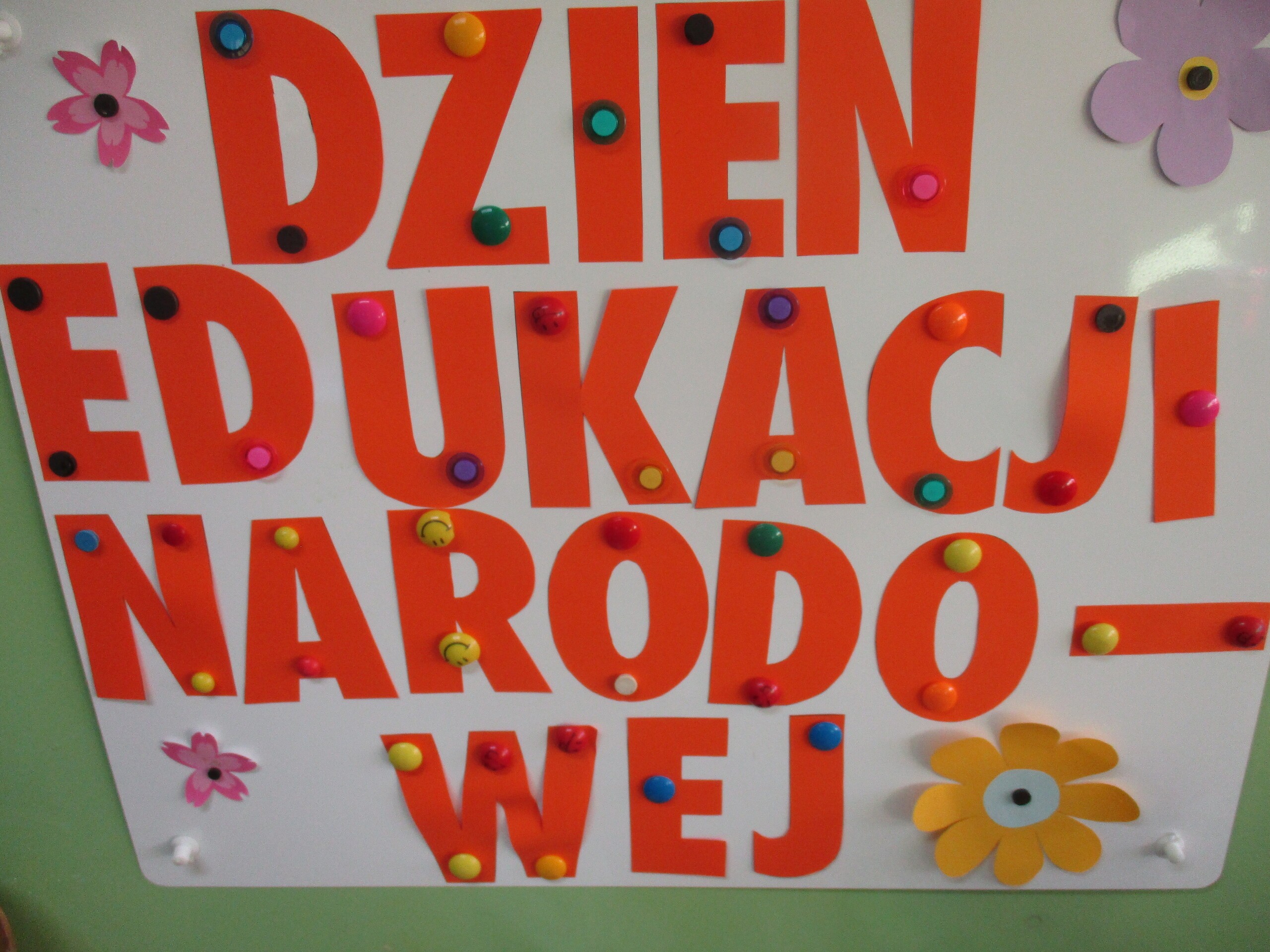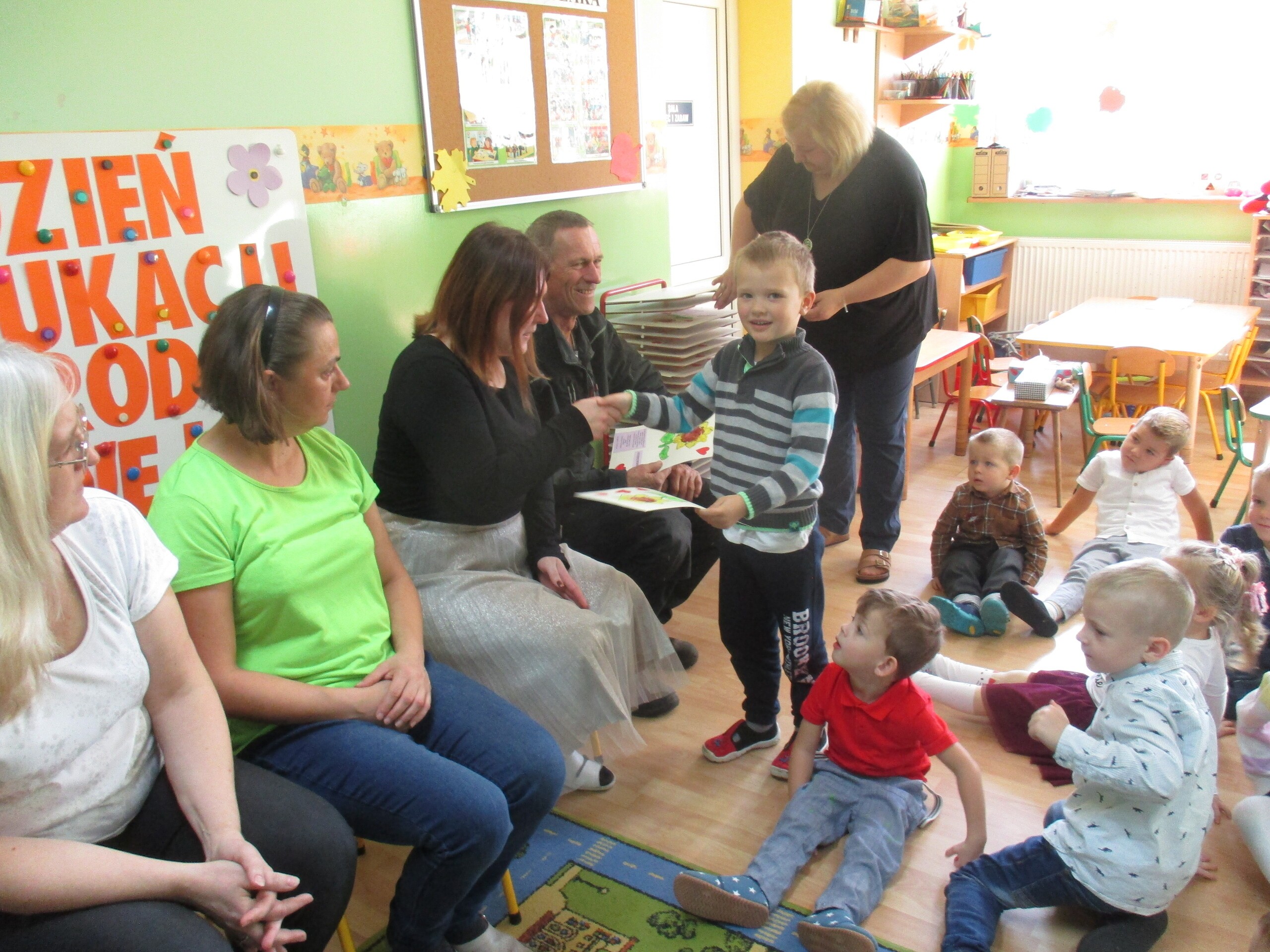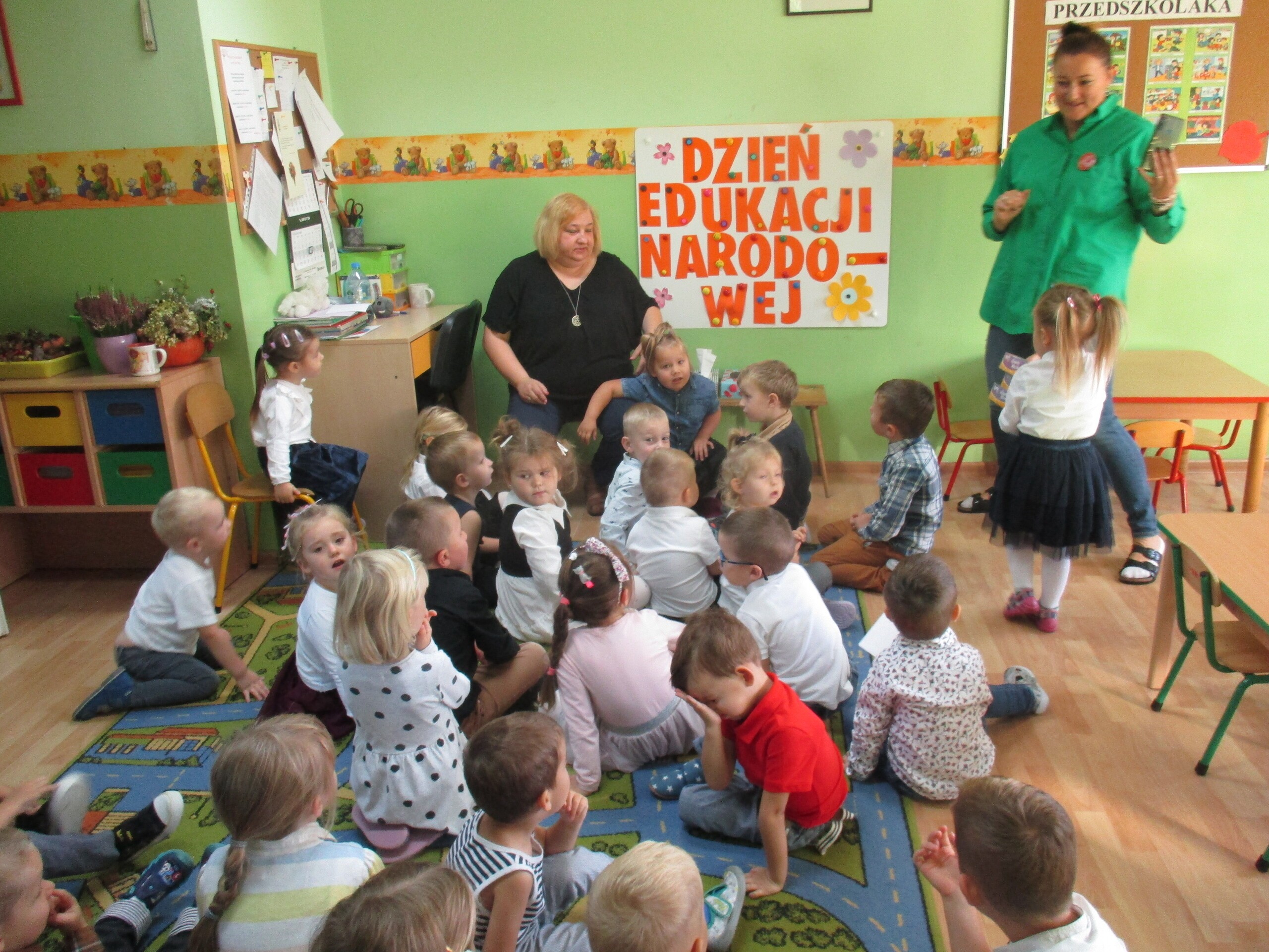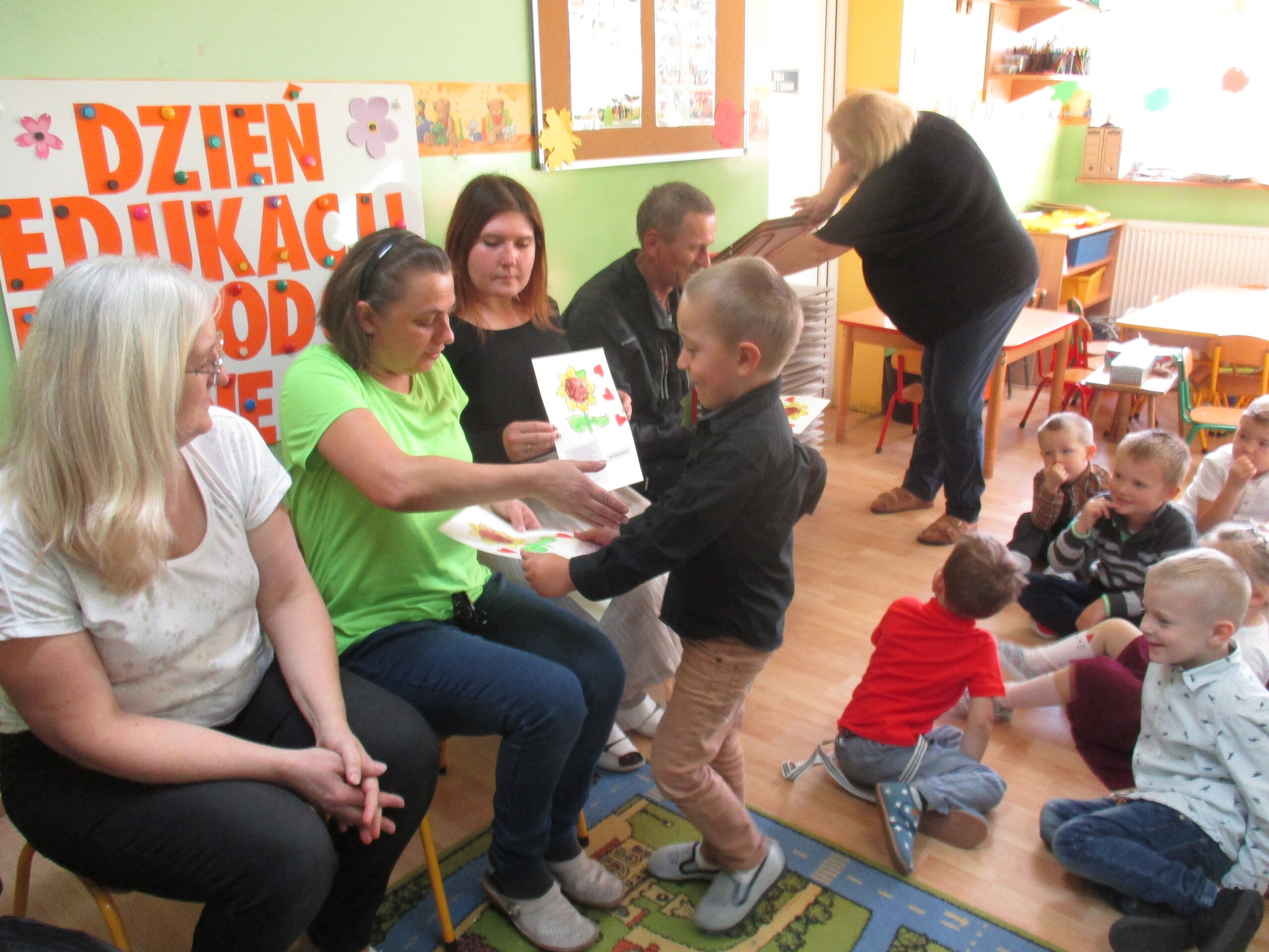 Dzień Edukacji Narodowej to święto wszystkich nauczycieli i pracowników przedszkola. W tym roku postanowiliśmy obchodzić go inaczej niż zwykle. W tym dniu wszystkie dzieci przyszły odświętnie ubrane. Przedszkolaki wspólnie przygotowały laurki dla dyrekcji, nauczycielek i personelu przedszkola. Dzieci zaśpiewały wszystkim gościom piosenkę oraz wręczyły przygotowane przez siebie laurki.