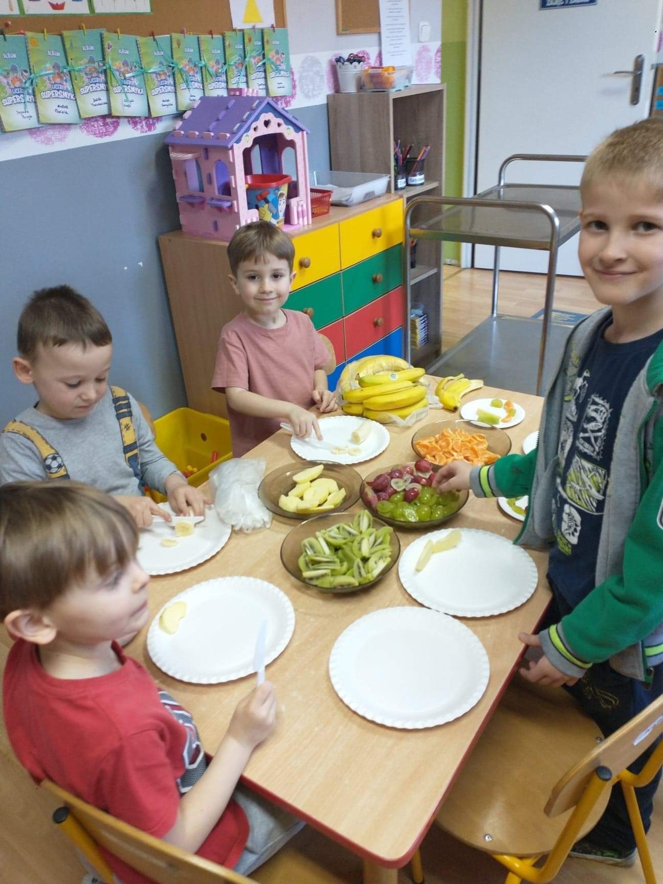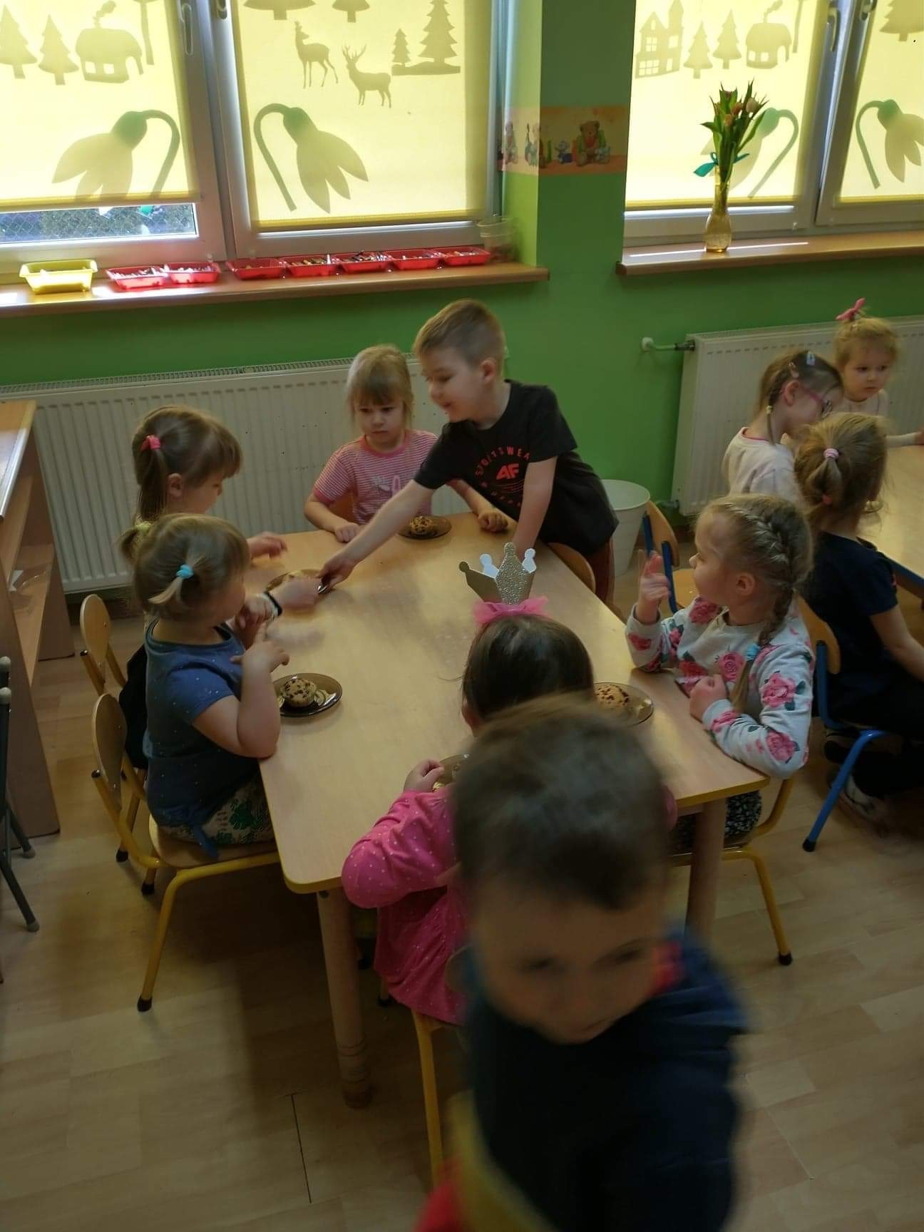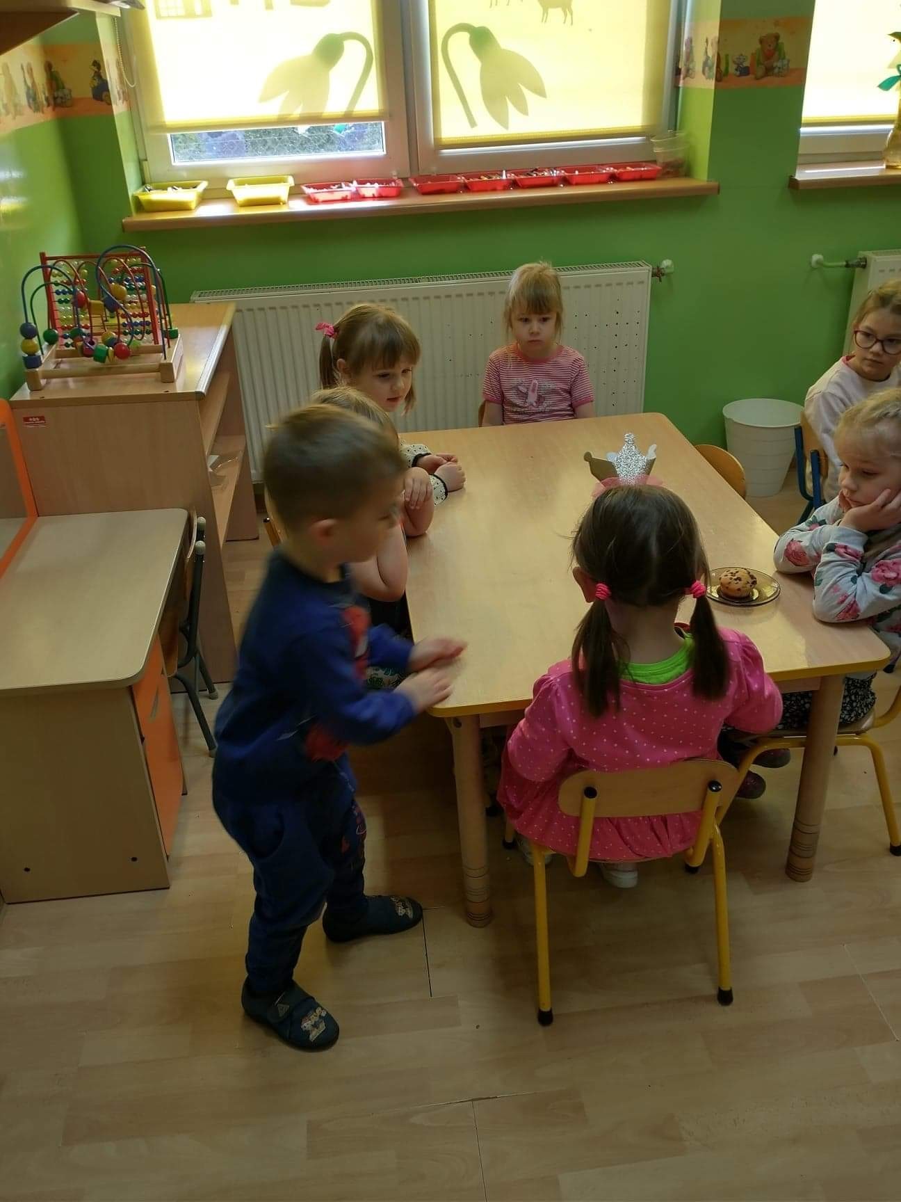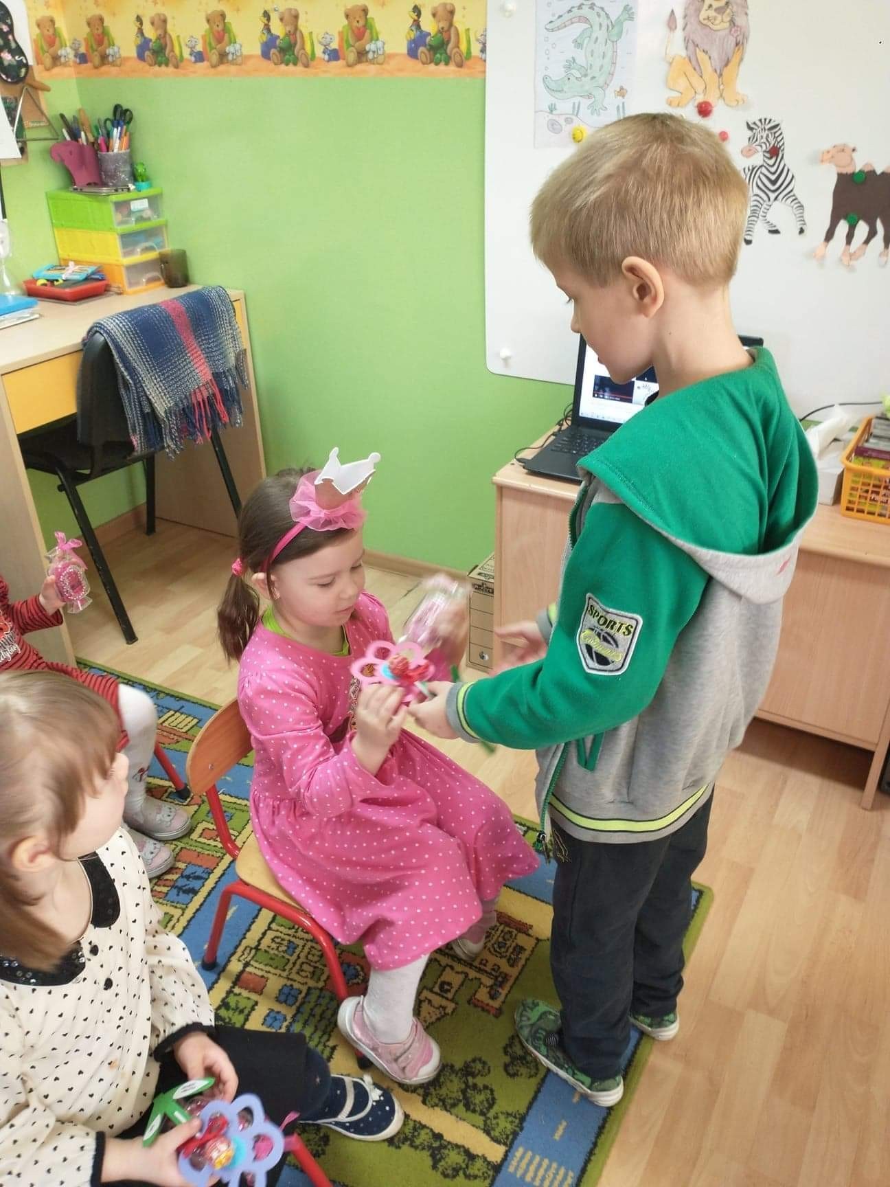 W tym szczególnym dniu wszyscy chłopcy przygotowali dla dziewczyn pyszną niespodziankę. Starszaki zrobili sałatkę owocową, a chłopcy z grupy młodszej upiekli z panią babeczki. Oczywiście zaśpiewali sto lat i obdarowali dziewczynki słodkim kwiatkiem i niespodzianką. Chłopcy tego dnia zachowywali się jak prawdziwi gentelmani, wyręczali dziewczynki w codziennych obowiązkach między innymi porządkowaniu sali po zabawie, byli przemili i sympatyczni. Dziewczynki za tak miłą i słodką niespodziankę poczęstowały chłopców lizakami. Wszystkie Panie i dziewczynki dziękują chłopcom za życzenia i niespodzianki.