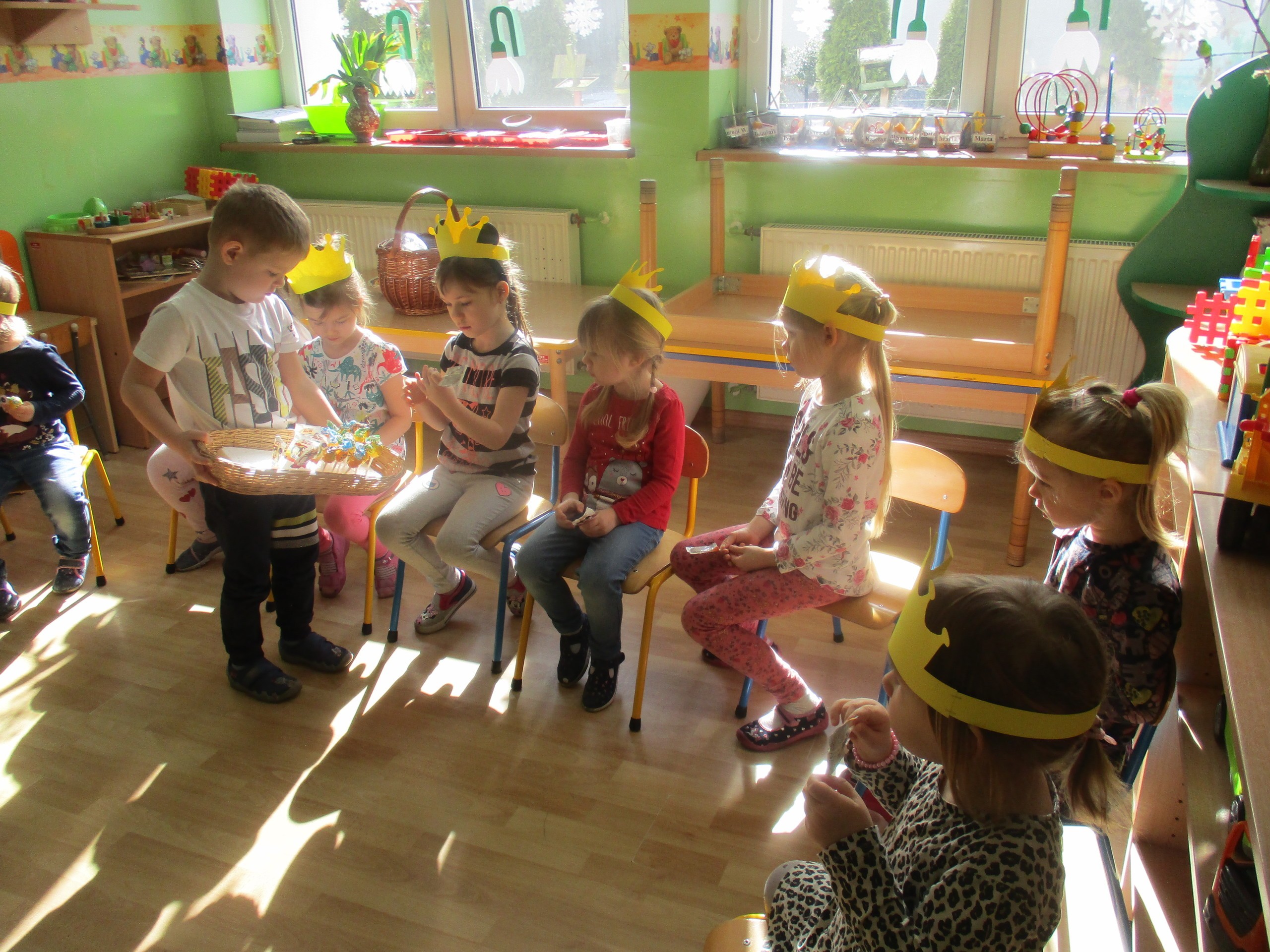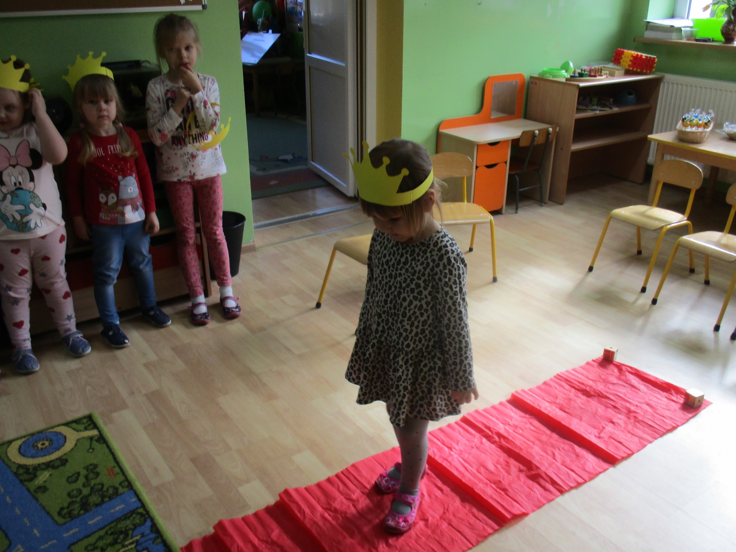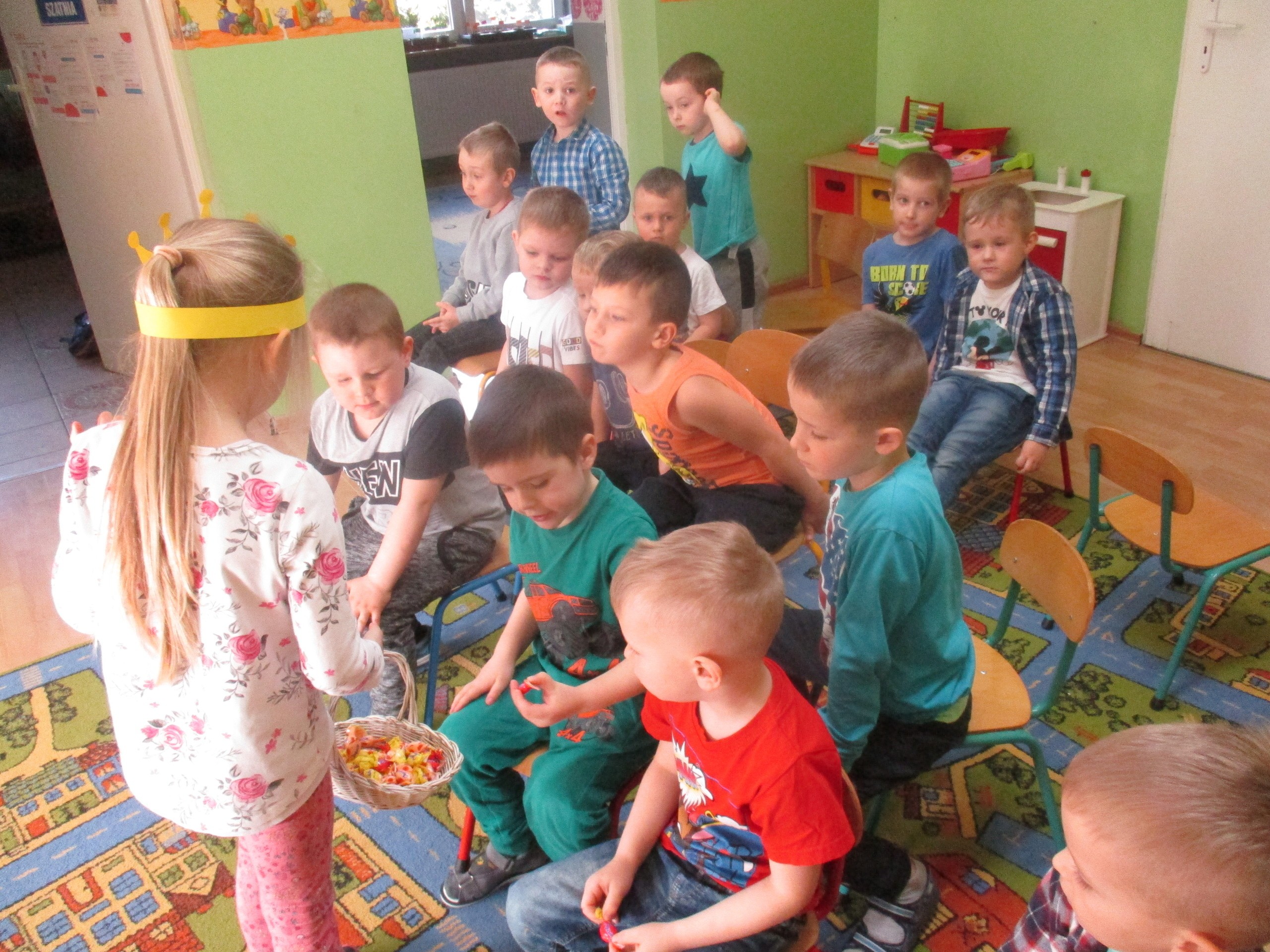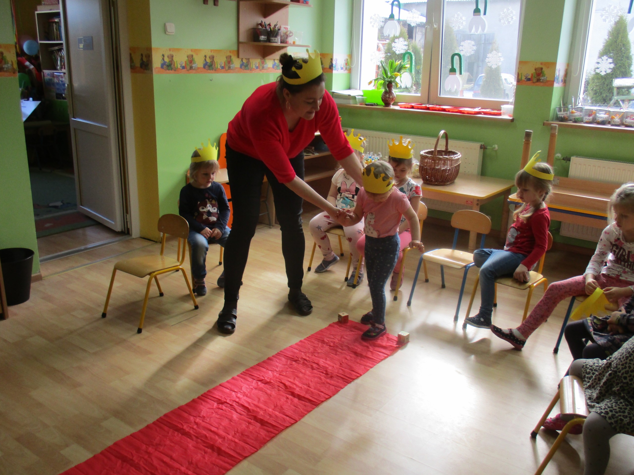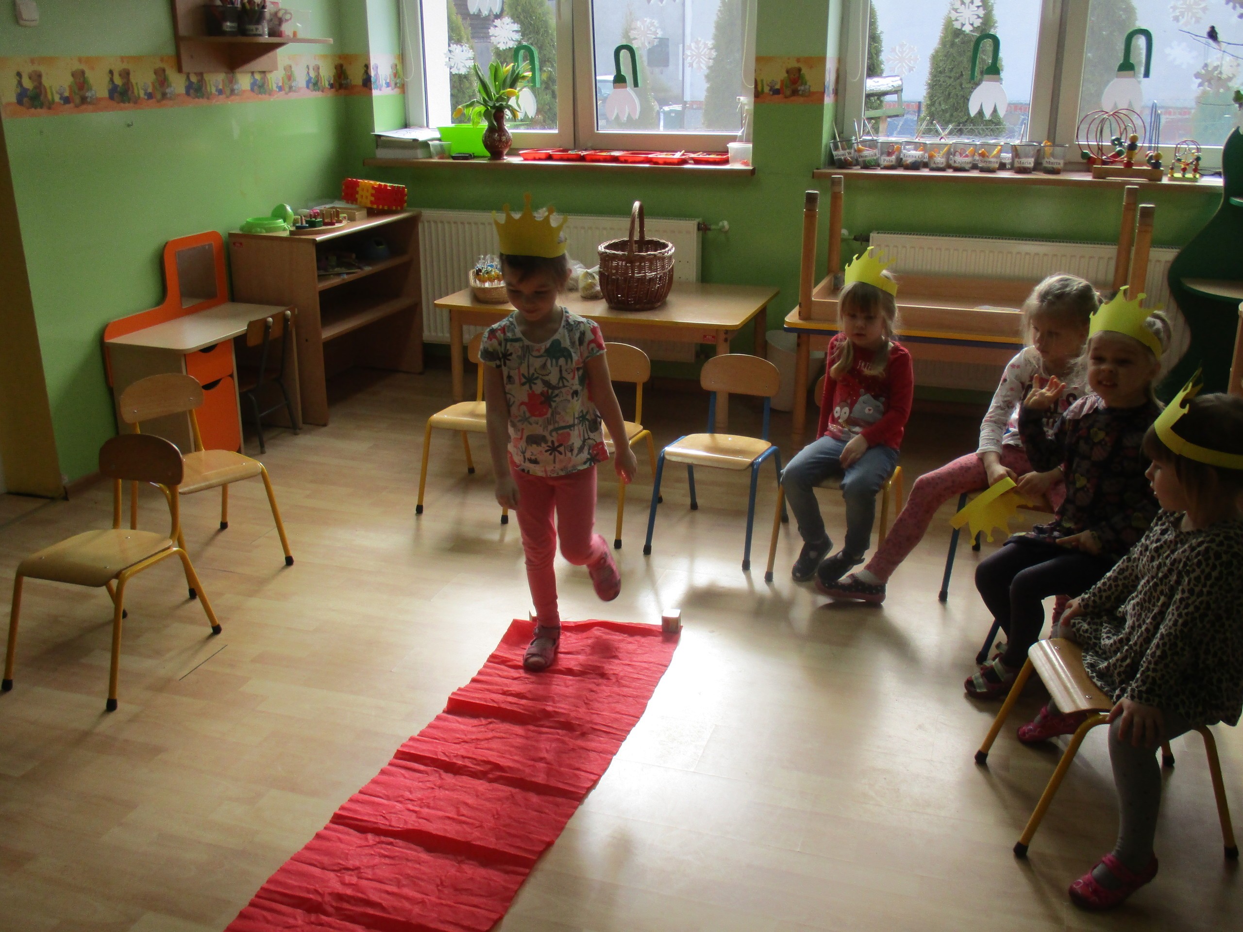 W miłej atmosferze rozpoczęliśmy wspólną zabawę. Chłopcy zamienili się w rycerzy a dziewczynki zostały księżniczkami. Na miano tego tytułu dziewczynki przy pomocy rycerzy musiały wykonać kilka zadań. Rozwiązywały zagadki, dopasowywały odpowiednie atrybuty księżniczki i rycerza, tworzyły z papieru toaletowego sukienkę dla księżniczki, oddzielały guziki od fasoli (tak jak to robił Kopciuszek), rycerze dopasowywali odpowiednie pantofelki do dziewczynek. Na koniec rycerze (chłopcy) założyli dziewczynkom i paniom korony, które w ten sposób oficjalnie zostały księżniczkami. Następnie dziewczynki i panie przeszły się po czerwonym dywanie. Chłopcy z wielką elegancją złożyli swoim koleżankom i paniom najserdeczniejsze życzenia, zaśpiewali sto lat i wręczyli słodkie upominki. Szczególne podziękowania od dziewczynek i pań otrzymali Antoś Durmna i Ksawery za osobiste upominki.