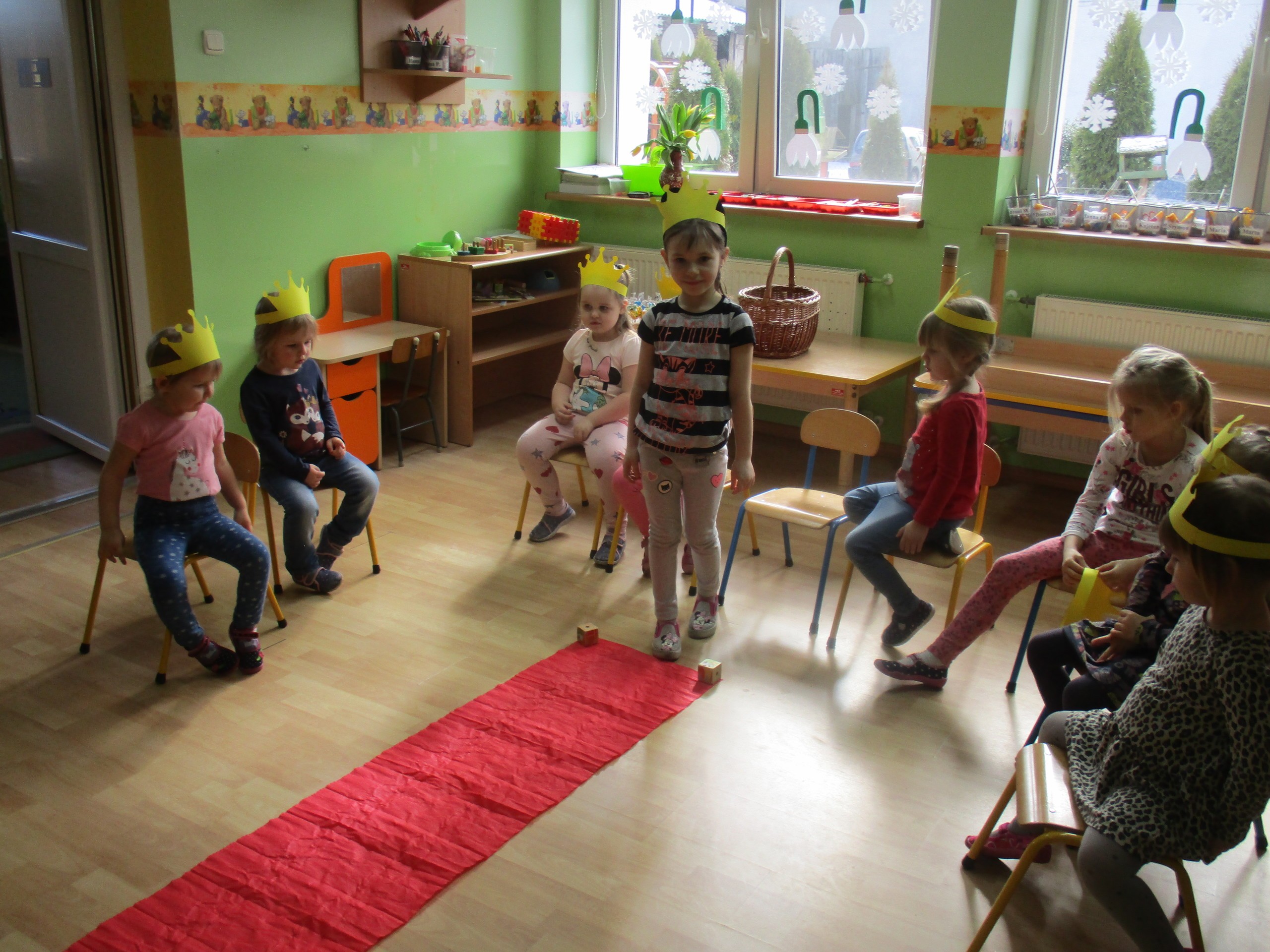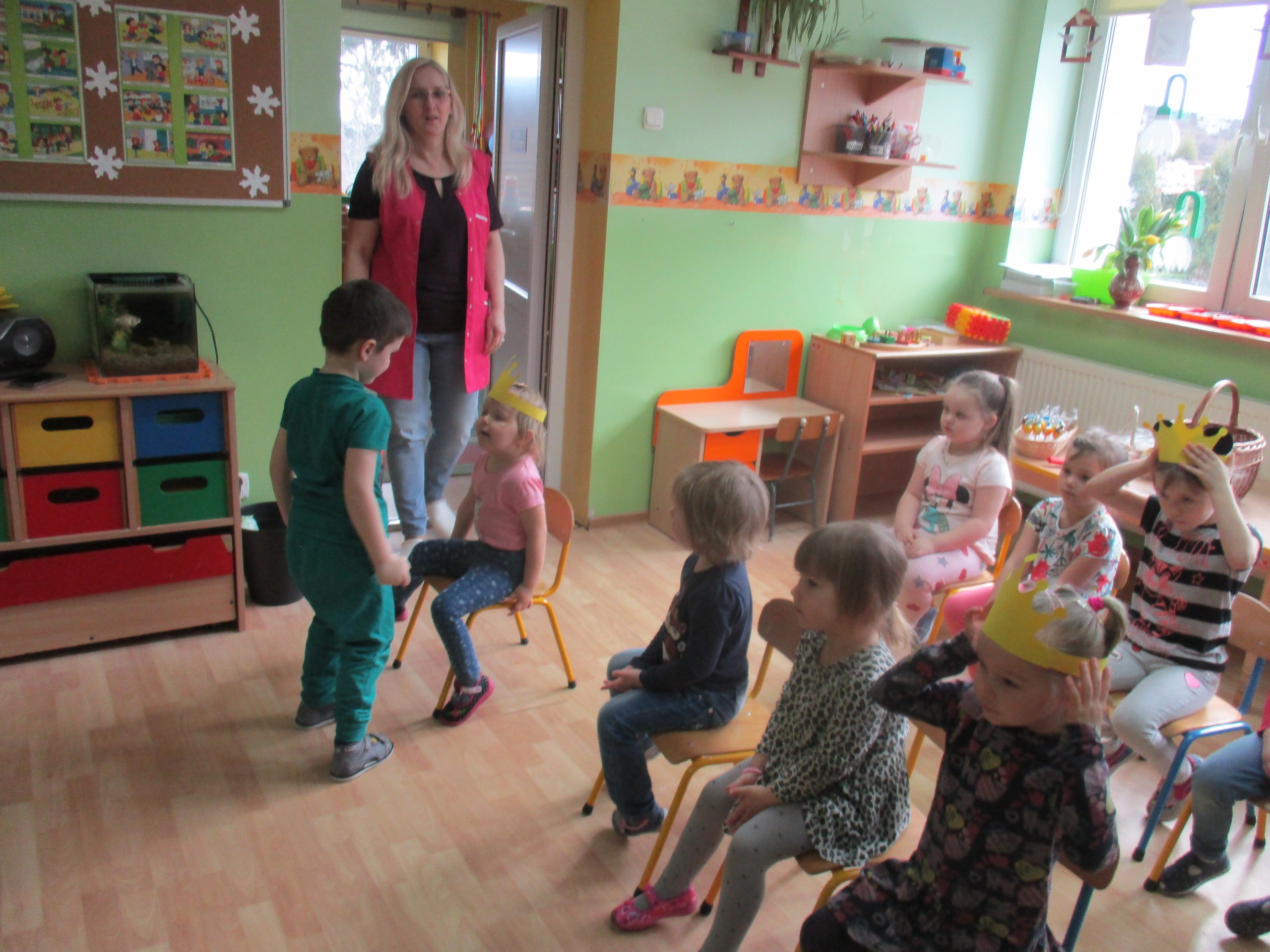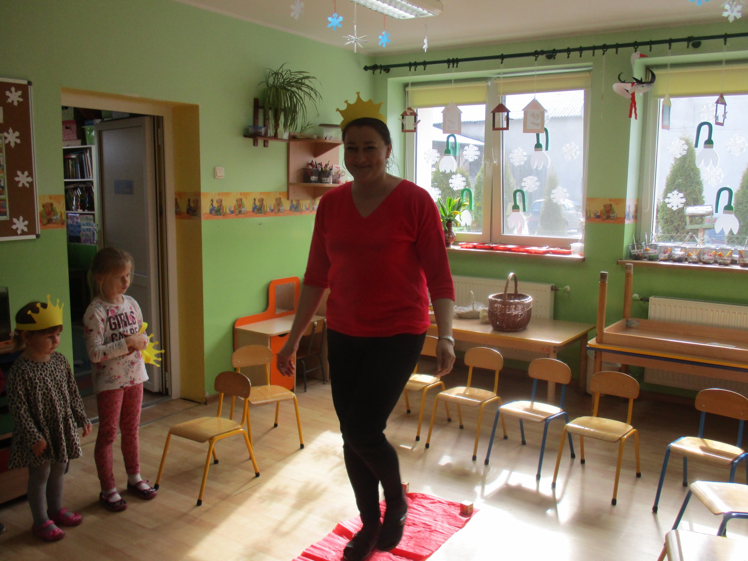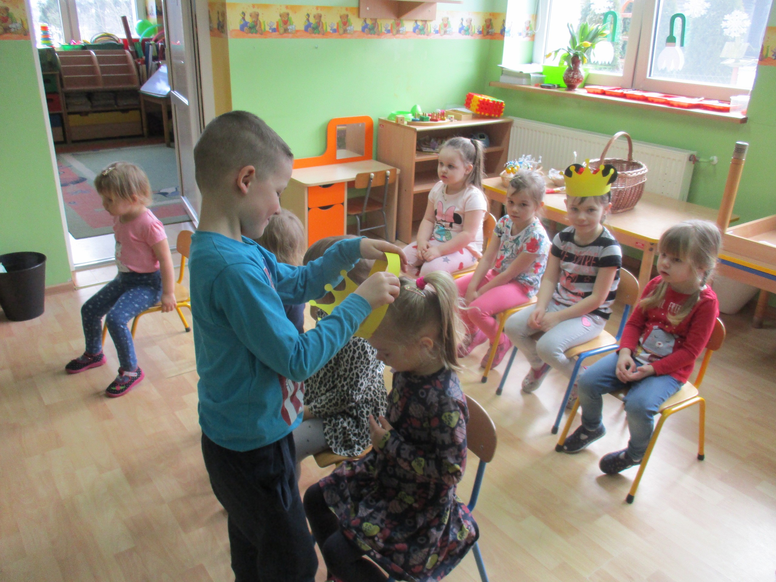 W miłej atmosferze rozpoczęliśmy wspólną zabawę. Chłopcy zamienili się w rycerzy a dziewczynki zostały księżniczkami. Na miano tego tytułu dziewczynki przy pomocy rycerzy musiały wykonać kilka zadań. Rozwiązywały zagadki, dopasowywały odpowiednie atrybuty księżniczki i rycerza, tworzyły z papieru toaletowego sukienkę dla księżniczki, oddzielały guziki od fasoli (tak jak to robił Kopciuszek), rycerze dopasowywali odpowiednie pantofelki do dziewczynek. Na koniec rycerze (chłopcy) założyli dziewczynkom i paniom korony, które w ten sposób oficjalnie zostały księżniczkami. Następnie dziewczynki i panie przeszły się po czerwonym dywanie. Chłopcy z wielką elegancją złożyli swoim koleżankom i paniom najserdeczniejsze życzenia, zaśpiewali sto lat i wręczyli słodkie upominki. Szczególne podziękowania od dziewczynek i pań otrzymali Antoś Durmna i Ksawery za osobiste upominki.
