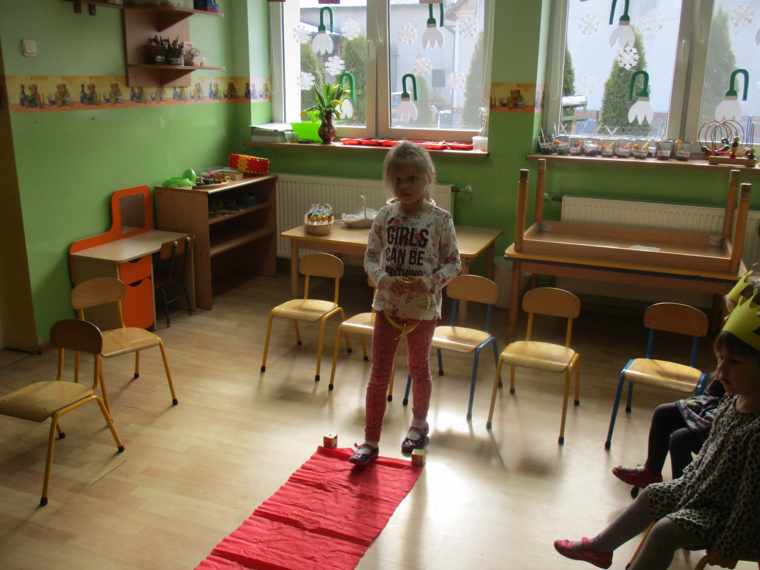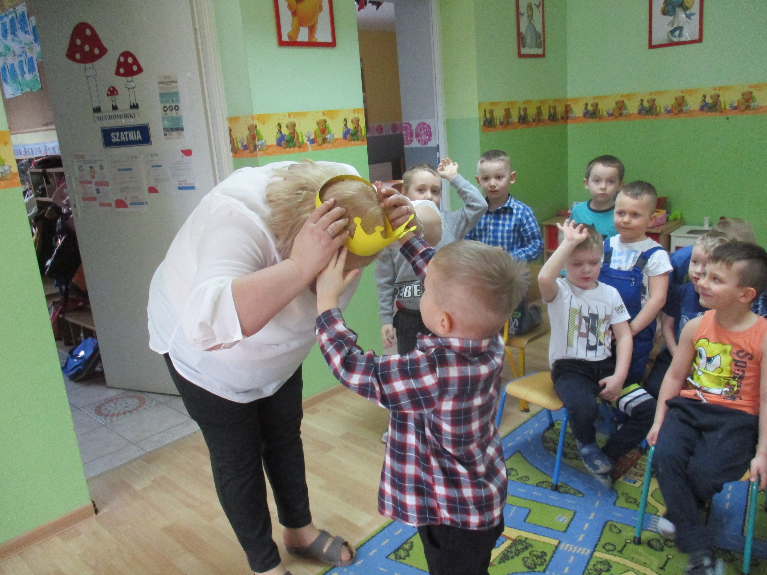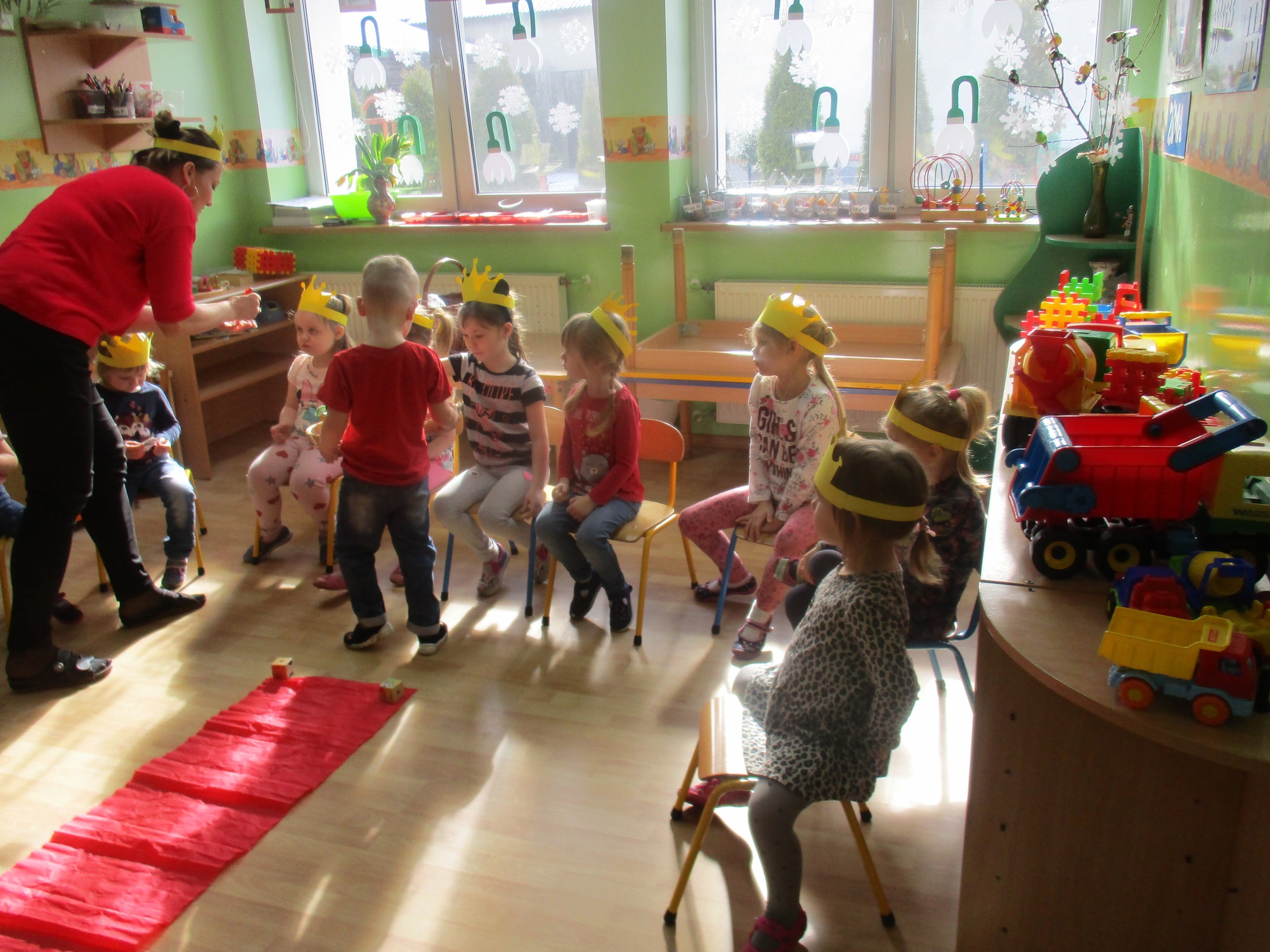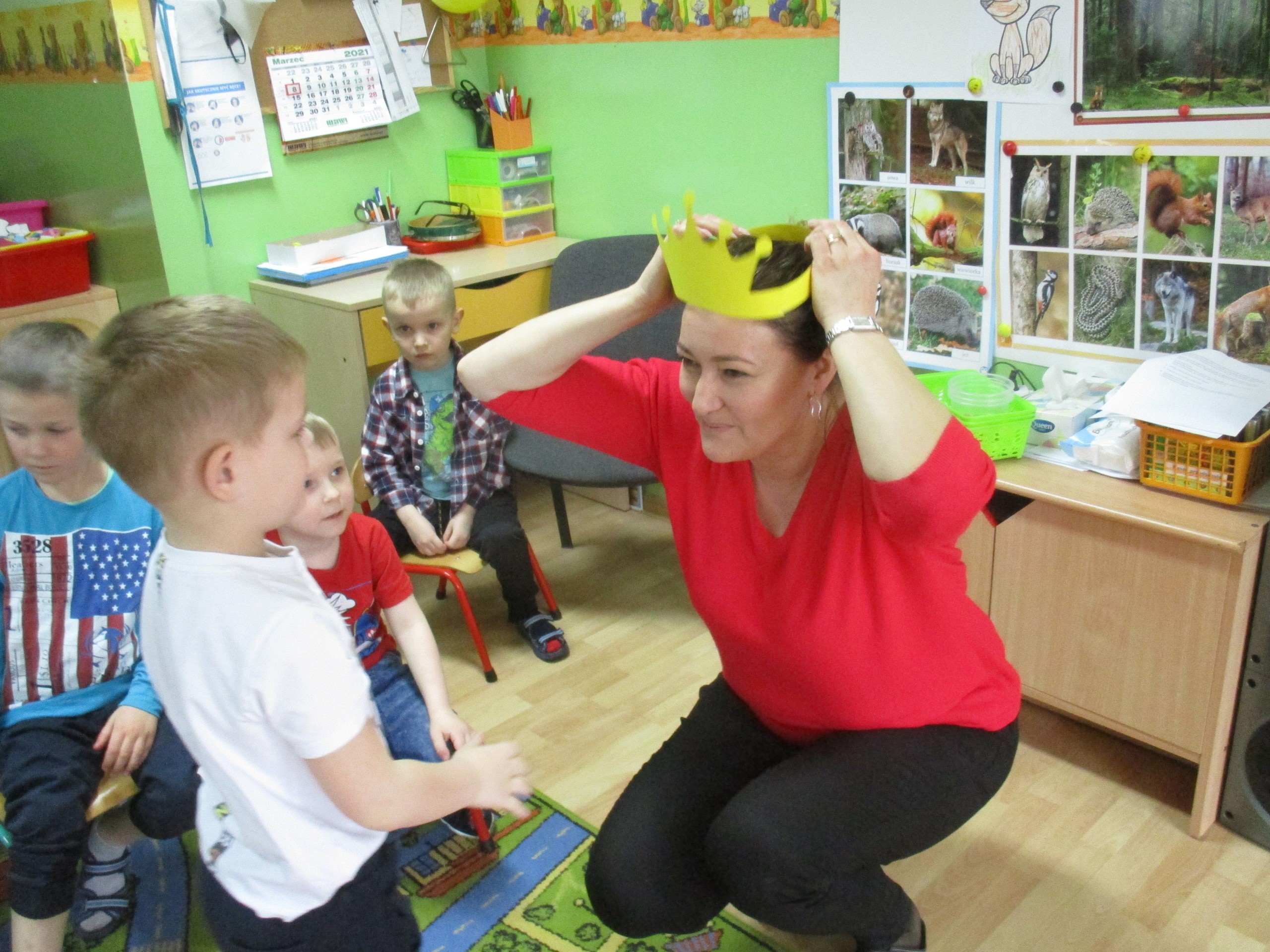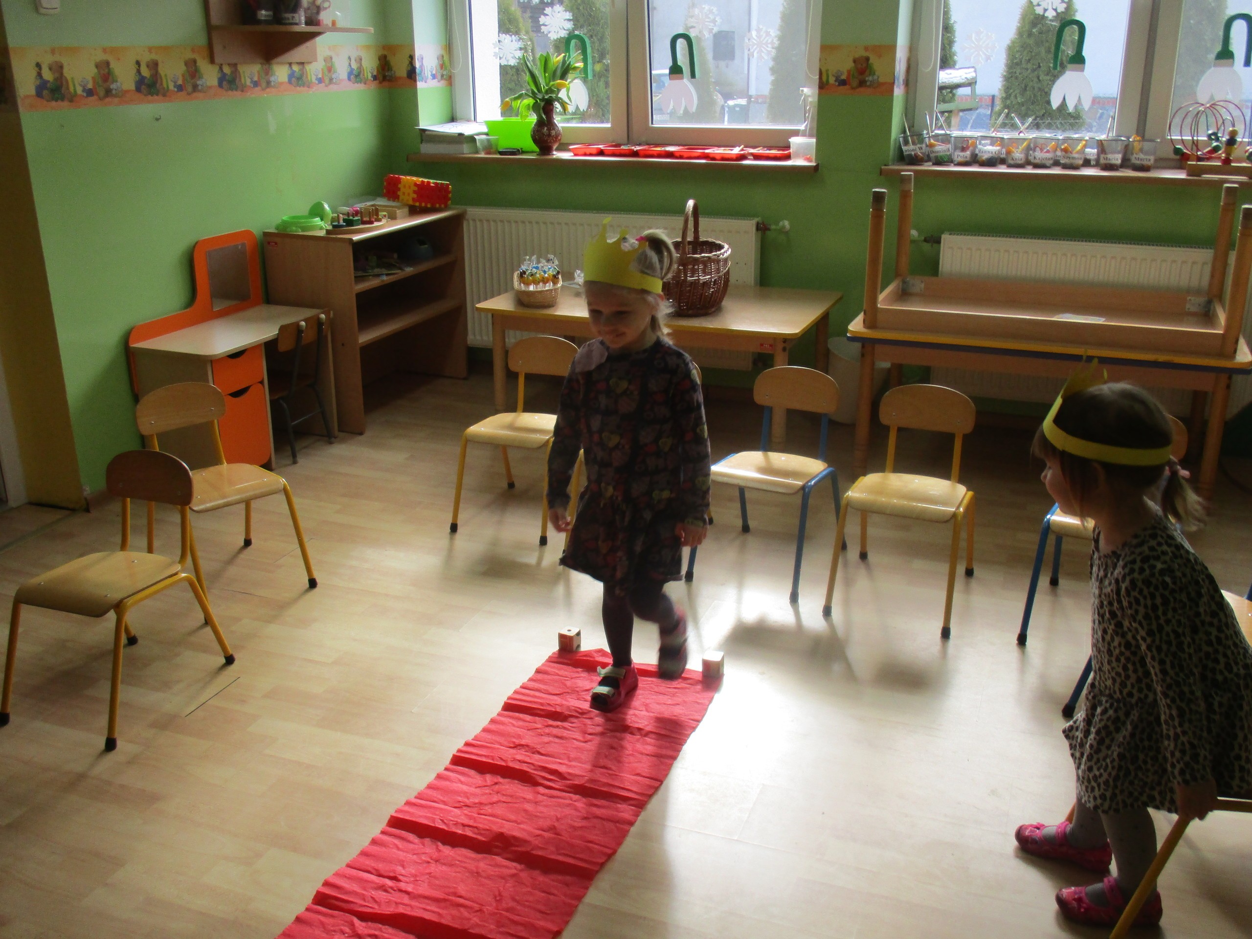 W miłej atmosferze rozpoczęliśmy wspólną zabawę. Chłopcy zamienili się w rycerzy a dziewczynki zostały księżniczkami. Na miano tego tytułu dziewczynki przy pomocy rycerzy musiały wykonać kilka zadań. Rozwiązywały zagadki, dopasowywały odpowiednie atrybuty księżniczki i rycerza, tworzyły z papieru toaletowego sukienkę dla księżniczki, oddzielały guziki od fasoli (tak jak to robił Kopciuszek), rycerze dopasowywali odpowiednie pantofelki do dziewczynek. Na koniec rycerze (chłopcy) założyli dziewczynkom i paniom korony, które w ten sposób oficjalnie zostały księżniczkami. Następnie dziewczynki i panie przeszły się po czerwonym dywanie. Chłopcy z wielką elegancją złożyli swoim koleżankom i paniom najserdeczniejsze życzenia, zaśpiewali sto lat i wręczyli słodkie upominki. Szczególne podziękowania od dziewczynek i pań otrzymali Antoś Durmna i Ksawery za osobiste upominki.