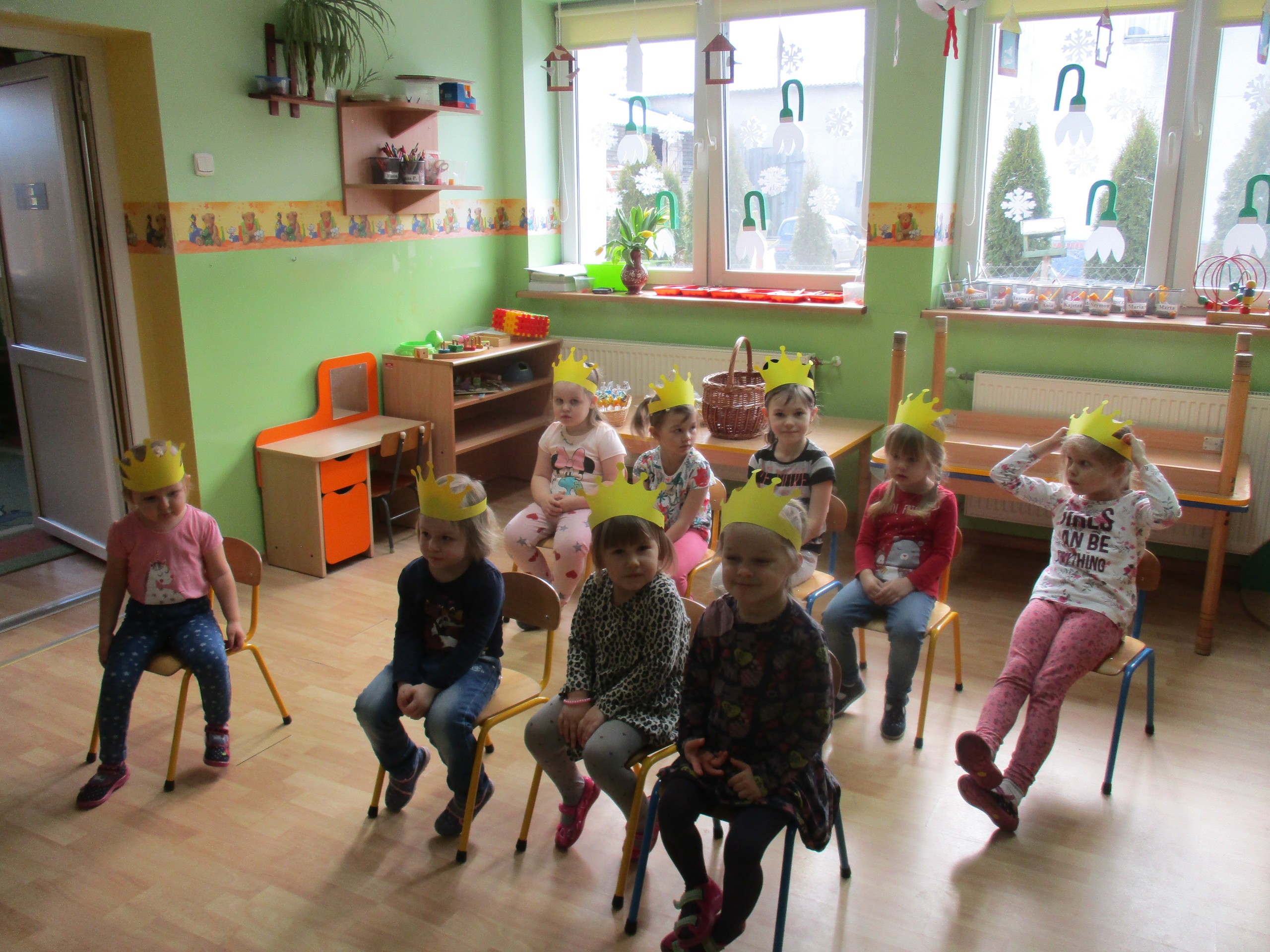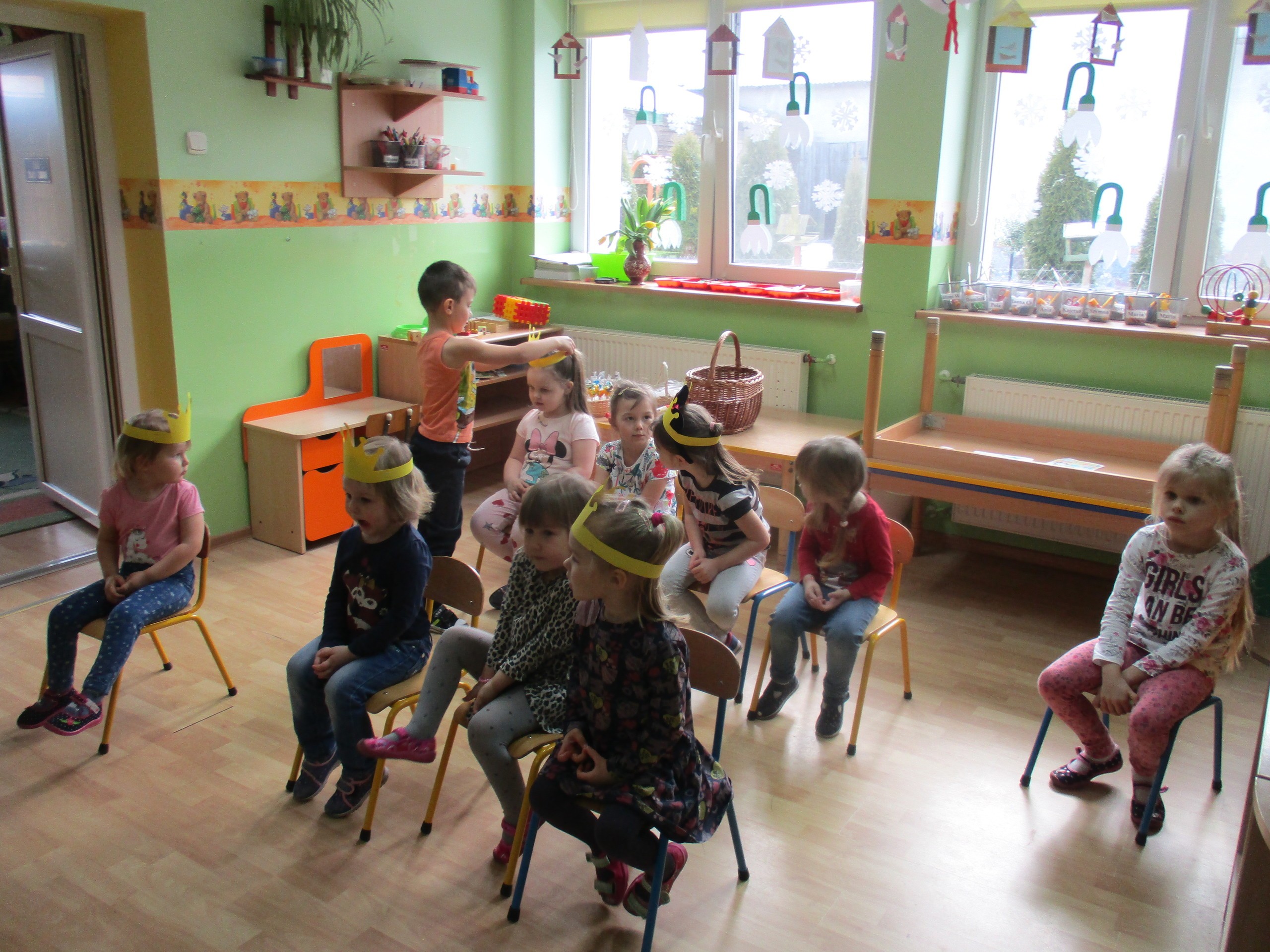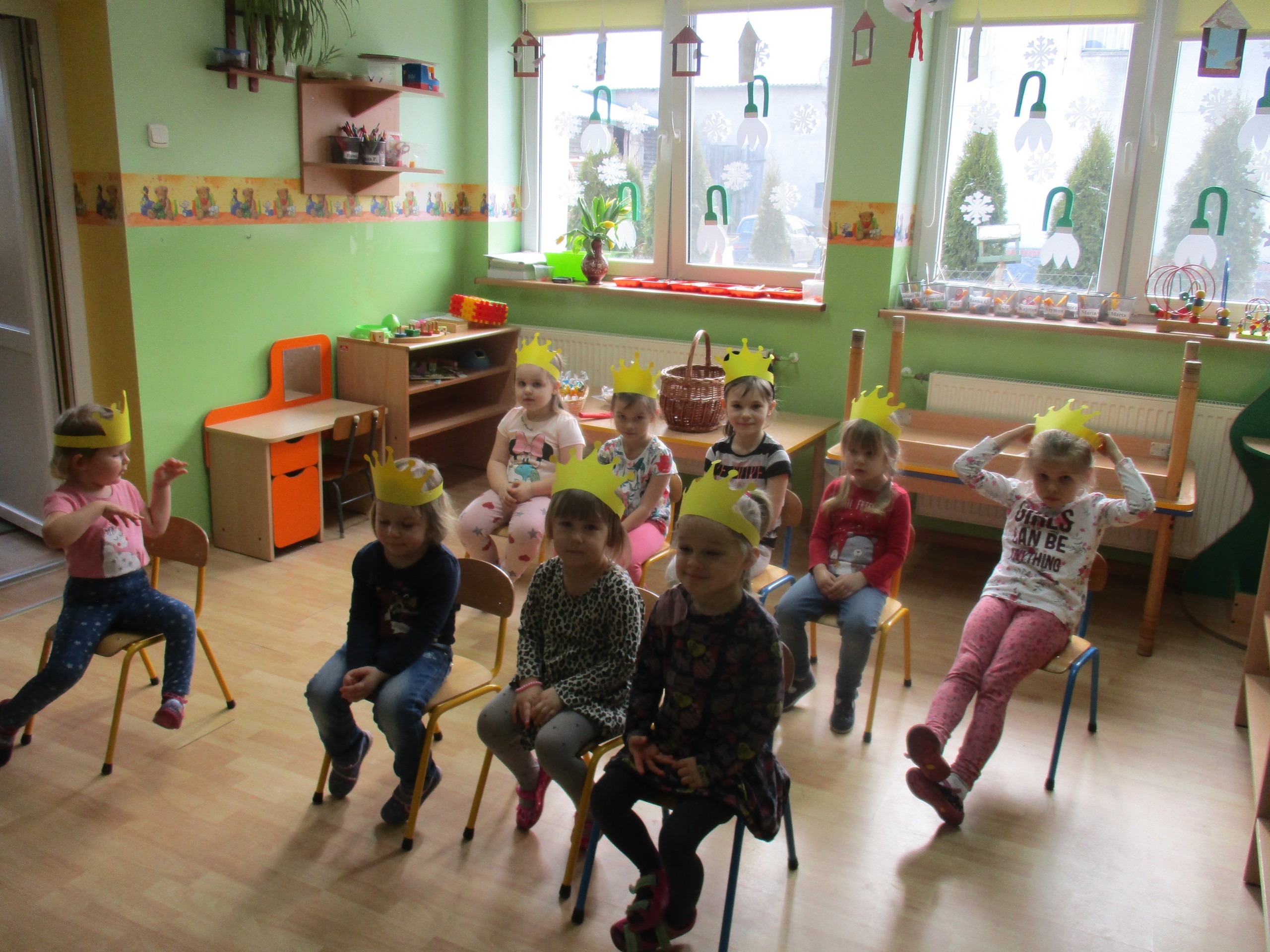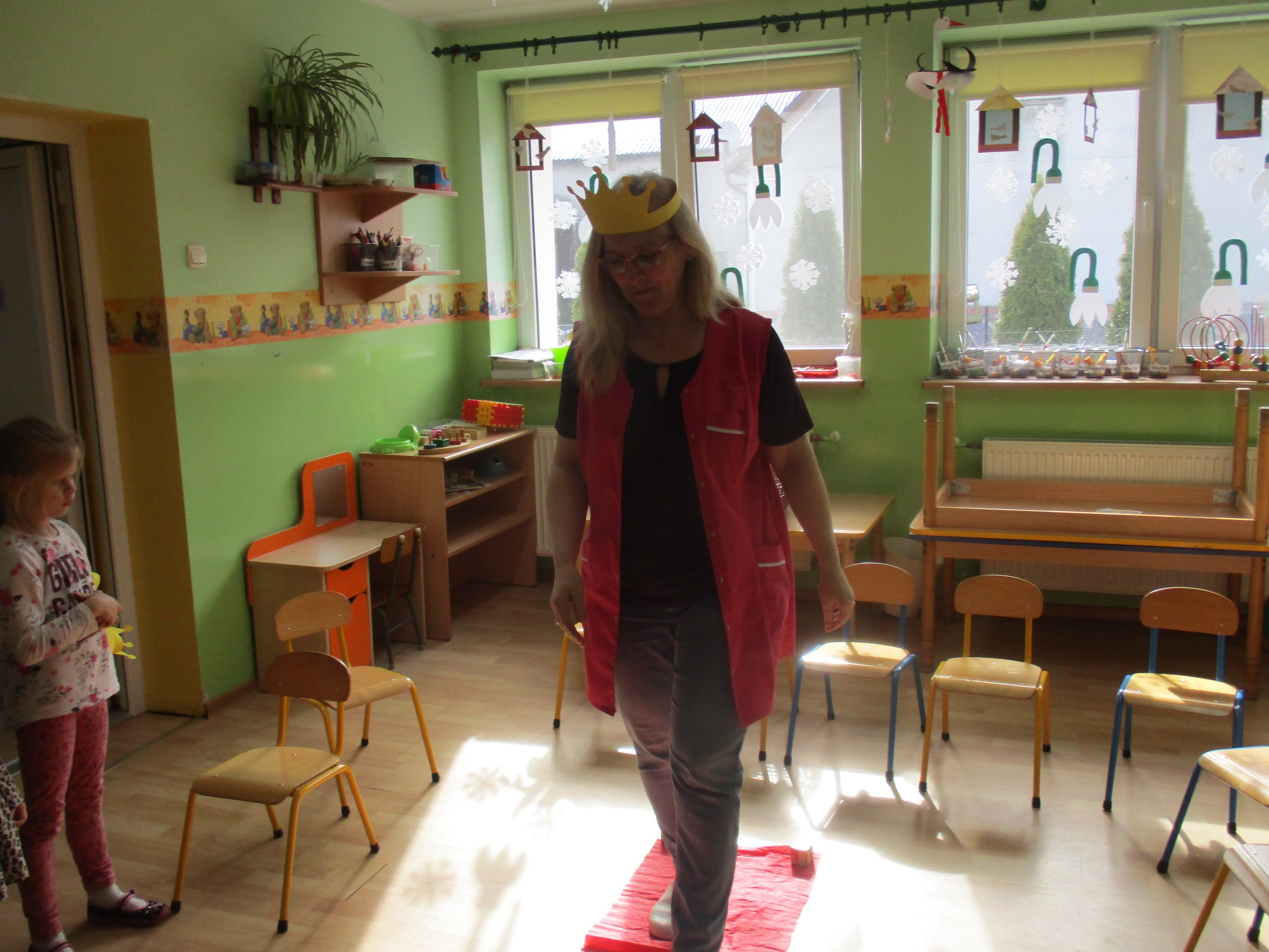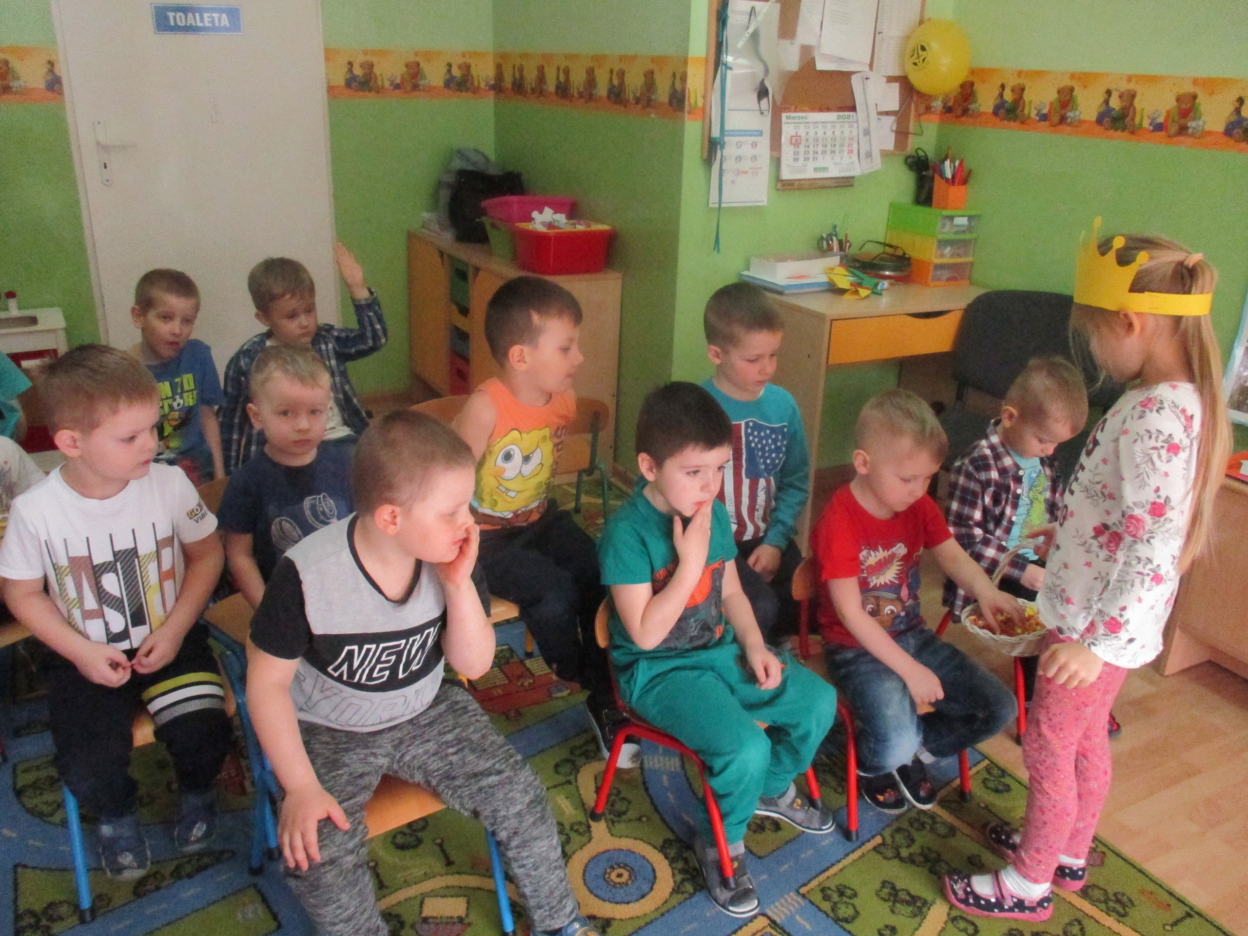 W miłej atmosferze rozpoczęliśmy wspólną zabawę. Chłopcy zamienili się w rycerzy a dziewczynki zostały księżniczkami. Na miano tego tytułu dziewczynki przy pomocy rycerzy musiały wykonać kilka zadań. Rozwiązywały zagadki, dopasowywały odpowiednie atrybuty księżniczki i rycerza, tworzyły z papieru toaletowego sukienkę dla księżniczki, oddzielały guziki od fasoli (tak jak to robił Kopciuszek), rycerze dopasowywali odpowiednie pantofelki do dziewczynek. Na koniec rycerze (chłopcy) założyli dziewczynkom i paniom korony, które w ten sposób oficjalnie zostały księżniczkami. Następnie dziewczynki i panie przeszły się po czerwonym dywanie. Chłopcy z wielką elegancją złożyli swoim koleżankom i paniom najserdeczniejsze życzenia, zaśpiewali sto lat i wręczyli słodkie upominki. Szczególne podziękowania od dziewczynek i pań otrzymali Antoś Durmna i Ksawery za osobiste upominki.
