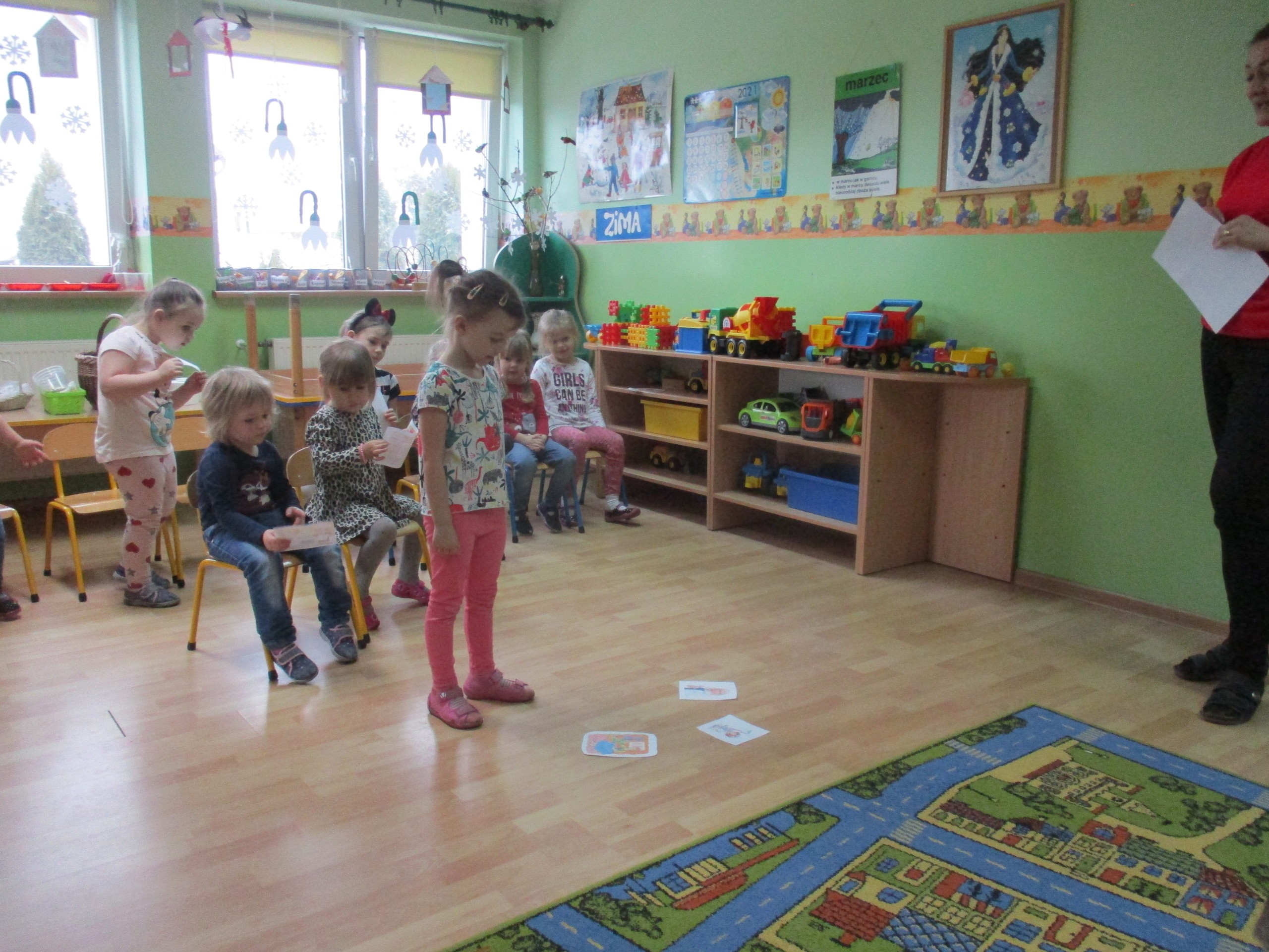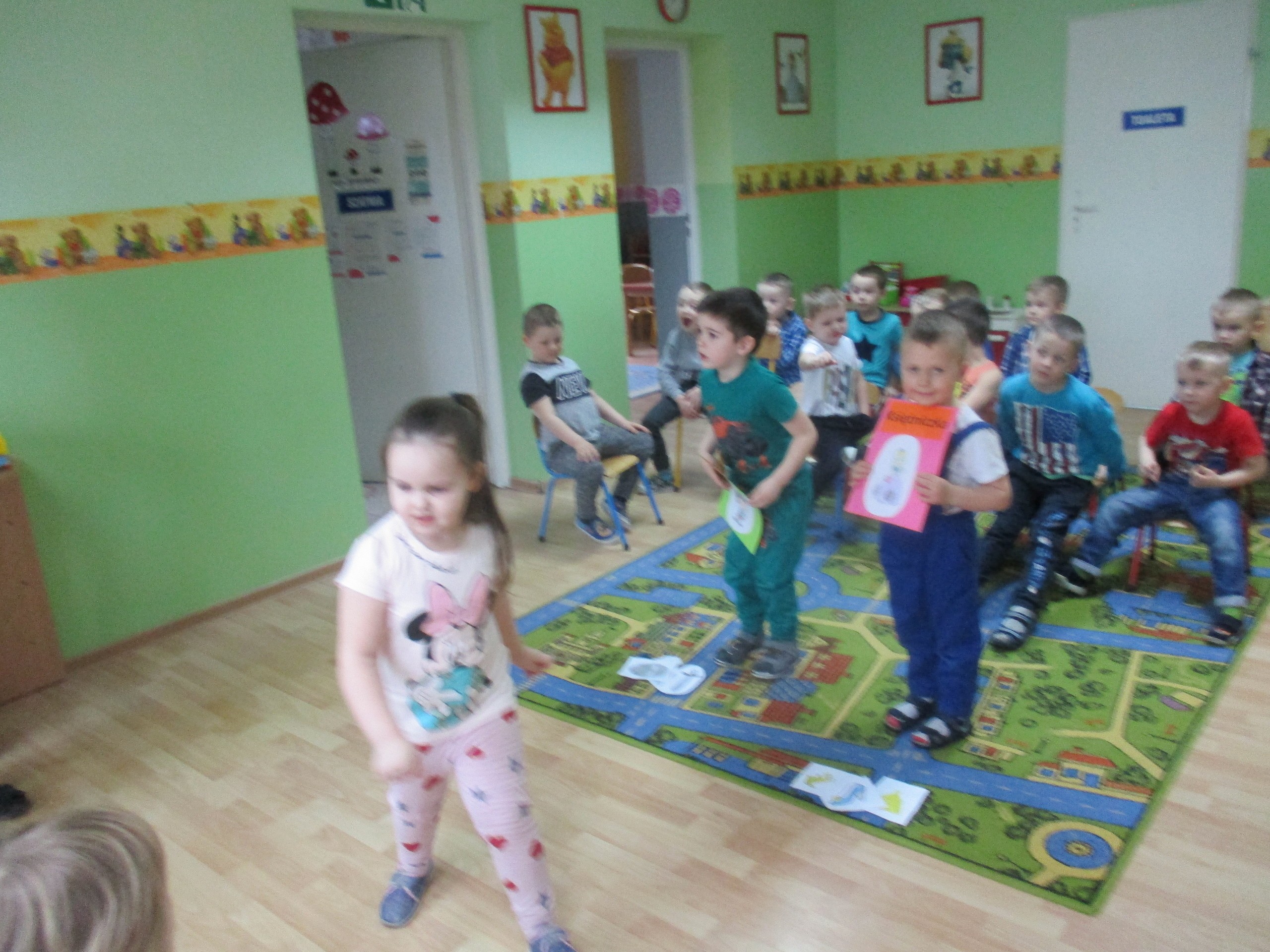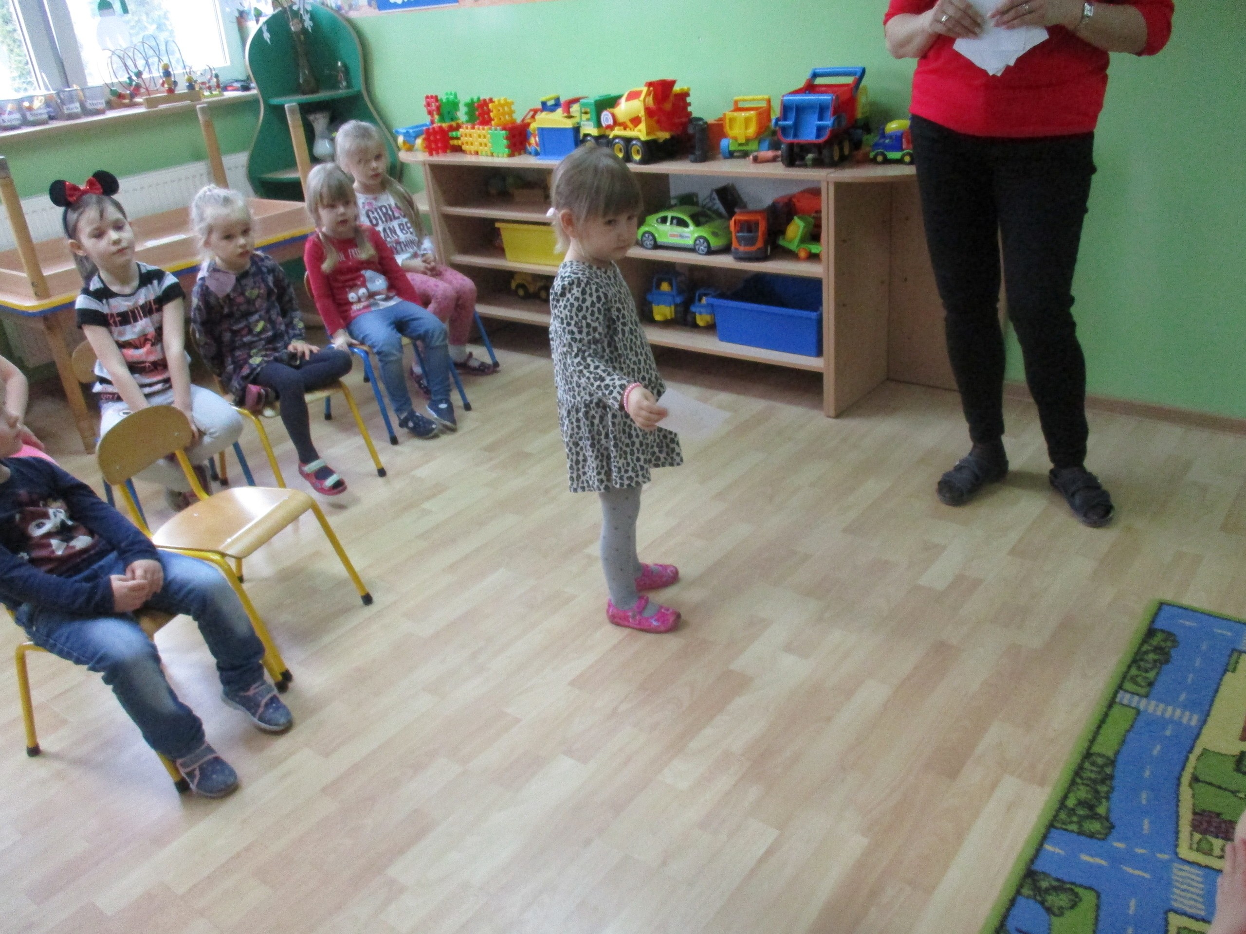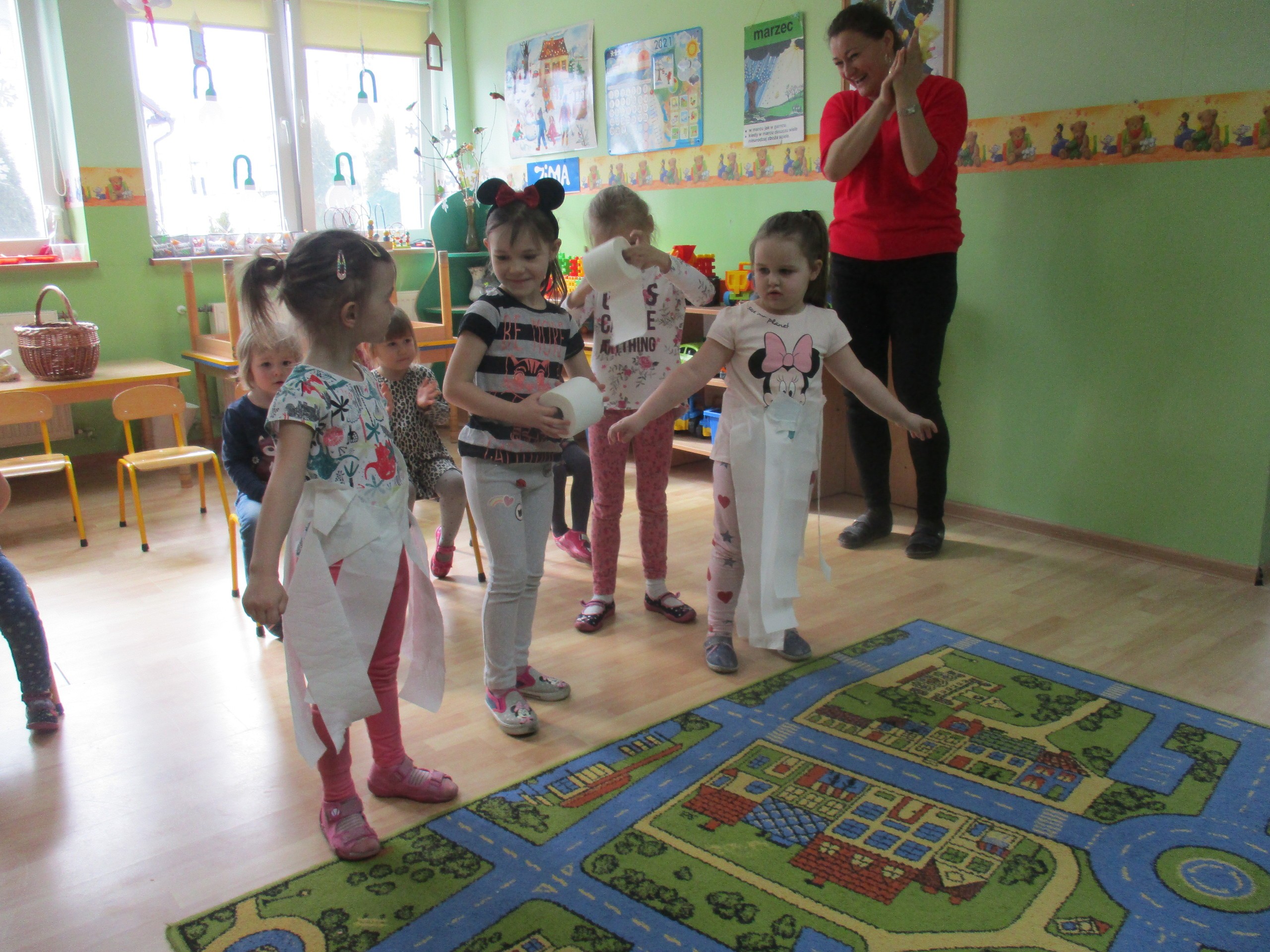 W miłej atmosferze rozpoczęliśmy wspólną zabawę. Chłopcy zamienili się w rycerzy a dziewczynki zostały księżniczkami. Na miano tego tytułu dziewczynki przy pomocy rycerzy musiały wykonać kilka zadań. Rozwiązywały zagadki, dopasowywały odpowiednie atrybuty księżniczki i rycerza, tworzyły z papieru toaletowego sukienkę dla księżniczki, oddzielały guziki od fasoli (tak jak to robił Kopciuszek), rycerze dopasowywali odpowiednie pantofelki do dziewczynek. Na koniec rycerze (chłopcy) założyli dziewczynkom i paniom korony, które w ten sposób oficjalnie zostały księżniczkami. Następnie dziewczynki i panie przeszły się po czerwonym dywanie. Chłopcy z wielką elegancją złożyli swoim koleżankom i paniom najserdeczniejsze życzenia, zaśpiewali sto lat i wręczyli słodkie upominki. Szczególne podziękowania od dziewczynek i pań otrzymali Antoś Durmna i Ksawery za osobiste upominki.